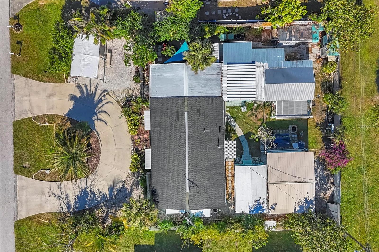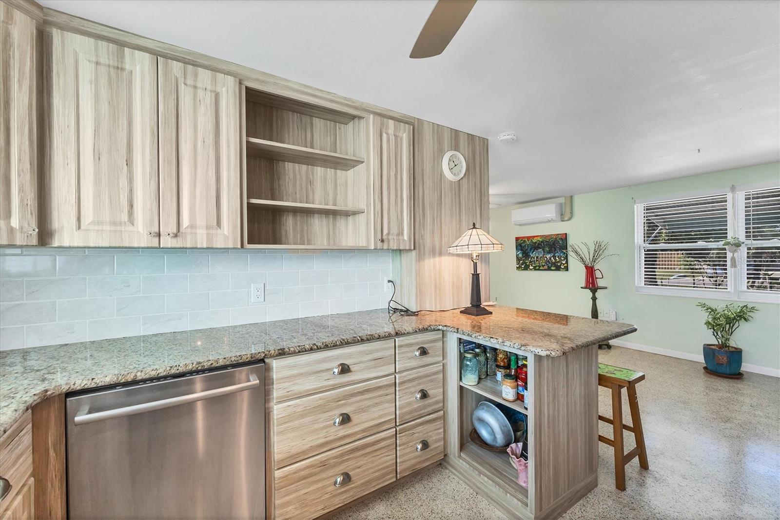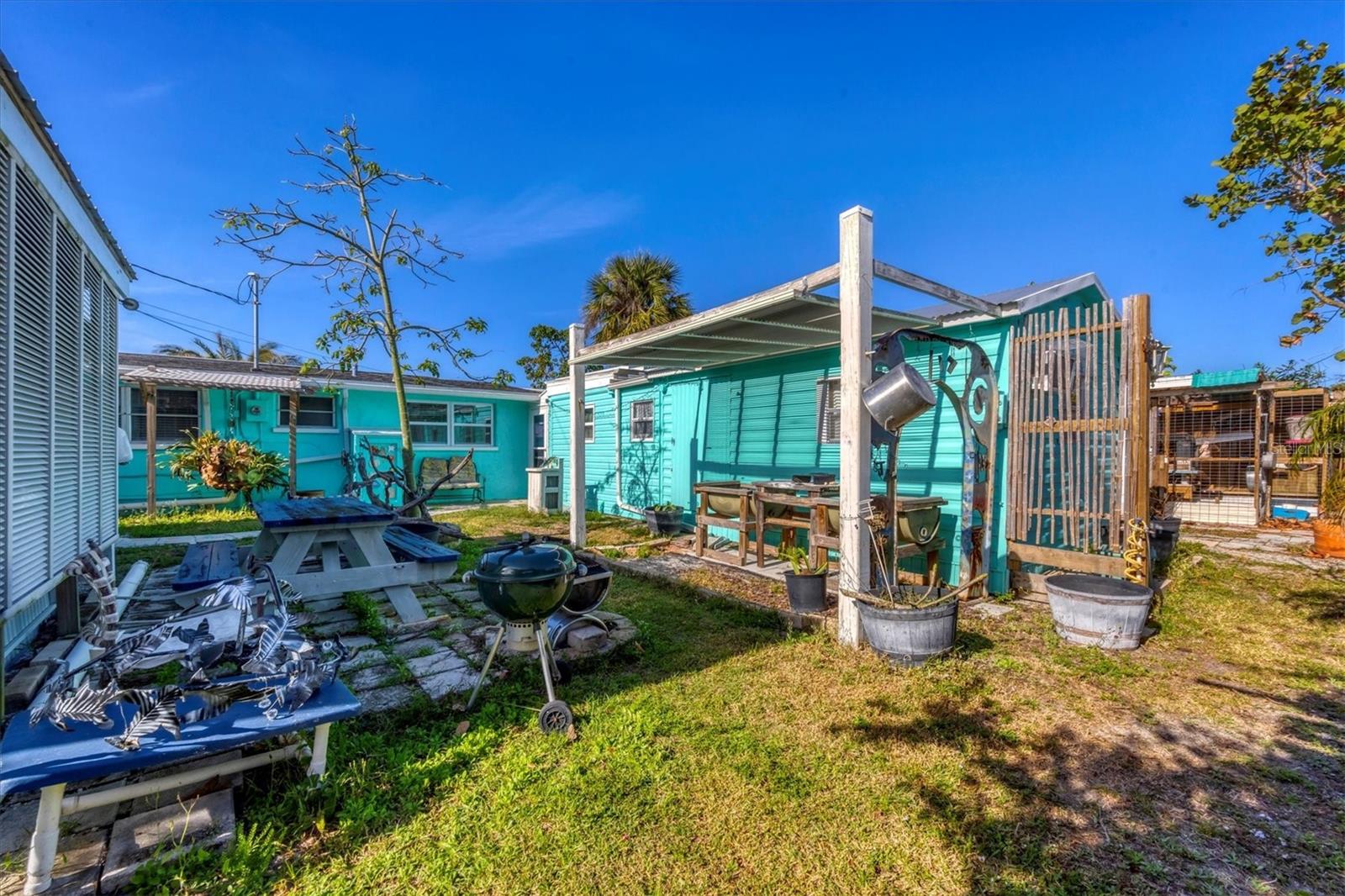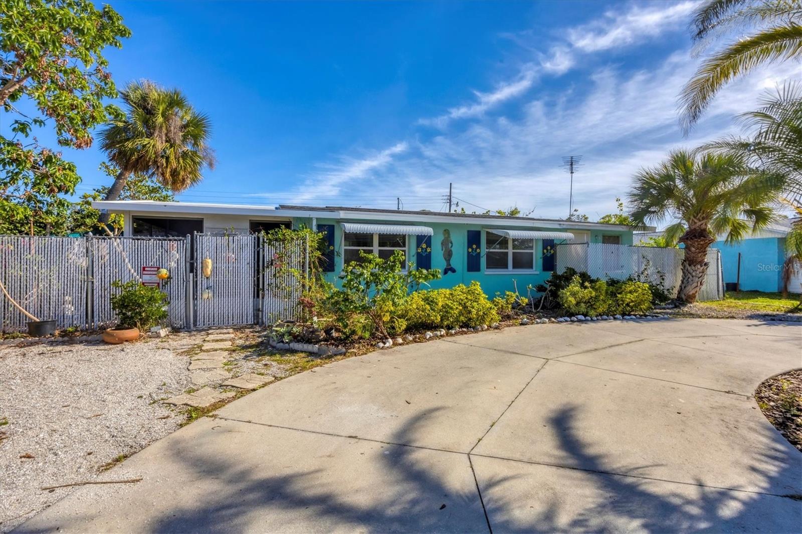 This charming 2-bedroom, 1-bath home with a mother-in-law suite is packed with unique features and modern updates. Inside, you’ll find terrazzo flooring throughout, an inside laundry room, and impact windows in the living room, dining room, and kitchen. The kitchen is a chef’s delight, boasting self-closing drawers and doors. The main bedroom features a stunning glass pocket door for added elegance. The property offers a 25x11 screened porch overlooking beautifully landscaped grounds, perfect for relaxing or entertaining. The entire property is fenced for privacy and includes a circular driveway for convenient access. The mother-in-law suite, with its private bath and shower, also has an exterior entrance, making it ideal for guests or as a rental opportunity. Additional highlights include two sheds—one of which could serve as a studio or office—two chicken coops, a garden sink, and a charming courtyard behind the home. Conveniently located near shopping, restaurants, and beaches, this one-of-a-kind property is a must-see! Don’t miss out on this incredible opportunity!