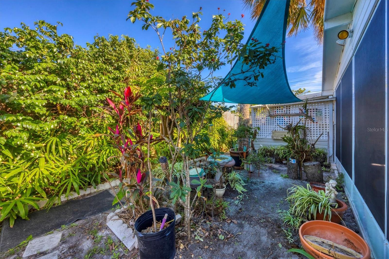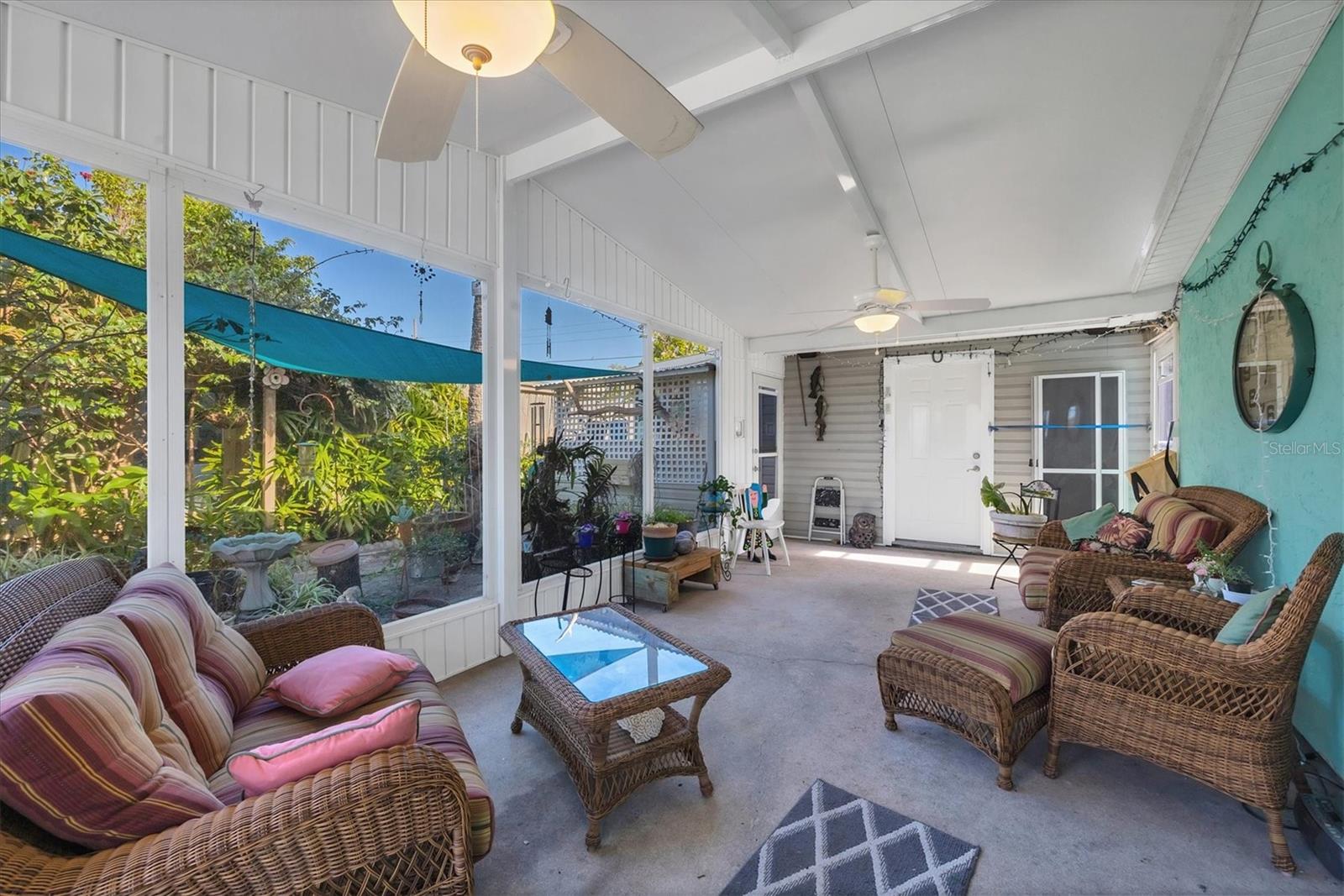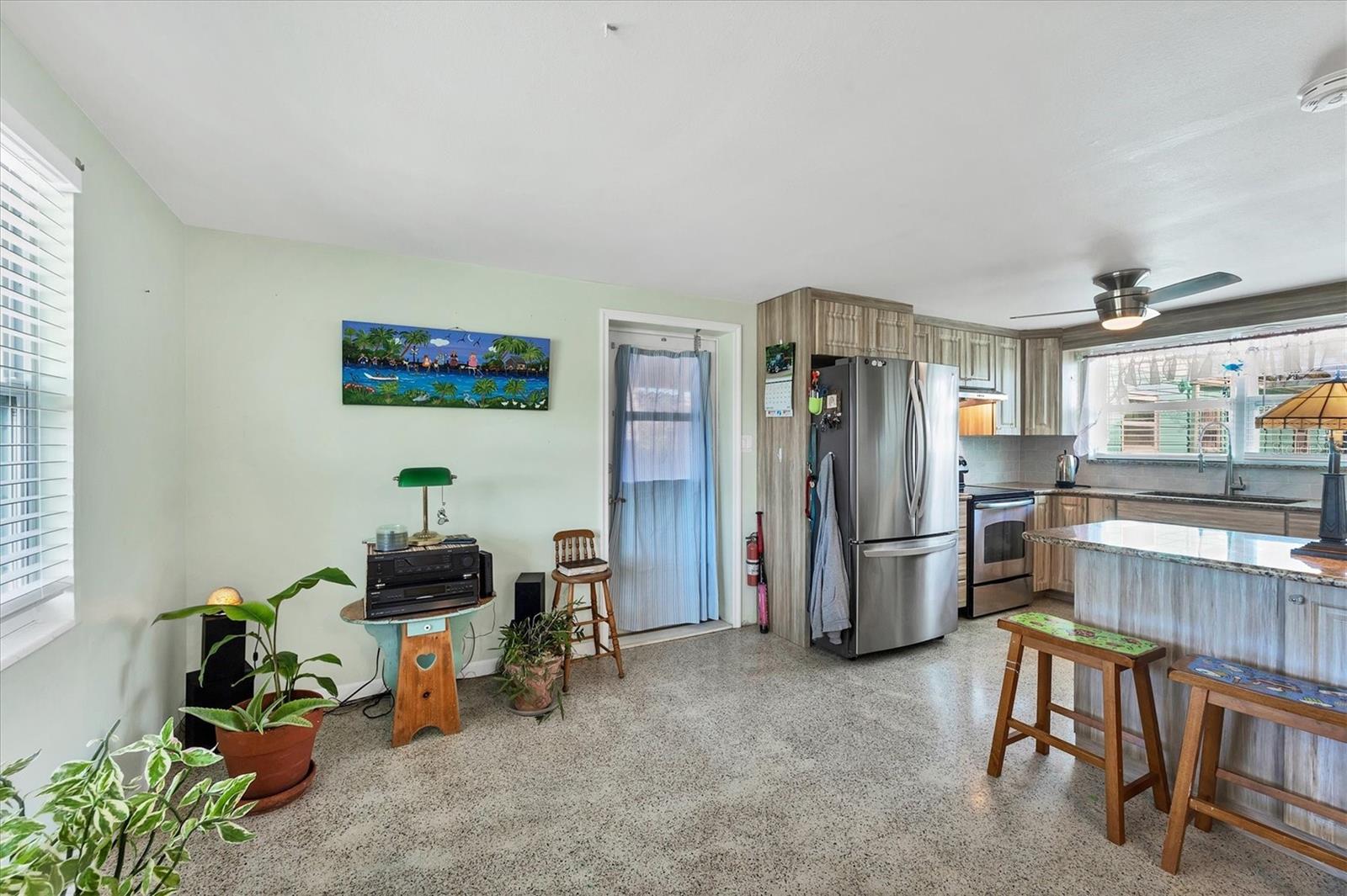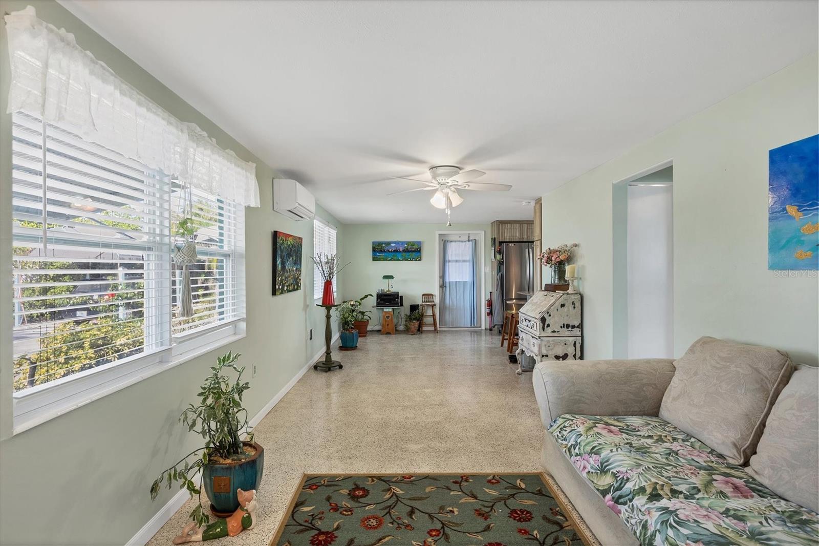 This charming 2-bedroom, 1-bath home with a mother-in-law suite is packed with unique features and modern updates. Inside, you’ll find terrazzo flooring throughout, an inside laundry room, and impact windows in the living room, dining room, and kitchen. The kitchen is a chef’s delight, boasting self-closing drawers and doors. The main bedroom features a stunning glass pocket door for added elegance. The property offers a 25x11 screened porch overlooking beautifully landscaped grounds, perfect for relaxing or entertaining. The entire property is fenced for privacy and includes a circular driveway for convenient access. The mother-in-law suite, with its private bath and shower, also has an exterior entrance, making it ideal for guests or as a rental opportunity. Additional highlights include two sheds—one of which could serve as a studio or office—two chicken coops, a garden sink, and a charming courtyard behind the home. Conveniently located near shopping, restaurants, and beaches, this one-of-a-kind property is a must-see! Don’t miss out on this incredible opportunity!