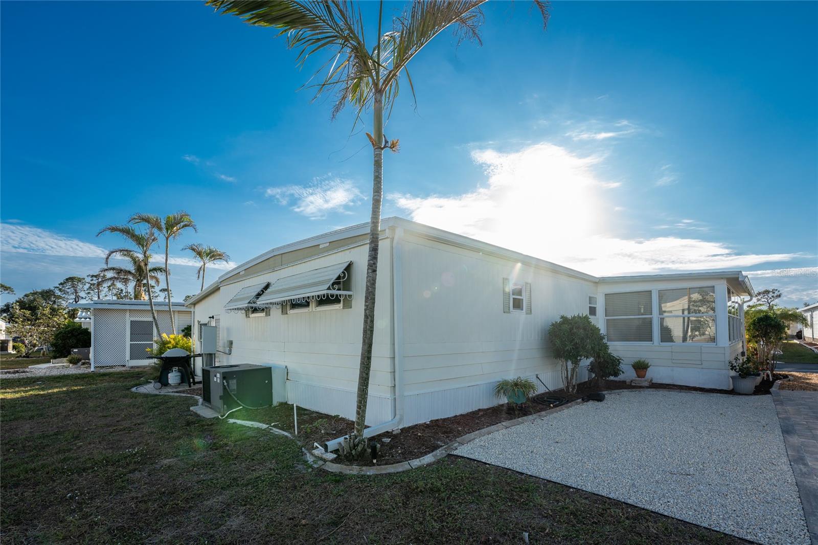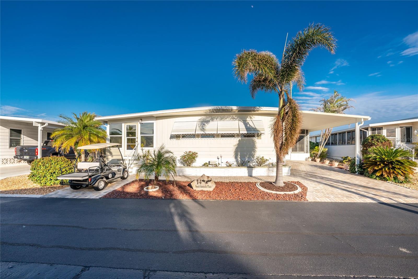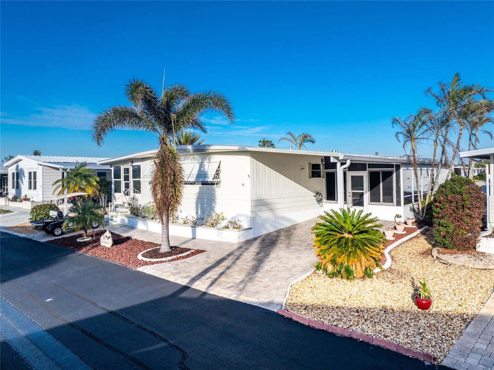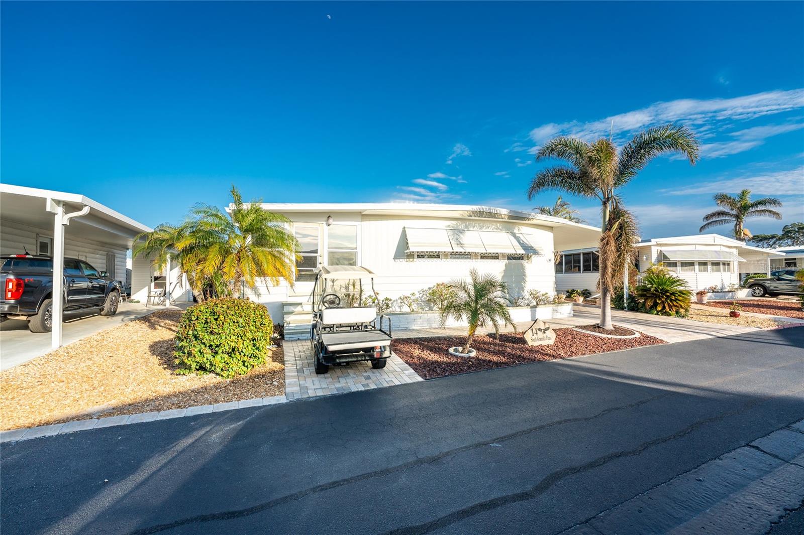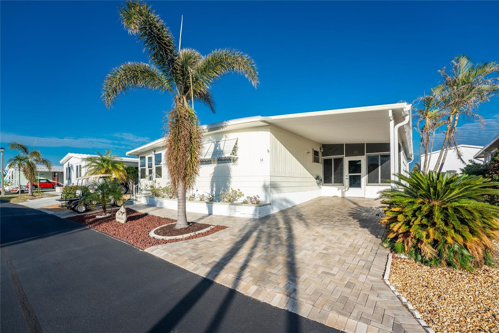 FULLY UPDATED, furnished STUNNING home located in the desirable gated community of Alameda Isles, a 55+ community of manufactured homes offering boating access, clubhouse, pool, spa, fitness center, pickleball & tennis courts, library, card room and more! This beautiful home was TOTALLY RENOVATED featuring fresh landscaping rock and curbing, a new roof (2022), newer windows, hot water heater (2024), concrete brick paver driveway, exterior and interior paint, laminate plank flooring, new stainless steel kitchen appliances (2024) & granite countertops, both bathrooms have newer raised toilets, vanities with wood cabinets, and SO much MORE! This SPACIOUS home offers a rare open concept floor plan with a large living area, roomy kitchen with top of the line new appliances, wood cabinets, a double pantry, glass tile backsplash and custom crown molding that continues throughout majority of the home, and a dining area that will easily accommodate all your family and friends. The living room features update laminate plank tile flooring that flows throughout most of the home and into the sitting area/Florida room that has 8 windows and a door that leads outside allowing the natural lighting to accent the main living areas. The primary suite offers dual closets with an updated ensuite bath with dual sinks, a tasteful granite countertop vanity with wood cabinets, linen closet and tiled shower. Your guests will enjoy the second bedroom that has a sizeable closet and is conveniently located directly across the hall from the second bathroom where you'll find tasteful finishes and accented walls with beadboard and crown molding. The covered lanai area off the carport offers the perfect space to entertain friends or relax with your favorite book and cup of coffee. You will not find another home that has ALL of these updates (AND MORE) and features. Don't miss this opportunity to call this amazing home yours.
