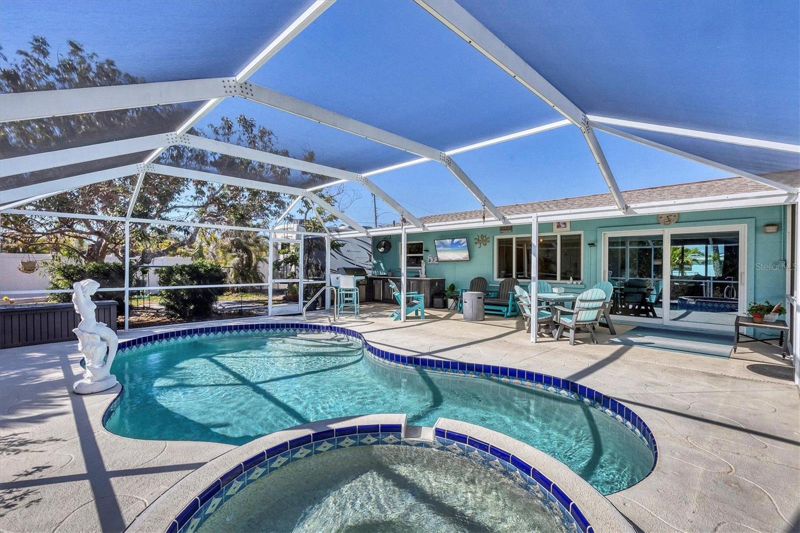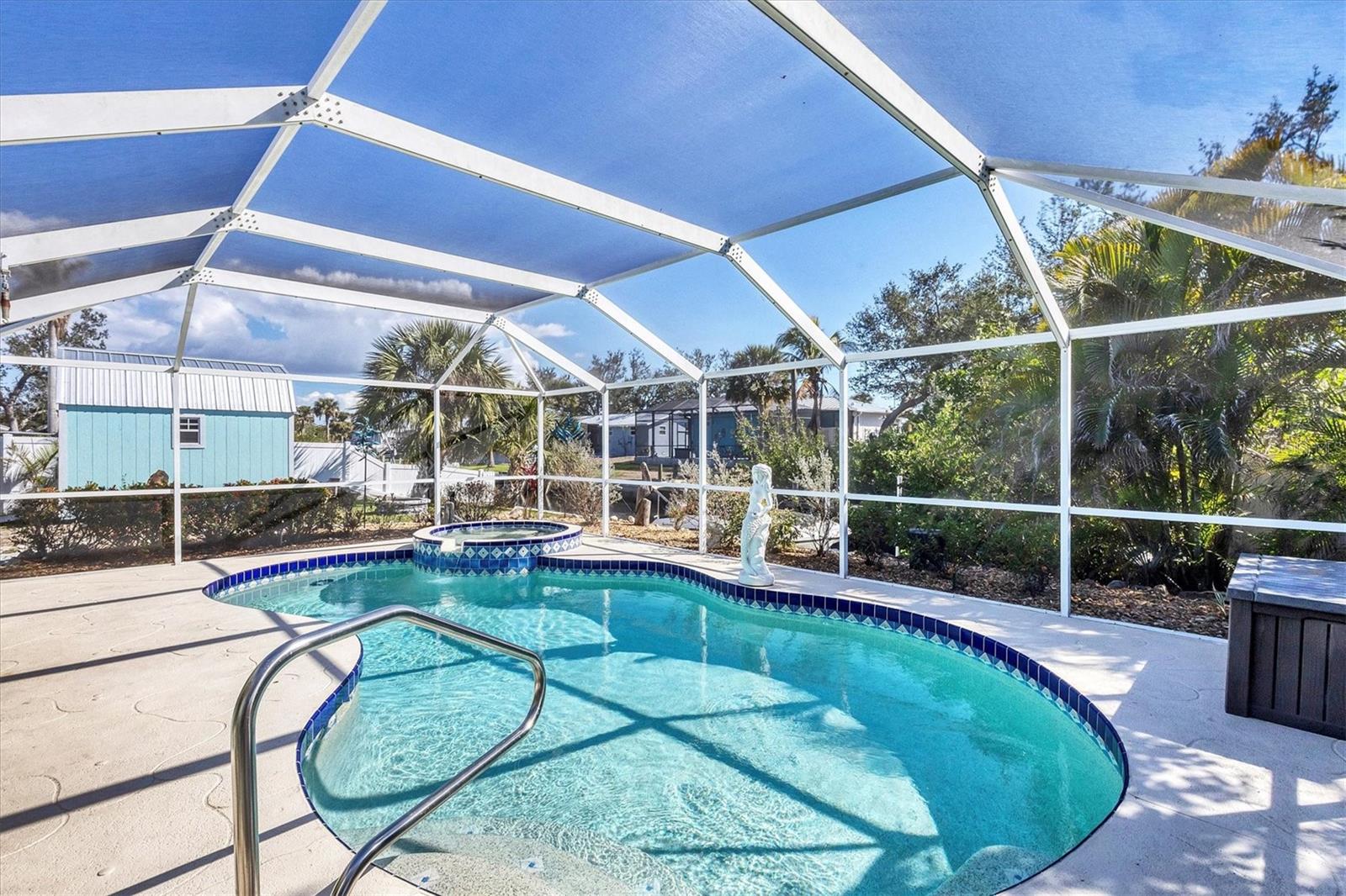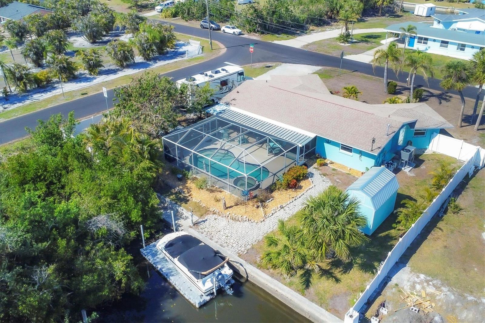 Welcome to your dream waterfront retreat! This cozy 2-bedroom, 2-bathroom canal home sits on a spacious, fenced corner lot, offering privacy and ample outdoor space. Recently updated in 2024 with brand new interior paint, AC system, pool pump, and hurricane-rated windows and doors, this home is move-in ready and built to last. Inside, you'll find tile flooring throughout and a completely remodeled kitchen, blending modern design with everyday functionality. Step outside to your own backyard oasis, where you can relax in the screened lanai featuring a sparkling pool and spa. Pool was resurfaced with a pebble tech finish in 2016. Entertain guests in your outdoor kitchen, complete with a small refrigerator, grill, power burner, Granite counter tops and sink—perfect for weekend cookouts. Need extra storage or planning to bring your RV? This home comes with an 8x12 gabled shed and a 50-amp RV hookup for ultimate convenience. Whether you're soaking in the Florida sunshine, enjoying water activities from your canal with access to the intercoastal waterway and gulf, or simply unwinding in your backyard paradise, this home offers the perfect blend of relaxation and functionality. Don’t miss your chance—schedule a tour today!