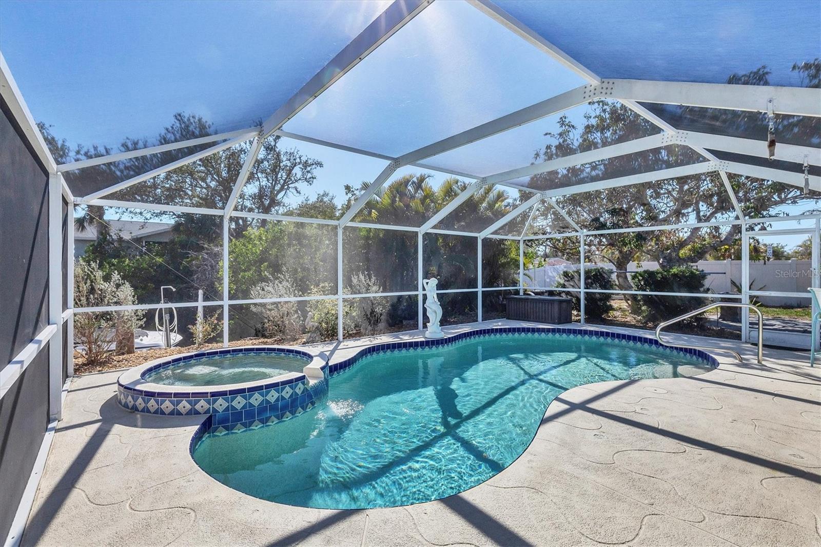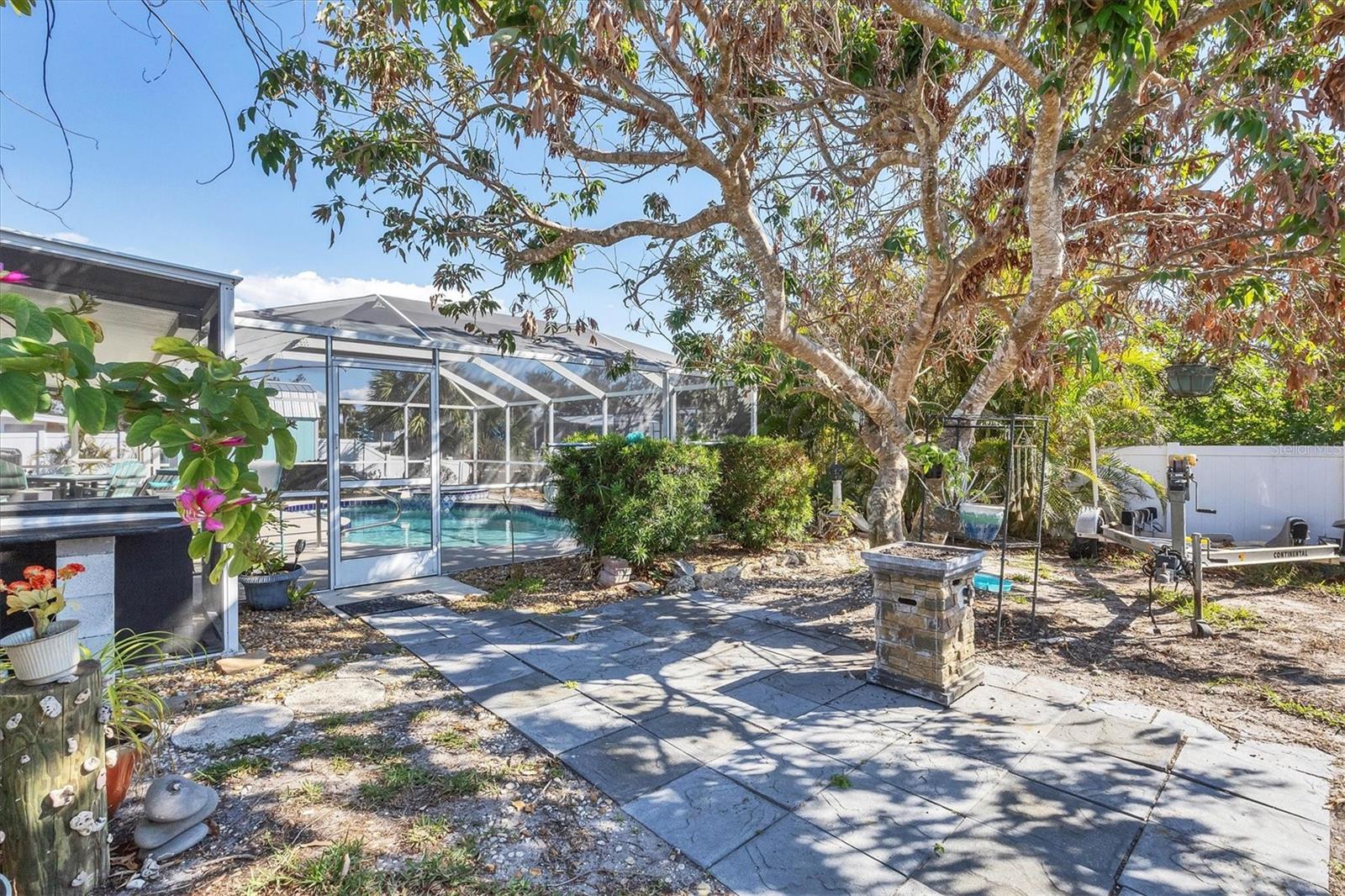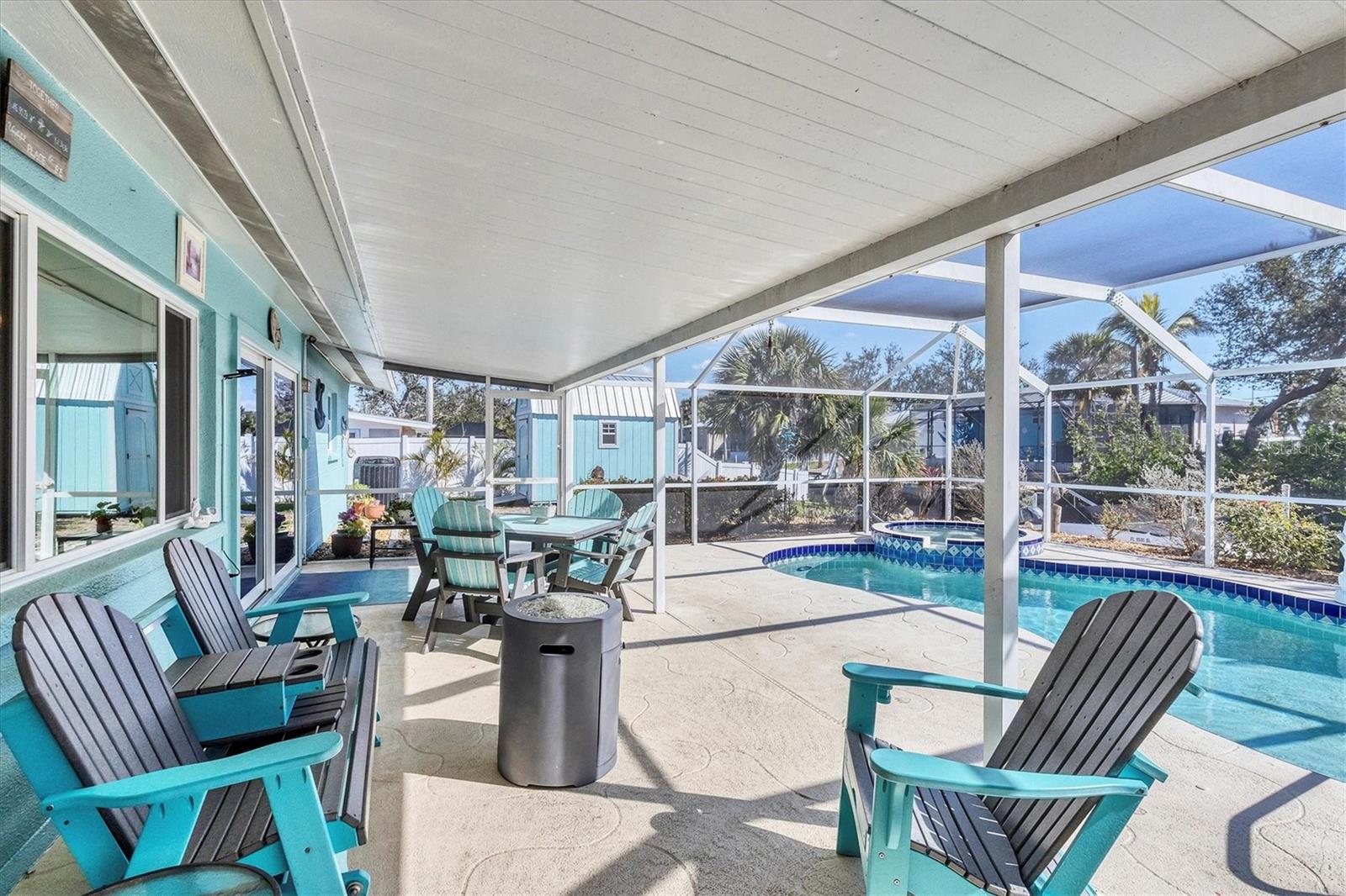 Welcome to your dream waterfront retreat! This cozy 2-bedroom, 2-bathroom canal home sits on a spacious, fenced corner lot, offering privacy and ample outdoor space. Recently updated in 2024 with brand new interior paint, AC system, pool pump, and hurricane-rated windows and doors, this home is move-in ready and built to last. Inside, you'll find tile flooring throughout and a completely remodeled kitchen, blending modern design with everyday functionality. Step outside to your own backyard oasis, where you can relax in the screened lanai featuring a sparkling pool and spa. Pool was resurfaced with a pebble tech finish in 2016. Entertain guests in your outdoor kitchen, complete with a small refrigerator, grill, power burner, Granite counter tops and sink—perfect for weekend cookouts. Need extra storage or planning to bring your RV? This home comes with an 8x12 gabled shed and a 50-amp RV hookup for ultimate convenience. Whether you're soaking in the Florida sunshine, enjoying water activities from your canal with access to the intercoastal waterway and gulf, or simply unwinding in your backyard paradise, this home offers the perfect blend of relaxation and functionality. Don’t miss your chance—schedule a tour today!