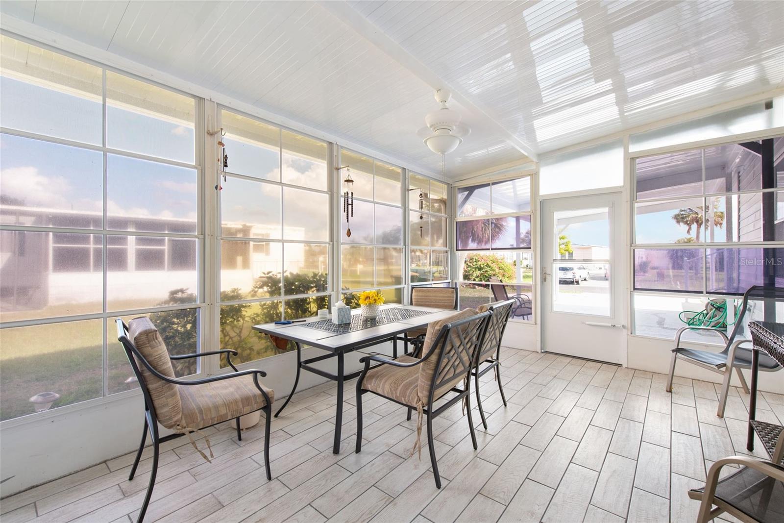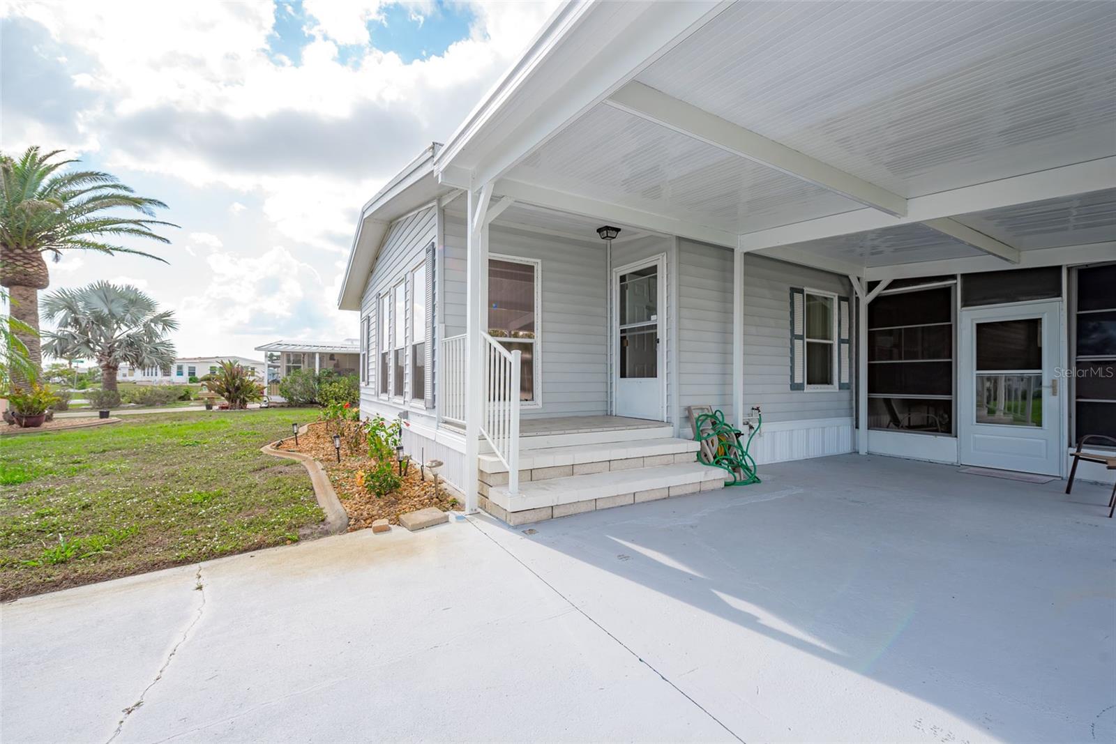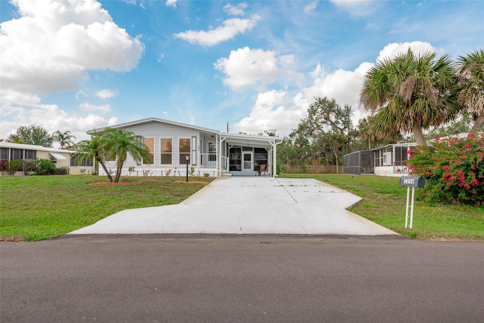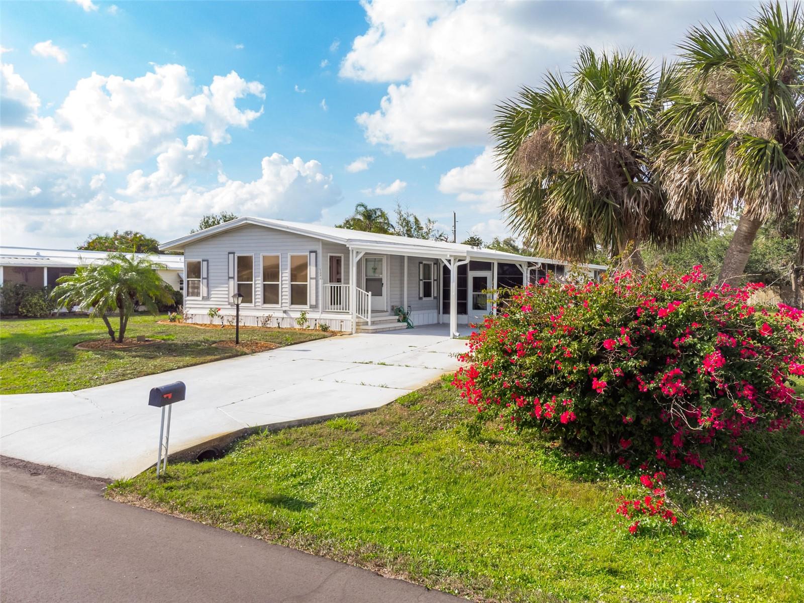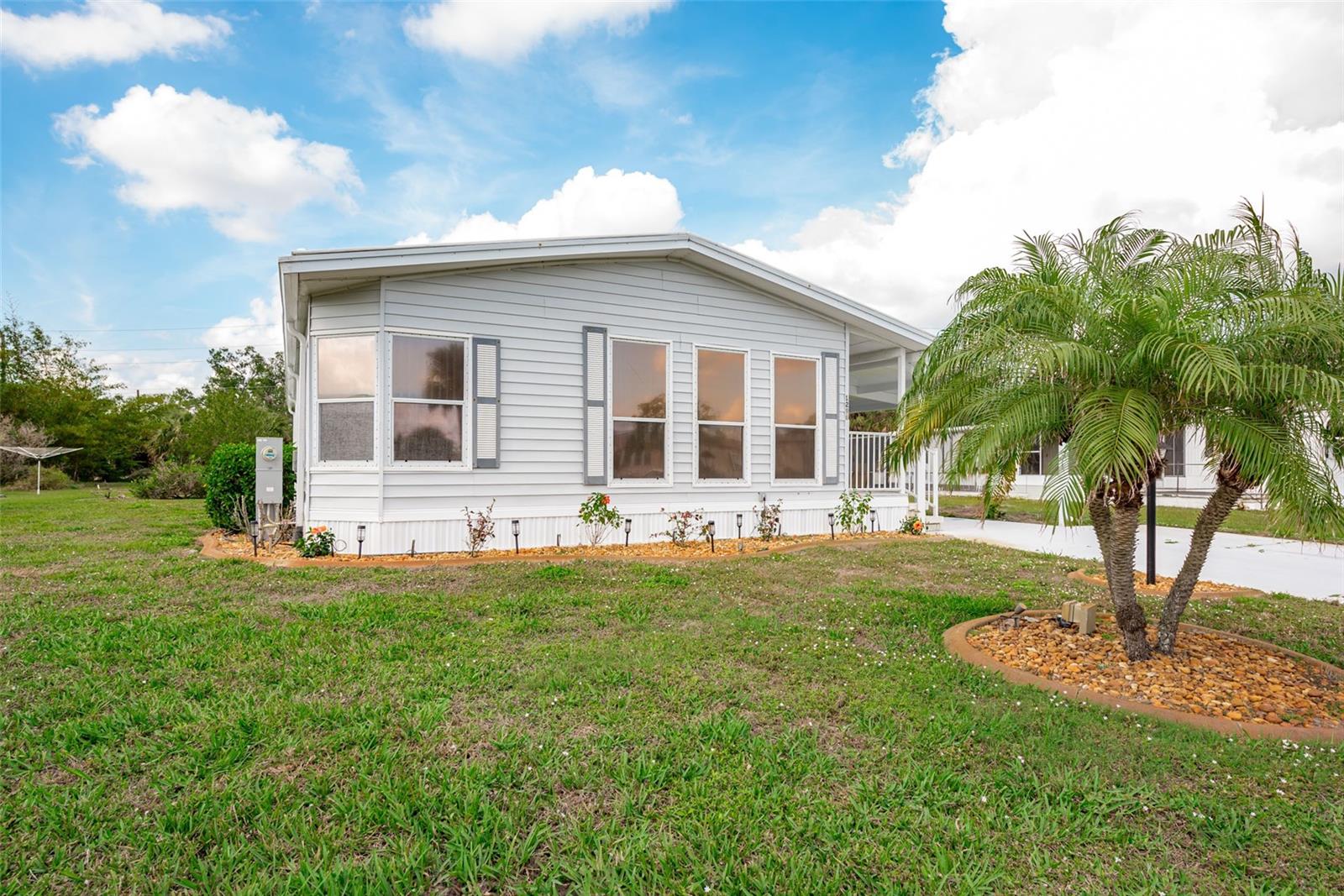 Welcome to your charming new turn-key furnished home in the desirable 55+ community of Holiday Estates III! This delightful residence offers a comfortable and inviting atmosphere, perfect for those seeking a relaxed and active lifestyle. Step inside and be greeted by a bright and open living space, enhanced by the airy feel of cathedral ceilings that extend through the living room and both bedrooms. The coastal-inspired paint palette evokes the tranquility of the Florida lifestyle, creating a warm and welcoming ambiance. Enjoy the easy maintenance of pergo flooring in the living room and bedrooms, while the kitchen and bathrooms feature durable and attractive tile. The beautifully updated kitchen boasts brand-new, stylish wood cabinetry, a new refrigerator, dishwasher, and disposal – all replaced in 2022 – offering modern convenience and a fresh, contemporary feel. The well-designed layout includes two bedrooms, two bathrooms and a bonus room, providing ample space for residents and guests. The master bedroom is a true retreat, boasting a private door leading out to the screened lanai, perfect for enjoying the Florida sunshine and gentle breezes. The master bath is thoughtfully appointed with a shower, a separate soaking tub, and a granite-topped vanity, offering both luxury and convenience. The bonus room can be utilized as a sitting room, office, or third bedroom. A dedicated laundry/utility room adds practicality to this well-maintained home. Step outside and discover two inviting patios. The front patio, fully tiled and enclosed, offers a tranquil escape. The screened-in back patio provides a comfortable outdoor retreat, ideal for barbecues and enjoying the sunshine without the bugs. The expansive backyard, bordered by mature trees, offers a sense of privacy and tranquility. Peace of mind comes with knowing this home has been recently repiped and features a brand new AC unit and electrical panel installed in 2023. A one-car carport and an oversized driveway ensure ample parking for you and your guests. This home is nestled within a vibrant, golf cart-friendly community where residents own their spacious lots. Holiday Estates III is known for its active social scene, centered around the Edgewater Club. Enjoy a wealth of amenities, including a refreshing pool, tennis and pickleball courts, shuffleboard, and bocce ball. The clubhouse hosts a variety of events, from weekly music and sing-alongs by the pool to monthly dinners. With countless social gatherings, you'll find it easy to connect with neighbors and make new friends. Edgewater Club serves the residents Holiday Estates III, offering a true sense of community and belonging. Don't miss this opportunity to embrace the Florida lifestyle in this wonderful home!