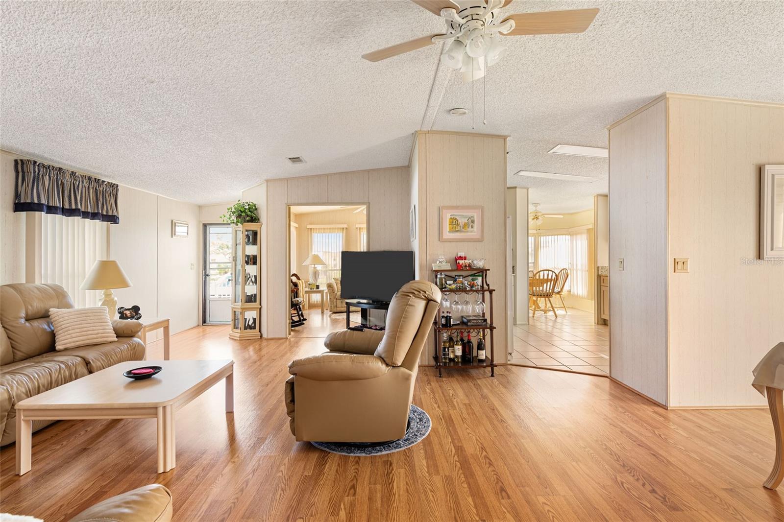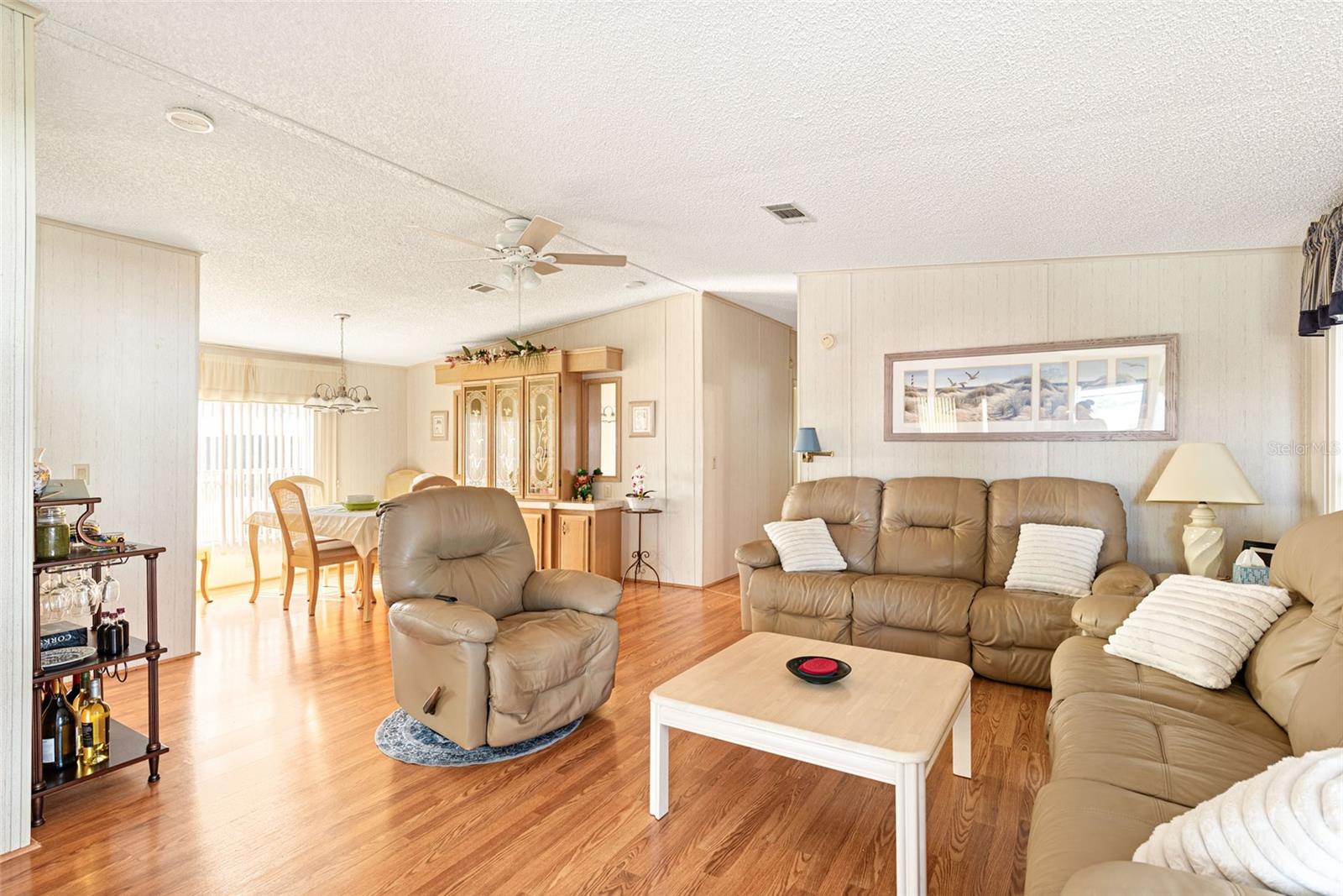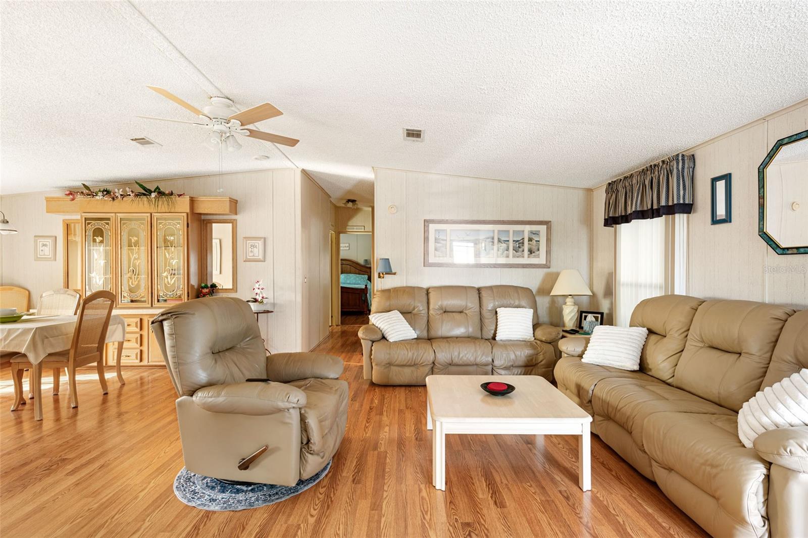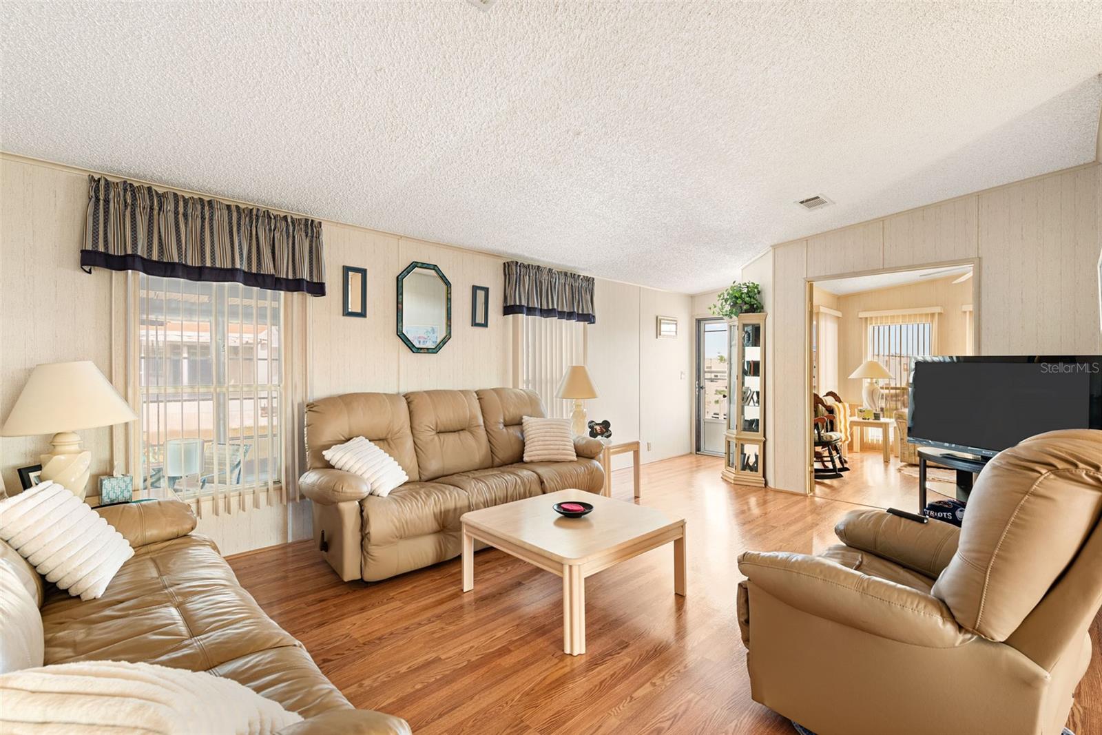Welcome to your charming new turn-key furnished home in the desirable 55+ community of Holiday Estates III! This delightful residence offers a comfortable and inviting atmosphere, perfect for those seeking a relaxed and active lifestyle. Step inside and be greeted by a bright and open living space, enhanced by the airy feel of cathedral ceilings that extend through the living room and both bedrooms. The coastal-inspired paint palette evokes the tranquility of the Florida lifestyle, creating a warm and welcoming ambiance. Enjoy the easy maintenance of pergo flooring in the living room and bedrooms, while the kitchen and bathrooms feature durable and attractive tile. The beautifully updated kitchen boasts brand-new, stylish wood cabinetry, a new refrigerator, dishwasher, and disposal – all replaced in 2022 – offering modern convenience and a fresh, contemporary feel. The well-designed layout includes two bedrooms, two bathrooms and a bonus room, providing ample space for residents and guests. The master bedroom is a true retreat, boasting a private door leading out to the screened lanai, perfect for enjoying the Florida sunshine and gentle breezes. The master bath is thoughtfully appointed with a shower, a separate soaking tub, and a granite-topped vanity, offering both luxury and convenience. The bonus room can be utilized as a sitting room, office, or third bedroom. A dedicated laundry/utility room adds practicality to this well-maintained home. Step outside and discover two inviting patios. The front patio, fully tiled and enclosed, offers a tranquil escape. The screened-in back patio provides a comfortable outdoor retreat, ideal for barbecues and enjoying the sunshine without the bugs. The expansive backyard, bordered by mature trees, offers a sense of privacy and tranquility. Peace of mind comes with knowing this home has been recently repiped and features a brand new AC unit and electrical panel installed in 2023. A one-car carport and an oversized driveway ensure ample parking for you and your guests. This home is nestled within a vibrant, golf cart-friendly community where residents own their spacious lots. Holiday Estates III is known for its active social scene, centered around the Edgewater Club. Enjoy a wealth of amenities, including a refreshing pool, tennis and pickleball courts, shuffleboard, and bocce ball. The clubhouse hosts a variety of events, from weekly music and sing-alongs by the pool to monthly dinners. With countless social gatherings, you'll find it easy to connect with neighbors and make new friends. Edgewater Club serves the residents Holiday Estates III, offering a true sense of community and belonging. Don't miss this opportunity to embrace the Florida lifestyle in this wonderful home!