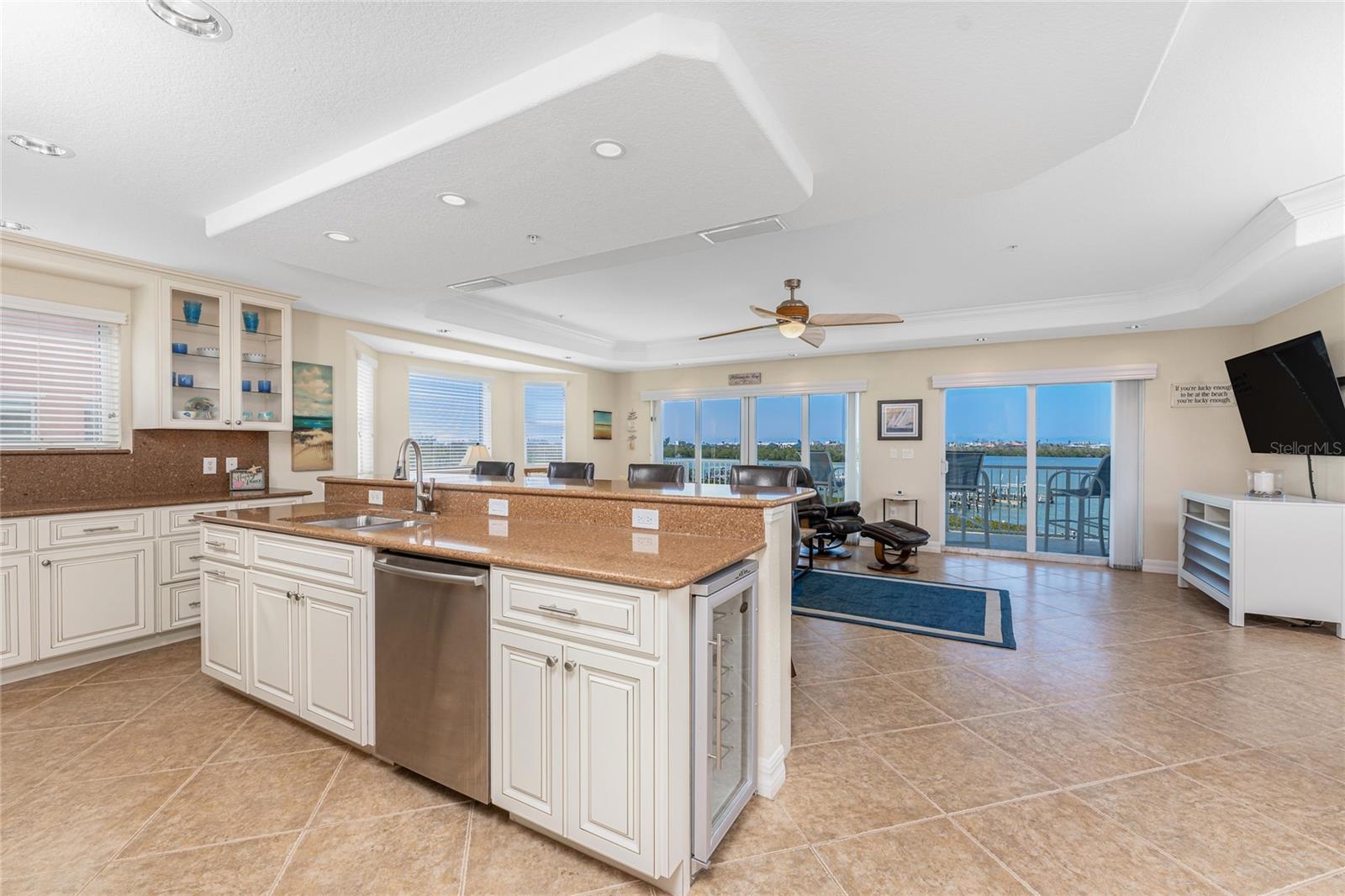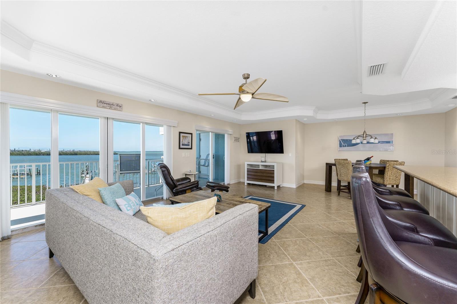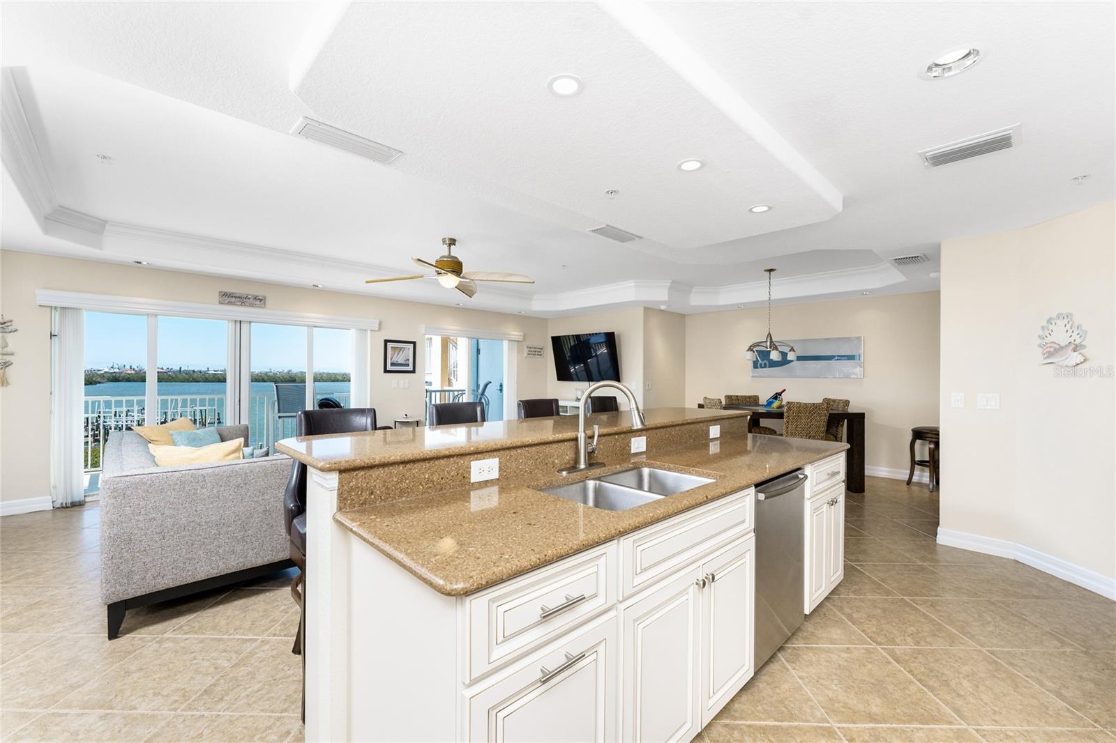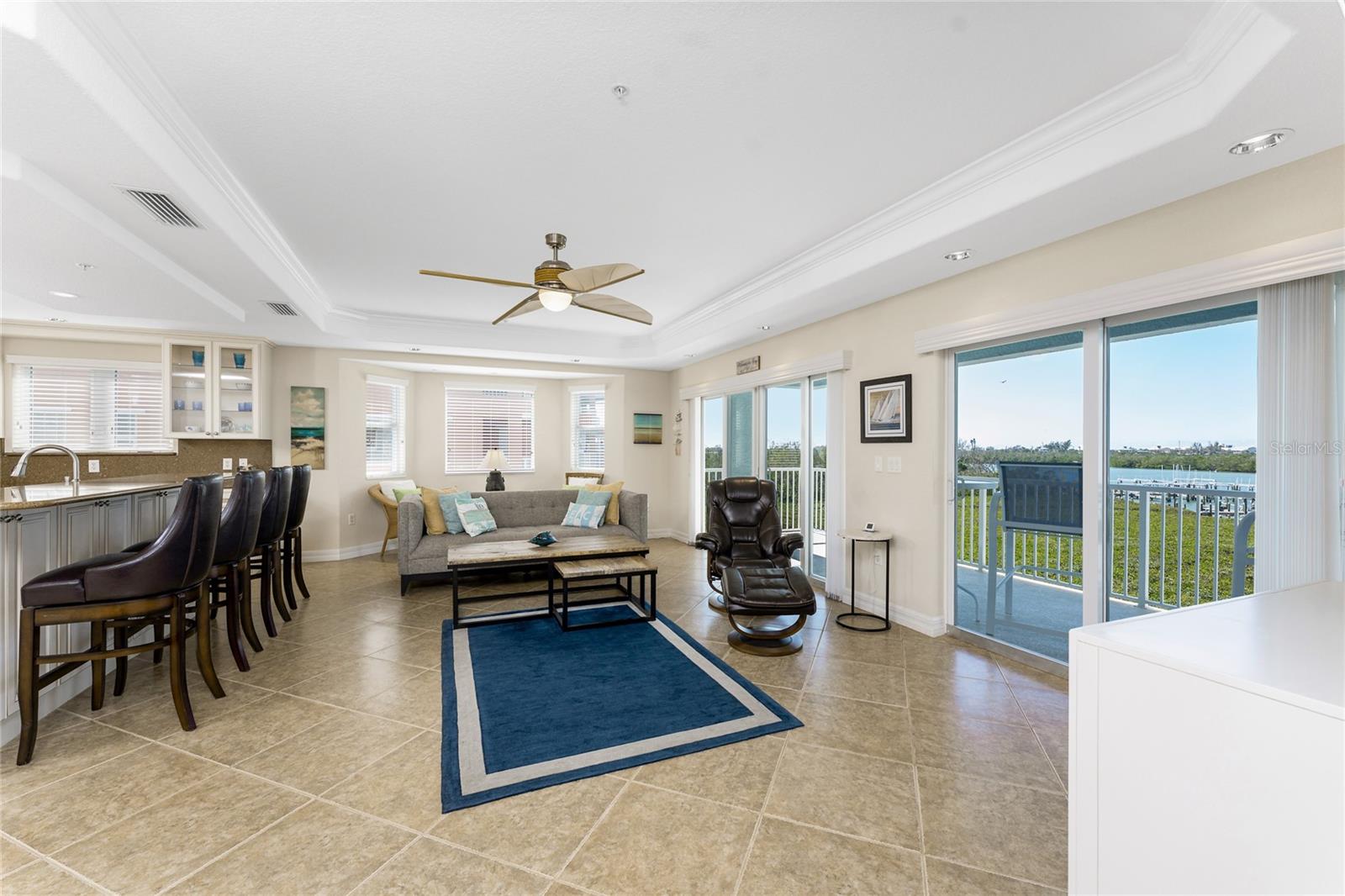 Wake up to breathtaking sunrises over Lemon Bay where the tone is set for another beautiful day in paradise. From your balcony, sip your morning coffee as boats travel along the Intracoastal Waterway, creating a picture-perfect backdrop of coastal living at its finest. This upscale, gated Harborview Condo is being sold turnkey furnished and offers two bedrooms, two baths, and two-car garage and the convenience of a security-keyed shared elevator. Designed for relaxed living and effortless entertaining, the open floor plan is filled with natural light and spectacular water views. The great room features multiple sets of sliding glass doors, seamlessly connecting the indoors to the stunning waterfront scenery. The well-appointed kitchen flows into the dining area and a full granite wet bar with a sink, making it the perfect space for hosting gatherings. The kitchen includes upgraded wood cabinetry, granite countertops, stainless steel appliances, a raised breakfast bar, a beverage refrigerator, and a pantry cabinet. The primary suite has a tray ceiling, a spacious walk-in closet with custom shelving, and an en-suite bath with dual sinks, granite countertops, a walk-around shower, and a garden tub. A private balcony connects the primary and guest bedrooms, providing a quiet spot to enjoy the coastal breeze while overlooking Beach Road. The guest bedroom is generously sized with a reach-in closet, while the guest bath features a step-in shower and a granite-topped vanity. For added convenience, a large storage area adjacent to the garage provides the perfect space for beach chairs, bicycles, and pool floats. There is a community pool and the deck area is under review for renovations. Whether you prefer a peaceful day on the water, exploring local sandbars, or taking a short walk or bike ride to Englewood Beach for lunch, live music at the tiki bars, or watching the sunset, this condo offers an unbeatable blend of luxury, security, and waterfront living. Call today to schedule your private showing.