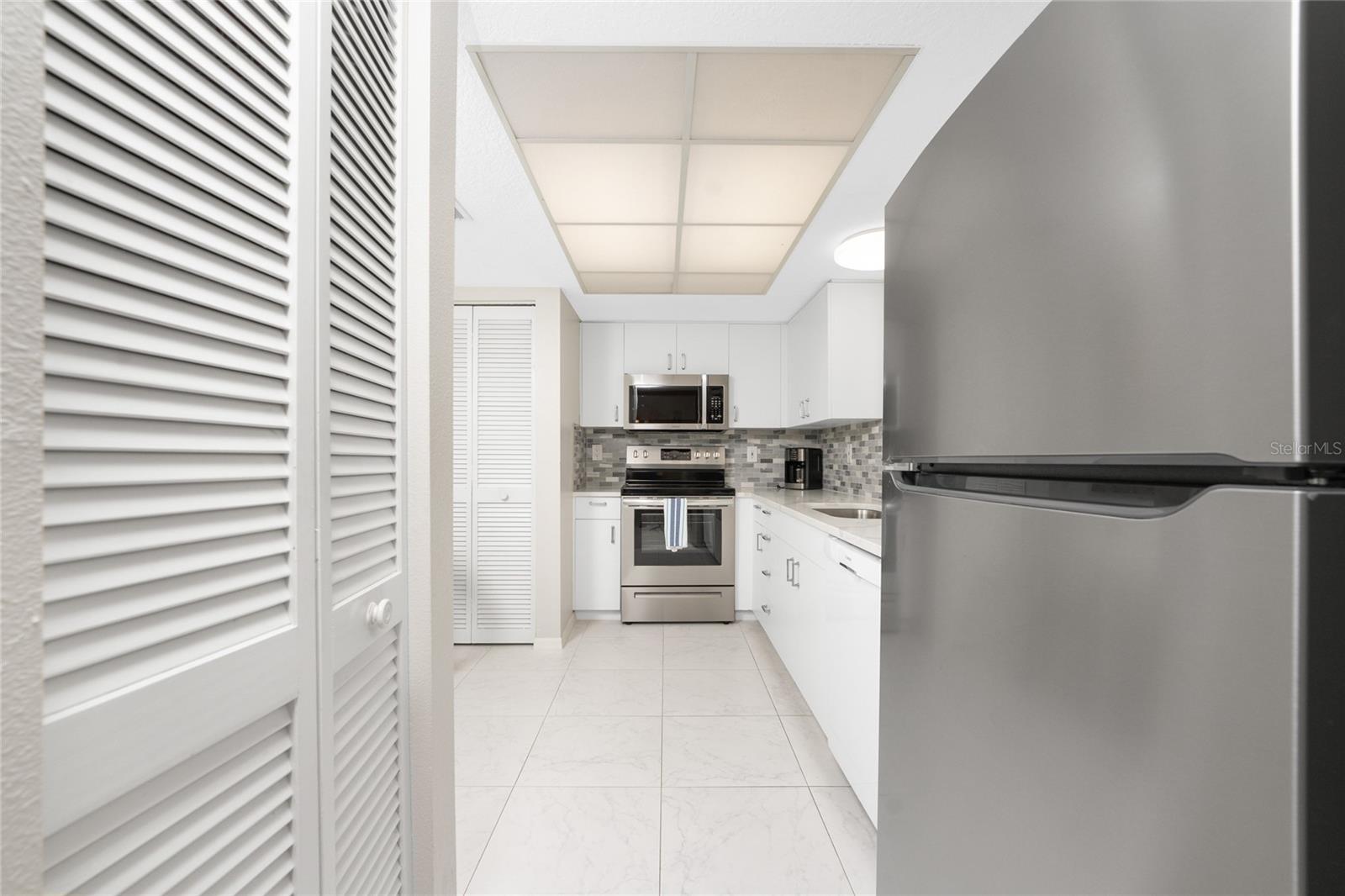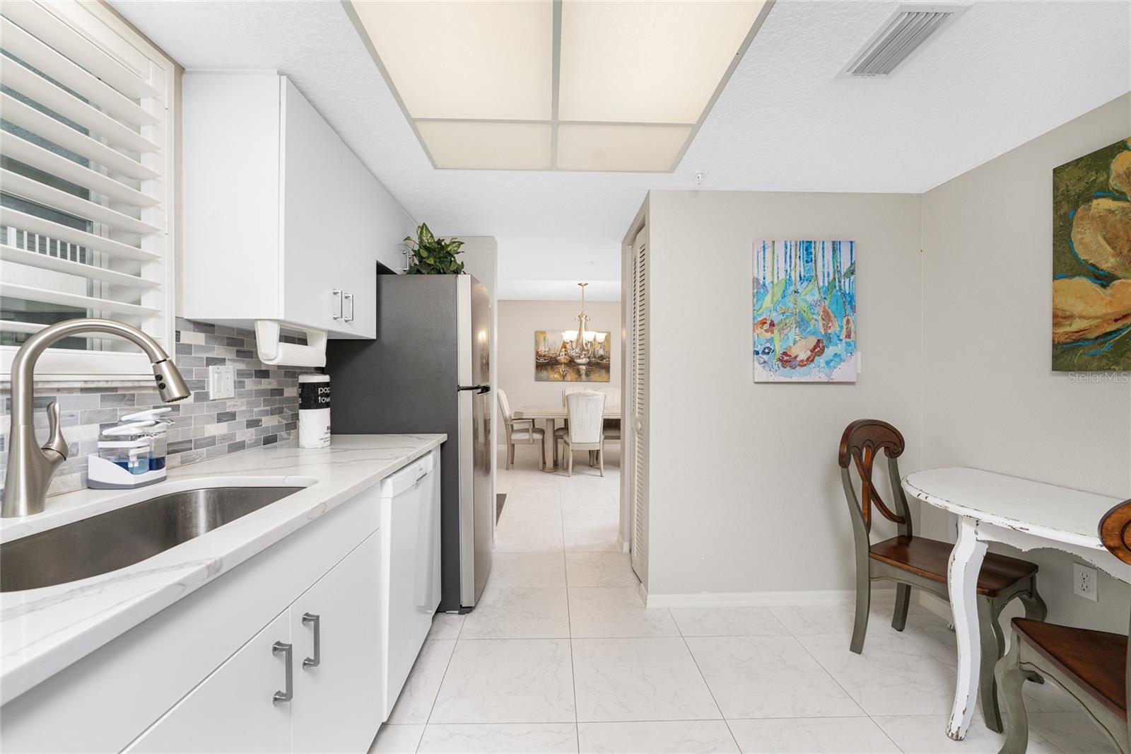 Nestled along the Gulf shores of Manasota Key in Englewood, Florida, this turnkey-furnished 3-bedroom, 2-bathroom residence at Surf Club Condominiums features a spacious split-bedroom floor plan with contemporary oversized tile flooring throughout. The covered balcony provides a tranquil retreat to enjoy morning coffee while taking in partial views of the Gulf's azure waters. The updated eat-in kitchen includes quartz countertops with tile backsplash, and stainless-steel appliances. Wake up to views of the Gulf from the Primary Bedroom suite, complete with a walk-in closet and an en-suite bathroom featuring a double-sink vanity with quartz countertops and walk-in shower—perfect for unwinding after a day at the beach. Unit includes storm-rated sliding glass doors throughout, a newer A/C system, and an in-unit stack washer/dryer. Residents enjoy a range of amenities, including a heated pool, assigned under-building parking with elevator access, a spacious community deck, and a boardwalk which leads to approximately 200 feet of beach frontage. Additionally, Surf Club is located within close proximity to all island restaurants and shopping. Discover your slice of paradise.