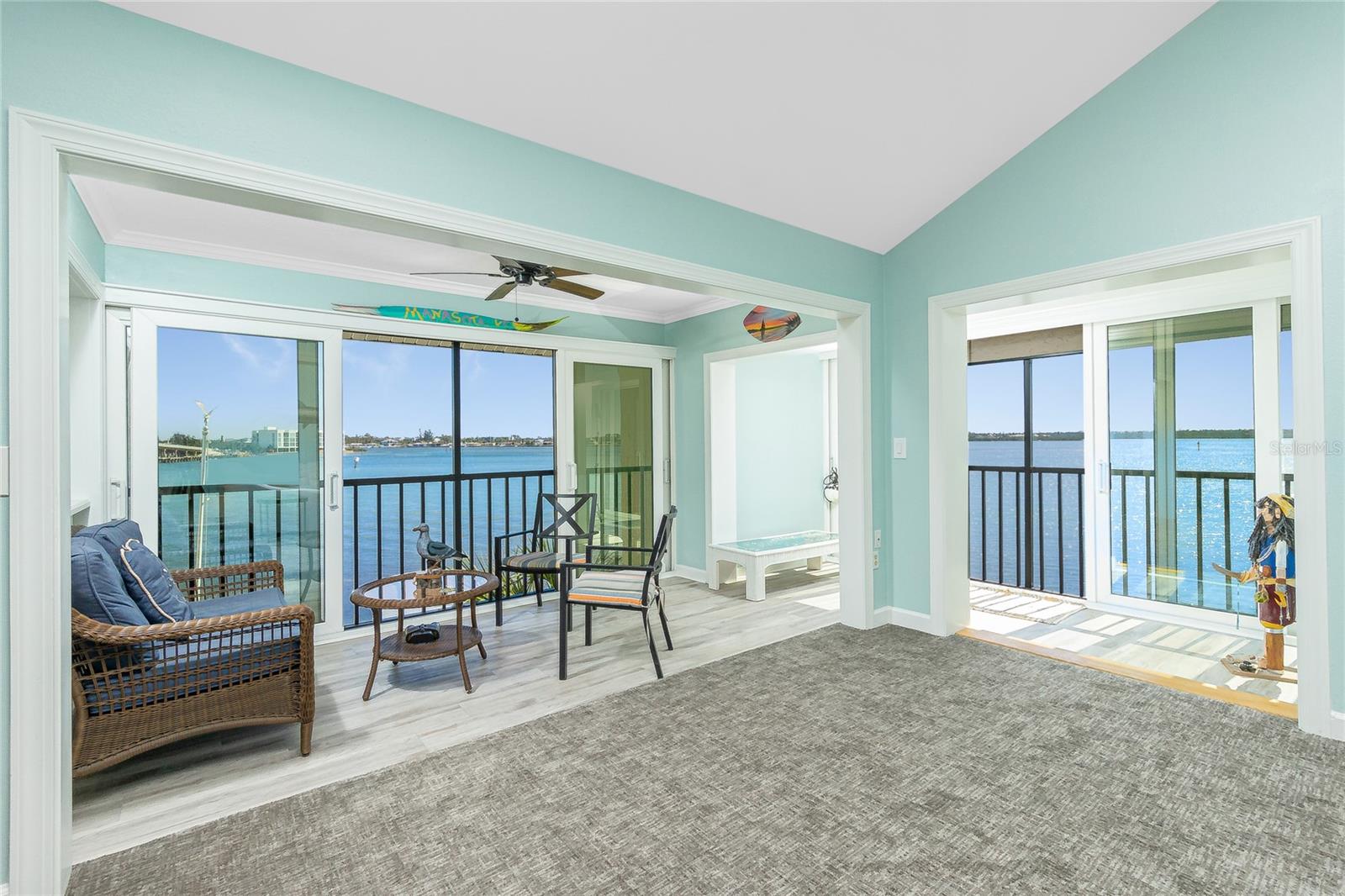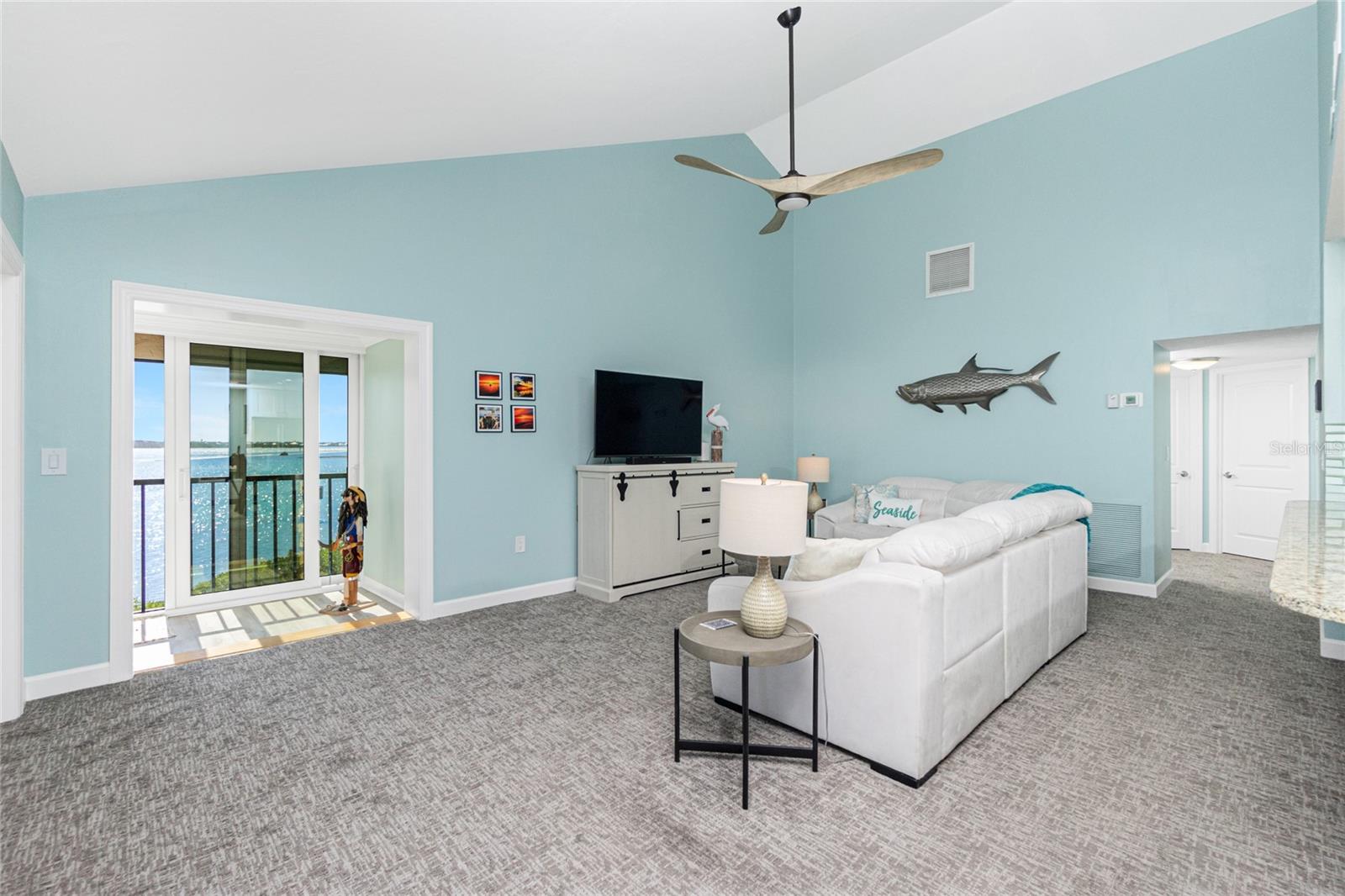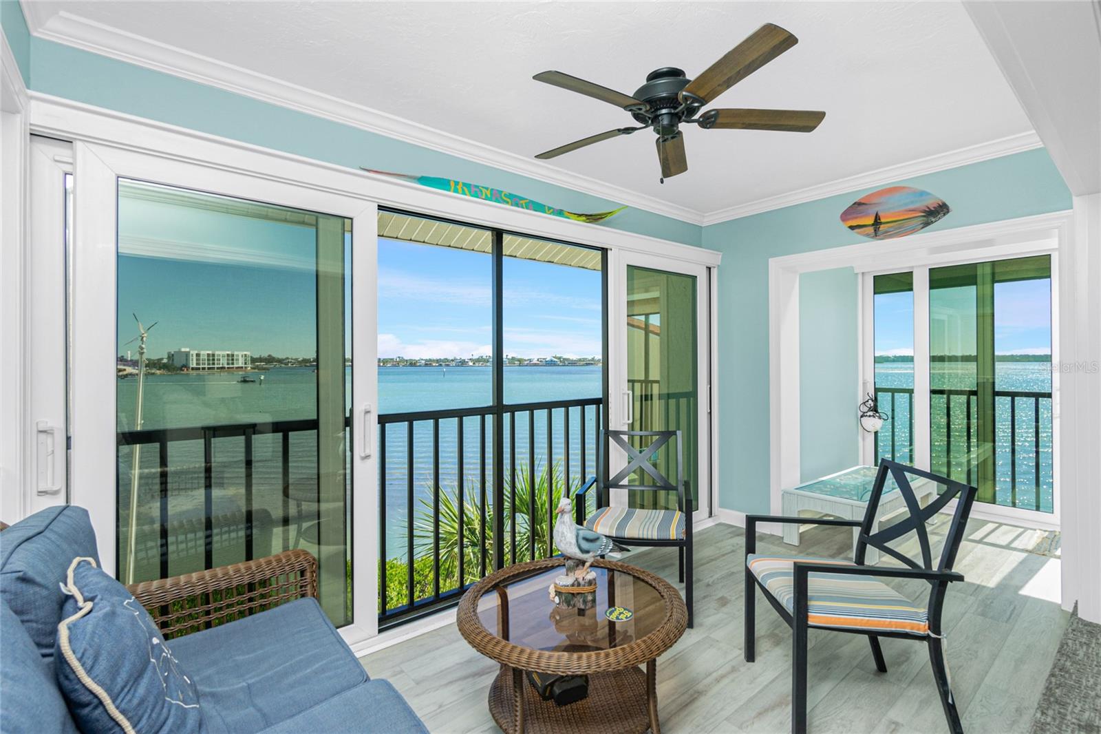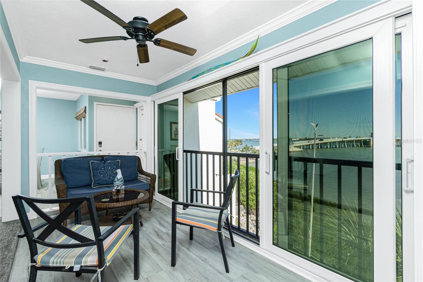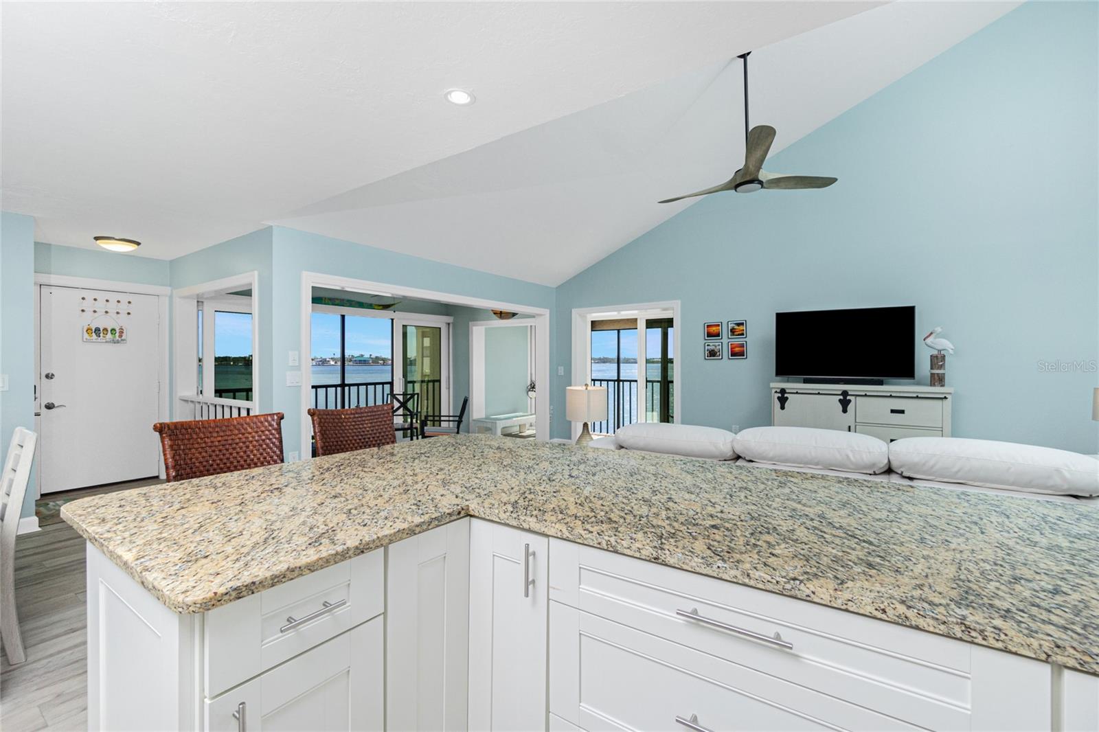 SANDPIPER SWEETHEART! This 2 BEDROOM, 2 BATH, 1 CAR GARAGE CONDO has FANTASTIC PANORAMIC VIEWS OF LEMON BAY, THE TOM ADAMS BRIDGE & THE INTRACOASTAL WATERWAY. The view provides non-stop entertainment including lots of boat traffic, dolphins, manatees, birds and SPECTACULAR SUNRISES. It is a TOP-FLOOR END UNIT giving you a rare and beautiful 180 DEGREE VIEW. The Wow factor starts as you walk in the front door into the GREAT ROOM with its CATHEDRAL CEILINGS where the living, dining and kitchen areas all seamlessly blend together. There is newer carpet throughout the condo with attractive wood like laminate in the kitchen, dining area and sitting area. The patios have been enclosed in the living area and the primary bedroom which add to the living space. The kitchen is gorgeous with soft/self close wooden cabinets, granite countertops, stainless steel appliances and beautiful backsplash. Both bedrooms are nicely sized and the primary bathroom has a new glass shower door. At ground level is your 1 car garage and laundry area. There is also a bonus room and an extra full bath. For added peace of mind the unit has IMPACT GLASS and the A/C was replaced in 2023/24 and has a 10 year warranty. Sandpiper Key is a wonderful 200 unit community with manicured grounds, two waterfront pools, outdoor grills, and active clubhouse. You are a short walk/bike ride to Manasota Key/Englewood Beach where you will find wonderful dining and entertainment options. Shopping on the mainland is only a 5 minute drive. As they say ... it's all about LOCATION, LOCATION,LOCATION! Make your appointment to see this great property today ... you won't be disappointed.