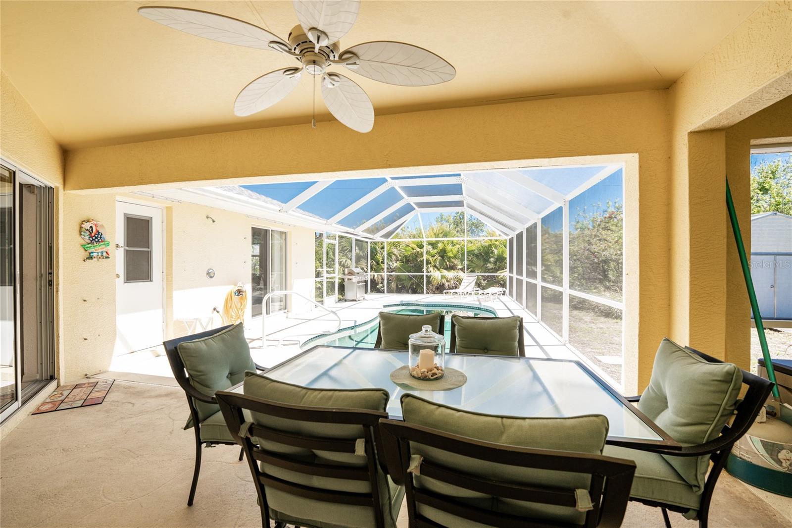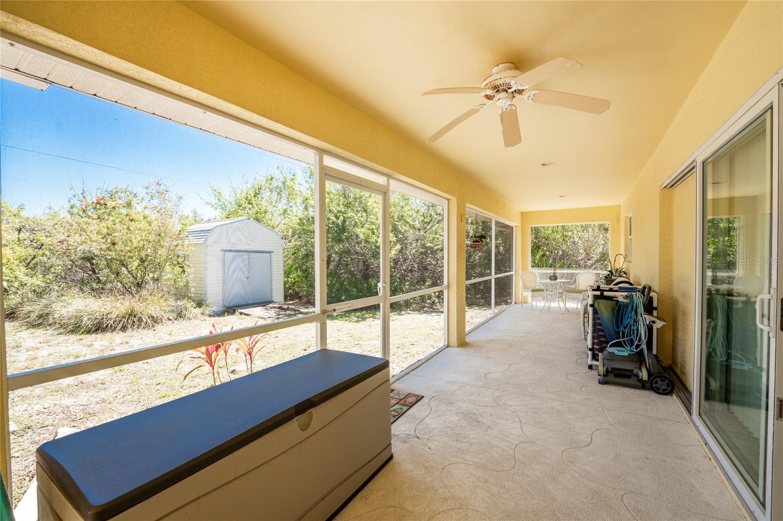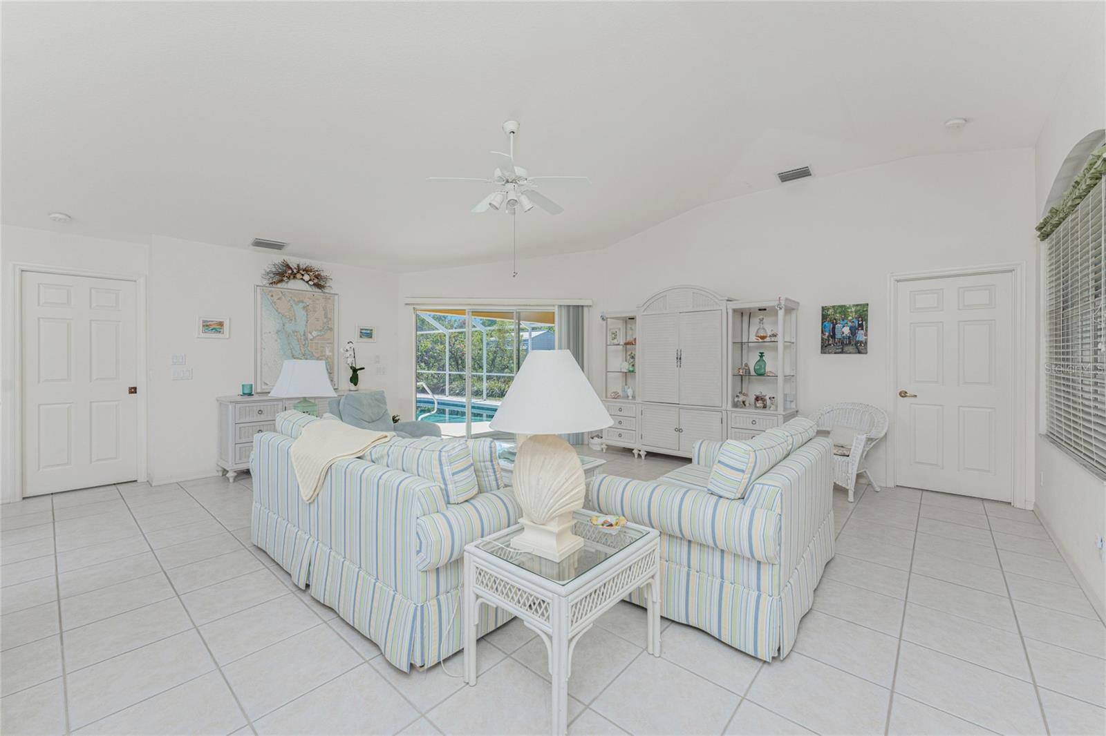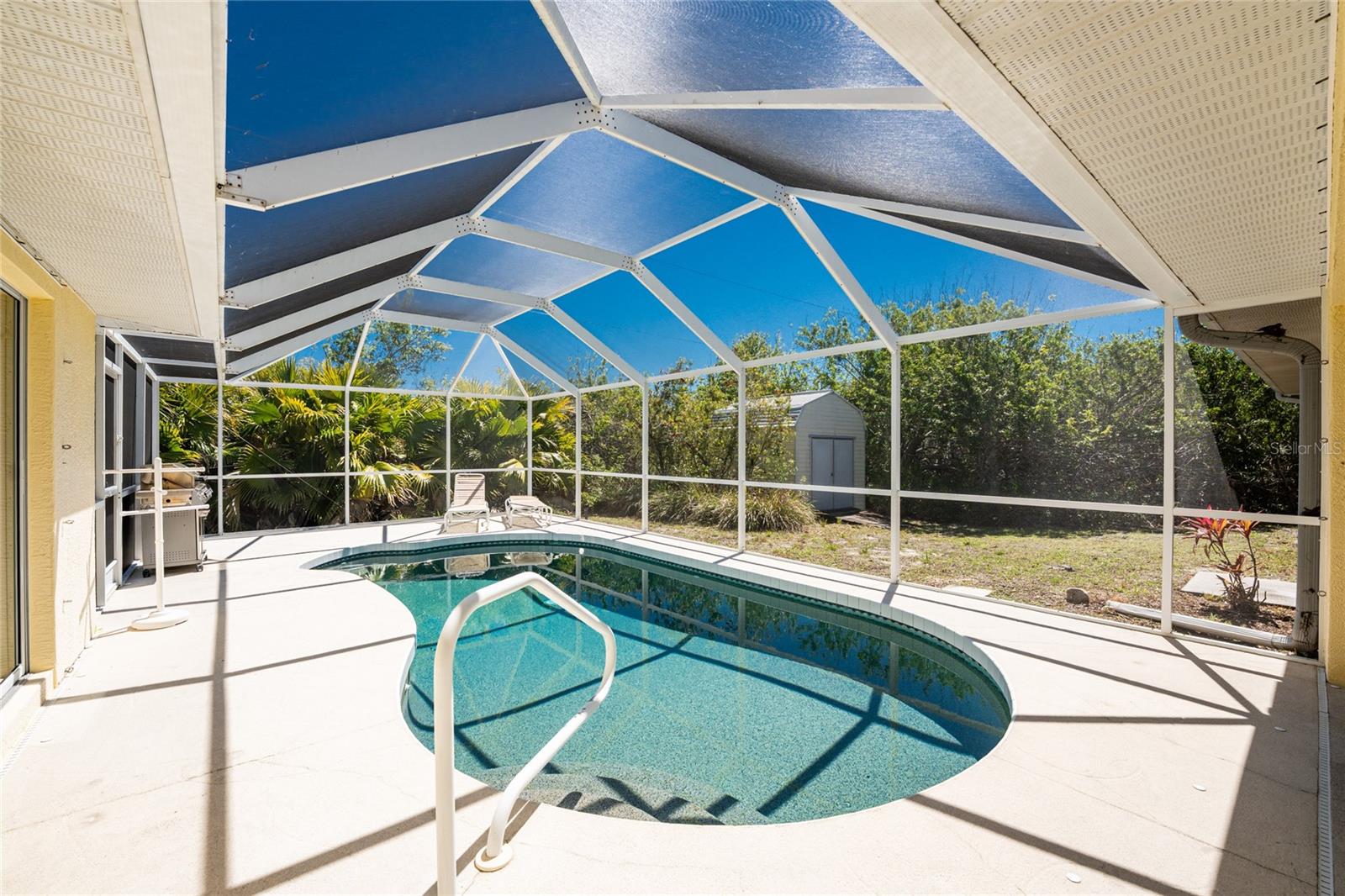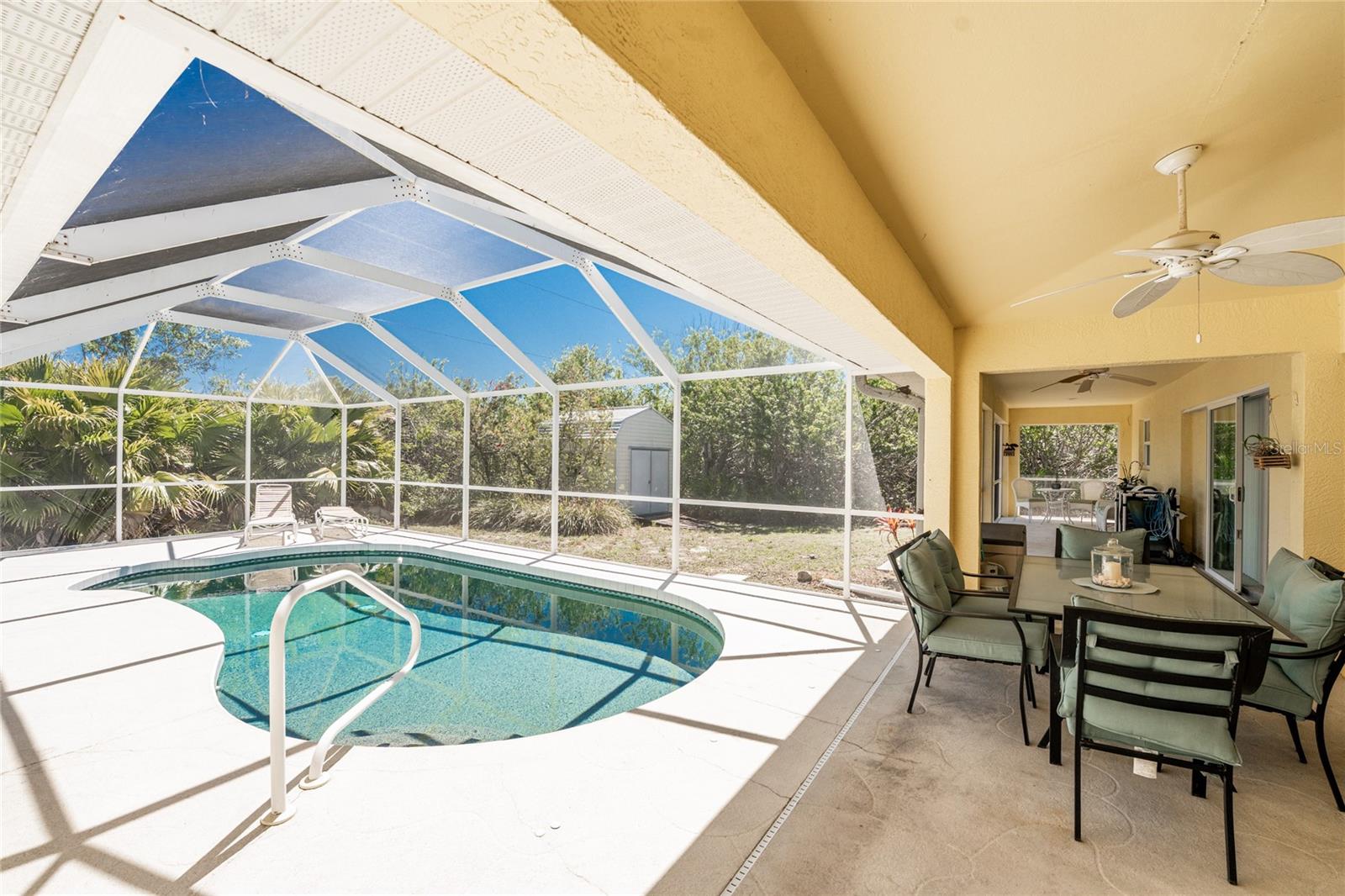 METICULOUSLY MAINTAINED HOME seated on a DOUBLE LOT with TWO ATTACHED GARAGES, & ONE OWNER, offers everything you could want -- and much more! From the dual-zoned A/C, new roof (2023), hurricane impact windows, X Flood zone, and FULLY FURNISHED-- when you arrive, you'll never want to leave. As you approach the front door, you are warmly welcomed with a screened-in front porch and stepping inside, the open floor plan with 12 foot vaulted ceilings and neutral color scheme awaits..... The great room provides the perfect space for entertaining with a spacious living room, dining area, and kitchen that features ample cabinets & countertop space, white appliances, a breakfast bar, recessed lighting, closet pantry, and access to the large laundry room with a pocketing door. The main living areas have easy to maintain tile that flows throughout most of the home. Easily expand your living space outdoors with triple pocketing sliding glass doors that lead outside to your EXPANSIVE (52' x 8') covered lanai encompassing the back of the home and accessible through 4 different sets of pocketing sliding glass doors, and if that's not enough there's an additional (36' x 19') lanai with a screen enclosure and your 24' HEATED POOL with upgraded Pebble Tec interior & new pool pump, surrounded by trees making this your private backyard oasis! There's plenty of room inside with a split bedroom floor plan providing privacy for everyone. The owner's suite is truly a "retreat" with a large bedroom, private access to the lanai and pool areas, a walk-in closet with a door to the second double car garage, and best of all a hobby room currently being used as a sewing/crafts area, that be utilized for a number of things and even an additional walk-in closet. The second walk-in closet leads to the primary bathroom that has ample cabinet space, large vanity, a roomy shower, and a door that leads to the bonus room which can be used as a home office, additional sitting area, man/woman cave, or space for your guests--with access to the pool area, the possibilities are endless! On the other side of the home are the two guest bedrooms--one with private access to the pool area, and both bedrooms feature quality carpeting, walk-in closets, and ceiling fans. The guest bath doubles as a POOL BATH with a shower/tub combo and lots of cabinets. Lets not forget about the TWO double car garages, one (24' x 20') and the second garage (21' x 19') this home offers an abundance of storage both inside and out! The (10' x 10') shed is the icing on the cake providing a workshop or MORE storage. There are SO many opulent features this home offers you must come see it for yourself! Just minutes away from world-class Gulf beaches, amazing fishing, numerous golf courses, bike trails, farmers markets and a wide selection of restaurants and quaint shops. You don't want to hesitate, you can make this your Florida oasis!