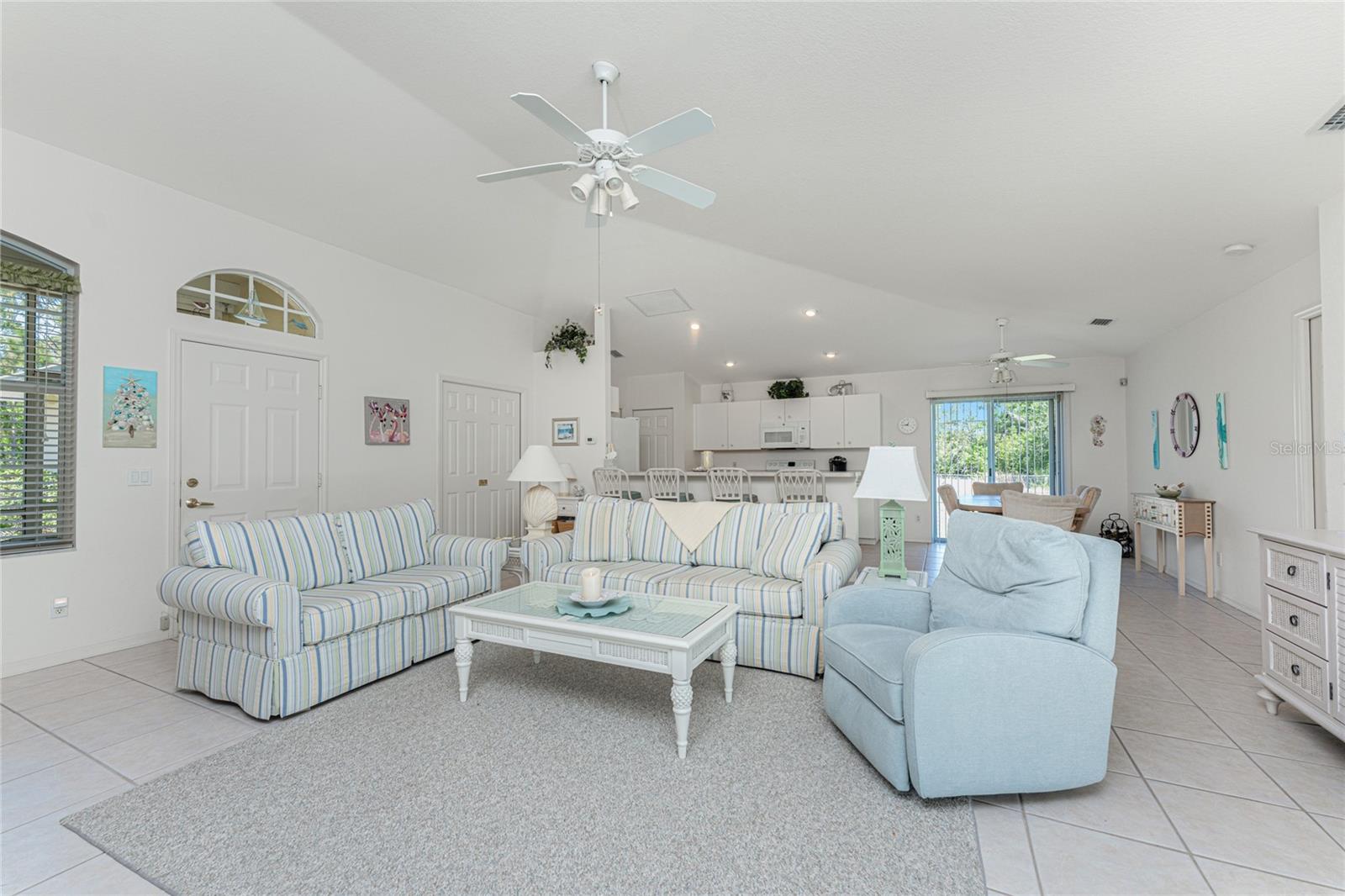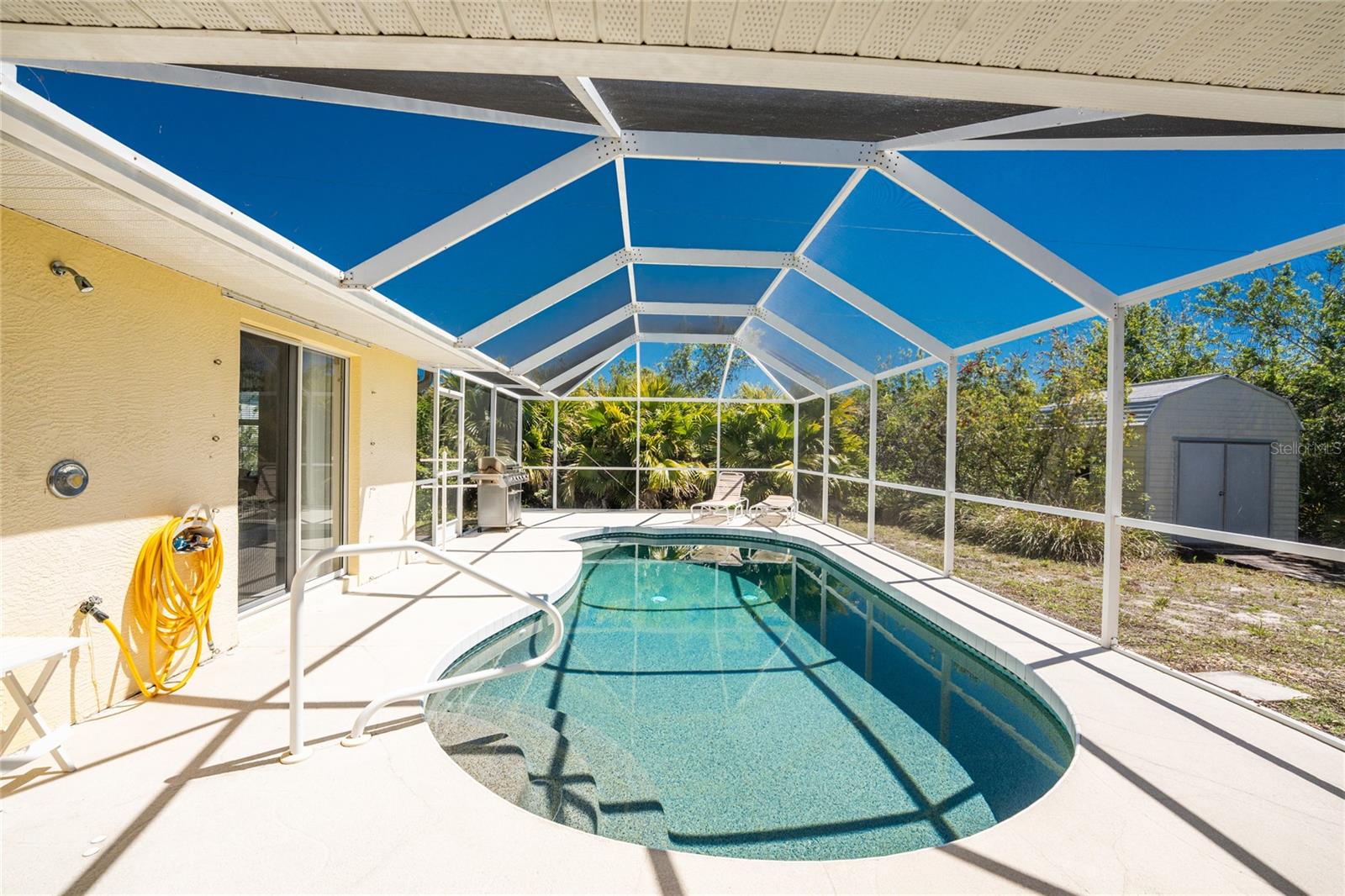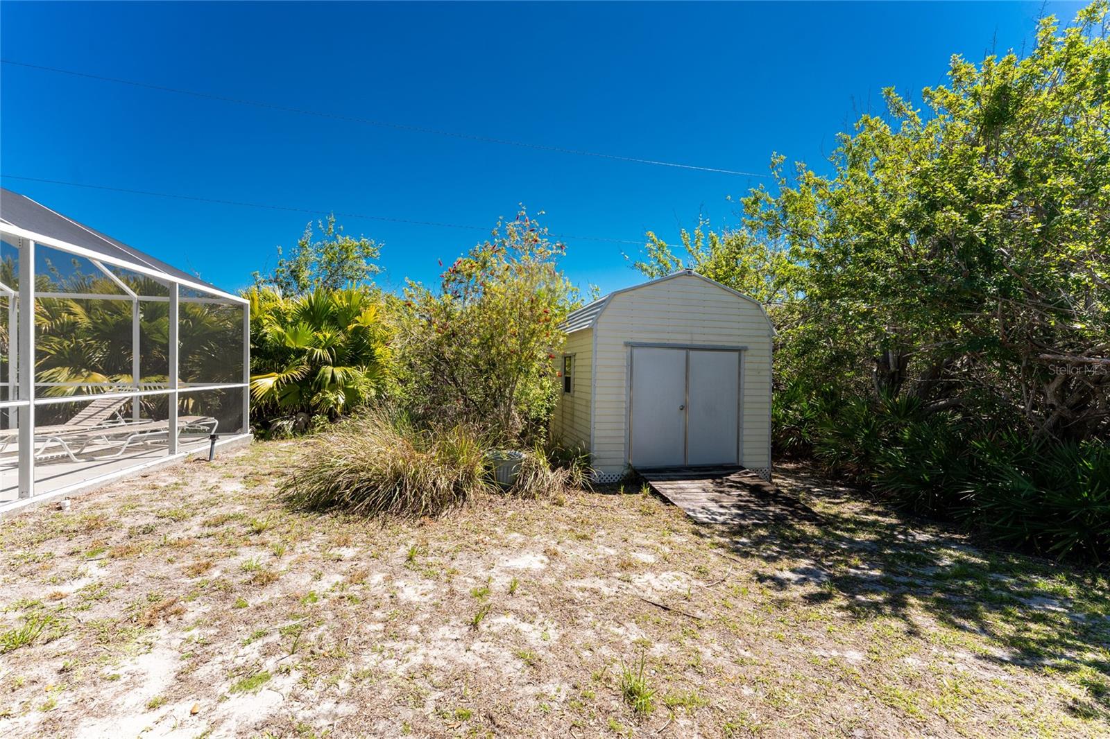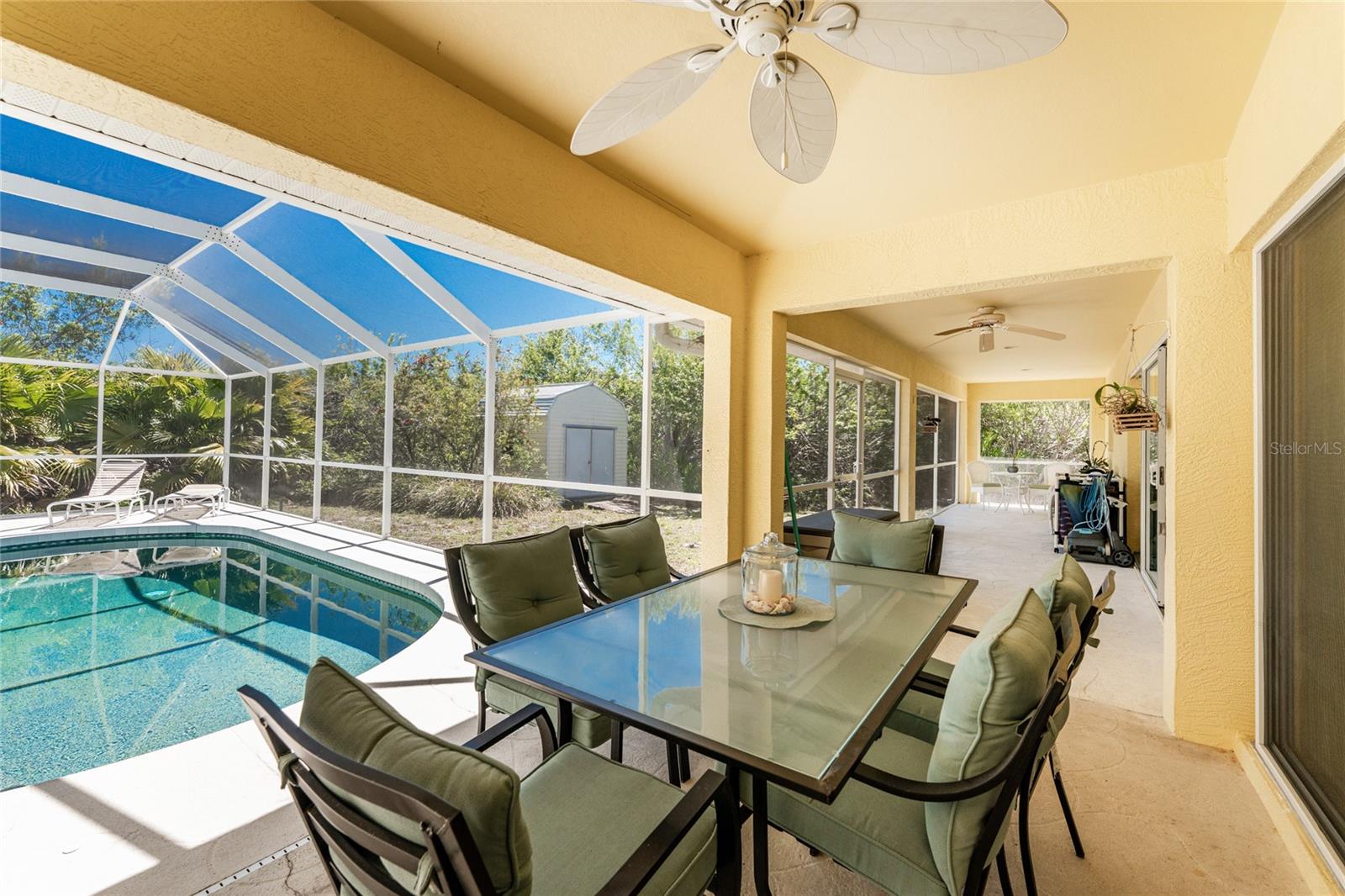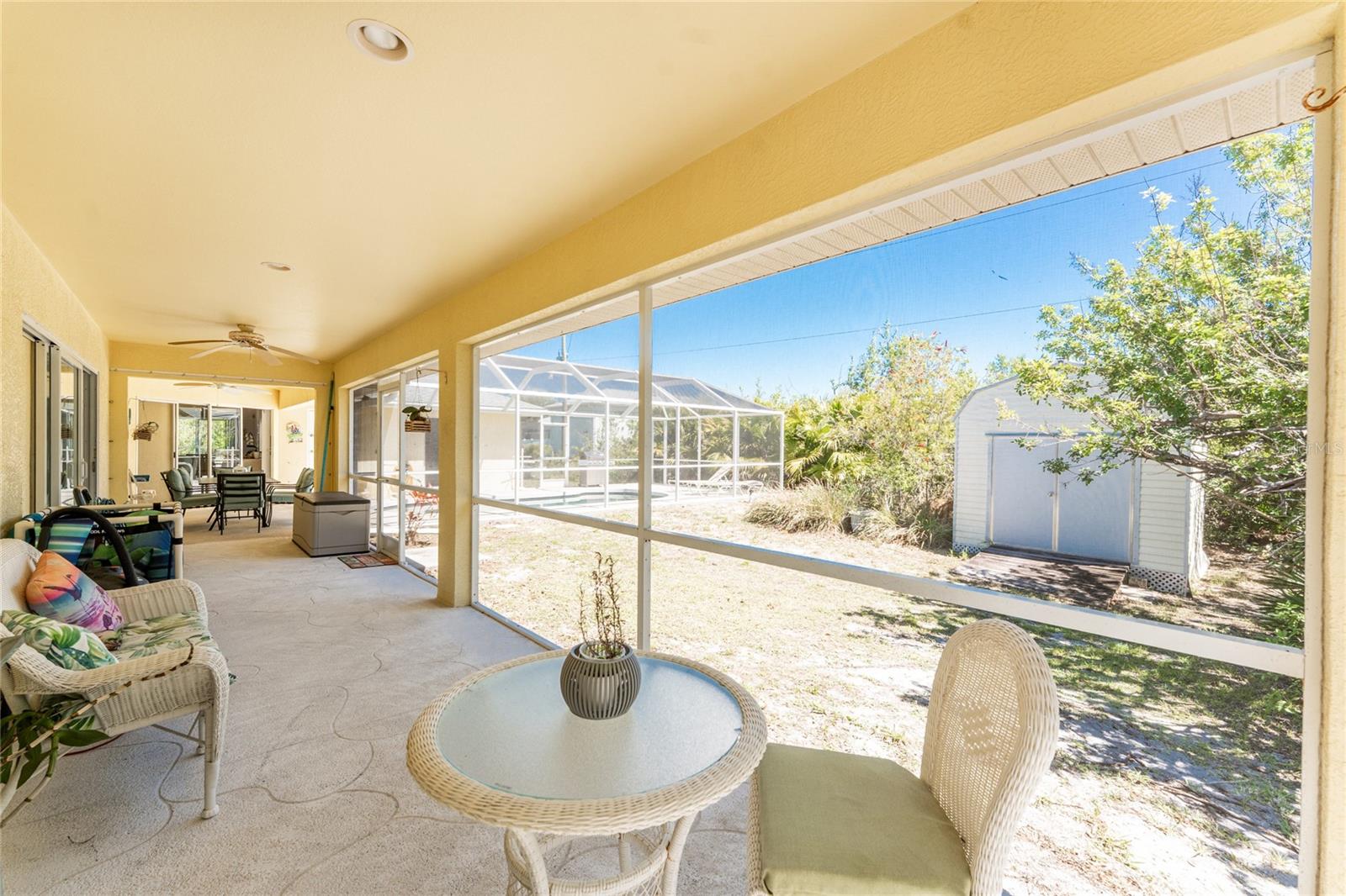 METICULOUSLY MAINTAINED HOME seated on a DOUBLE LOT with TWO ATTACHED GARAGES, & ONE OWNER, offers everything you could want -- and much more! From the dual-zoned A/C, new roof (2023), hurricane impact windows, X Flood zone, and FULLY FURNISHED-- when you arrive, you'll never want to leave. As you approach the front door, you are warmly welcomed with a screened-in front porch and stepping inside, the open floor plan with 12 foot vaulted ceilings and neutral color scheme awaits..... The great room provides the perfect space for entertaining with a spacious living room, dining area, and kitchen that features ample cabinets & countertop space, white appliances, a breakfast bar, recessed lighting, closet pantry, and access to the large laundry room with a pocketing door. The main living areas have easy to maintain tile that flows throughout most of the home. Easily expand your living space outdoors with triple pocketing sliding glass doors that lead outside to your EXPANSIVE (52' x 8') covered lanai encompassing the back of the home and accessible through 4 different sets of pocketing sliding glass doors, and if that's not enough there's an additional (36' x 19') lanai with a screen enclosure and your 24' HEATED POOL with upgraded Pebble Tec interior & new pool pump, surrounded by trees making this your private backyard oasis! There's plenty of room inside with a split bedroom floor plan providing privacy for everyone. The owner's suite is truly a "retreat" with a large bedroom, private access to the lanai and pool areas, a walk-in closet with a door to the second double car garage, and best of all a hobby room currently being used as a sewing/crafts area, that be utilized for a number of things and even an additional walk-in closet. The second walk-in closet leads to the primary bathroom that has ample cabinet space, large vanity, a roomy shower, and a door that leads to the bonus room which can be used as a home office, additional sitting area, man/woman cave, or space for your guests--with access to the pool area, the possibilities are endless! On the other side of the home are the two guest bedrooms--one with private access to the pool area, and both bedrooms feature quality carpeting, walk-in closets, and ceiling fans. The guest bath doubles as a POOL BATH with a shower/tub combo and lots of cabinets. Lets not forget about the TWO double car garages, one (24' x 20') and the second garage (21' x 19') this home offers an abundance of storage both inside and out! The (10' x 10') shed is the icing on the cake providing a workshop or MORE storage. There are SO many opulent features this home offers you must come see it for yourself! Just minutes away from world-class Gulf beaches, amazing fishing, numerous golf courses, bike trails, farmers markets and a wide selection of restaurants and quaint shops. You don't want to hesitate, you can make this your Florida oasis!