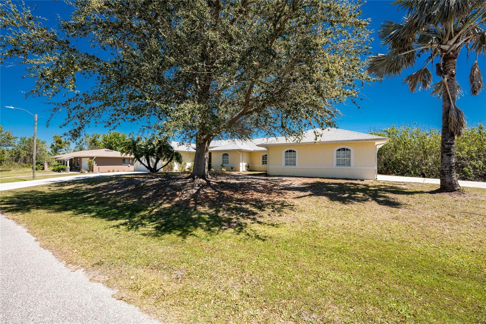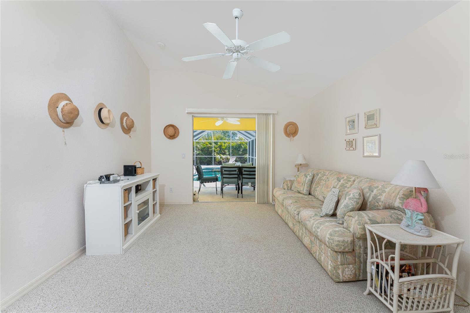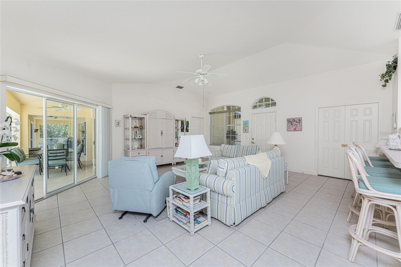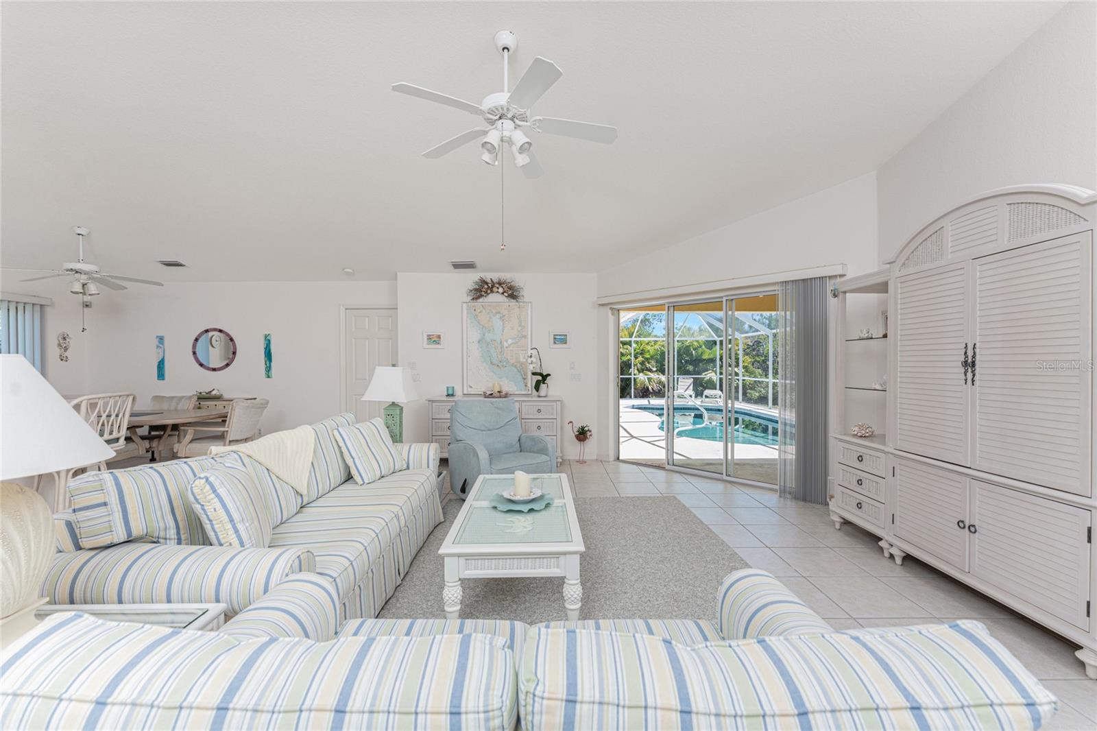 METICULOUSLY MAINTAINED HOME seated on a DOUBLE LOT with TWO ATTACHED GARAGES, & ONE OWNER, offers everything you could want -- and much more! From the dual-zoned A/C, new roof (2023), hurricane impact windows, X Flood zone, and FULLY FURNISHED-- when you arrive, you'll never want to leave. As you approach the front door, you are warmly welcomed with a screened-in front porch and stepping inside, the open floor plan with 12 foot vaulted ceilings and neutral color scheme awaits..... The great room provides the perfect space for entertaining with a spacious living room, dining area, and kitchen that features ample cabinets & countertop space, white appliances, a breakfast bar, recessed lighting, closet pantry, and access to the large laundry room with a pocketing door. The main living areas have easy to maintain tile that flows throughout most of the home. Easily expand your living space outdoors with triple pocketing sliding glass doors that lead outside to your EXPANSIVE (52' x 8') covered lanai encompassing the back of the home and accessible through 4 different sets of pocketing sliding glass doors, and if that's not enough there's an additional (36' x 19') lanai with a screen enclosure and your 24' HEATED POOL with upgraded Pebble Tec interior & new pool pump, surrounded by trees making this your private backyard oasis! There's plenty of room inside with a split bedroom floor plan providing privacy for everyone. The owner's suite is truly a "retreat" with a large bedroom, private access to the lanai and pool areas, a walk-in closet with a door to the second double car garage, and best of all a hobby room currently being used as a sewing/crafts area, that be utilized for a number of things and even an additional walk-in closet. The second walk-in closet leads to the primary bathroom that has ample cabinet space, large vanity, a roomy shower, and a door that leads to the bonus room which can be used as a home office, additional sitting area, man/woman cave, or space for your guests--with access to the pool area, the possibilities are endless! On the other side of the home are the two guest bedrooms--one with private access to the pool area, and both bedrooms feature quality carpeting, walk-in closets, and ceiling fans. The guest bath doubles as a POOL BATH with a shower/tub combo and lots of cabinets. Lets not forget about the TWO double car garages, one (24' x 20') and the second garage (21' x 19') this home offers an abundance of storage both inside and out! The (10' x 10') shed is the icing on the cake providing a workshop or MORE storage. There are SO many opulent features this home offers you must come see it for yourself! Just minutes away from world-class Gulf beaches, amazing fishing, numerous golf courses, bike trails, farmers markets and a wide selection of restaurants and quaint shops. You don't want to hesitate, you can make this your Florida oasis!