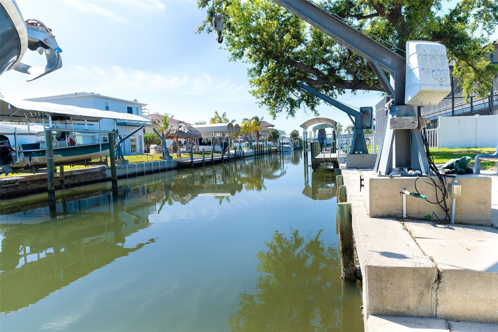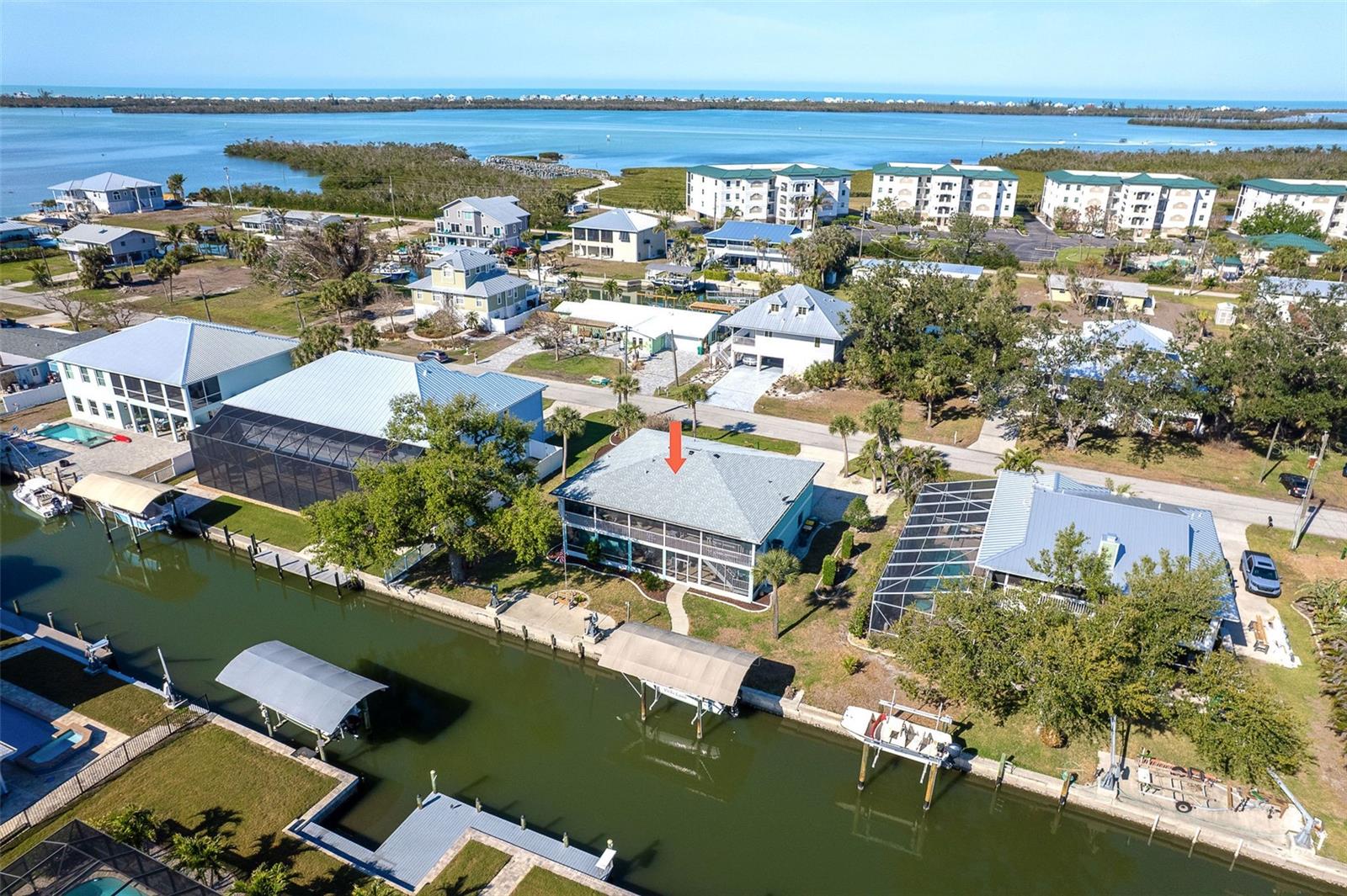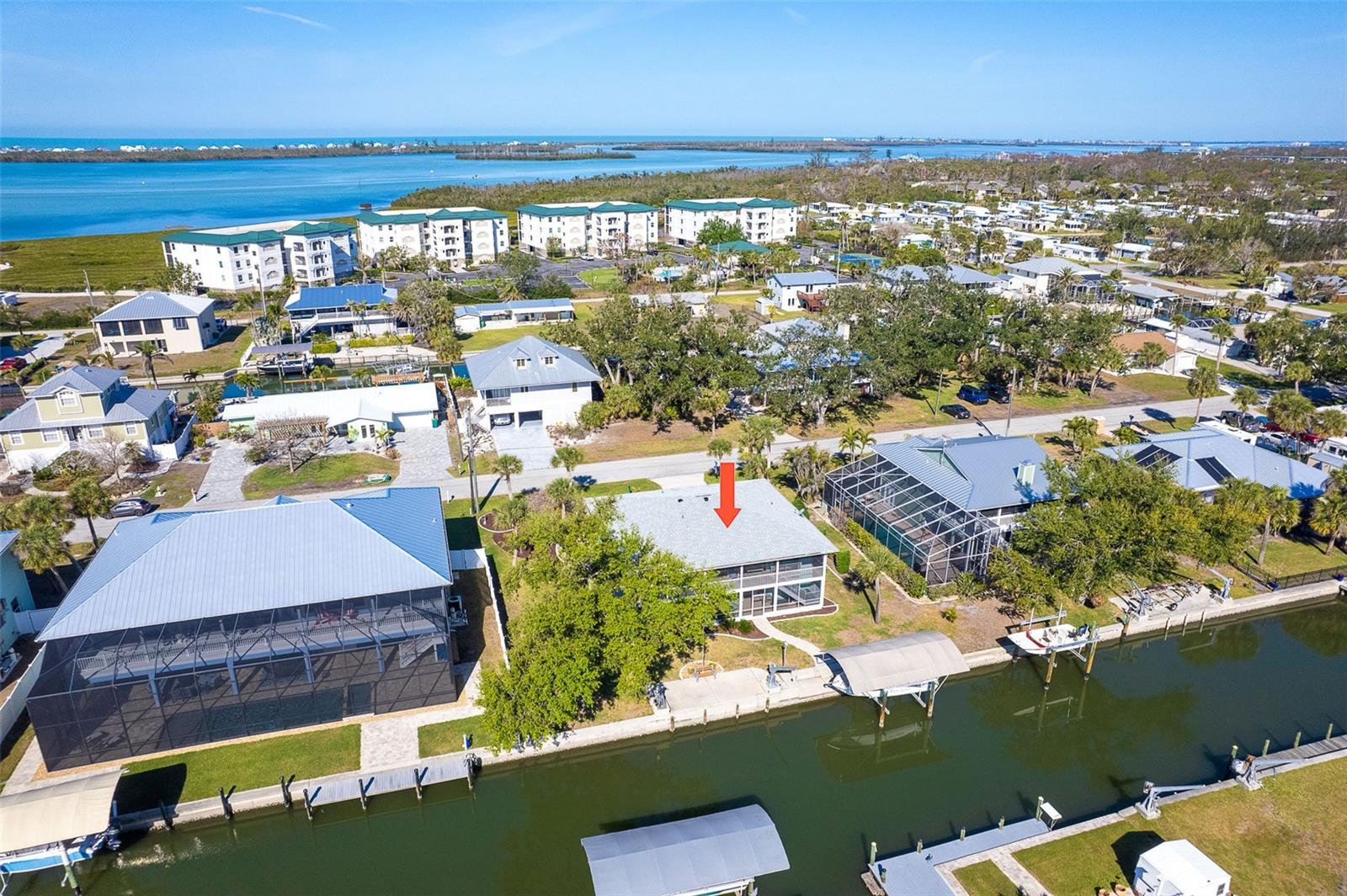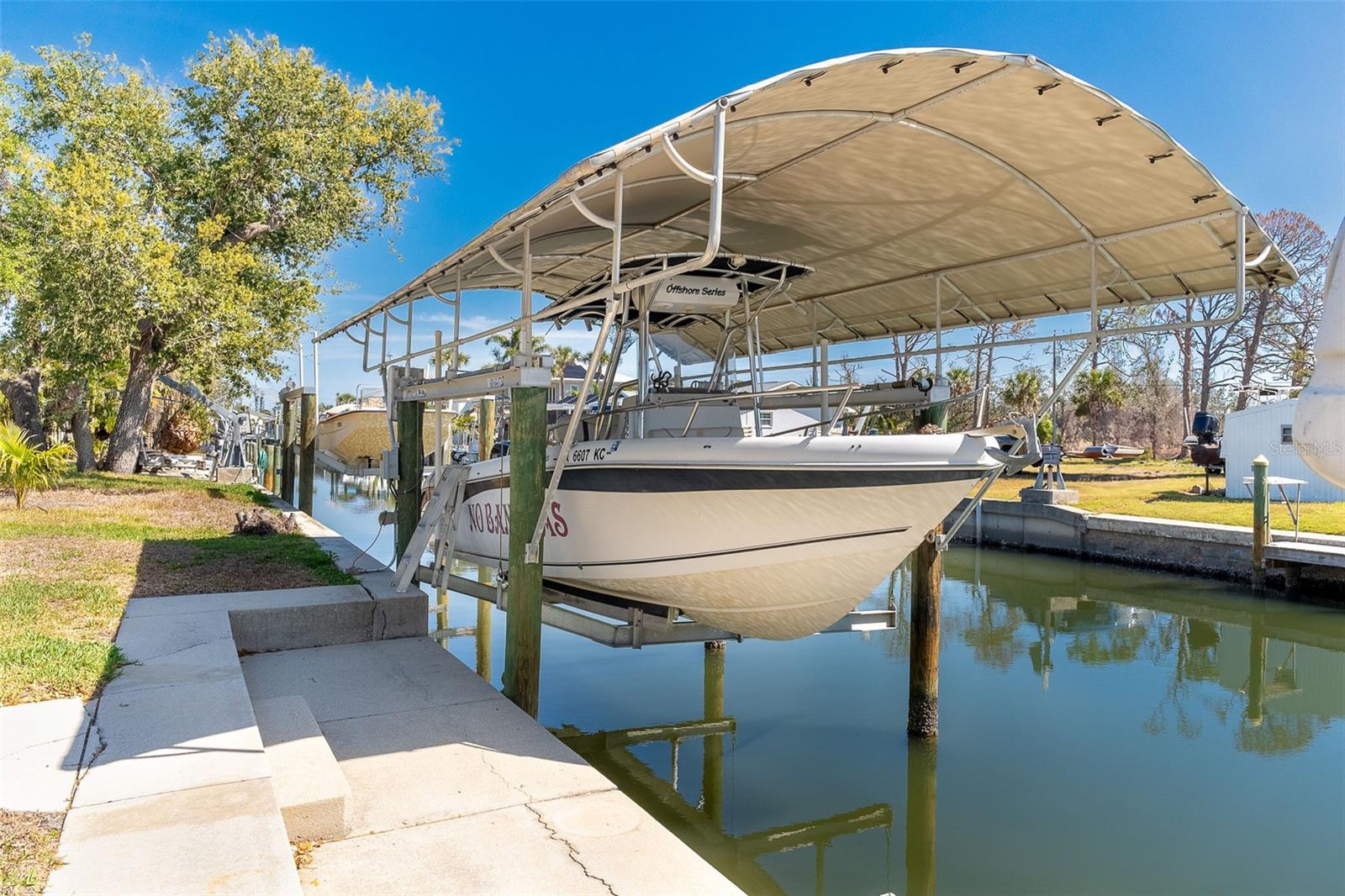 One or more photo(s) has been virtually staged. Experience the best of Florida waterfront living in this elevated 3-bedroom, 2-bath coastal retreat, perfectly positioned on an oversized lot with 100 feet of deep-water frontage and BOATABLE DEEP WATER! Designed for boaters and built for peace of mind, this sailboat-accessible property features a covered boat lift, concrete seawall, private dock, and extended waterfront entertaining area, just minutes from the Intracoastal Waterway and the Gulf of America. Upstairs living captures sweeping water views and effortless indoor-outdoor flow. The perfect porch frames both sunrise and sunset, while large sliding glass doors fill the open great room and dining area with natural light. The updated kitchen offers granite countertops, stainless steel appliances, beautiful cabinetry, three pantries, and a built-in desk with water views and direct lanai access—perfect for both everyday living and entertaining. The primary suite is a private retreat with built-in closets and an ensuite bath featuring granite countertops and a walk-in shower. Two guest bedrooms provide flexibility, including one with a Murphy bed and lanai access—ideal as a home office or guest space—and an oversized secondary guest room served by a well-appointed guest bath. Multiple outdoor living areas enhance the coastal lifestyle, with dual screened-in lanais on both levels offering serene water views. The ground level includes a spacious garage, workshop area, and screened garage space, all designed with elevation and functionality in mind. Notable updates include a 2023 roof, 2023 A/C, 2024 water heater, 2024 refrigerator and microwave, central vacuum system, and elevated HVAC placement for added security. Beautiful landscaping completes this exceptional waterfront offering. A rare opportunity to own a deep-water, waterfront home where boating, views, and elevated living come together seamlessly.