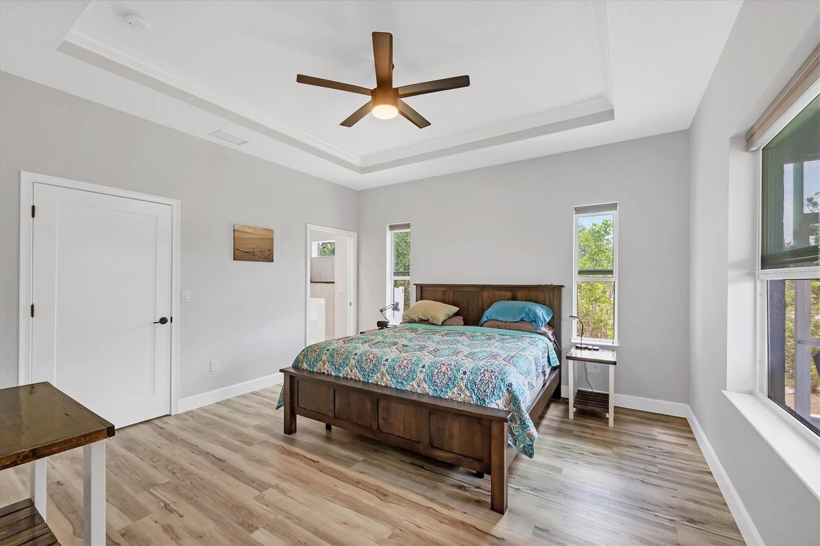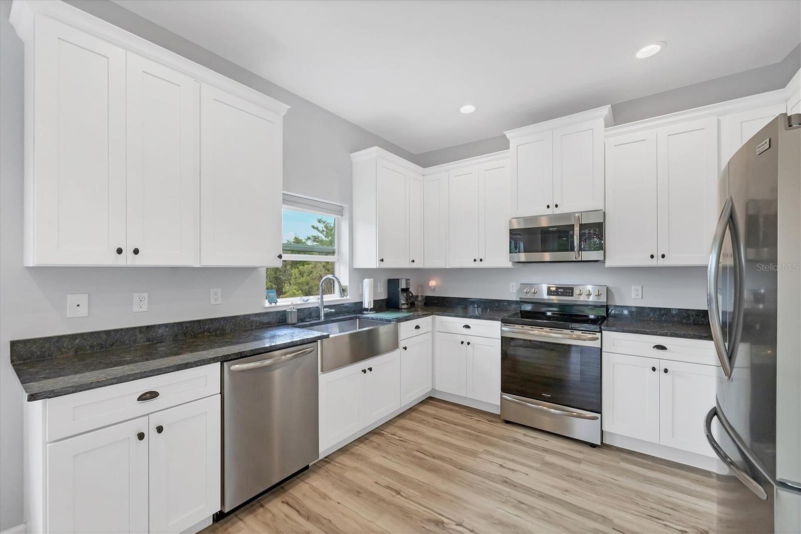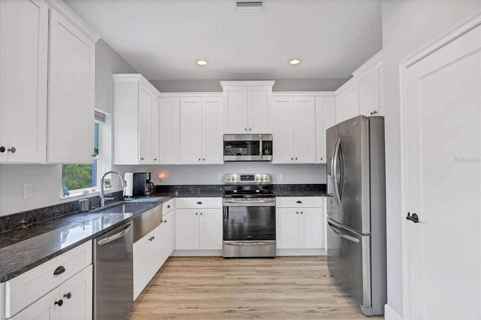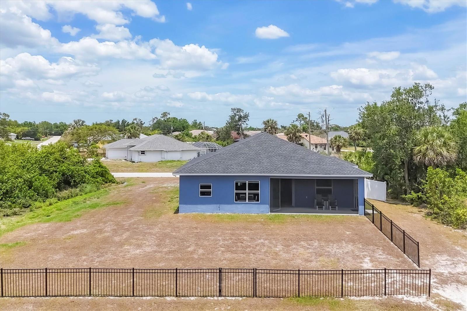 Move-In Ready Waterfront Home – Built in 2021! This beautifully maintained 3-bedroom, 2-bath canal-front home sits on a double lot. Enjoy serene water views from your screened back porch, accessible via a triple sliding door. Inside, the home features luxury vinyl plank flooring throughout, impact windows and doors, and a spacious living room with a coffered ceiling, recessed lighting, and an oversized ceiling fan. The kitchen is a chef’s dream with granite countertops, soft-close cabinetry, a farmhouse sink, stainless steel appliances, and a picturesque window over the sink overlooking the canal. The primary suite boasts a generous walk-in closet and a luxurious bath with dual granite vanities, a walk-in shower, and a separate walk-in tub. Additional highlights include a tile-surround second bath, inside laundry, and ample space to add a detached garage or park your RV, boat, or other recreational vehicles. Located in an X flood zone with no HOA—this home offers both peace of mind and freedom. Don’t miss this rare opportunity!