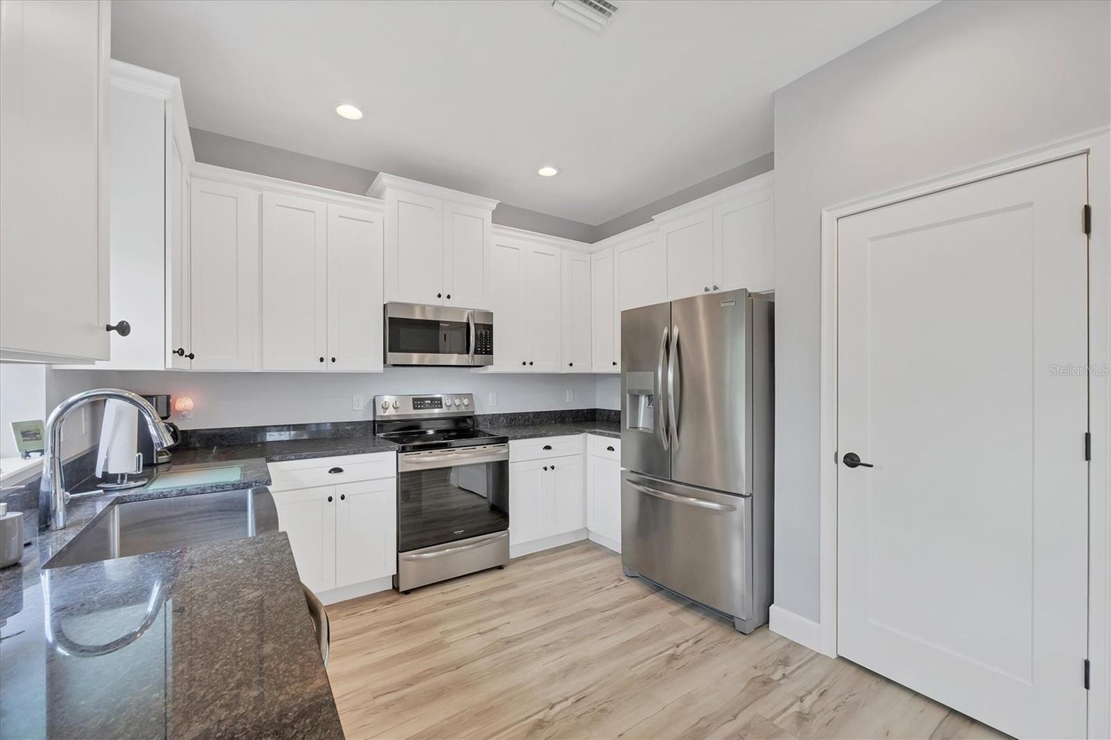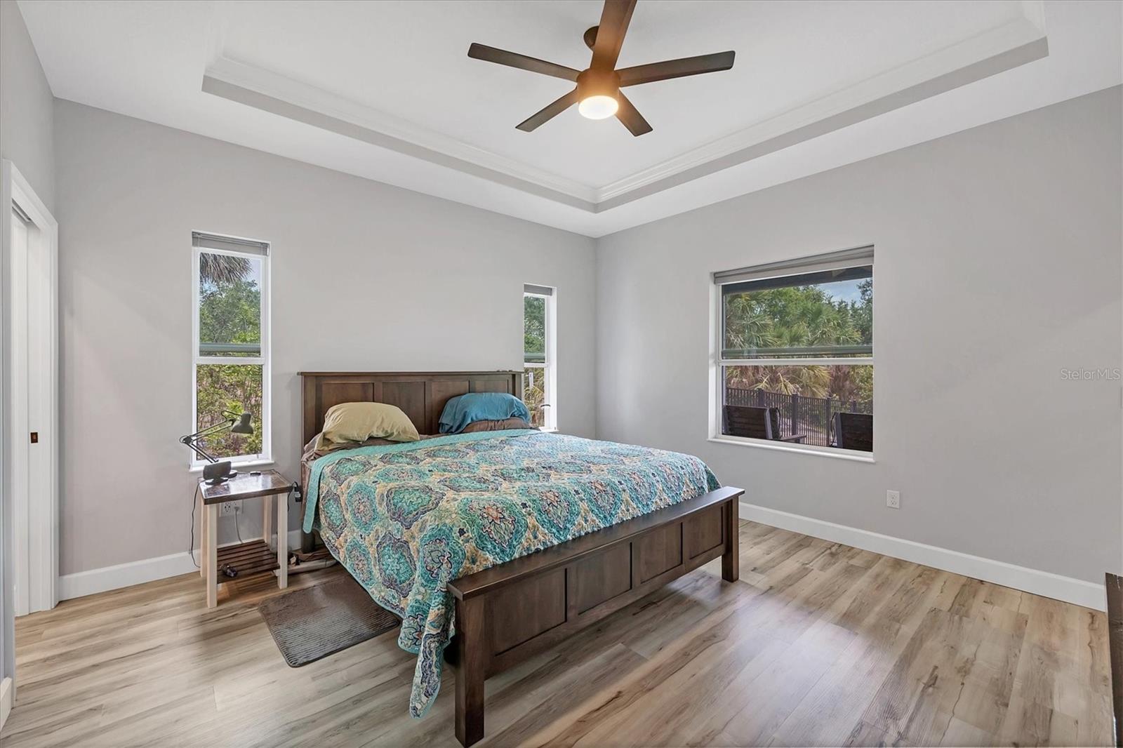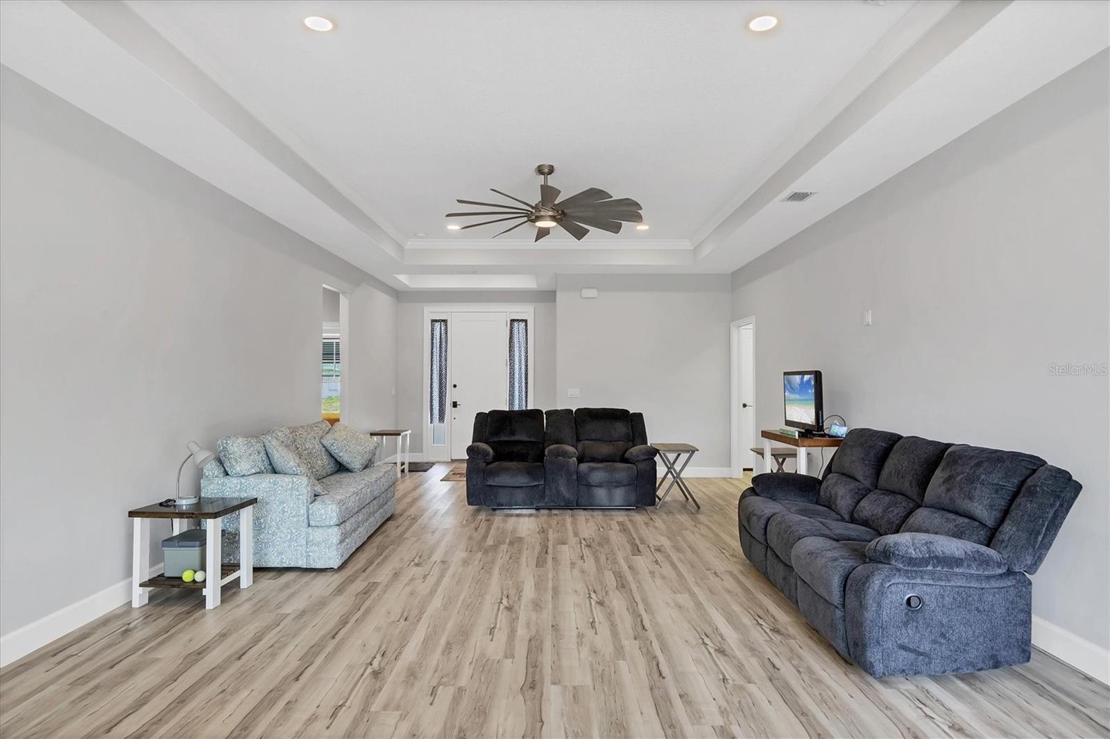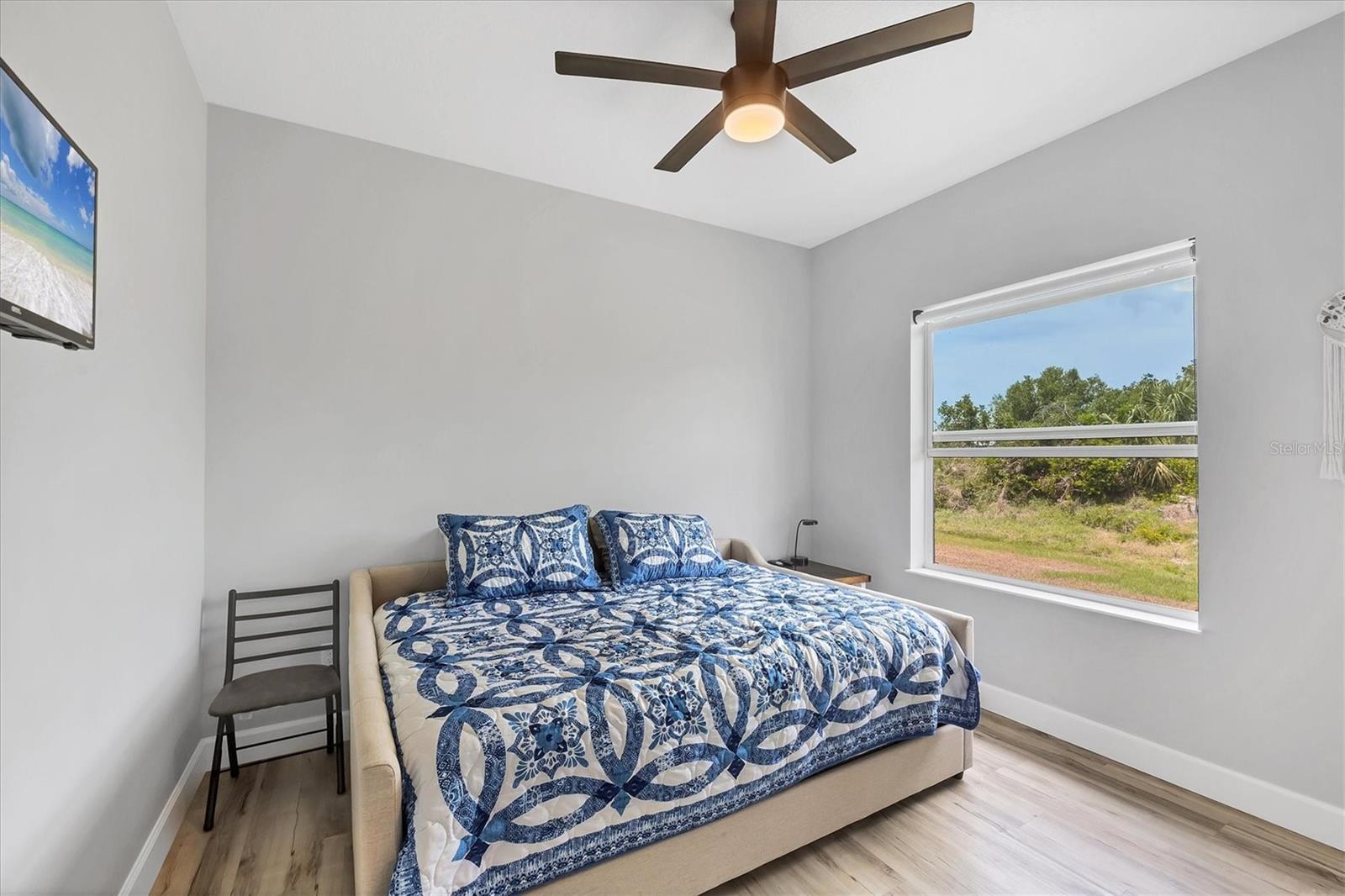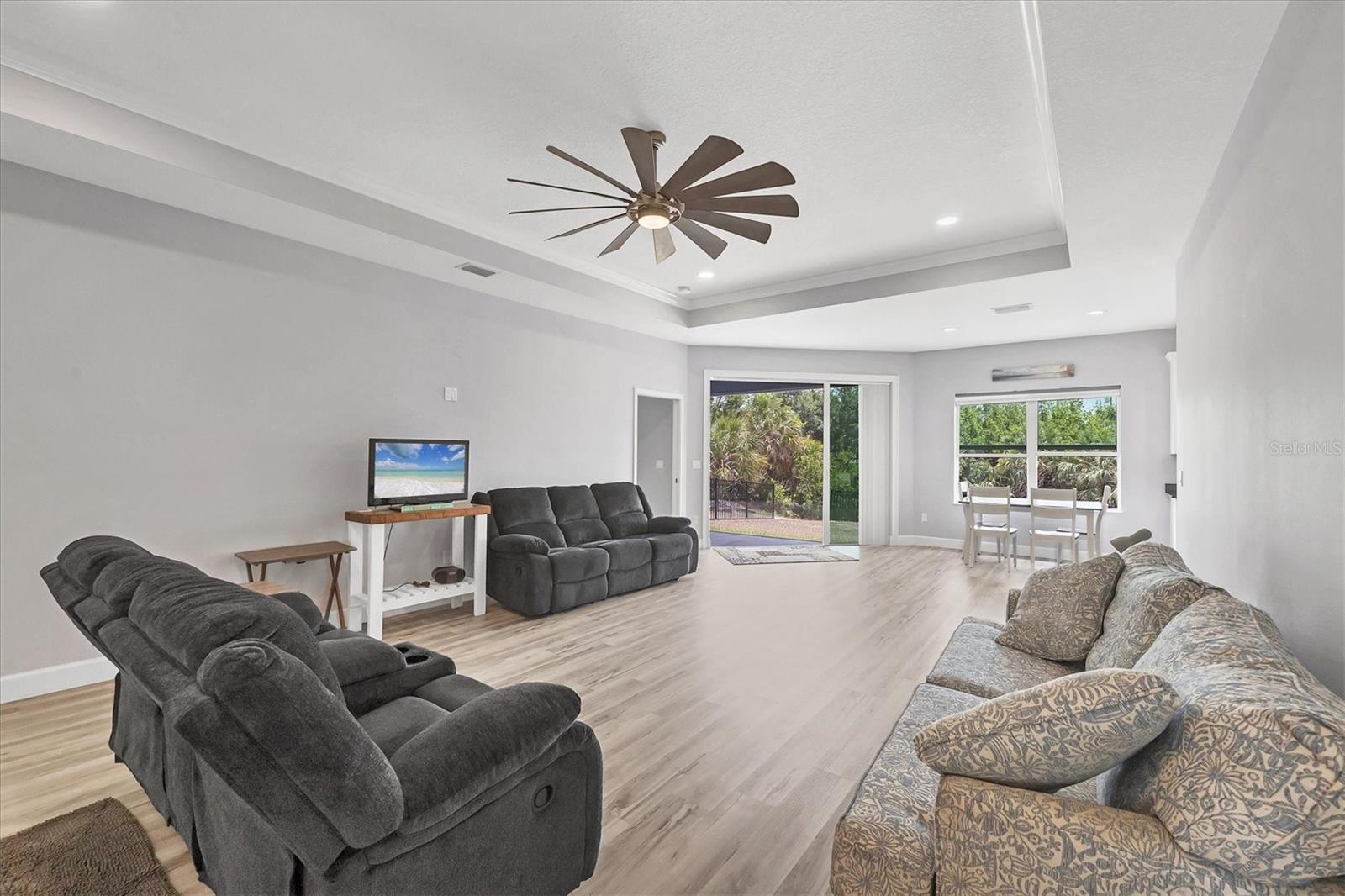 Move-In Ready Waterfront Home – Built in 2021! This beautifully maintained 3-bedroom, 2-bath canal-front home sits on a double lot. Enjoy serene water views from your screened back porch, accessible via a triple sliding door. Inside, the home features luxury vinyl plank flooring throughout, impact windows and doors, and a spacious living room with a coffered ceiling, recessed lighting, and an oversized ceiling fan. The kitchen is a chef’s dream with granite countertops, soft-close cabinetry, a farmhouse sink, stainless steel appliances, and a picturesque window over the sink overlooking the canal. The primary suite boasts a generous walk-in closet and a luxurious bath with dual granite vanities, a walk-in shower, and a separate walk-in tub. Additional highlights include a tile-surround second bath, inside laundry, and ample space to add a detached garage or park your RV, boat, or other recreational vehicles. Located in an X flood zone with no HOA—this home offers both peace of mind and freedom. Don’t miss this rare opportunity!