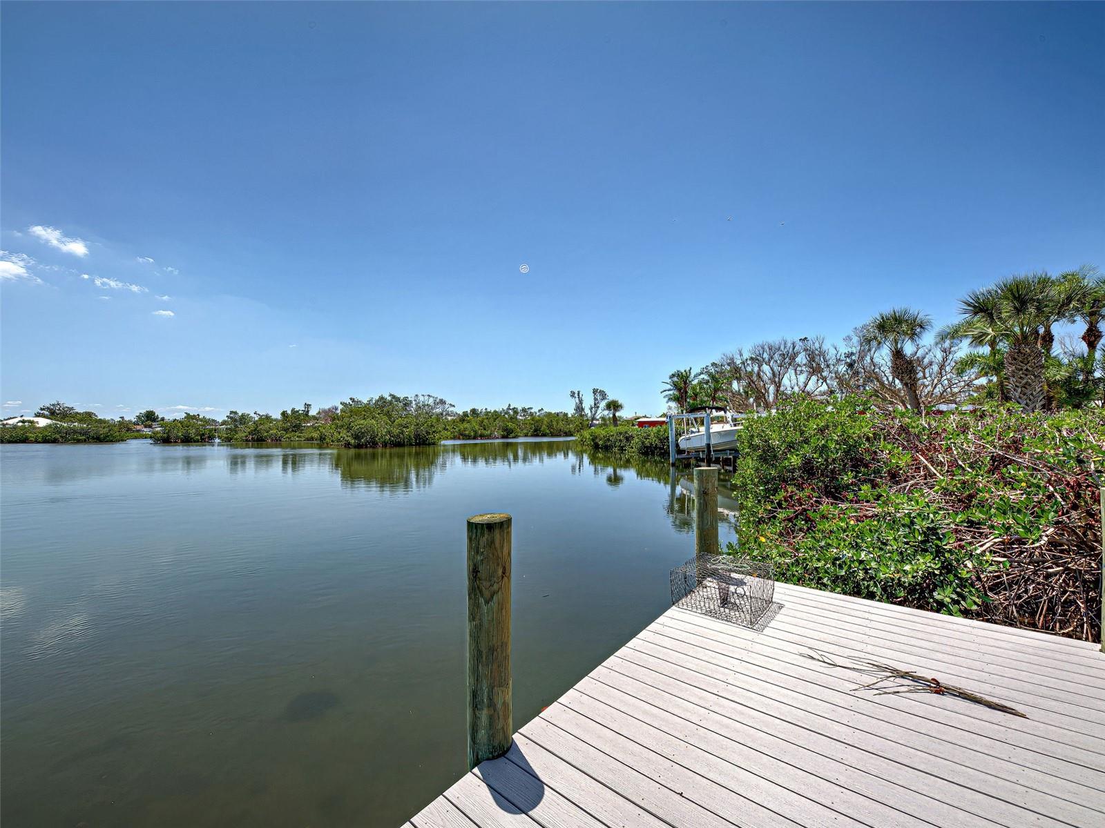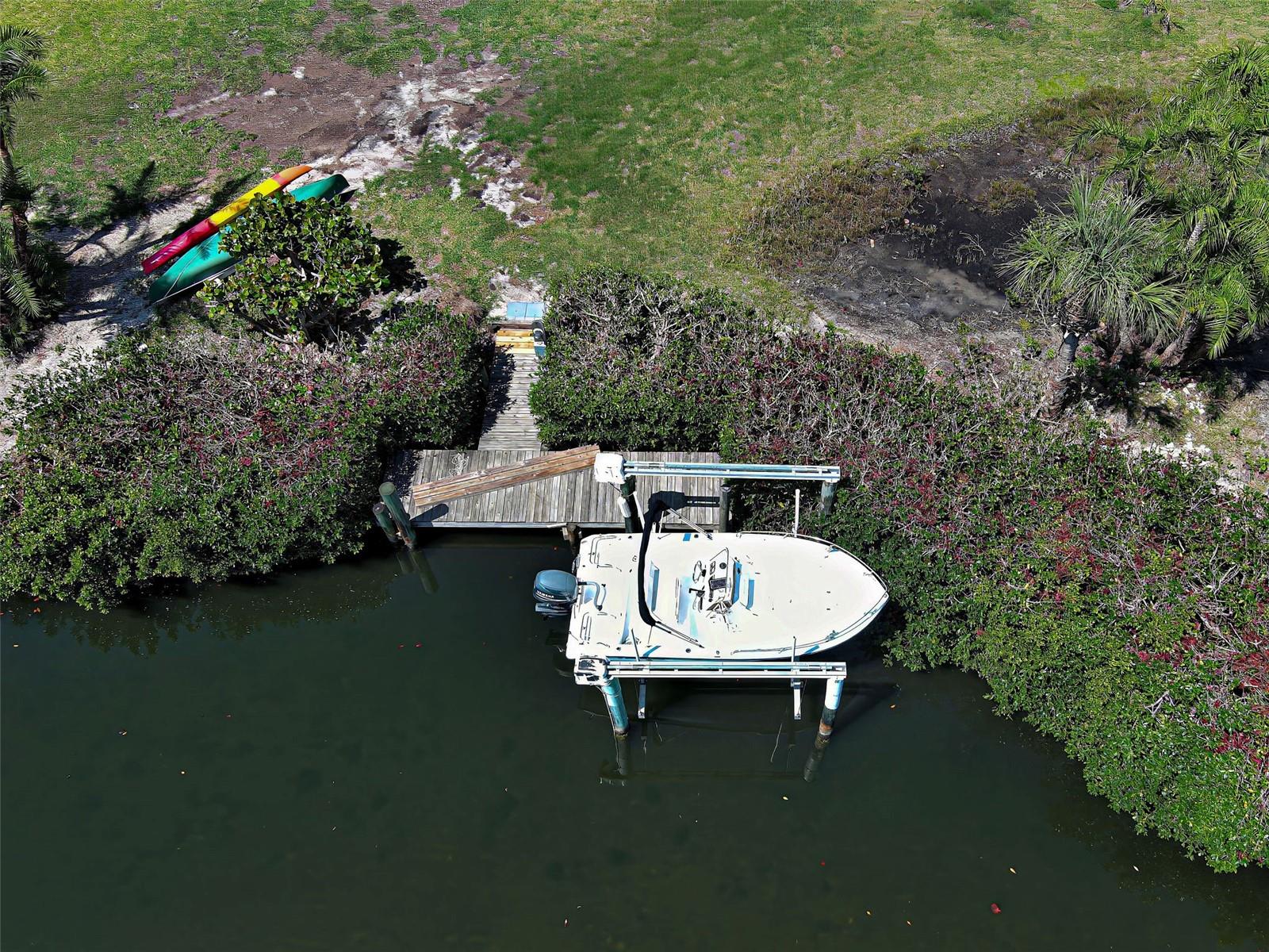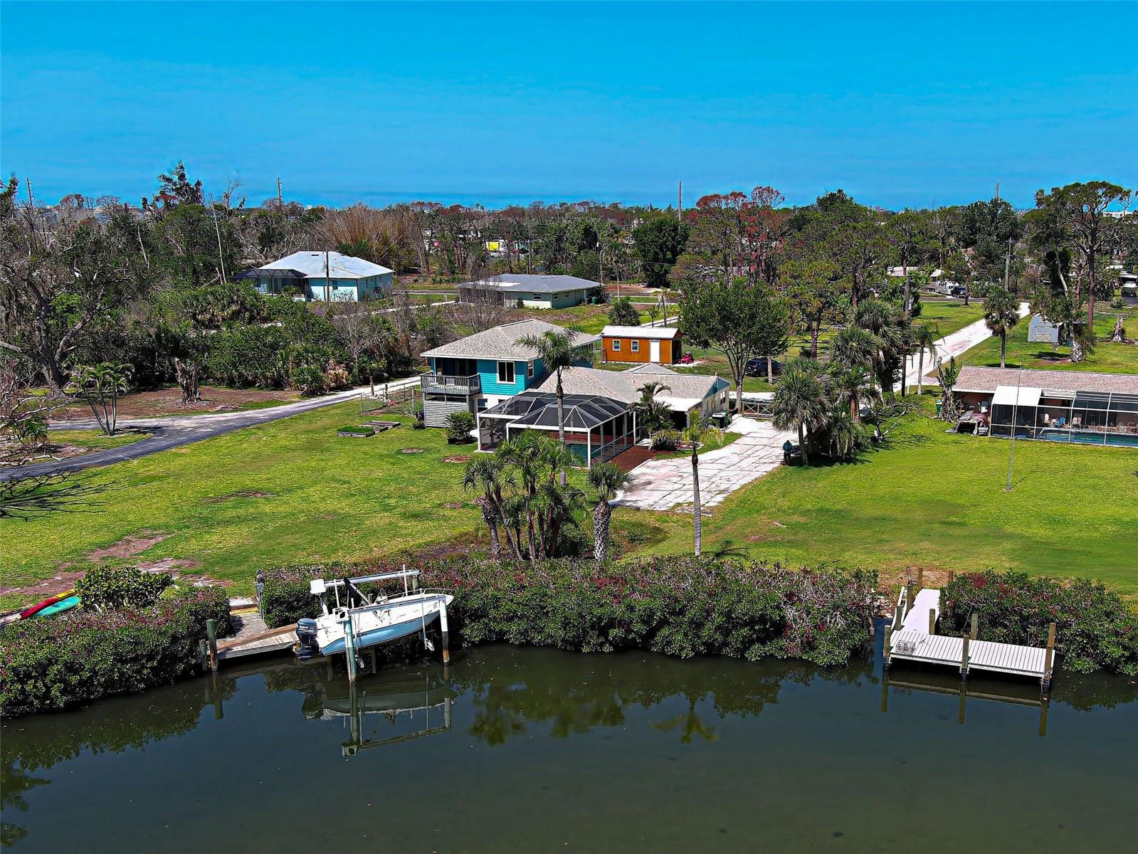 Boater's Paradise!!! Beautifully renovated waterfront home with one bridge to Lemon Bay and easy access to the Gulf at Stump Pass. Dock is equipped with a 6000 lb. Boat Lift and there is a floating dock for canoe/kayak access along the 170 ft. pristine Ainger Creek. This serene 1.08 acres property includes the home and Lots 3,4 and 5. Lots 1 and two totals .7 acres and are available under a separate agreement. The entire first floor and lanai are artfully tiled and natural stone pavers encircle the pool. This home doubled in size in 2000 with a two story addition including a primary bedroom with a wonderful view of the creek from a private balcony. Also has a sitting area and en suite with a jetted tub. The second level also includes a guest room with bath and laundry room. The sparkling, heated, saltwater pool was added in 2021 and has a Clearview pool cage and a new pump and pool heater this year. Large area on the lanai is wired for a hot tub or perfect for adding an outdoor kitchen. The dining room opens up to the lanai with two sets of French doors. There is a bonus room with plank floor tile and an oversized attached one car garage with plenty of room for storage. The first level also has a guest room. totally remodeled bath, and an office/den with closet which could be a fourth bedroom The beautiful remodeled kitchen has exotic granite countertops, tumbled marble backsplash, hardwood Cherry cabinetry, and all new appliances. Impact windows are installed on all the windows on the second floor and hurricane fabric on the balcony and all windows and doors on the lower level. The roof was re-shingled in 2022. The entire exterior and first level interior was just painted this year The first floor AC unit is new and the main electric service is also new this year. A detached 12x24 garage/workshop was recently built. Dogs can find all the legroom they need in the supersized fenced area accessed through a dog door in the garage. You will love the location of this property near shopping, restaurants , numerous golf courses and just two miles from the beautiful beaches on Manasota Key. Come experience the old Florida charm that this wonderful Englewood home has to offer.
