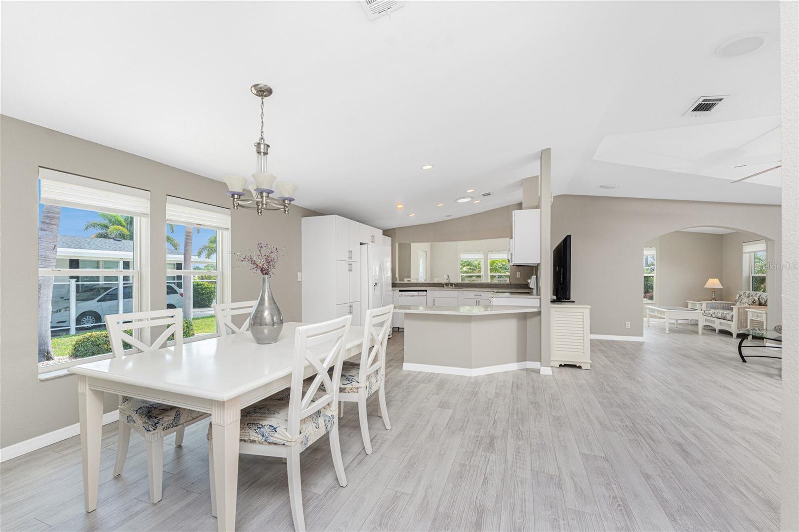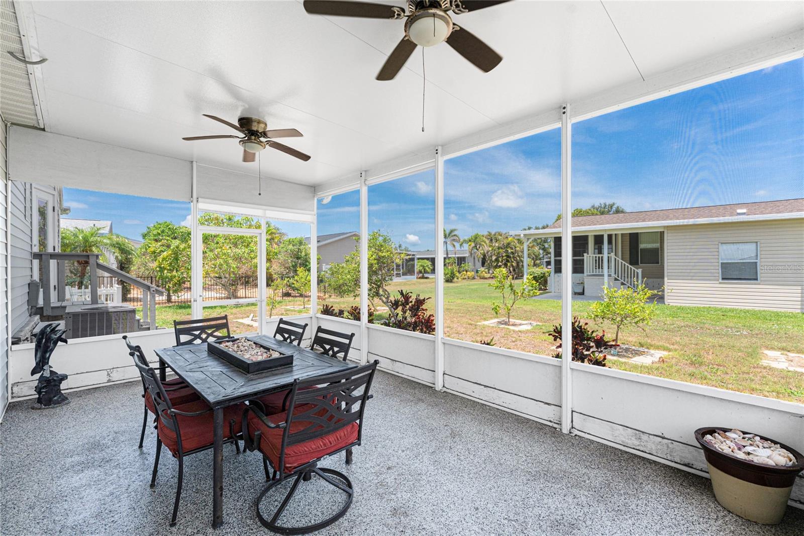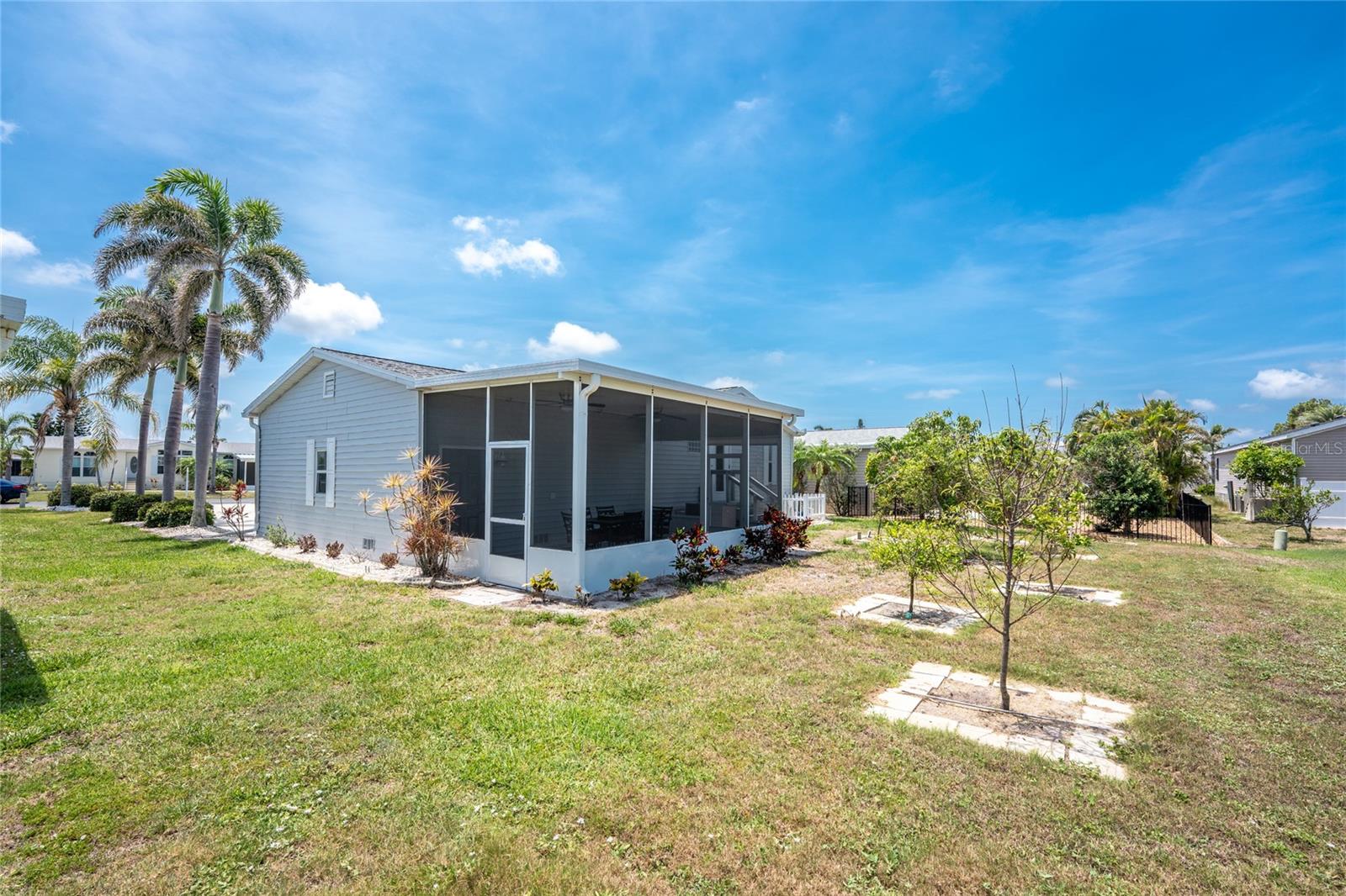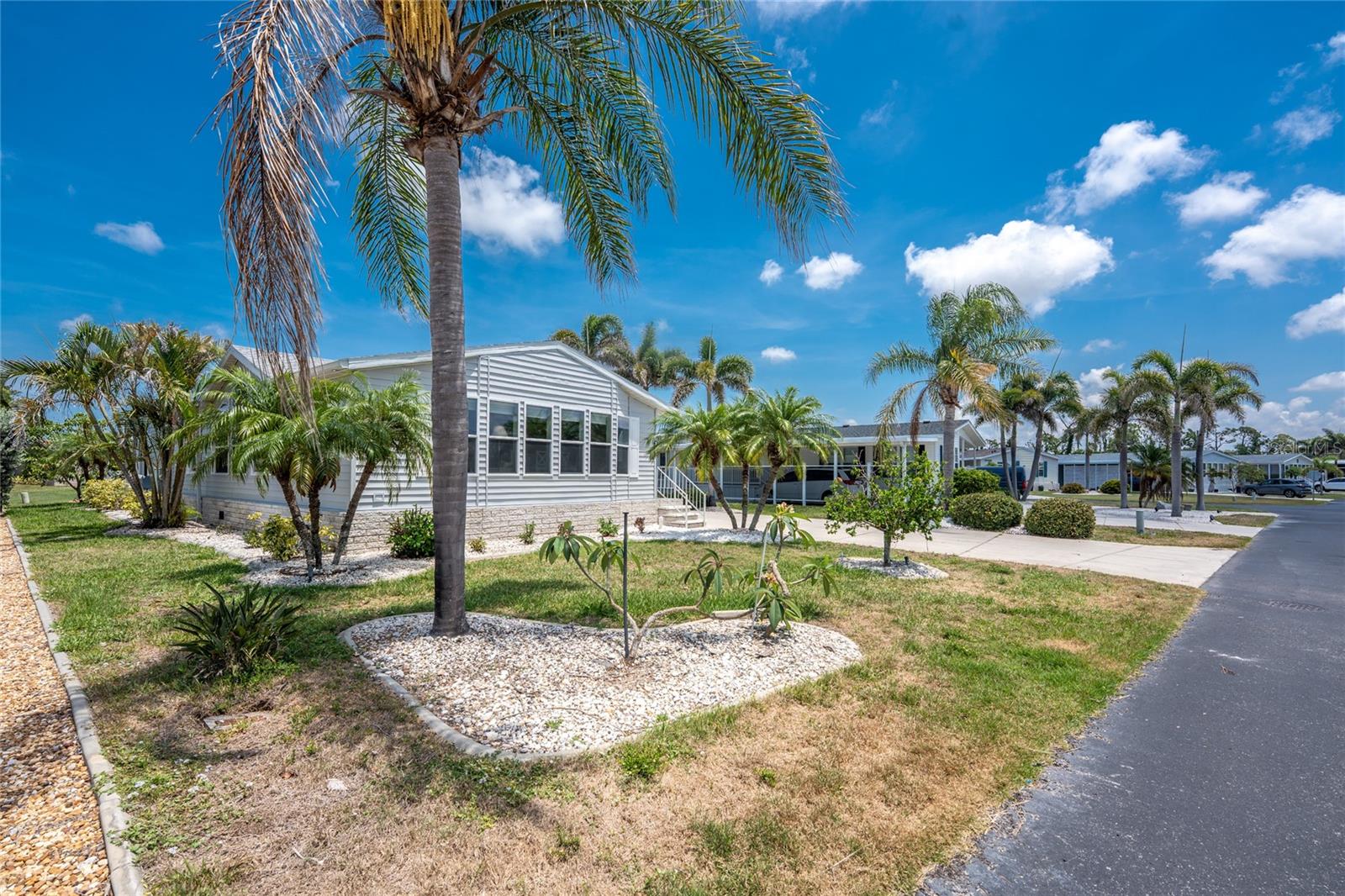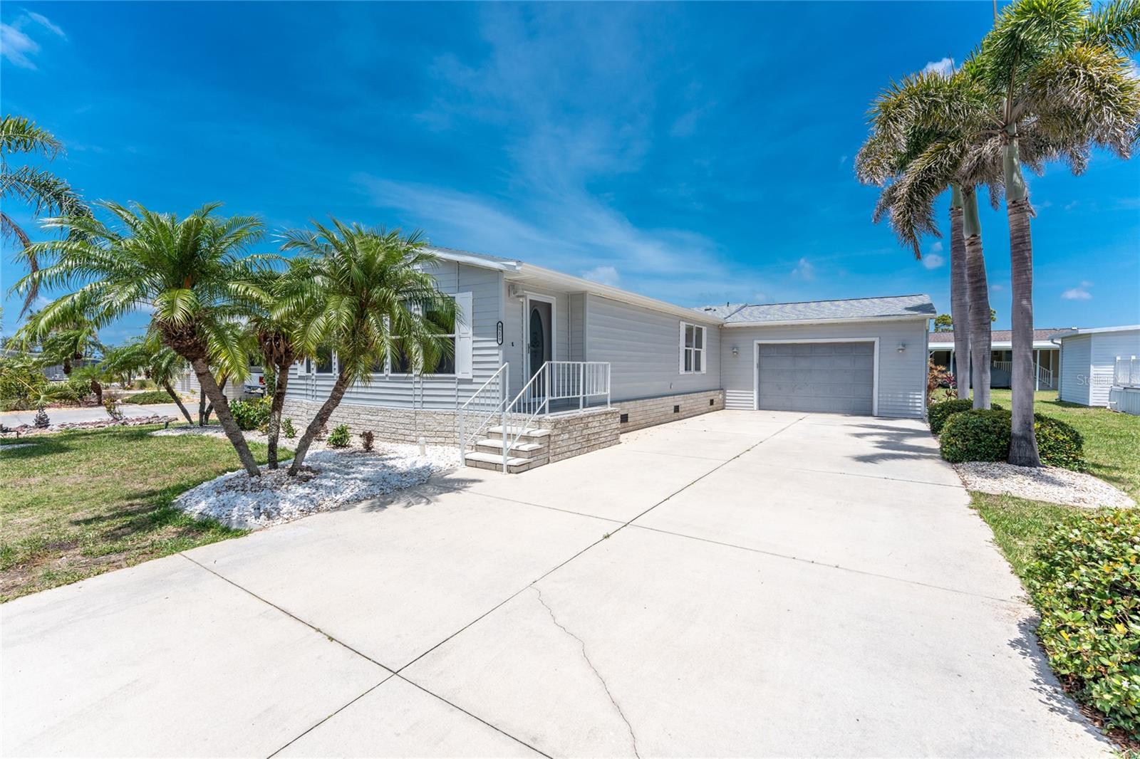 Enjoy peace of mind and the comfort of a like-new home at The Pines of Sandalhaven. Located in the X flood zone and equipped with hurricane shutters, this furnished three-bedroom, two-bathroom home is set within a 55+ deed-restricted community. A one-of-a-kind oversized enclosed garage, the only one of its kind in the neighborhood, is included with its contents such as a golf cart with newer batteries, a lawn mower, and a bicycle, offering exceptional storage, security, and flexibility that is incredibly rare for a manufactured home. Extensive renovations completed in 2024 and 2025 have transformed the property into a light, bright, and stylish retreat. Outside, you’ll find brand-new siding with stone accents, mature landscaping, and a 2023 roof. Inside feels fresh and modern, with new insulation, drywall, paint, vaulted ceilings, light-toned luxury vinyl plank flooring throughout, and a soft, neutral color palette that ties it all together. A decorative leaded glass front door opens to a spacious sunroom, perfect as a formal living area or a bonus space. The main living room features a soaring cathedral-style wall of windows that floods the home with natural light. The kitchen includes ample white cabinetry, plenty of counter space, and two breakfast bars ideal for casual meals or entertaining. A formal dining area next to the kitchen is just right for hosting gatherings or holiday dinners. The primary suite offers a quiet escape with vaulted ceilings, access to the backyard, a large reach-in closet, and an en-suite bath with dual sinks and a walk-in shower. Two guest bedrooms and the full guest bath includes a convenient tub/shower combo, great for family and friends. The interior laundry room adds functionality with built-in shelving for storage. When you are ready to enjoy the outdoors, the screened lanai with ceiling fans is a great place to kick back and relax—or fire up the grill after a day on the water. The Pines of Sandalhaven offers a low-maintenance, pet-friendly lifestyle with low quarterly HOA fees, no lot rent (you own the land), and fantastic amenities including a heated pool, clubhouse with year-round activities, pickleball and bocce courts, and beautifully maintained park areas. You’re also just minutes from Englewood and Boca Grande beaches, golf courses, local dining, shopping, and nature trails at Wildflower Preserve and Amberjack Environmental Park. Come see everything this move-in ready home at 9209 Pinehaven Way has to offer, schedule your private showing today.