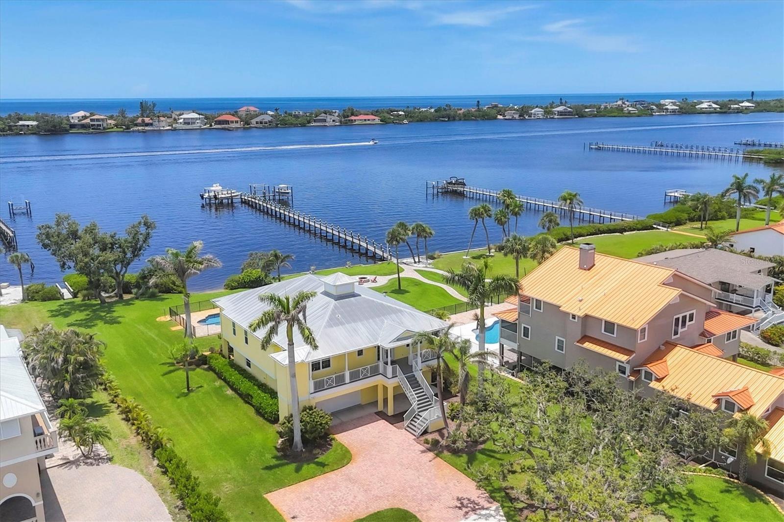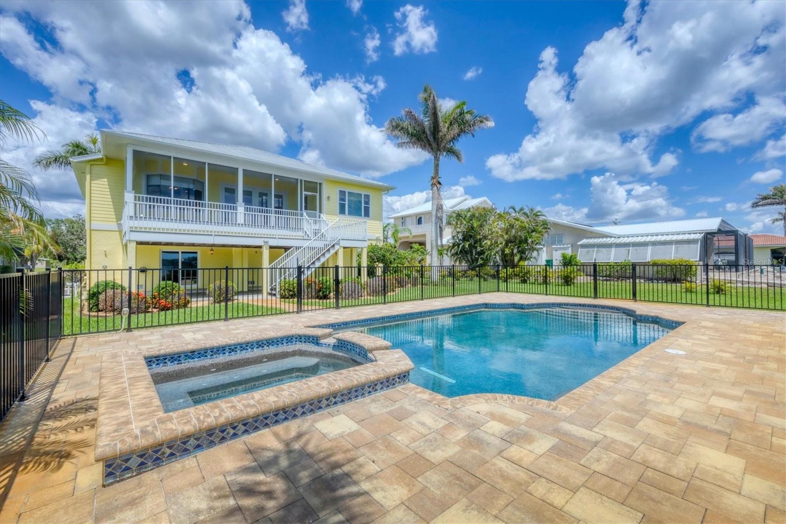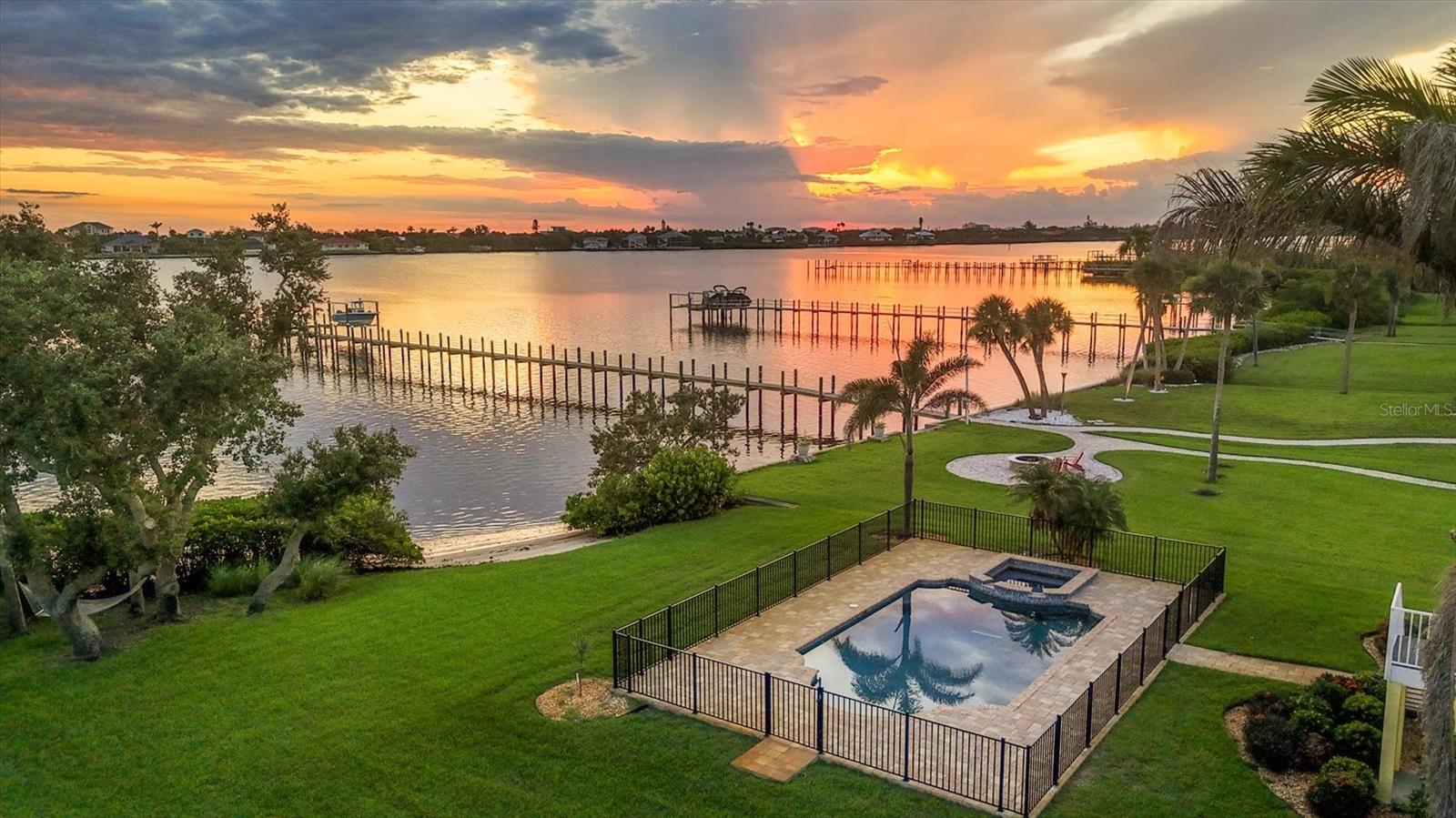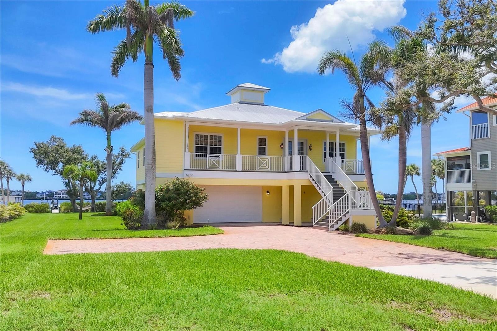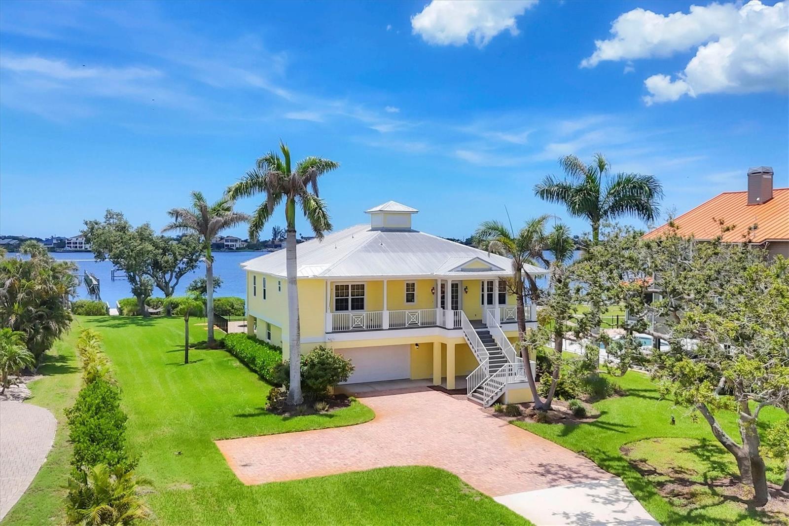 One or more photo(s) has been virtually staged. Take a Look! The price for this Key West-style waterfront residence has been adjusted. Situated on 1.27 acres, the property features approximately 100 feet of intercoastal frontage and a beautifully landscaped driveway lined with mature trees. The main living space, spanning 2,399 square feet, is located on the second floor to take advantage of the spectacular water views. As you enter the home, you are greeted by an open floor plan that includes a spacious living room, kitchen, and dining area. The home boasts three bedrooms, 2.5 bathrooms, tile flooring throughout the great room, tray and coffered ceilings, and a light and airy color scheme. The primary bedroom and large office have gleaming wood floors. The large open kitchen is equipped with SS appliances, granite countertops, and a generous island with seating space. A large pantry and laundry room are off the kitchen. The open floor plan is perfect for entertaining, with a living room that opens to a 281 sq. ft. screened lanai overlooking the sparkling saltwater pool and water views. The home also features high-impact glass windows, a metal roof, all Hardie board siding, and an elevator to the second floor. An 8-car oversized tandem garage and added storage or a large workshop, which has 1,034 sq. ft. and a bathroom. A new dock, complete with a 10,000 lb. lift for your boat and watercraft, has been installed. The main living space was unaffected by storms. This exquisite home offers the perfect blend of luxury and comfort, allowing you to enjoy beautiful marine life with its convenient location just minutes from Manasota Beach. Relax and enjoy the world-famous sunsets at Manasota Key. This is more than a home, it’s a lifestyle.