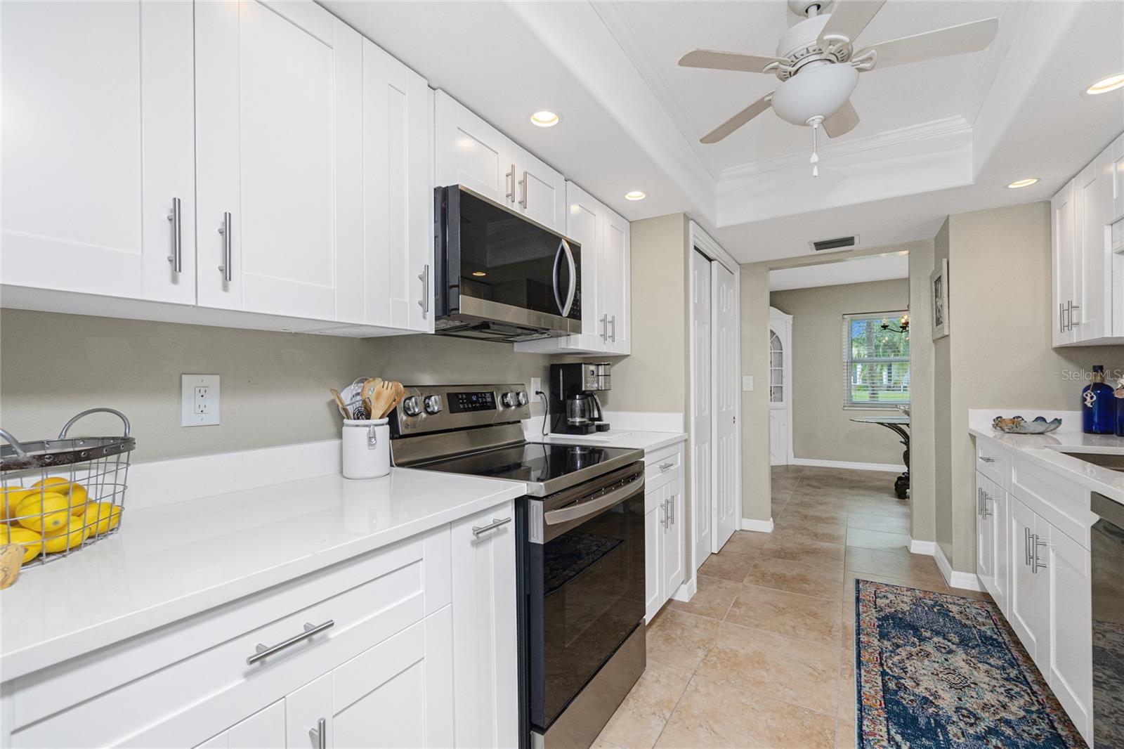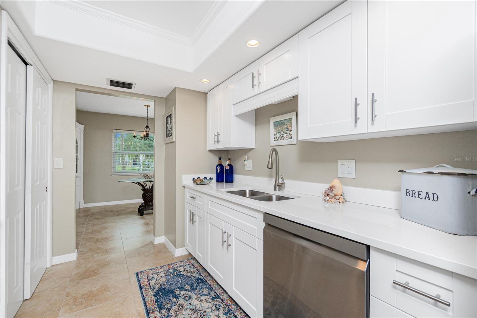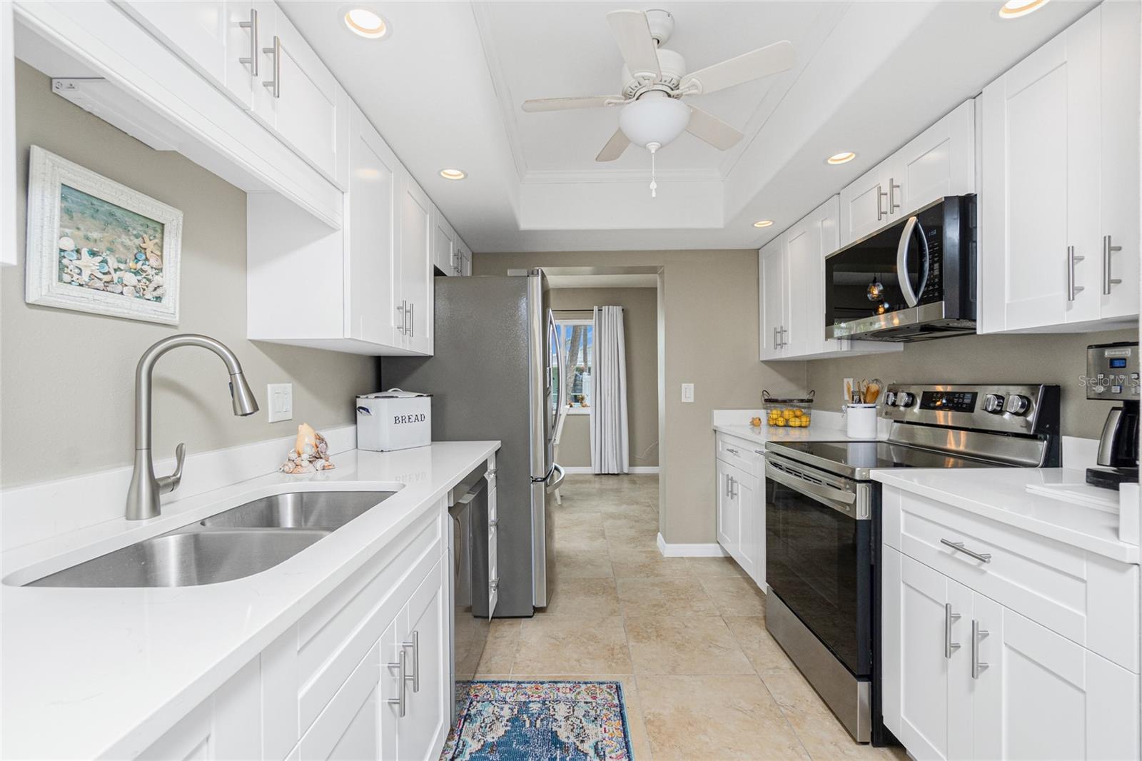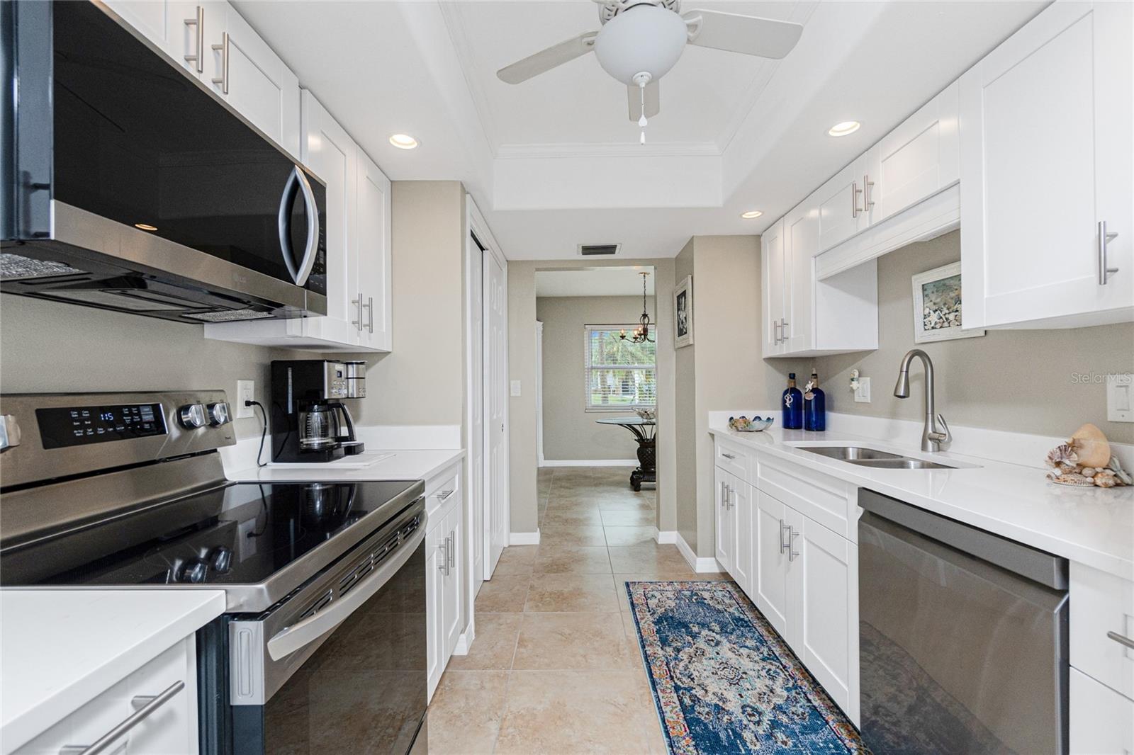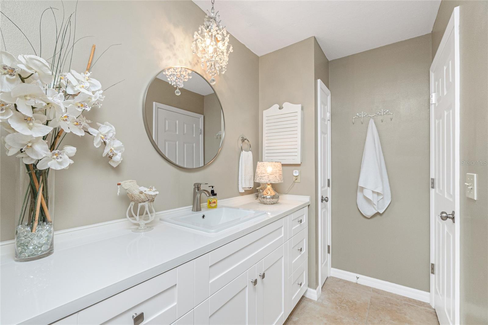 IF YOU WANT A MOVE-IN READY HOME, LOOK NO FURTHER! Starting with the great curb appeal, this home will please even the pickiest of buyers! IMPACT WINDOWS AND DOORS, IMPACT OVERHEAD GARAGE DOOR, NEW AC (2024), NEW ROOF (2020), REPIPED OVERHEAD, ALL NEW KITCHEN (CABINETRY AND COUNTERTOPS, UPDATED BATHROOMS, AND TILED FLOORING THROUGHOUT! This open floor plan features a spacious living room with sliding glass doors to the Family room, and formal dining area with two corner cabinets, great for displaying your favorite dishware. The kitchen is light and bright, with soft close doors and drawers, decorative upgraded granite countertops, box ceiling w/ceiling fan, recessed lighting and double door pantry. Appliances include: smooth top stove, microwave, dishwasher, and French door refrigerator. (all LG). The primary bedroom has a stylish barn door, wall closet, ceiling fan, and en suite primary bath. The Primary bath has an all new shower stall, pretty vanity w/solid surface countertop, and linen closet. The GUEST BEDROOM - on the other side of the house- could actually be a 2nd Master suite, as the Guest Bath is immediately adjacent. Guest bedroom features a walk in closet and ceiling fan, and Guest Bath has a combo tub/shower (tub has been reglazed), new toilet, and linen closet. The versatile Family room is so light and bright and has a ceiling fan and door to the Lanai. The oversized two car garage houses the washer and dryer, utility tub, storage closet and lots of extra storage! The lanai is a great place to enjoy morning coffee or an evening glass of wine, while relaxing in your SALTWATER HOT TUB! Get the grill fired up and enjoy kicking back out on the patio, on those cooler Florida eveningsThe pretty backyard is the icing on the cake, with vinyl privacy screen between you and your backyard neighbors. Seriously, THIS HOME WILL NOT LAST LONG! Buy now while you can and start enjoying FLORIDA SALT LIFE!