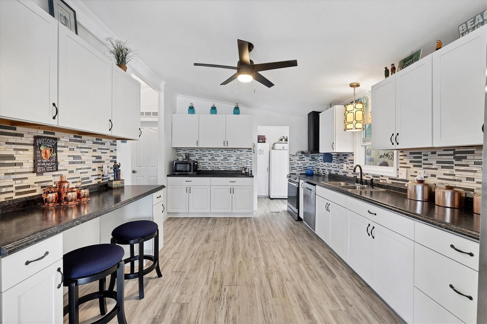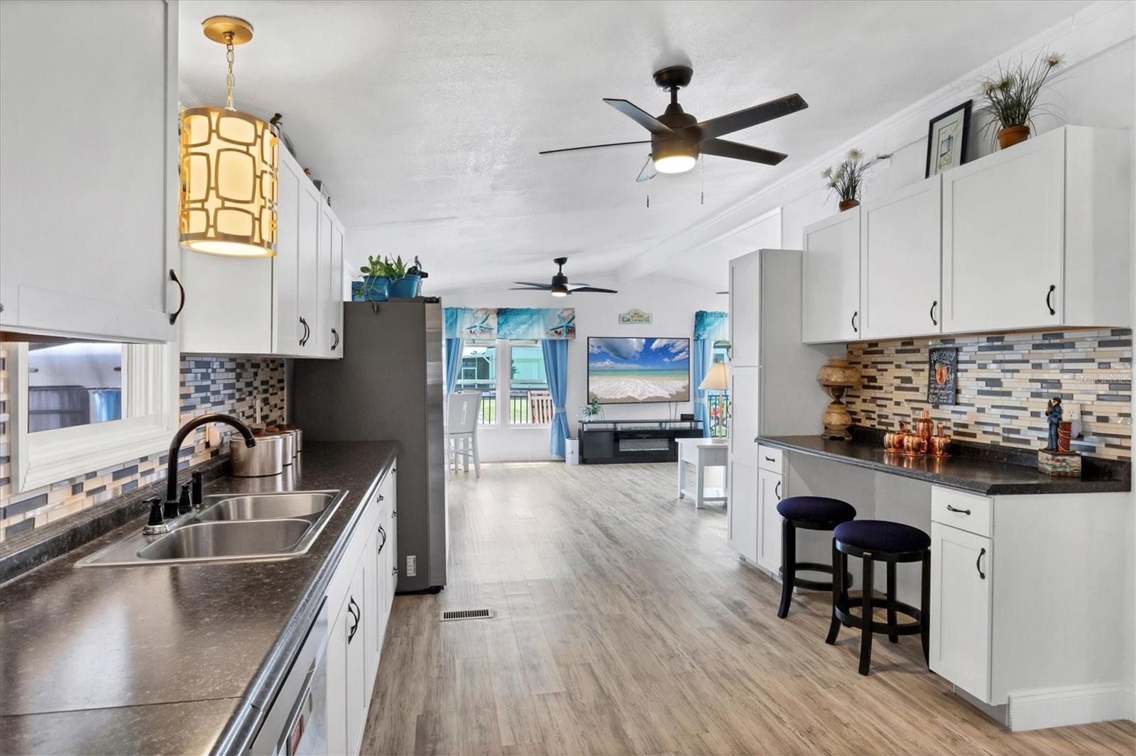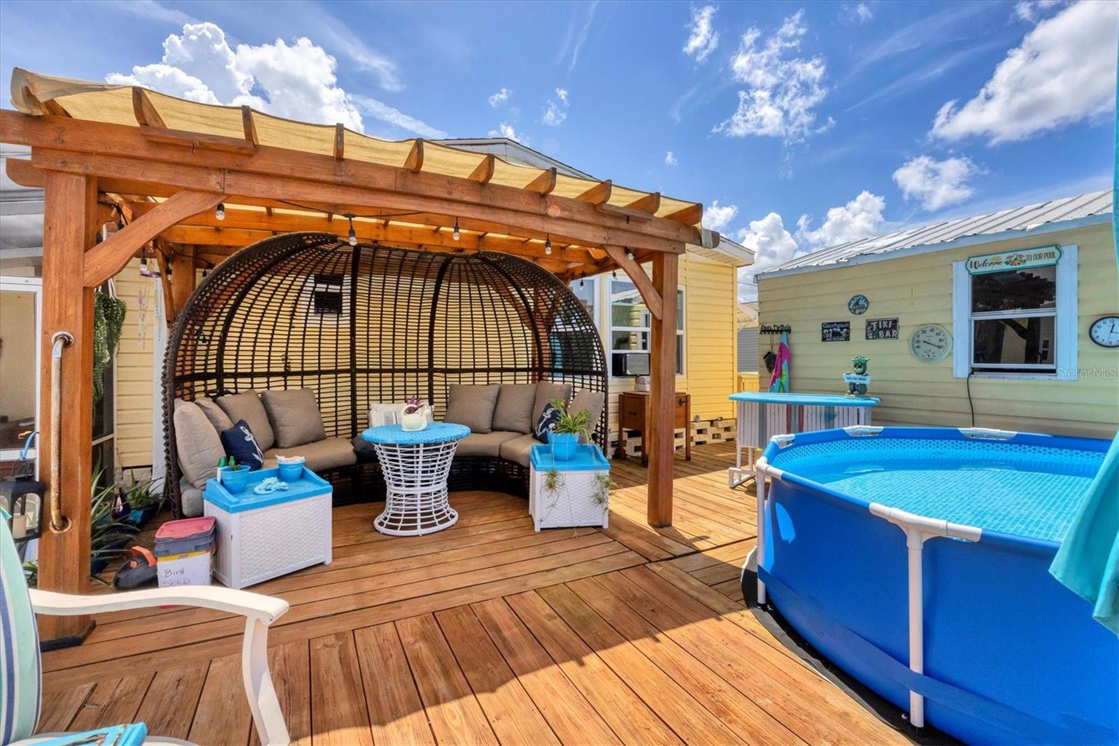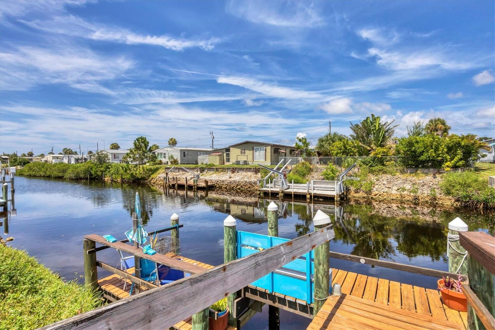 Waterfront living at its best! 55+ Community. This beautifully remodeled, spacious double-wide mobile home with soaring ceilings offers direct GULF access—only two bridges to the Intracoastal Waterway. Peace of mind comes with a 2022 roof, a new trunk line for the A/C, Icynene foam insulation, a new pressure valve, and all four corners of the home structurally braced. Enjoy 60 feet of waterfront with a 19x20 dock, perfect for your boat. The outdoor oasis is built for Florida fun, featuring a 10-foot-diameter above-ground pool, hot tub, his-and-her sheds, plus an additional shed with a washer and dryer. Entertain or unwind on the huge, screened back porch, relax on the welcoming front porch, or gather friends around the dry bar. Ample parking is available with a spacious main driveway and an extra driveway on the other side—ideal for your boat or trailer. You own the land—no lot rent—making this move-in-ready waterfront retreat the perfect place to call home! Close to beaches, shopping, and restaurants. Make your appointment to see this beauty today!