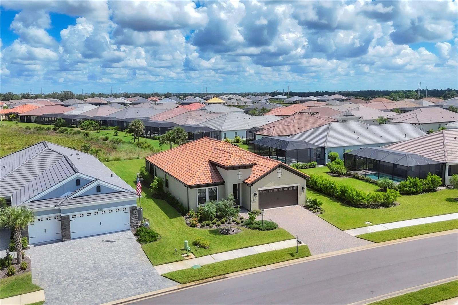 Designed to capture the best of its coastal locale, this charming and meticulously maintained home invites all who enter to exhale. It is a calm oasis on a quiet cul-de-sac, cozy and relaxed, where owners and guests can unwind after spending a sun-kissed day at the pristine Gulf beaches of nearby Manasota Key. Lush tropical landscaping and an attractive paver driveway further enhance the home's handsome exterior. Upon entry, guests will appreciate a spacious, open floor plan and a fresh, neutral color palette highlighted by thoughtful design elements, resulting in a feeling of understated luxury that is simultaneously welcoming and relaxed. With a design that makes the living room, dining area, and kitchen the heart of family life, this floor plan offers a convenient flex room that could be used as a secondary living area, a home office, or a den. Throughout the home, spacious volume ceilings and abundant natural light add an eye-appealing ambiance. Sliders in the living room open to the extended lanai, creating a strong indoor-outdoor connection that encourages al fresco living while taking full advantage of Florida's signature temperate climate. Fuss-free outdoor furniture and decor can be easily arranged to encourage leisurely conversation and relaxation, creating an undeniable resort-style vibe and the perfect place to savor a 5:00 cheeseboard. The home's heart is a well-appointed kitchen with beautiful Shaker-style cabinetry accentuated with thoughtfully chosen Quartz countertops and an attractive tile backsplash. Upgraded GE stainless steel appliances and a walk-in pantry make food prep a pleasure. The primary bedroom is a sumptuous private retreat--a haven of comfort and serenity, with a fabulous ensuite bath featuring split dual vanities with Quartz countertops, a spacious walk-in shower, elegant porcelain tile flooring, and a private water closet. One of the two secondary bedrooms is currently in use as a home office. Nearby, another guest bedroom was designed to accommodate visitors in comfort and style with a large walk-in closet. The oversized guest bathroom features a separate water closet with a shower. Other notable home features include LVT flooring in the main living areas, a BRIGGS AND STRATTON WHOLE-HOUSE GENERATOR, and AUTOMATED HURRICANE SCREENING ON THE LANAI. Boca Royale is a vibrant, gated, and amenity-rich community within three miles, as the seagull flies, to the salty air and beautiful beaches of Manasota Key and a short drive to Wellen Park. Central to the community is an elegant Georgian-style clubhouse which showcases a spectacular view of the manicured golf course. Residents and their guests can explore a full range of dining options, from casual to formal. There is a resort-style pool, a spa, clubroom facilities, and an on-site dog park. Golf enthusiasts will appreciate the state-of-the-art course and its driving range, putting green, and pro shop. If that's not enough, there are six lighted Har-Tru clay tennis courts and eight lighted pickleball courts. The club offers golf, racquet, and social memberships--the choice is yours! This charming and inviting home is filled with happy moments captured in time, and there is plenty of opportunity to create new memories. It is a comfortable gathering place for family and friends, and it is just waiting for you to call it 'home.' Call today to schedule a private showing, and prepare to be captivated by this dynamic community where every day is a vacation.