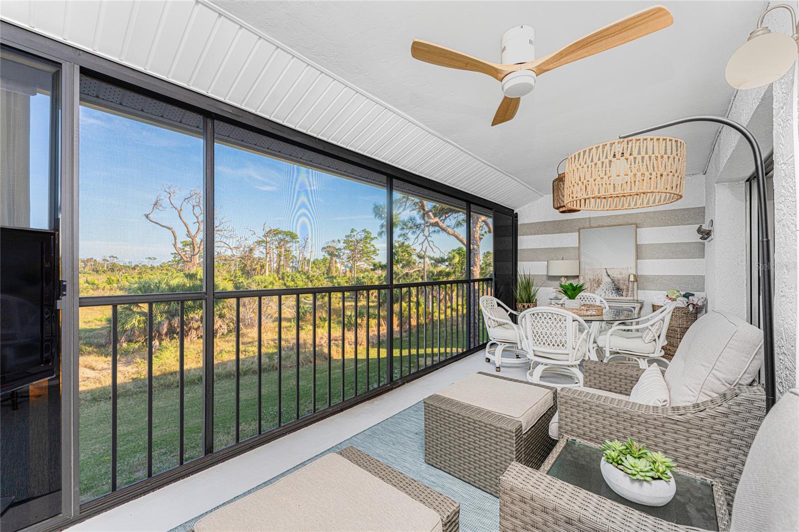 The Story of Fiddler's Green: Your Coastal Sanctuary The moment you walk through the door, you'll feel it—this isn't just a condo, it's a designer's dream brought to life. The owner, an artist and designer, poured her heart into updating and decorating this two-bedroom, two-bath home. All the latest beautiful neutral colors, finishes and a touch of the new champagne were used in each room with those special, artistic touches that just make you say "WOW!" It's completely immaculate, updated, and ready for you to move right in and enjoy. Imagine waking up to peace every day. This condo is located in the quiet, charming community of Fiddler's Green in Placida—the perfect Old-Florida hideaway. Step out onto your private lanai and enjoy the most beautiful, undisturbed view of tropical greenspace that backs right up to the Lemon Creek Wild Life Preserve. Because this land is protected, your view is safe forever! If you love nature, you'll love having miles of gorgeous hiking trails through maritime hammock and pine flatwoods practically in your backyard. It’s like living at a resort with the whole Gulf Coast as your playground. The Fiddler’s Green community gives you that easy, fun Florida life with amenities like a year-round heated pool, a nice clubhouse for socializing, and courts for both pickleball and tennis. But the location is the real secret! You are right in the heart of a vibrant, relaxed coastal area: • Boating is Easy: You're minutes from marinas like Gasparilla Marina for world-class fishing and boat access to beautiful barrier islands like Don Pedro and the secluded Little Gasparilla. • Best Beaches Close By: In just a short drive, you can choose between the local favorite Englewood Beach or the upscale, gorgeous beaches and town of Boca Grande. • Golf Everywhere: If you love to golf, you're spoiled for choice with five courses at Rotonda nearby, plus other great options like Lemon Bay. This home is truly special—it offers luxury design, total peace and quiet, and instant access to the best of Southwest Florida living. Call today for your private showing. You will not be disappointed!