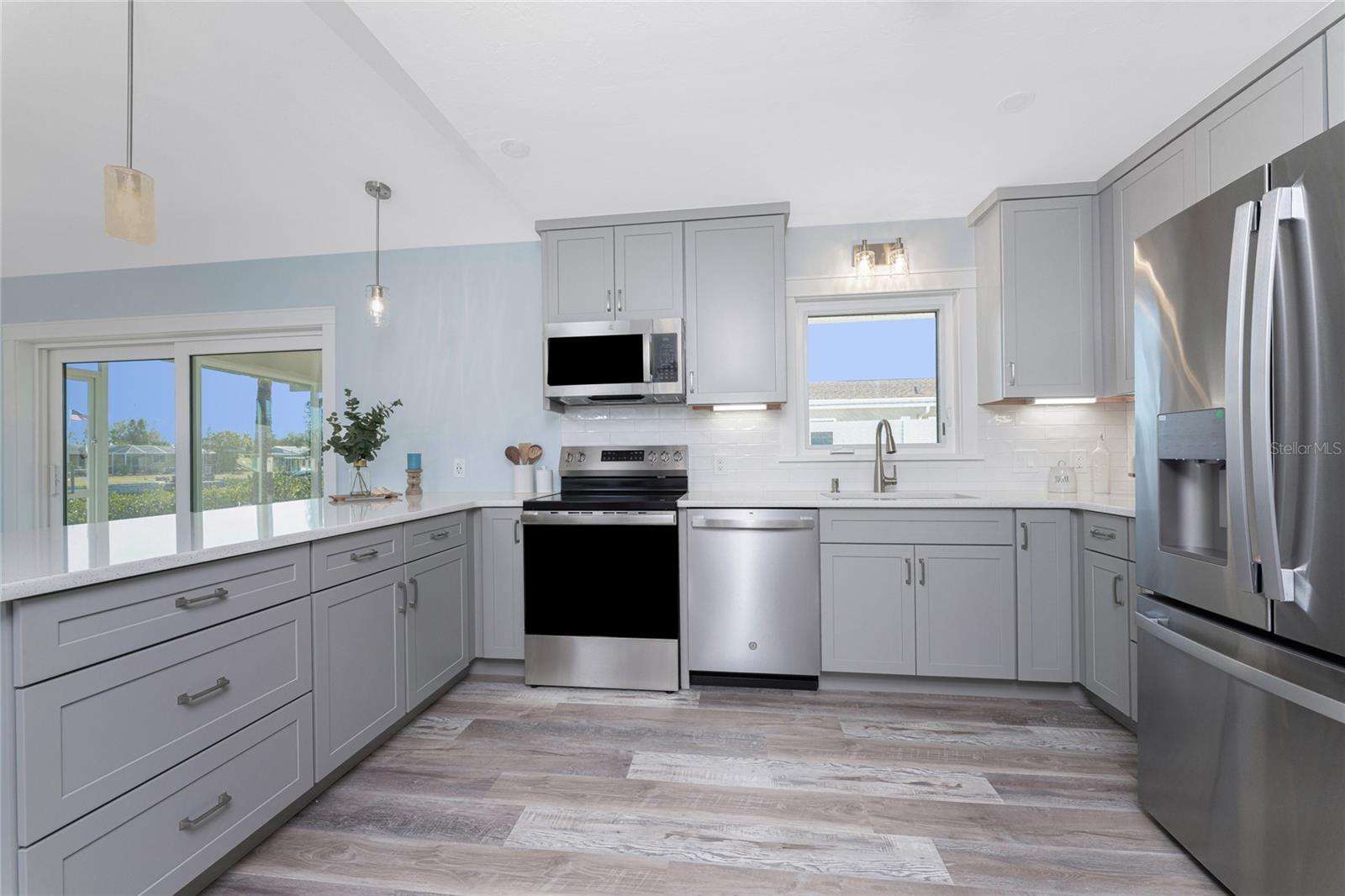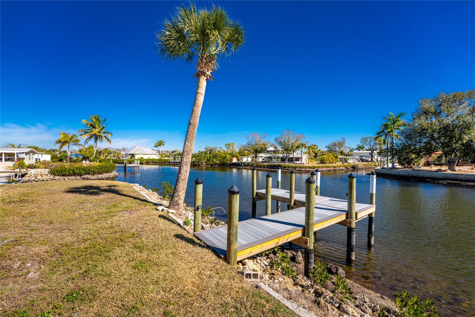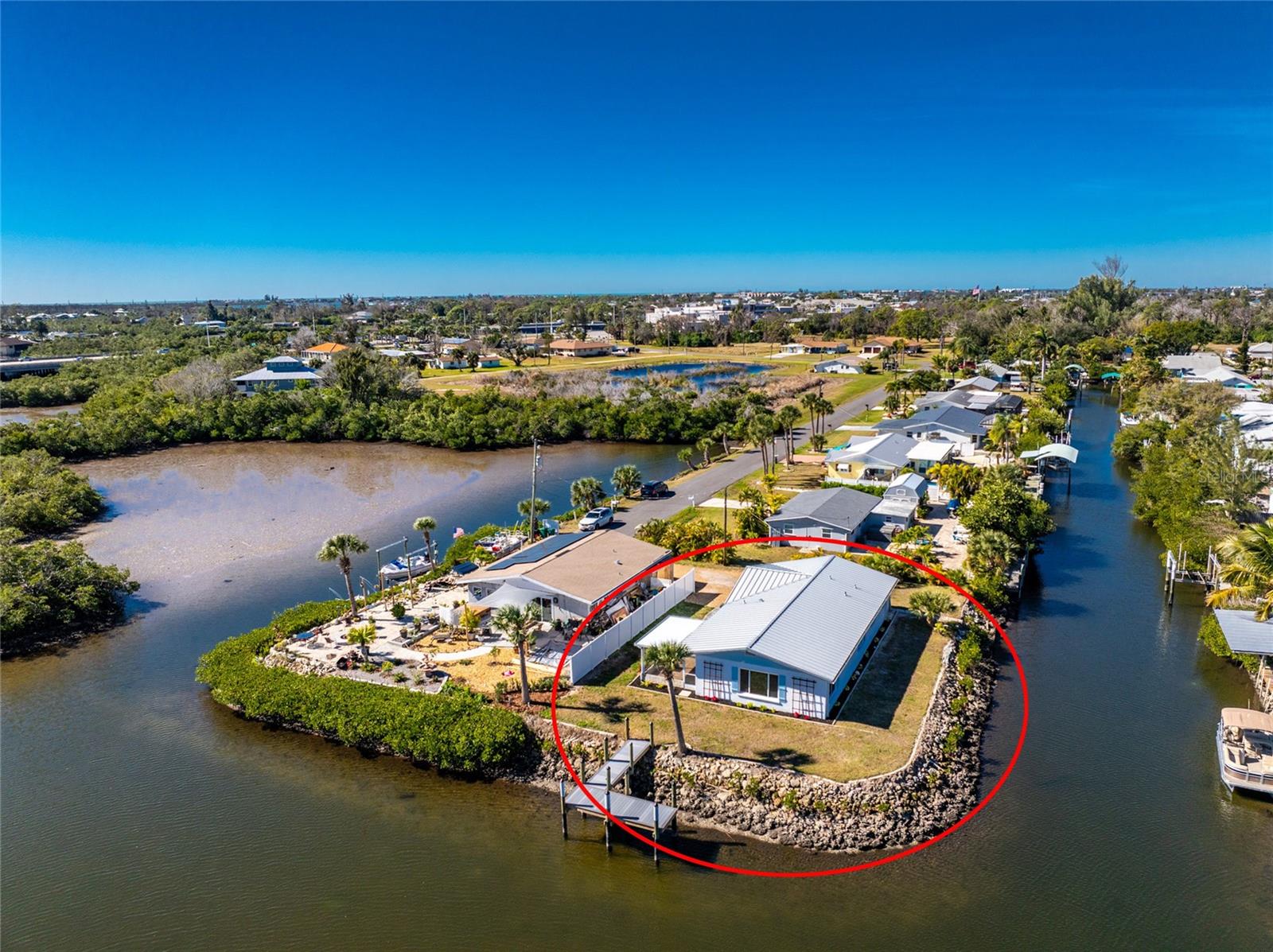 Water Views from Every Angle in This Totally Remodeled Englewood Home. The setting is truly special at this two bedroom, two bathroom canal home with water on two sides, a brand new dock, and a location less than three miles from Englewood Beach. Every major update has already been completed, including a standing seam metal roof, all new impact windows and doors, and a hurricane rated and insulated garage door, offering peace of mind. Inside, the home delivers a relaxed, coastal feel with LVP flooring, custom paint tones, five inch baseboards, and beautifully detailed interior doors and moldings. Vaulted ceilings and expansive windows draw the water views straight into the great room and kitchen, where it is easy to imagine watching dolphins play, manatees drift by, and boats pass throughout the day. The kitchen blends function and design with custom cabinetry featuring soft close hinges, quartz countertops, under cabinet lighting, a reach-in pantry, and a glass tile backsplash, creating a modern space that still feels warm and inviting. The primary suite is generously sized and includes a walk-in closet and a beautifully finished ensuite bathroom with quartz topped vanity, custom cabinetry, and a large fully tiled walk-in shower. The guest bedroom also offers comfortable space with a reach-in closet, while the guest bathroom has been tastefully updated with a large tiled corner walk in shower enclosed with frameless glass and a custom quartz topped vanity. Sliding glass doors in the living area open to a covered and screened lanai where saltwater breezes flow freely, making it an ideal spot for morning coffee or quiet afternoons overlooking the canal. As the day winds down, the new dock becomes the perfect place to unwind, whether relaxing by the water or adding a lift. The additional canal frontage also offers the potential to add a second dock and lift on the side, providing added protection for your boat along with easy access to local tiki bars, nearby sandbars, or a quick fishing trip with the day’s catch brought home for dinner. Additional improvements include PEX piping throughout, replacement of the original cast iron waste piping with new PVC, a newer air conditioning system, and privacy fencing along the front of the property. Convenient to everything Englewood has to offer, you are just minutes from beaches, golf courses, pickleball courts, shopping, dining, and even spring training baseball at one of two nearby stadiums. From sunrise reflections on the water to sunset skies and gentle breezes, life at 1082 Haste Lane is exactly how coastal living is meant to feel.