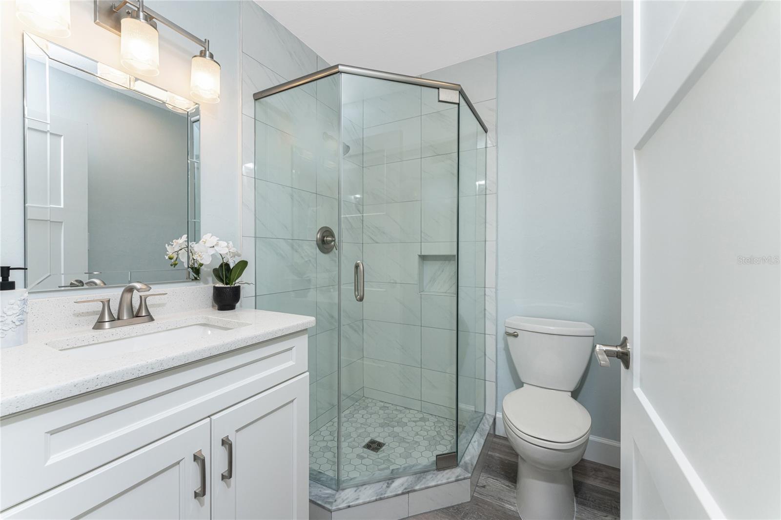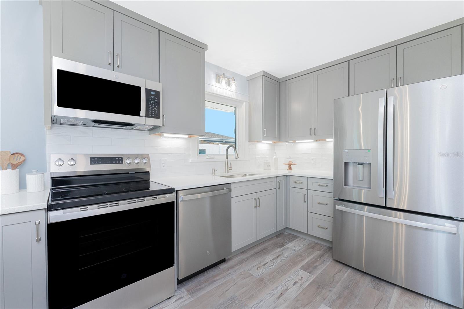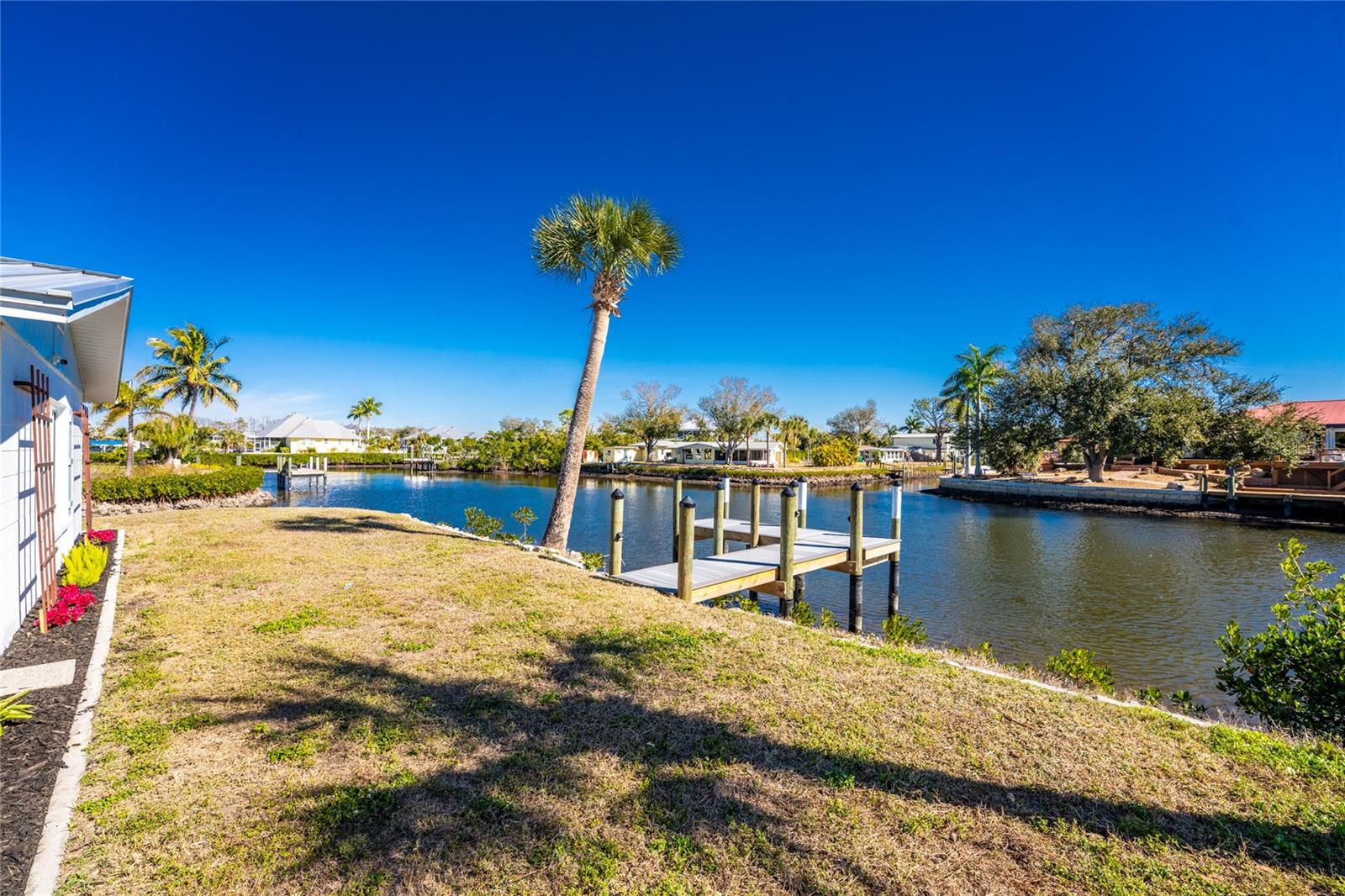 Water Views from Every Angle in This Totally Remodeled Englewood Home. The setting is truly special at this two bedroom, two bathroom canal home with water on two sides, a brand new dock, and a location less than three miles from Englewood Beach. Every major update has already been completed, including a standing seam metal roof, all new impact windows and doors, and a hurricane rated and insulated garage door, offering peace of mind. Inside, the home delivers a relaxed, coastal feel with LVP flooring, custom paint tones, five inch baseboards, and beautifully detailed interior doors and moldings. Vaulted ceilings and expansive windows draw the water views straight into the great room and kitchen, where it is easy to imagine watching dolphins play, manatees drift by, and boats pass throughout the day. The kitchen blends function and design with custom cabinetry featuring soft close hinges, quartz countertops, under cabinet lighting, a reach-in pantry, and a glass tile backsplash, creating a modern space that still feels warm and inviting. The primary suite is generously sized and includes a walk-in closet and a beautifully finished ensuite bathroom with quartz topped vanity, custom cabinetry, and a large fully tiled walk-in shower. The guest bedroom also offers comfortable space with a reach-in closet, while the guest bathroom has been tastefully updated with a large tiled corner walk in shower enclosed with frameless glass and a custom quartz topped vanity. Sliding glass doors in the living area open to a covered and screened lanai where saltwater breezes flow freely, making it an ideal spot for morning coffee or quiet afternoons overlooking the canal. As the day winds down, the new dock becomes the perfect place to unwind, whether relaxing by the water or adding a lift. The additional canal frontage also offers the potential to add a second dock and lift on the side, providing added protection for your boat along with easy access to local tiki bars, nearby sandbars, or a quick fishing trip with the day’s catch brought home for dinner. Additional improvements include PEX piping throughout, replacement of the original cast iron waste piping with new PVC, a newer air conditioning system, and privacy fencing along the front of the property. Convenient to everything Englewood has to offer, you are just minutes from beaches, golf courses, pickleball courts, shopping, dining, and even spring training baseball at one of two nearby stadiums. From sunrise reflections on the water to sunset skies and gentle breezes, life at 1082 Haste Lane is exactly how coastal living is meant to feel.