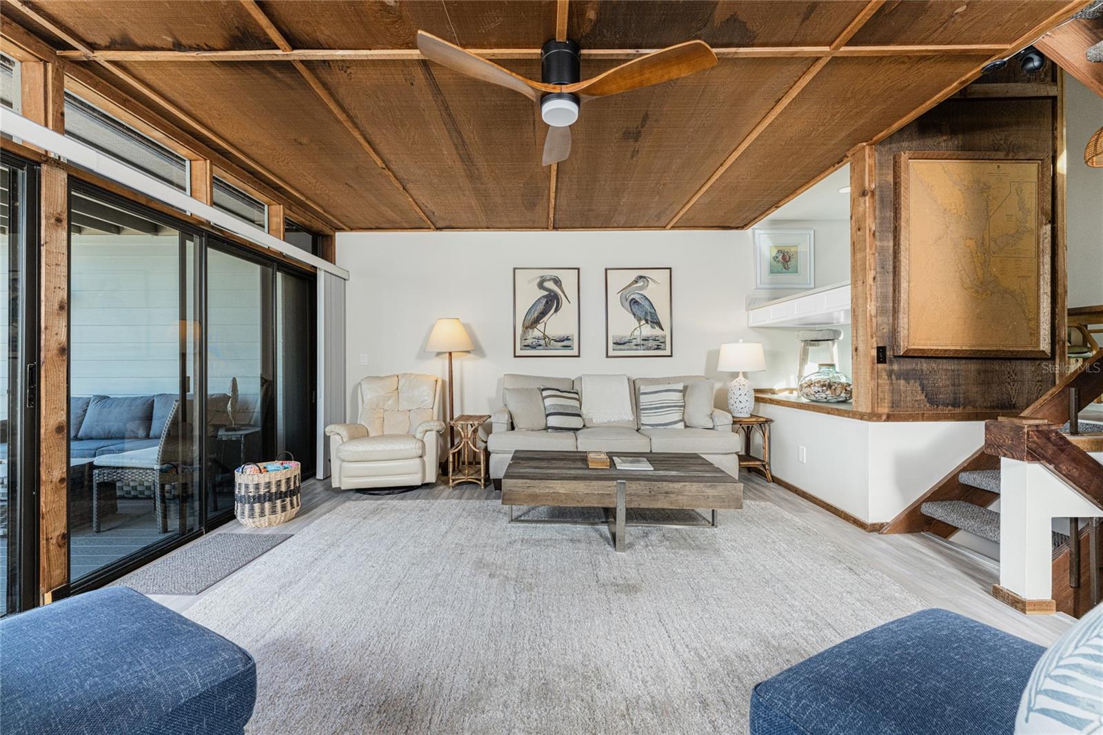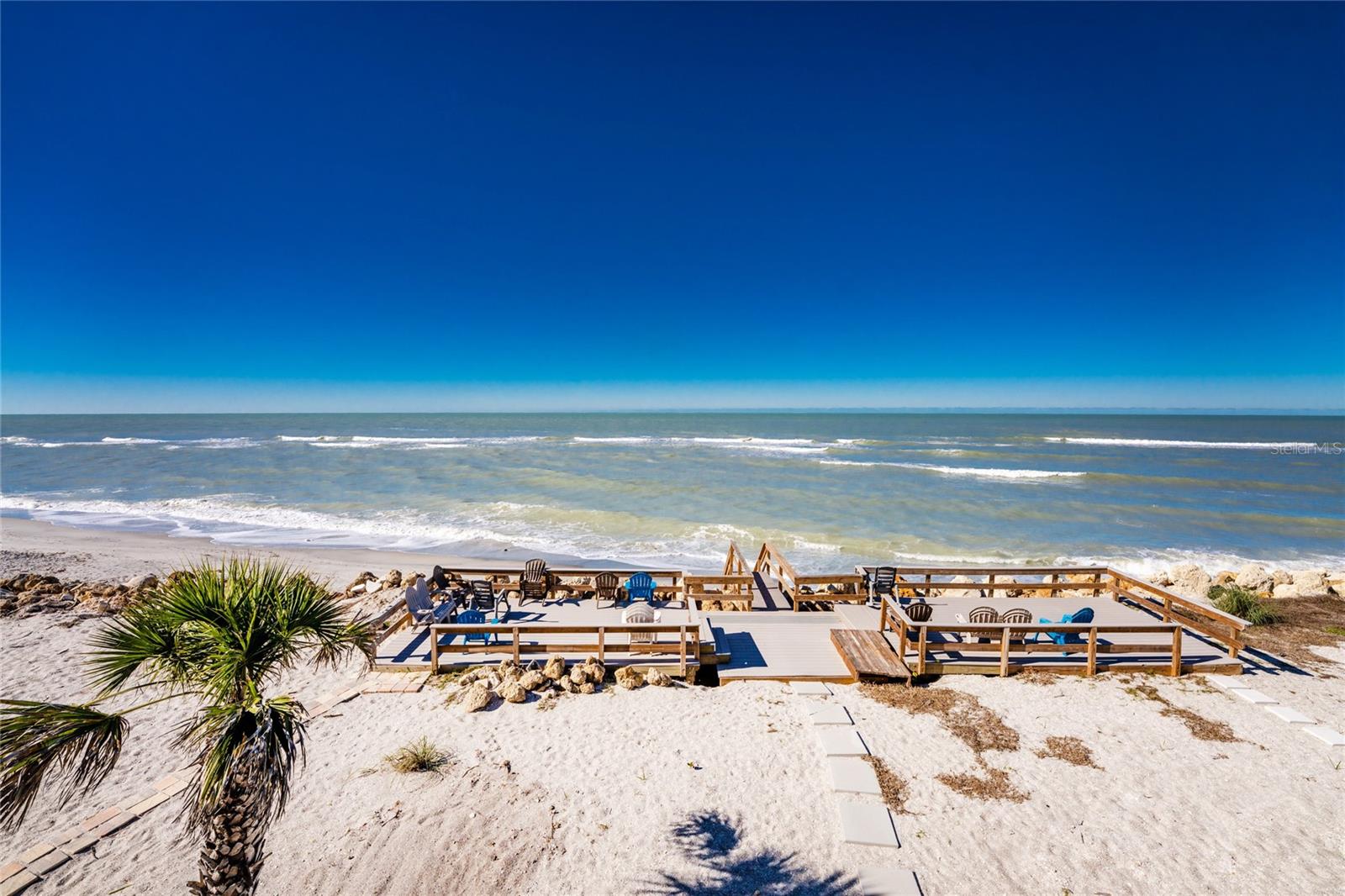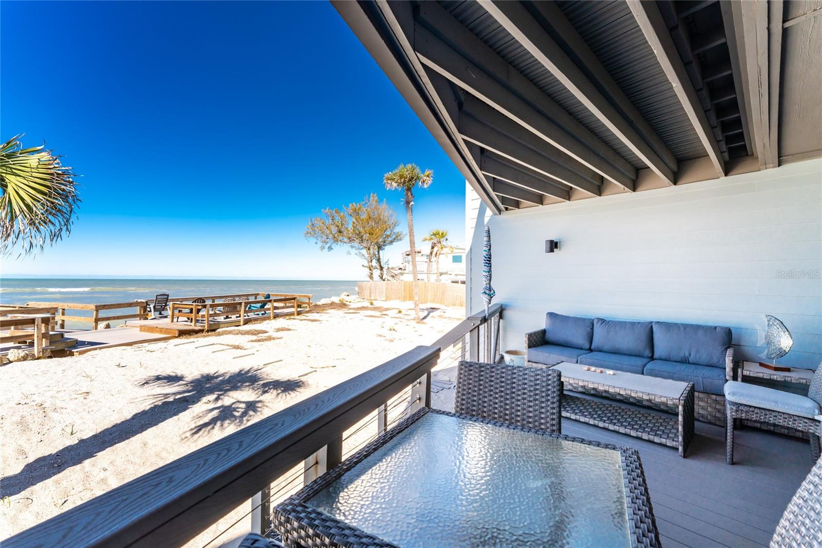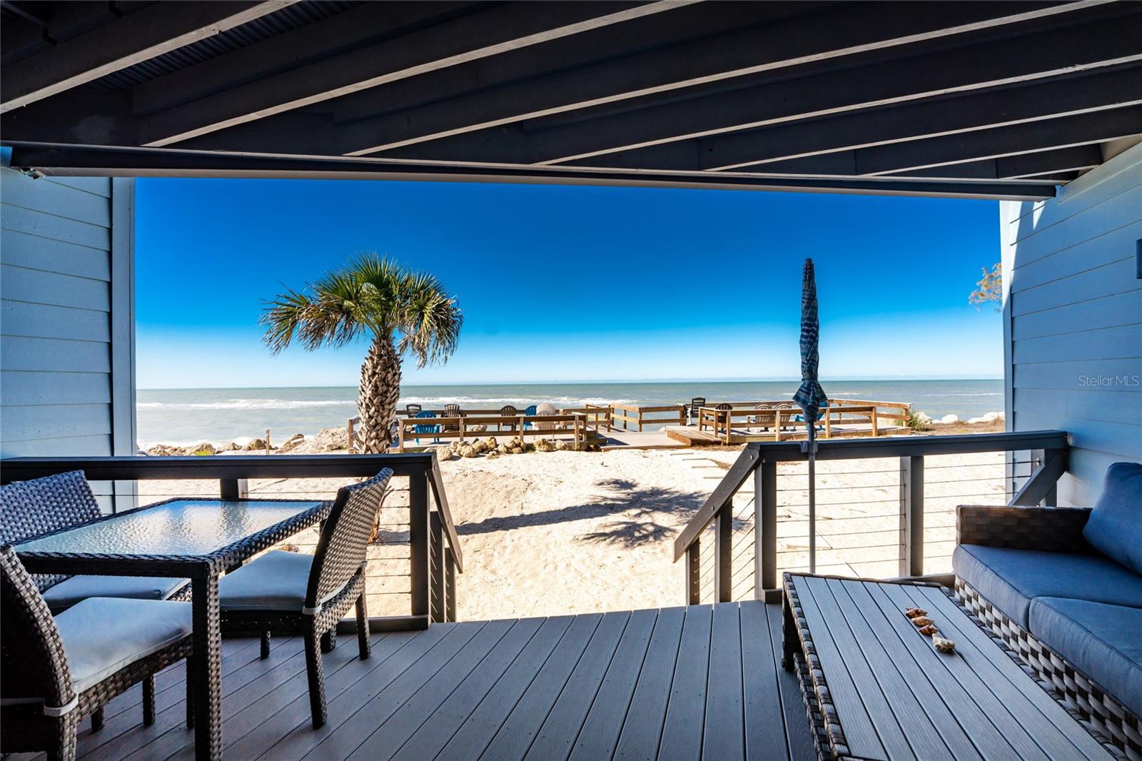 Welcome to Banyan Bluff Condominiums, a private four-residence townhome community set directly along the Gulf front of Manasota Key in Englewood, Florida. This lovely 3-bedroom, 2-bath multi-level townhome offers privacy and a tranquil atmosphere, positioned on more than an acre and comfortably set back from North Beach Road for added seclusion. The first living level is elevated on pilings approximately 16 feet above sea level, and the layout maximizes sweeping Gulf views and breathtaking sunsets from most rooms. A covered balcony off the main living area creates an inviting indoor-outdoor living space, ideal for dining outside or unwinding at day’s end. The beautifully updated kitchen includes new stainless steel appliances and quartz countertops. Upstairs, the top floor primary bedroom suite offers a vaulted ceiling, walk-in closet, an updated en-suite bathroom, and recently replaced storm-rated sliders that open to a private open balcony overlooking the Gulf. Both guest bedrooms include storm-rated windows and the guest bathroom is located just beyond the kitchen and adjoining dining area. Convenient parking includes two under-building spaces and an EV charging port. The tiled entry foyer includes an adjoining utility room with a new washer/dryer, utility sink and room for storage. The townhome is being offered turnkey furnished. Whether you choose to make it your own or place it in a rental program, this condo offers outstanding versatility. Banyan Bluff residents also enjoy a Gulf-front wooden deck, perfect for soaking up the sun or enjoying evening sunsets. Other notable updates include a metal roof in 2023, a newer electrical panel, and tankless water heater. A rare opportunity to own a stunning beachfront townhome in a quiet, exclusive setting.