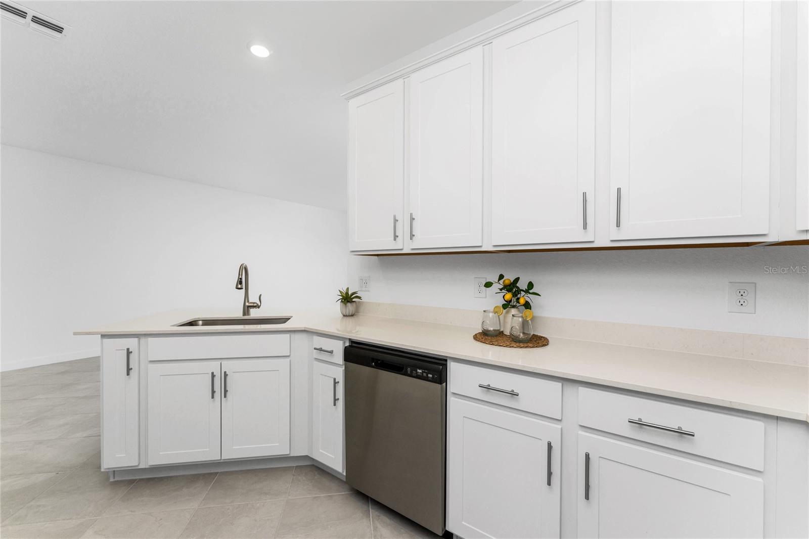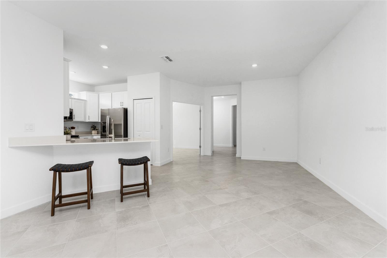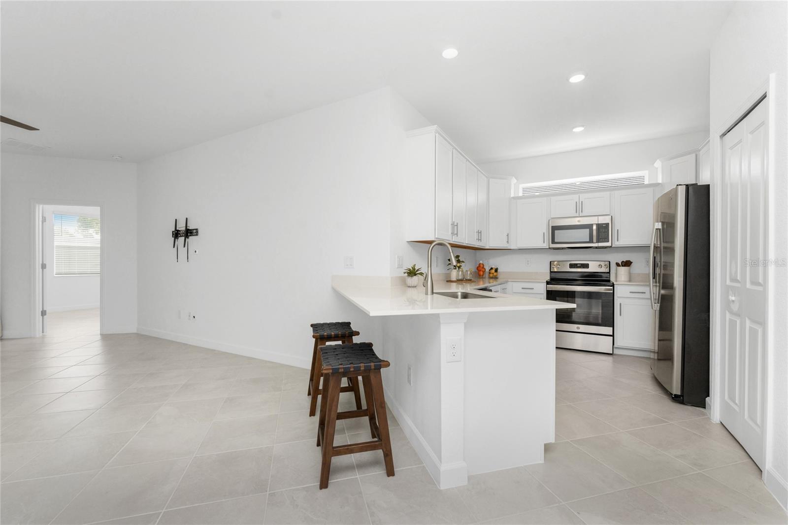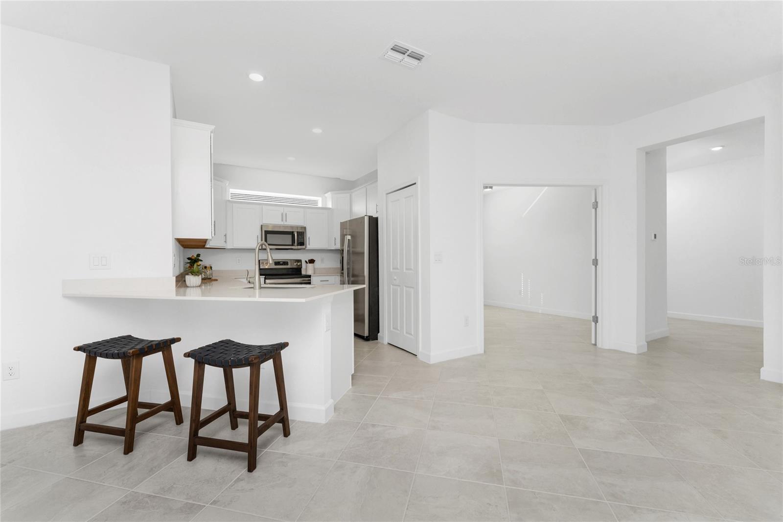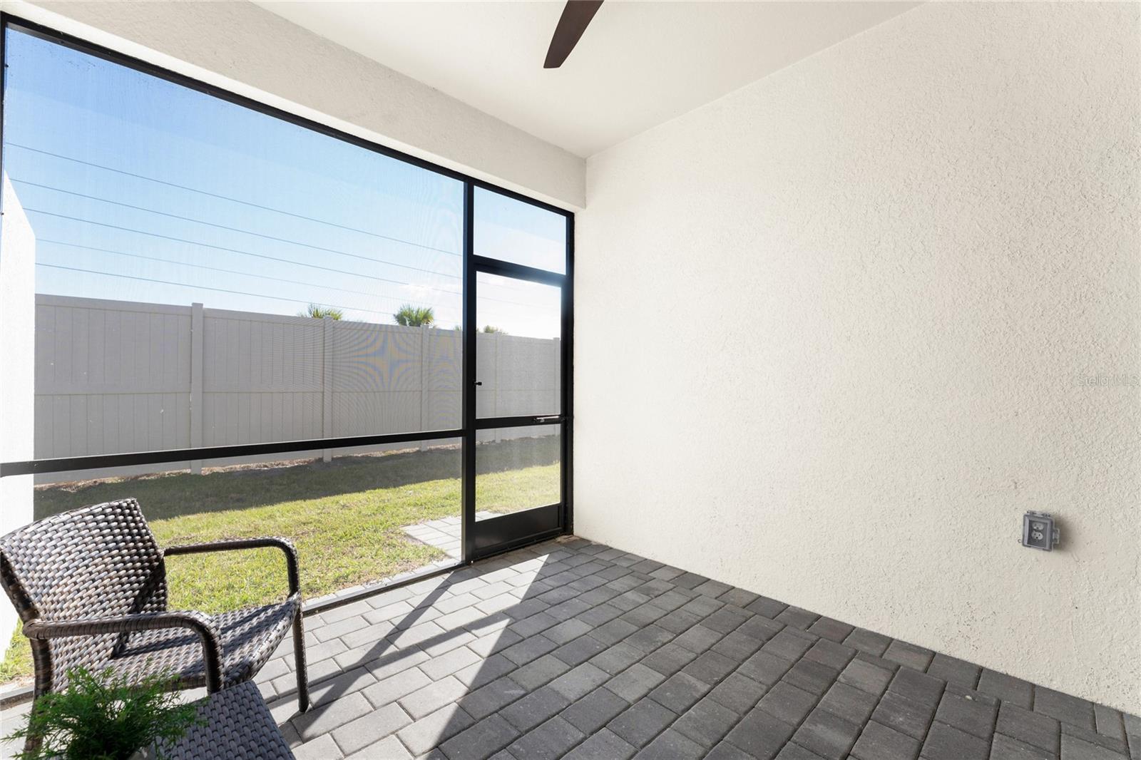 Welcome to Palm Lake at Coco Bay, a gated, master planned community in Englewood where coastal living meets modern, easy comfort. Built in 2024 by Lennar Homes, this beautifully maintained two bedroom plus den, two bathroom villa is ideal for anyone seeking a low maintenance, active Florida lifestyle. As an added bonus, this property has a Letter of Map Revision from FEMA, moving it into the X Flood Zone. A paver driveway sets the tone as you arrive, leading into a bright, open layout that is very welcoming. Diagonally set tile flooring flows throughout the home, there are impact windows and doors, and a like new condition that lets you move right in and start enjoying the good life. The kitchen is designed for both everyday living and entertaining, opening seamlessly to the great room and featuring quartz countertops, an abundance of white shaker style cabinetry, a breakfast bar, and a spacious closet pantry. Sliding glass doors extend the living space outdoors to a covered, screened paver lanai, the perfect spot to enjoy a quiet morning with a book or unwind in the evening with your favorite cocktail. The ensuite primary bedroom is a peaceful retreat, offering a walk-in closet, a walk-in shower, and dual separate quartz topped vanity sinks. The guest bedroom includes a reach-in closet, while the guest bathroom features a quartz topped vanity and a shower tub combination, ideal for visiting friends or family. An interior laundry room adds convenience along with extra storage space. Life at Palm Lake at Coco Bay is all about balance. The community offers a vibrant blend of relaxation and activity, with a clubhouse, resort style pool, and pickleball courts that make it easy to meet neighbors and enjoy friendly competition. Sidewalk lined streets invite evening strolls and morning walks, adding to the welcoming neighborhood feel. Quarterly HOA fees cover lawn maintenance, irrigation, and internet, allowing you more time to enjoy everything Southwest Florida has to offer. Located at 8117 Shore Lake Drive, this home is conveniently less than six miles from the beach and offers easy access to shopping, dining, and entertainment in both Englewood and Boca Grande. This is Florida living done right, simple, stylish, and designed for enjoying every day.