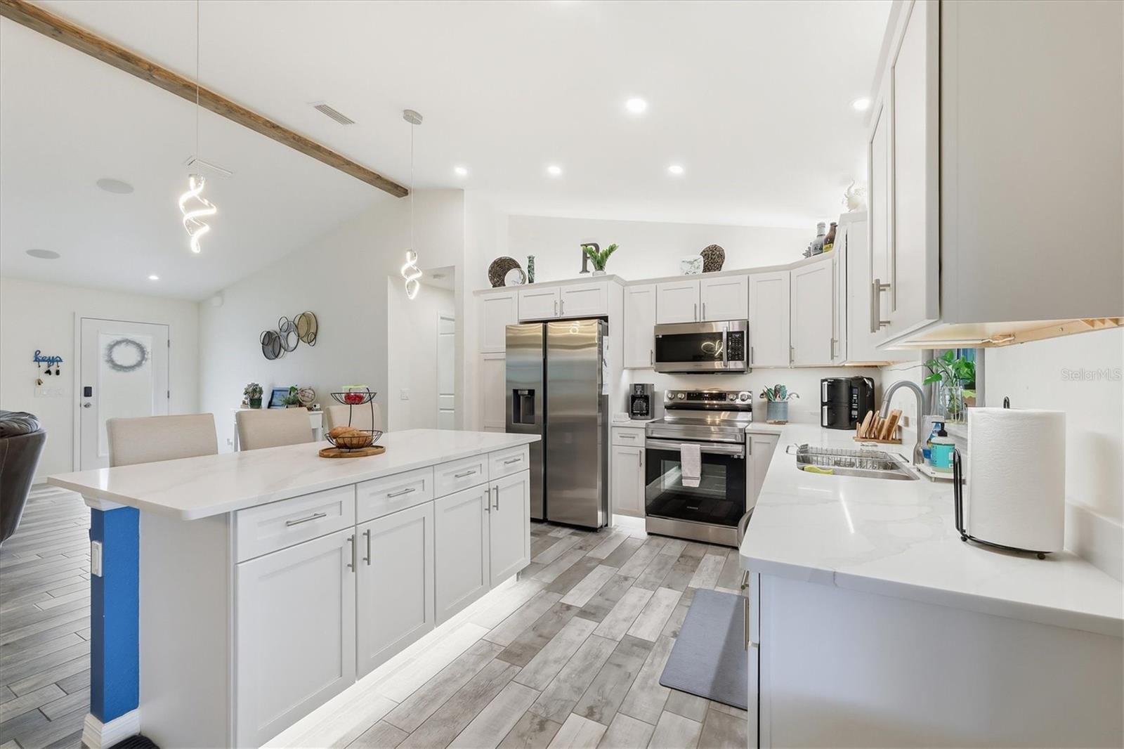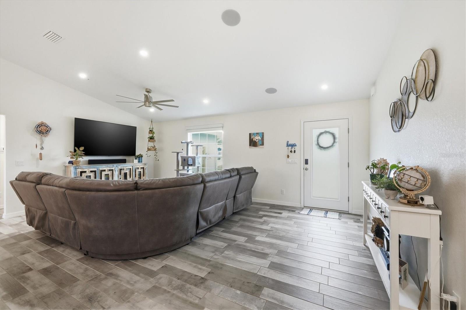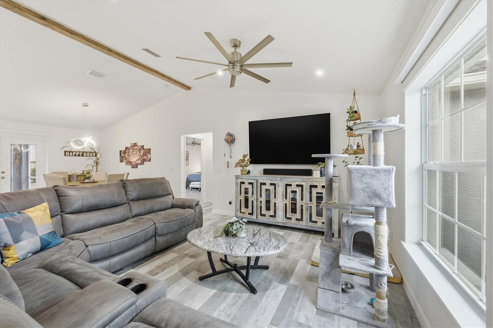 Welcome to this move-in-ready newer home, ideally located on an oversized corner lot in one of Florida’s most desirable non-deed-restricted communities with no HOA fees and situated in an X Flood Zone (no flood insurance required). Offering 3 bedrooms, 2 baths, and a 2-car garage, this thoughtfully designed home features 1,639 sq. ft. of bright, open living space with tile flooring throughout, soaring ceilings, and power blinds on every window, all app-controlled for effortless convenience. The stunning great room showcases a vaulted ceiling with a gorgeous wood beam, floor outlets, recessed lighting on dimmers, and is prewired for speakers—perfect for entertaining. The open kitchen is a showstopper with a large quartz island offering additional cabinetry, power, and seating, plus under- and over-cabinet lighting, toe-kick lighting, stainless steel appliances, and a cozy dining area with French doors leading to the lanai. Enjoy outdoor living year-round in the screened lanai featuring tile flooring, recessed and accent lighting, ceiling fan, and speaker prewiring. Just beyond, a 10x20 concrete slab with hot tub and privacy fencing creates a private backyard retreat. The spacious primary suite includes recessed lighting, a walk-in closet with a beautiful barn door, and a spa-like bath with quartz counters and dual sinks. Bedroom two is wired with Cat 6, making it ideal for a home office, while bedroom three offers a generous walk-in closet. The guest bath is equally impressive with a walk-in shower, heated exhaust fan, quartz vanity, recessed lighting, and toe-kick accent lighting. Additional upgrades include all lighting on dimmer switches, a laundry room with cabinetry, sink, and a dedicated box for cable, internet, and shade wiring, water hookup in the garage for a refrigerator, conduit ready for a future pool, and generator readiness up to 30 amps on the side of the home. The exterior is just as impressive with a powered flagpole, landscaped lighting, and electric in the soffits—perfect for holiday lighting. Located just minutes from Gulf beaches, Wellen Park, shopping, dining, and golf, this home delivers modern comfort, smart technology, and true Florida living—schedule your private showing today.