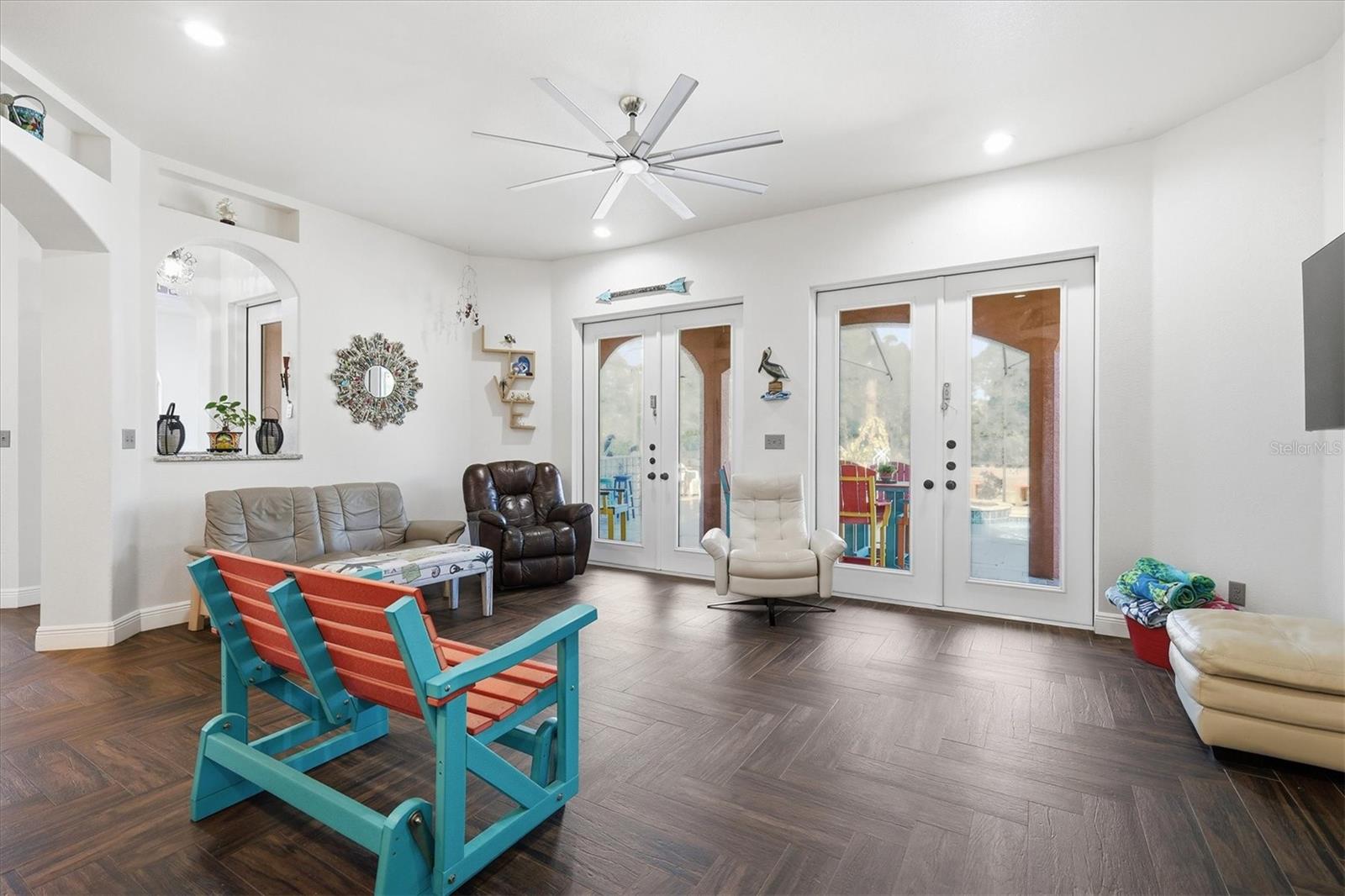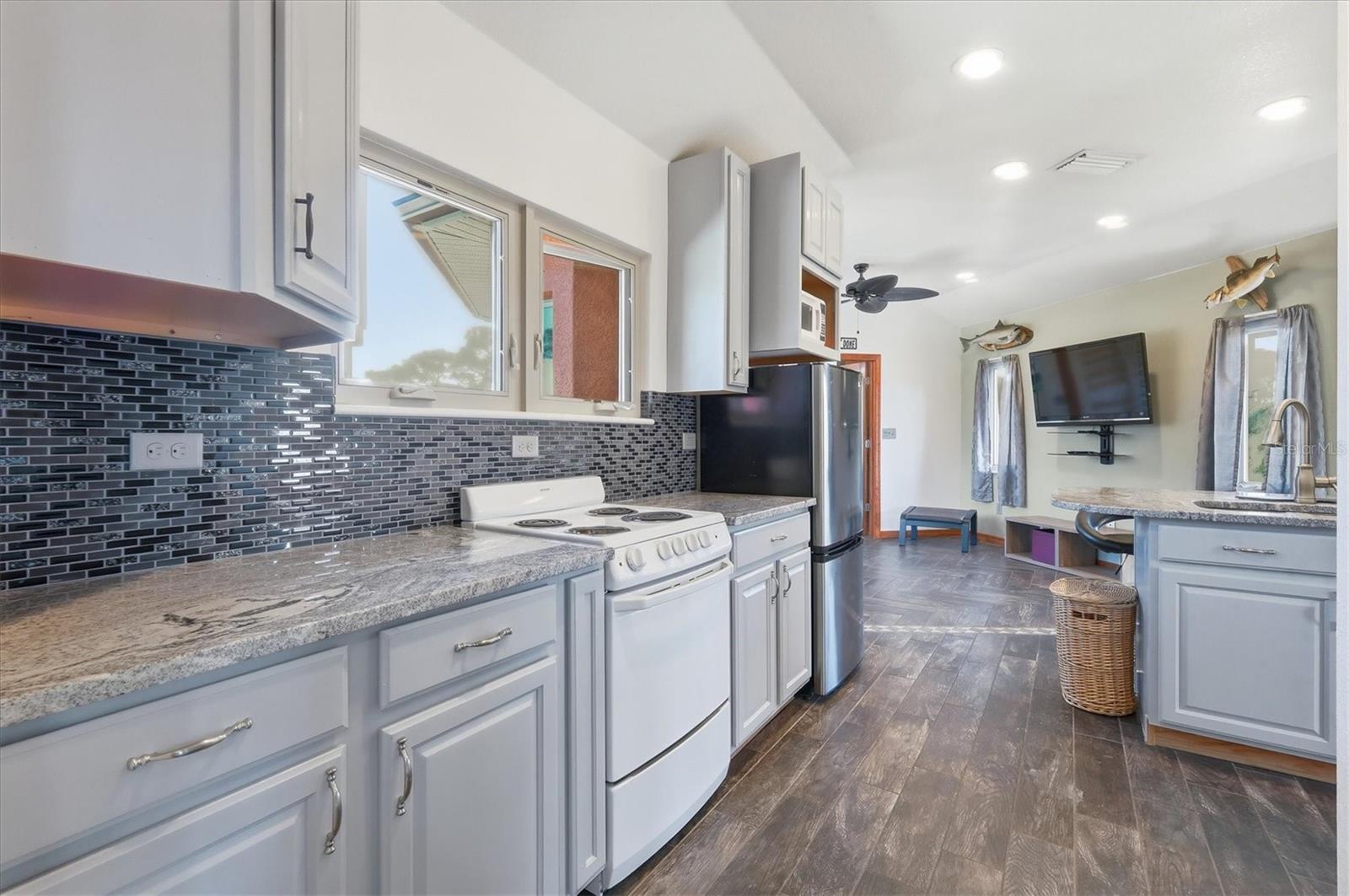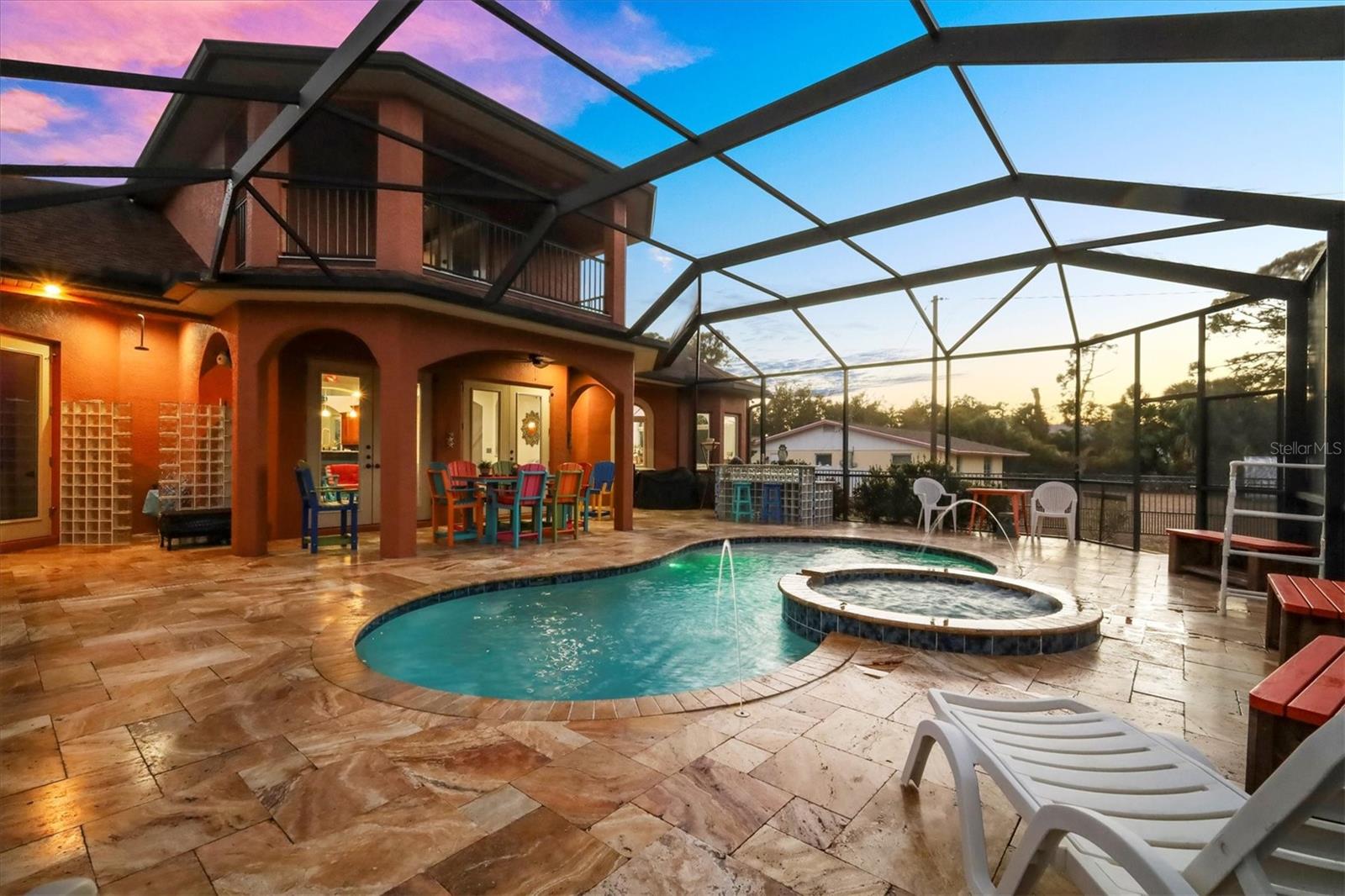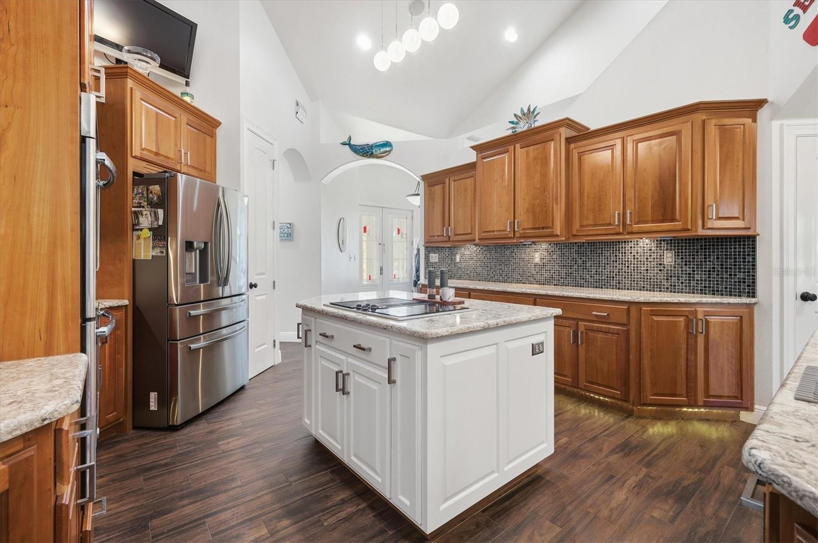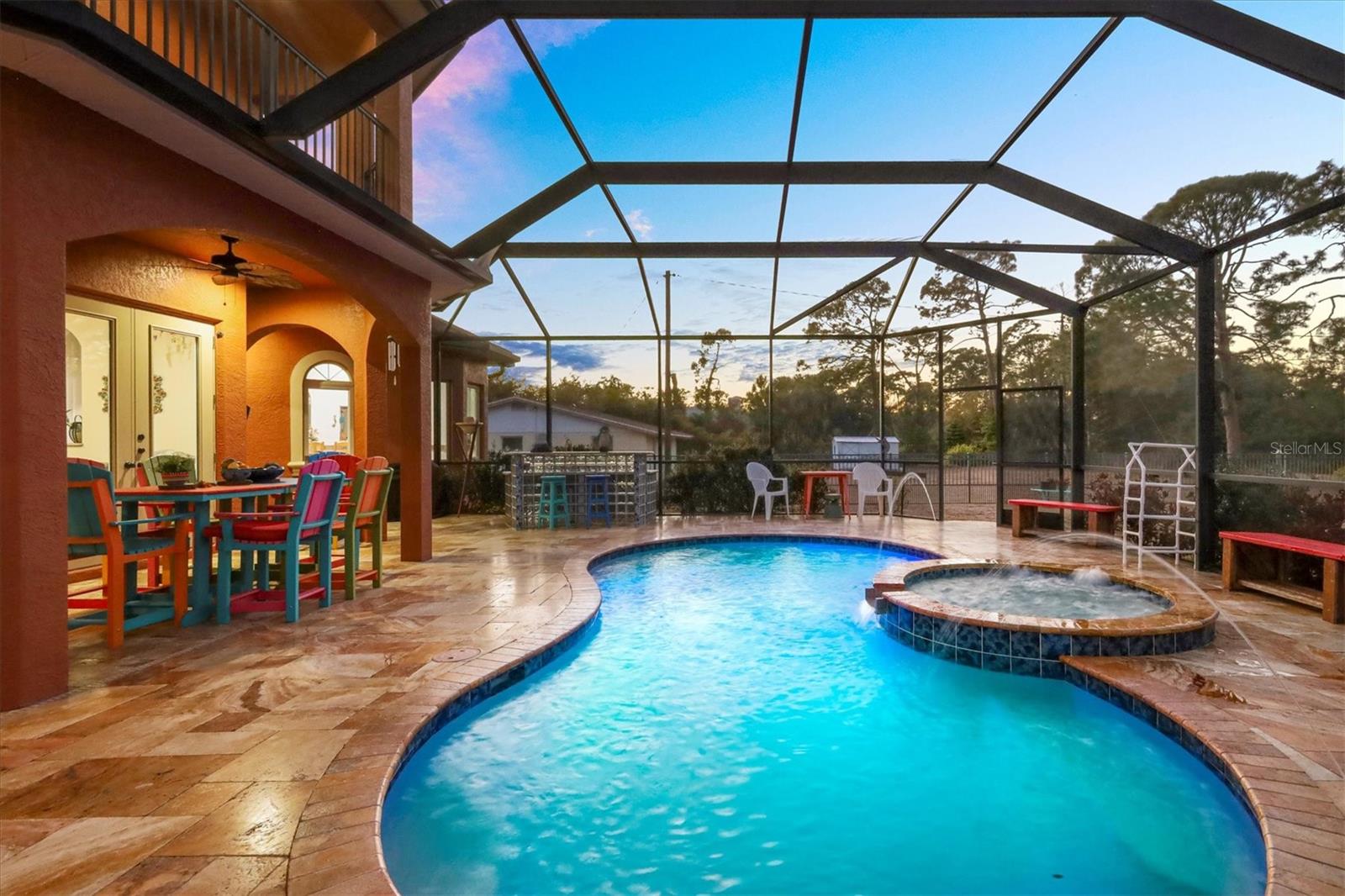 Discover an exceptional blend of luxury, engineering, and versatility at 1631 Maria Street in Englewood, Florida. Built in 2016 and offering 3,582 square feet under air, this 4-bedroom, 3-bathroom estate is thoughtfully designed for refined living, advanced functionality, and long-term comfort. This home is located on a highly desired dead-end street, so no need to worry about through traffic. As well as being in an X-flood zone and no HOA allowing for peace of mind along with privacy. The residence showcases solid custom cherry cabinetry throughout, paired with premium Cambria countertops that deliver both durability and timeless elegance. Architectural features include arched openings, volume ceilings, and carefully curated finishes that create a cohesive and upscale interior. Impact-rated glass doors and windows enhance storm protection, security, and energy efficiency while allowing abundant natural light. The main living spaces flow seamlessly to the outdoor retreat, where a resort-style pool with integrated hot tub is surrounded by a screened enclosure and generous entertaining space—ideal for year-round enjoyment. The outdoor area is supported by well irrigation and a 12-zone full-lot irrigation system, maintaining the lush landscaping and extensive fruit tree collection with efficiency. A standout feature of the home is the separate in-law suite, complete with a full kitchen and private entrance, offering exceptional flexibility for extended stays or private accommodations. A dedicated theater room, professionally hardwired for a 7-speaker surround sound system, and private balcony, enhances the home’s entertainment capabilities. Cat 5 cable wiring is installed throughout the main home, garage, and in-law suite, supporting modern connectivity and technology needs. Infrastructure and storage are equally impressive. The home includes a large 4-car garage, an elevator shaft located within the garage with a breakaway floor in the guest suite, and an in-ground safe for added security. A vented pantry with complete plumbing hookups, clearly marked, allows for conversion into a convenient pool half bath. Additional features include outlets in exterior soffits designed for seasonal or architectural lighting, an additional electric circuit at the well pump with underground conduit, and impact-rated systems throughout. The fully fenced backyard includes added puppy protection and features a mature collection of fruit-bearing trees, including Kent, Carrie, and Nam Dok Mai mango trees, along with Barbados cherry, fig, large mulberry, and lychee, creating a distinctive and functional outdoor environment. Conveniently located approximately one mile from Manasota Beach, the property also provides easy access to shopping, dining, boating, fishing, golf courses, and a wide range of recreational and entertainment amenities, offering an exceptional balance of privacy, luxury, and coastal lifestyle.