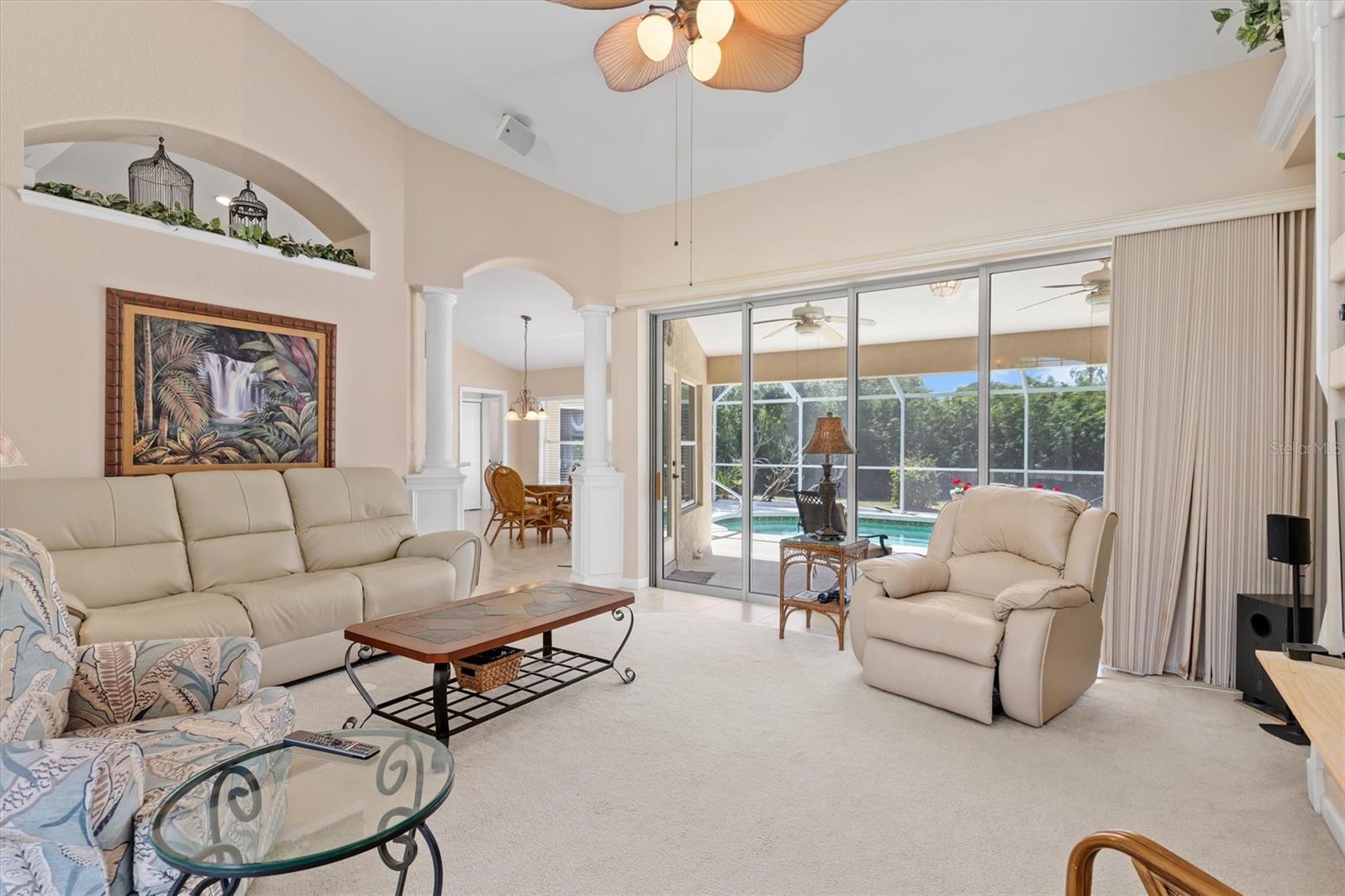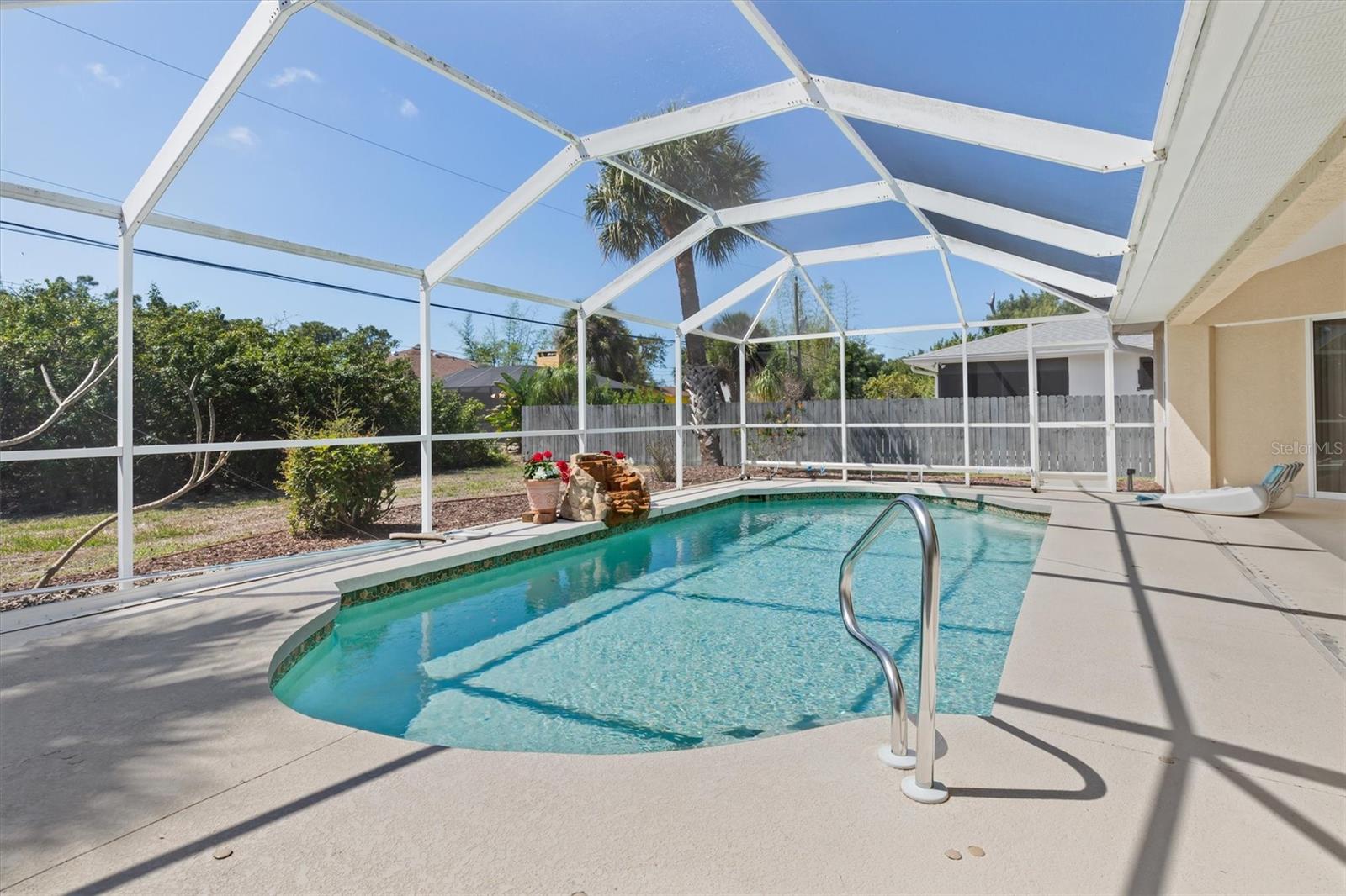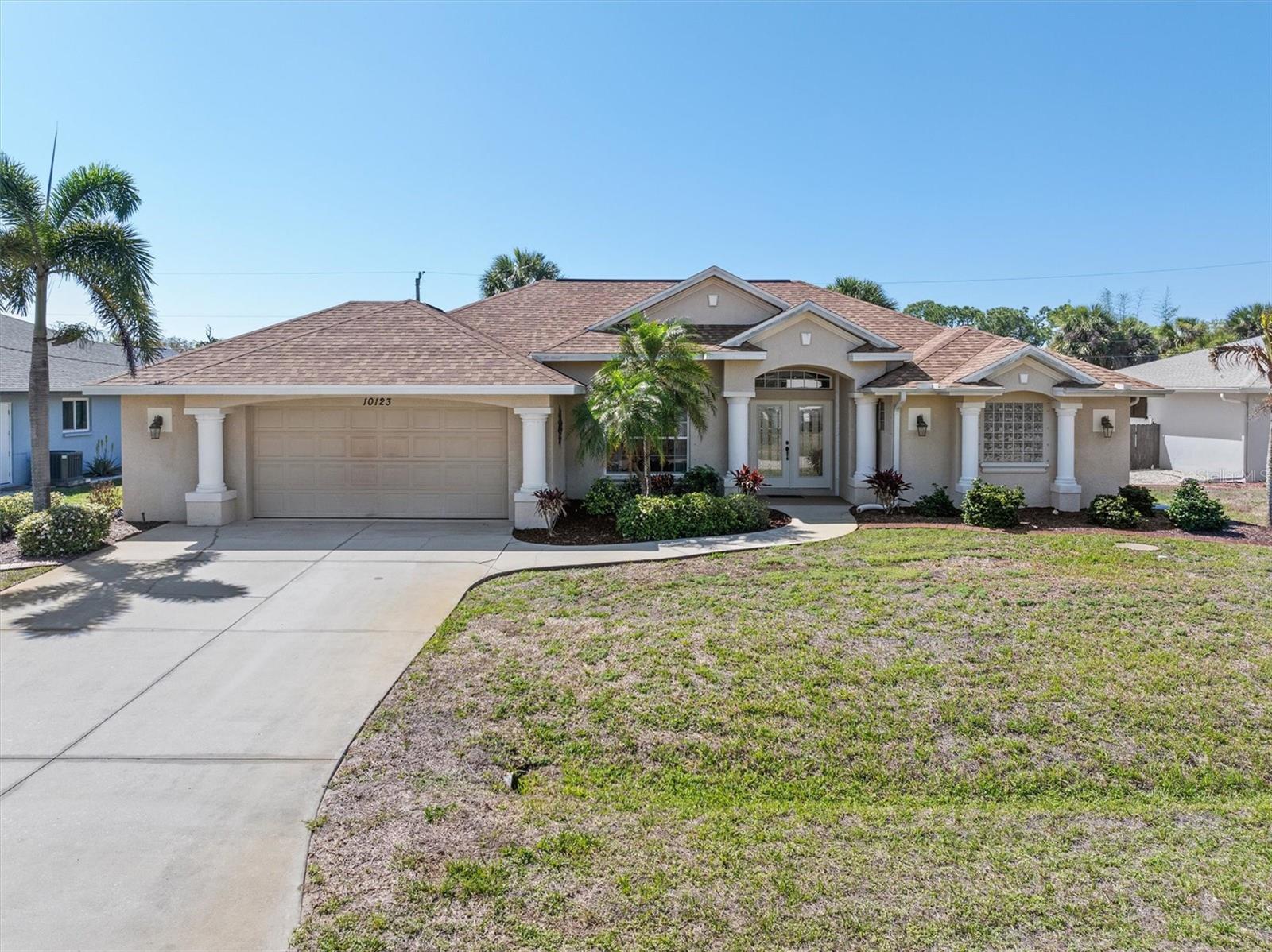 Beautiful, well-maintained, light and bright one-owner custom pool home offering over 2,020 sq ft of living space, an oversized 2-car garage, and a desirable split-bedroom floor plan. This home features high ceilings, crown molding, and built-ins throughout. As you walk through the double front doors, you’ll immediately see the screened-in heated pool with a waterfall. The pool area can be accessed from multiple areas of the home including the primary bedroom, guest suite, kitchen dinette, and hallway, which also provides quick access to the guest bathroom — perfect for entertaining and pool use. The primary suite is a dream at 22x11, featuring an ensuite bath with a water closet, dual sinks, soaking tub, and walk-in shower. The home also features an inside laundry room with a soaking tub for added convenience. Updates include roof replaced in 2021, newer appliances and AC replaced in 2024. The home also includes hurricane shutters throughout for added protection and peace of mind, and the property is not located in a flood zone. This lovely home truly shows pride of ownership and is a must see. No HOA and no deed restrictions, making it ideal as a primary residence or second home with plenty of room for entertaining. Conveniently located between the beautiful Gulf beaches of Englewood and Boca Grande, known as the Tarpon Fishing Capital of the World, with plenty of shopping, golf courses and restaurants nearby.