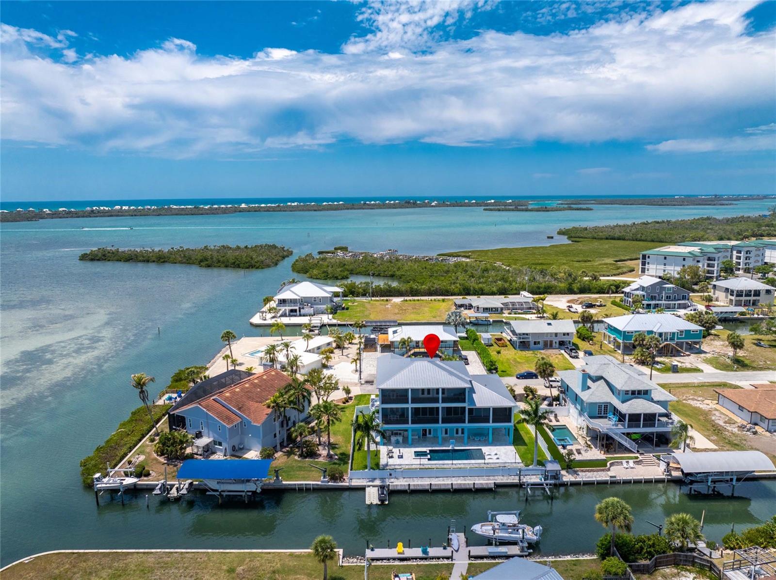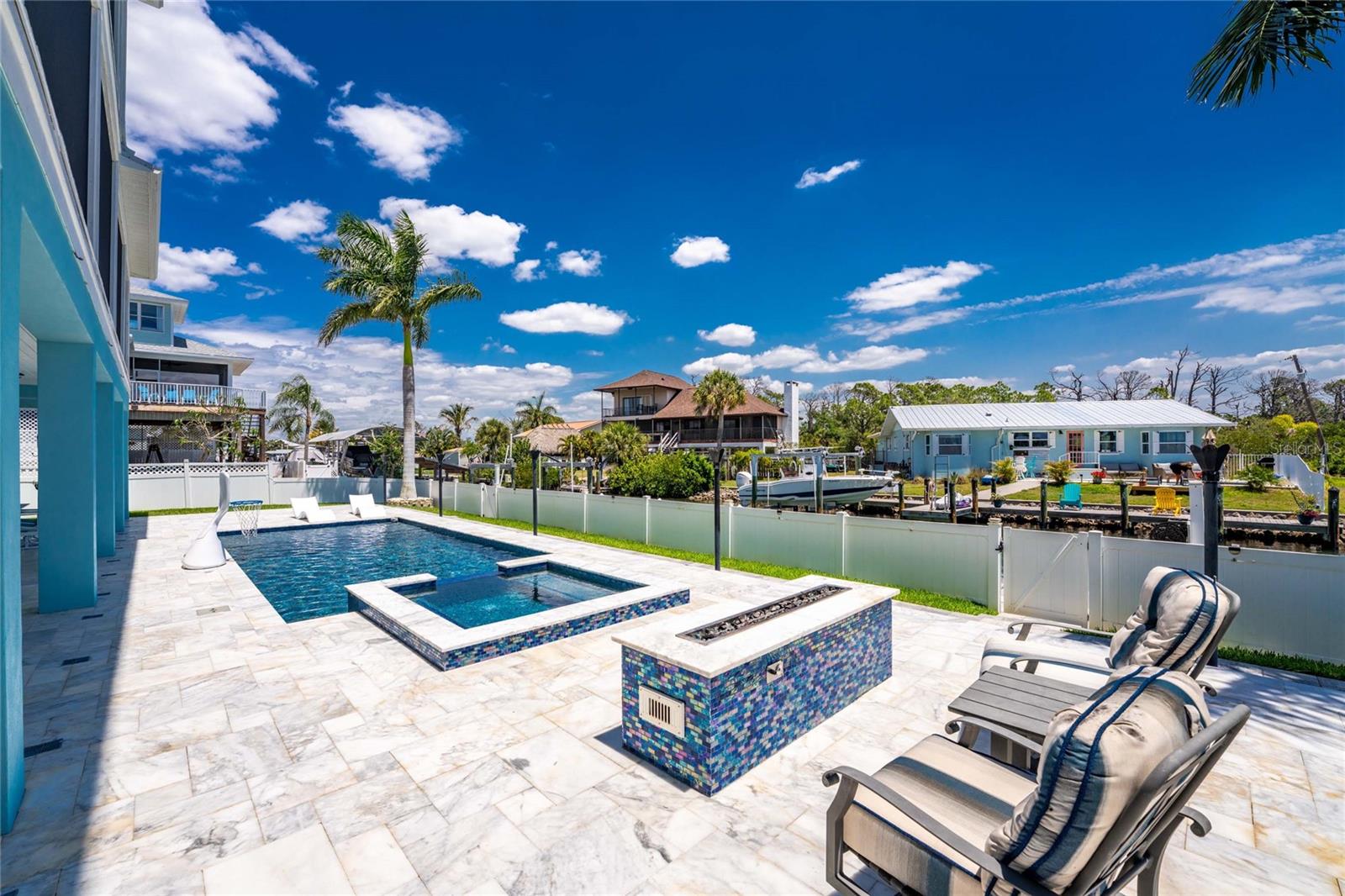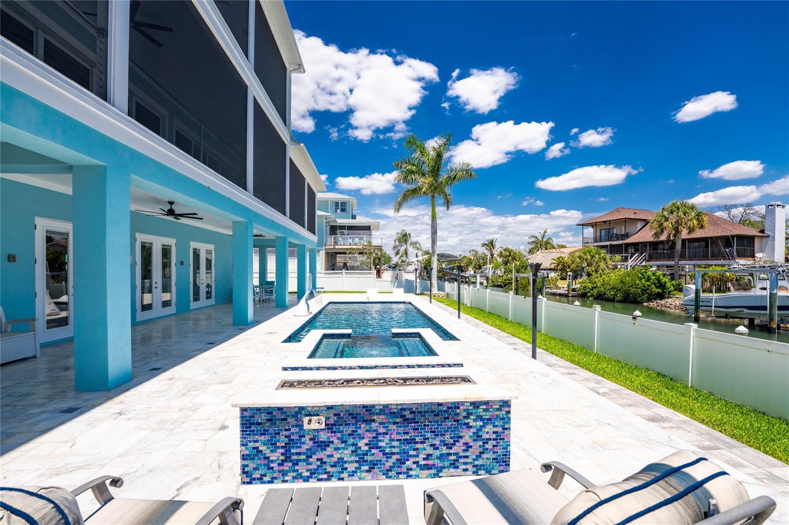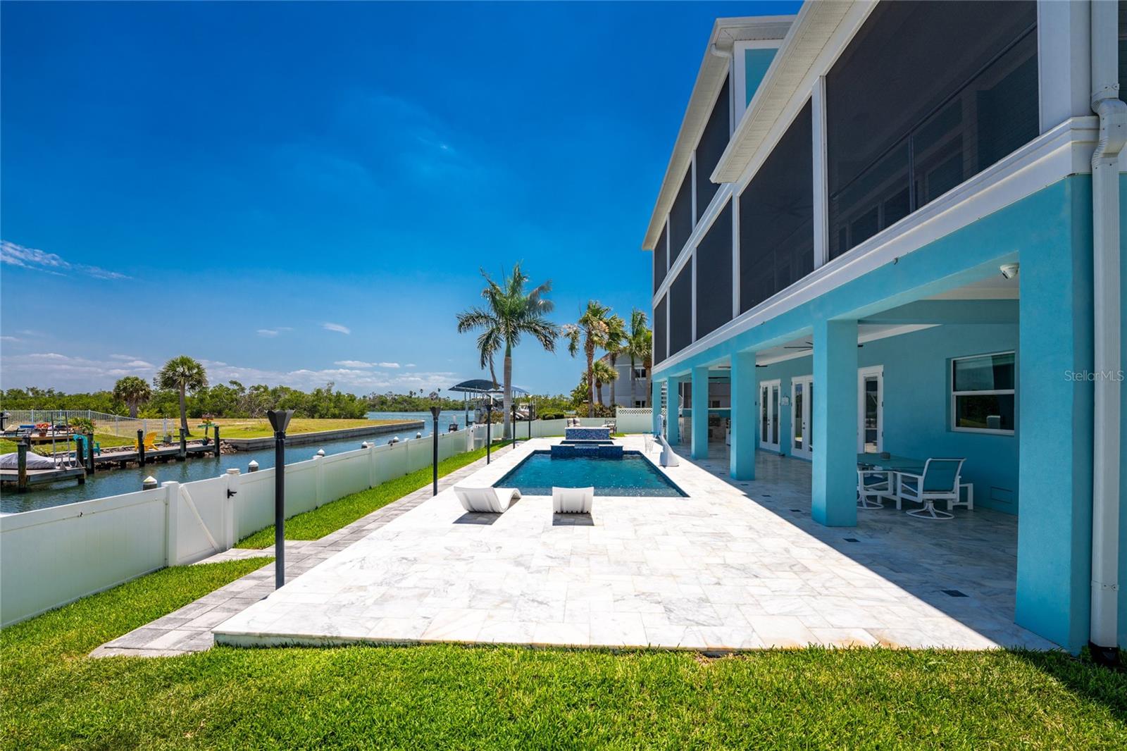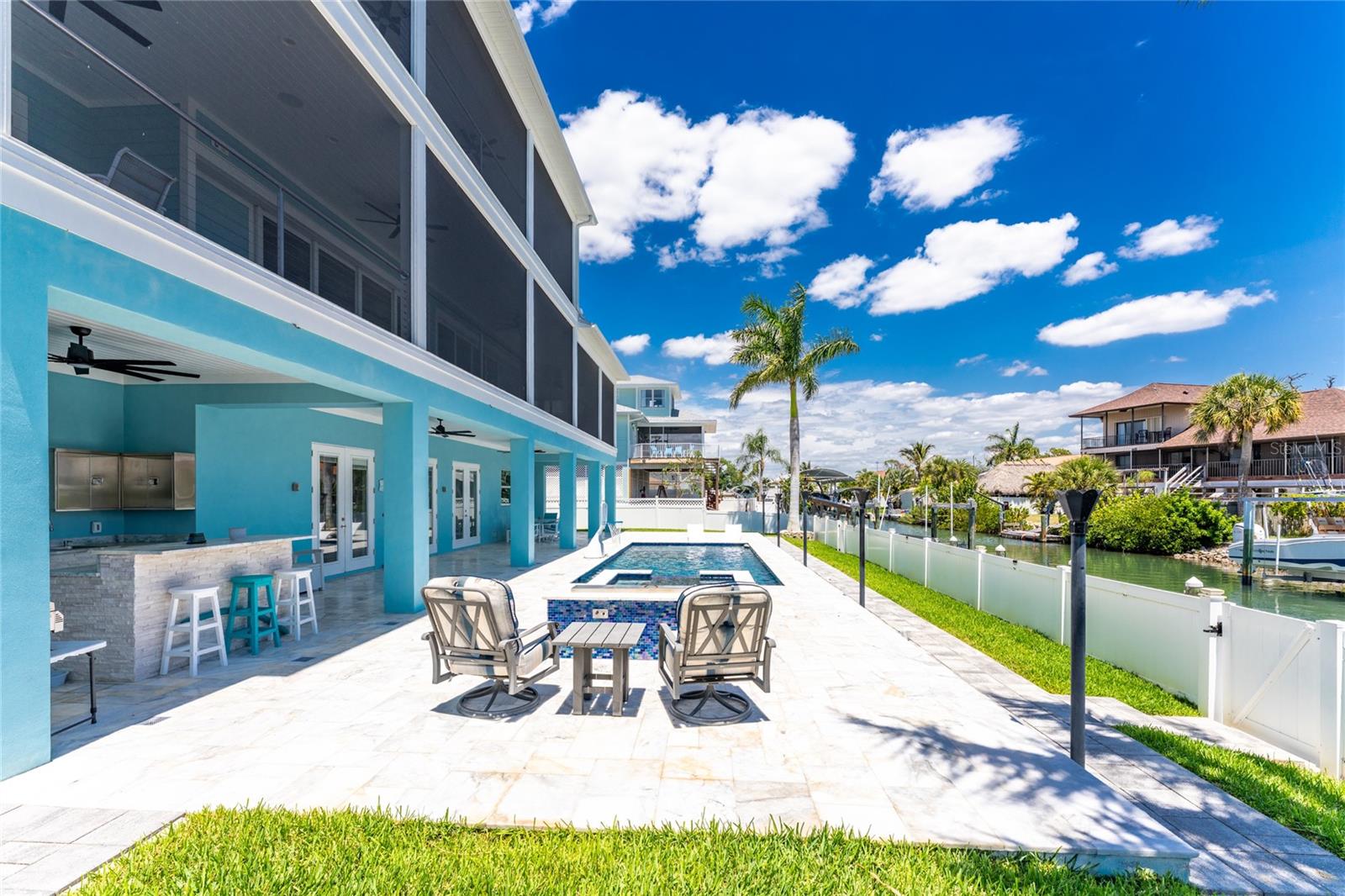 Experience the ultimate waterfront lifestyle in this stunning canal-front estate, offering nearly 9000 total square footage and 100 feet of prime frontage and direct access to the Intracoastal Waterway with no bridges and quick access to Stump Pass and the Gulf. Designed for both luxury and functionality, this 4-bedroom, 3-bath residence delivers exceptional indoor-outdoor living at every turn. Step outside to your private resort-style oasis featuring a marble pool deck, sparkling pool and spa, a built-in gas fire pit and gas tiki torches, perfect for entertaining under the Florida sky. Multiple expansive lanais on every level, connected by a striking spiral staircase, create seamless spaces to relax and take in the water views. The fully equipped outdoor kitchen includes a grill, sink, ice maker, mini fridge, and ample storage, making it ideal for hosting. Boating enthusiasts will appreciate the 50-foot dock, 10,000 lb. boat lift, and jet ski dock. Inside, no detail has been overlooked. The home showcases custom wood ceiling details, rich walnut stairs, elegant moldings, and all-wood custom cabinetry throughout. Quartz countertops elevate every space, while built-in features enhance all closets, the great room, and the primary suite. A spacious walk-in pantry adds convenience, and bedrooms 2 and 4 enjoy direct lanai access. The entire third floor is dedicated to a luxurious primary retreat, complete with a private sitting area, den, lanai, and a custom walk-in closet. The spa-inspired primary bath features split vanities with vessel sinks, jetted spa tub and a walk-through shower for a true retreat experience. Modern comforts include an elevator servicing all floors, paver driveways, fenced yard, impact-rated PGT windows and sliders, a whole-house generator, propane connections for major systems, a full-home speaker system, alarm system with cameras, mosquito misting system, and irrigation. A 4-car garage with epoxy floors provides ample space for vehicles and storage. This is a rare opportunity to own a meticulously designed waterfront home that perfectly blends luxury, comfort, and boating convenience.
