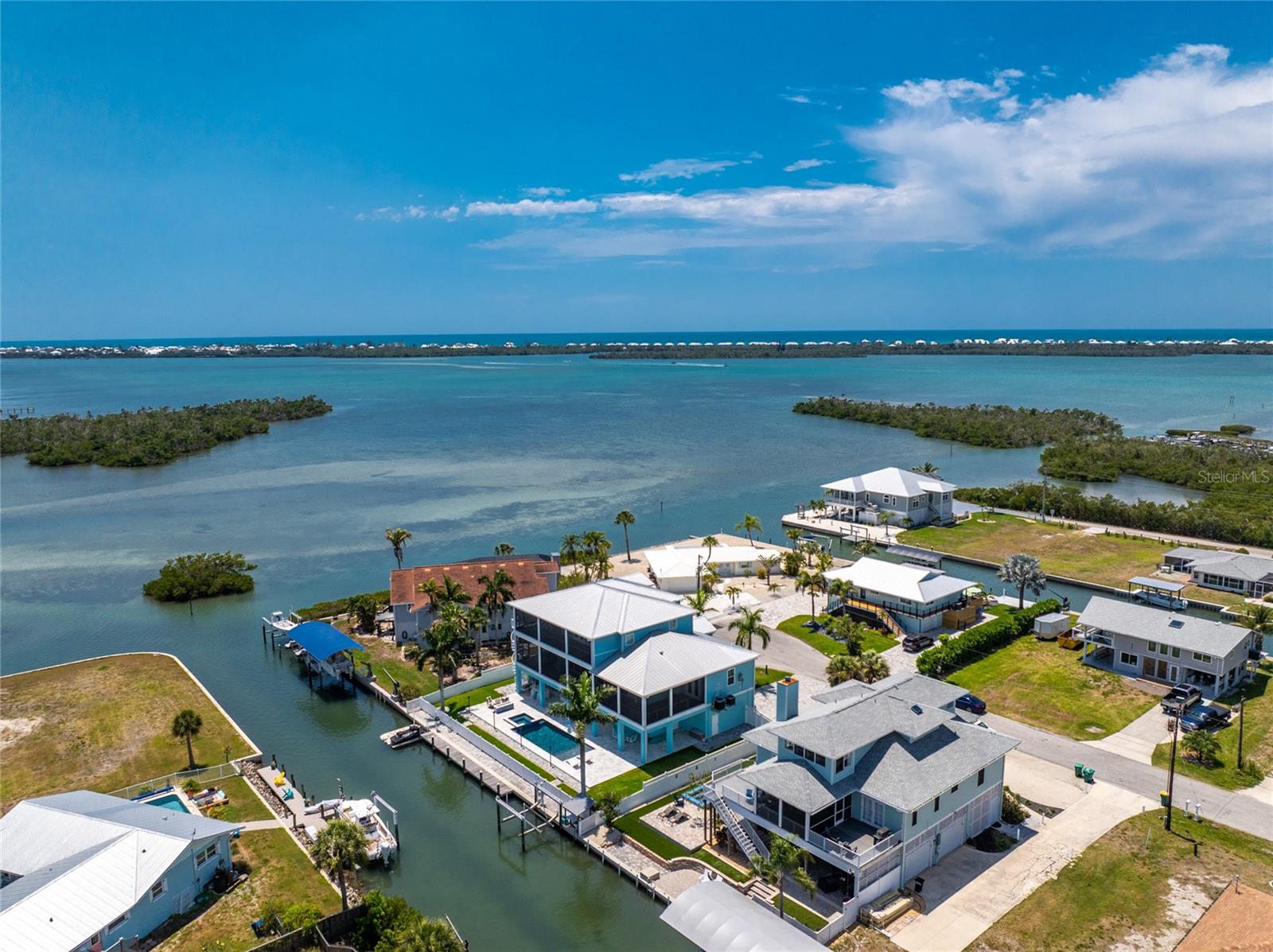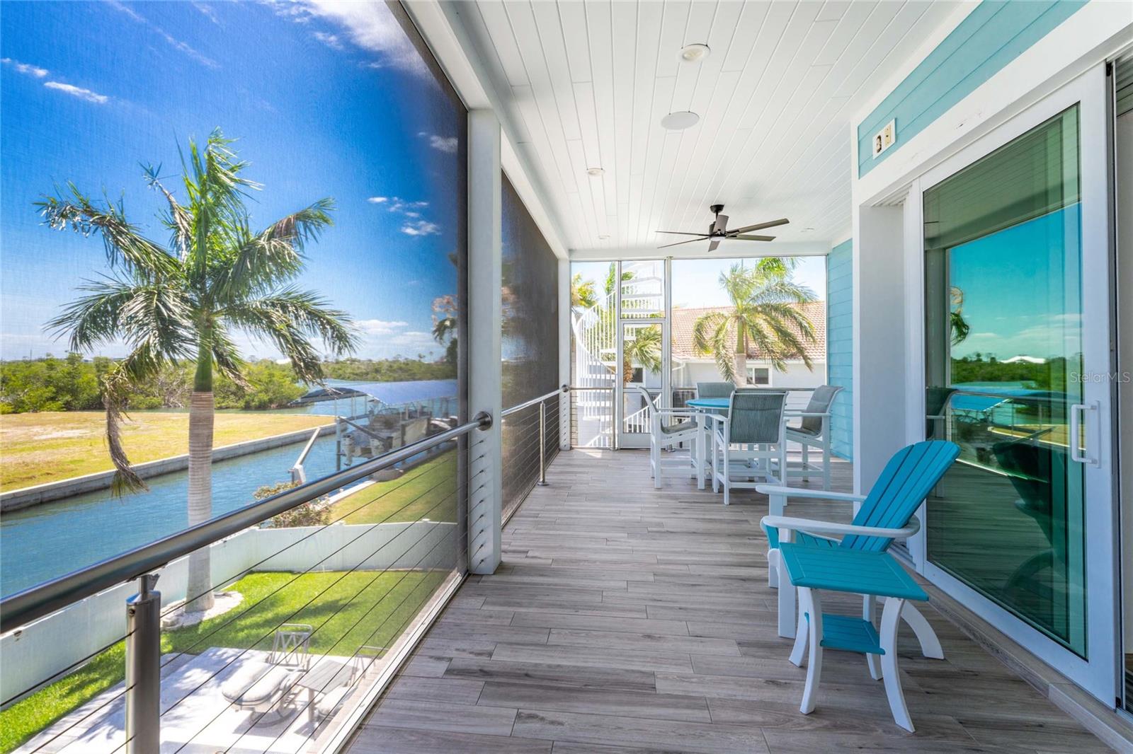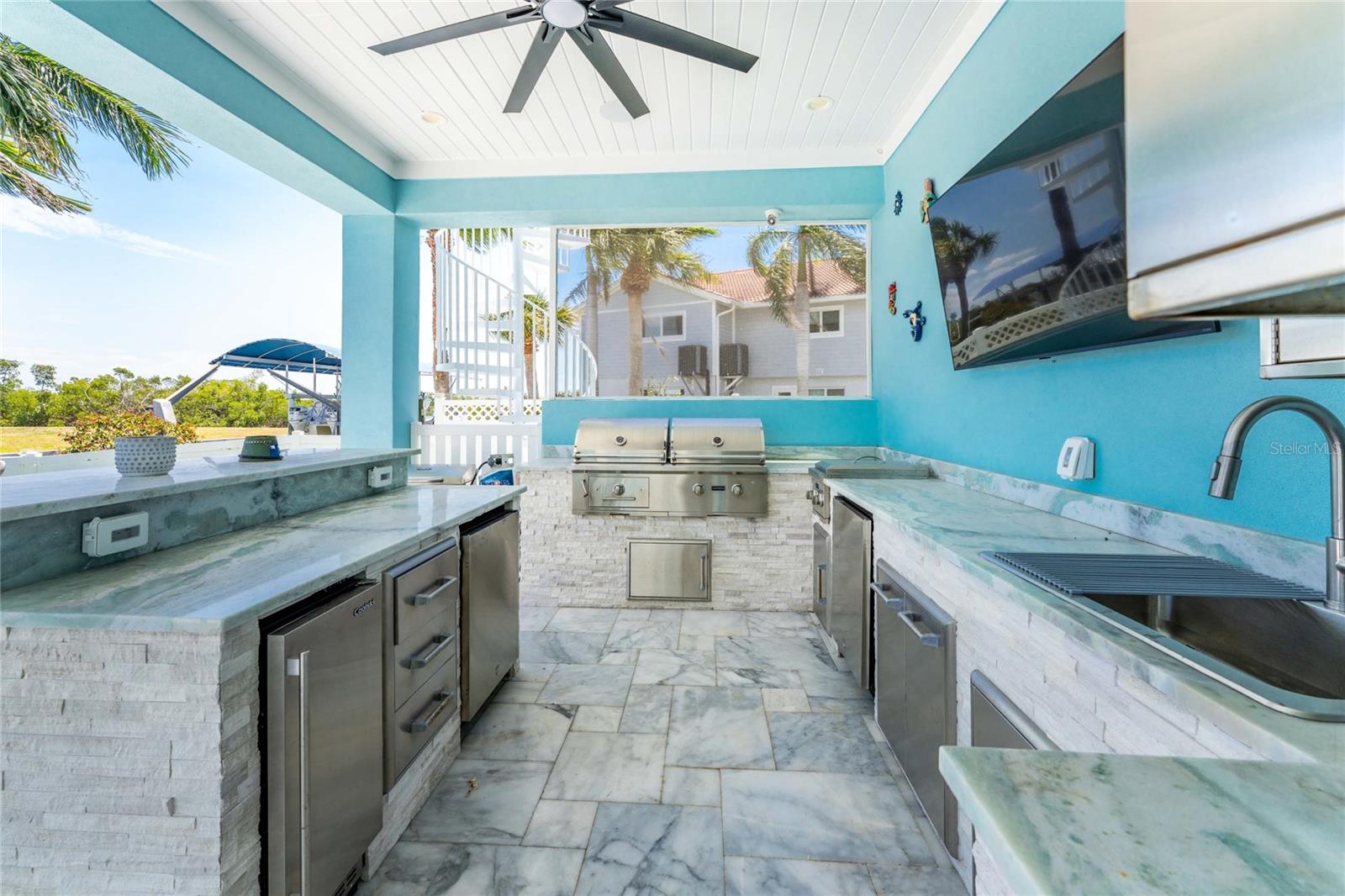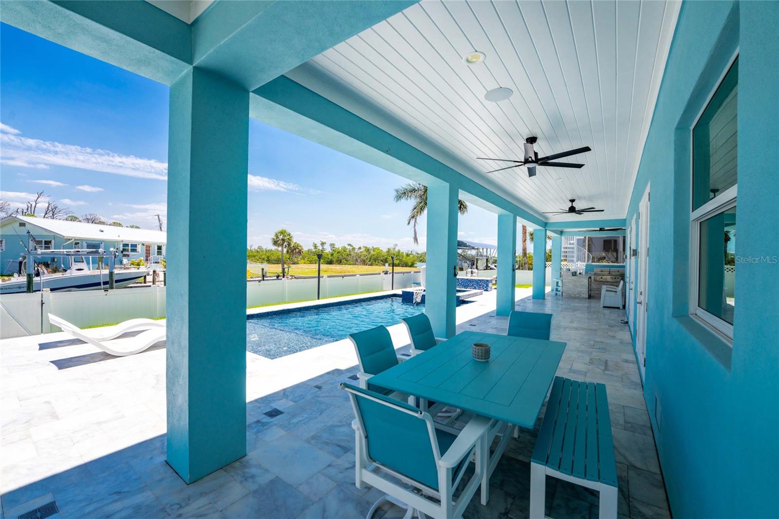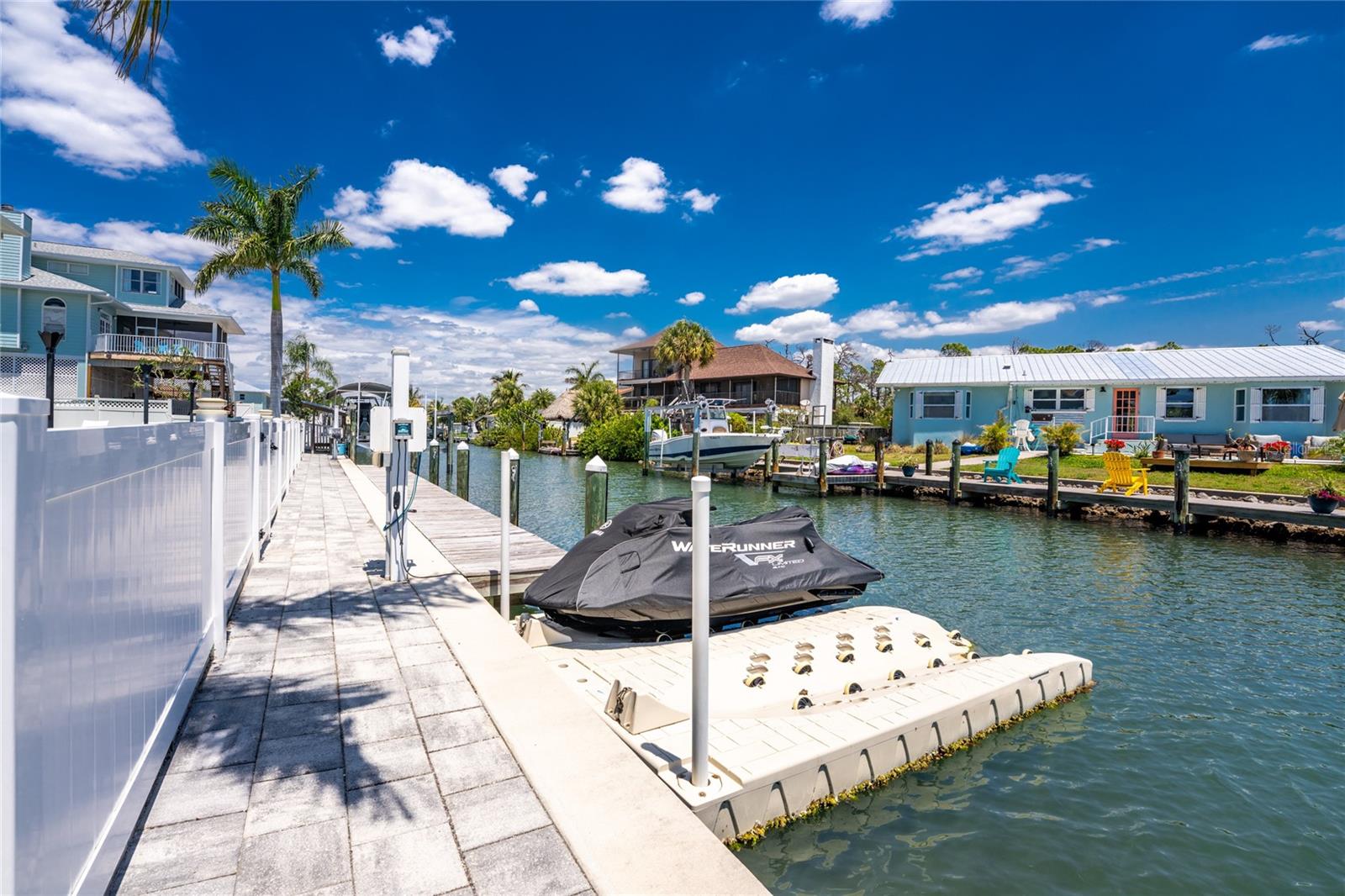 Experience the ultimate waterfront lifestyle in this stunning canal-front estate, offering nearly 9000 total square footage and 100 feet of prime frontage and direct access to the Intracoastal Waterway with no bridges and quick access to Stump Pass and the Gulf. Designed for both luxury and functionality, this 4-bedroom, 3-bath residence delivers exceptional indoor-outdoor living at every turn. Step outside to your private resort-style oasis featuring a marble pool deck, sparkling pool and spa, a built-in gas fire pit and gas tiki torches, perfect for entertaining under the Florida sky. Multiple expansive lanais on every level, connected by a striking spiral staircase, create seamless spaces to relax and take in the water views. The fully equipped outdoor kitchen includes a grill, sink, ice maker, mini fridge, and ample storage, making it ideal for hosting. Boating enthusiasts will appreciate the 50-foot dock, 10,000 lb. boat lift, and jet ski dock. Inside, no detail has been overlooked. The home showcases custom wood ceiling details, rich walnut stairs, elegant moldings, and all-wood custom cabinetry throughout. Quartz countertops elevate every space, while built-in features enhance all closets, the great room, and the primary suite. A spacious walk-in pantry adds convenience, and bedrooms 2 and 4 enjoy direct lanai access. The entire third floor is dedicated to a luxurious primary retreat, complete with a private sitting area, den, lanai, and a custom walk-in closet. The spa-inspired primary bath features split vanities with vessel sinks, jetted spa tub and a walk-through shower for a true retreat experience. Modern comforts include an elevator servicing all floors, paver driveways, fenced yard, impact-rated PGT windows and sliders, a whole-house generator, propane connections for major systems, a full-home speaker system, alarm system with cameras, mosquito misting system, and irrigation. A 4-car garage with epoxy floors provides ample space for vehicles and storage. This is a rare opportunity to own a meticulously designed waterfront home that perfectly blends luxury, comfort, and boating convenience.