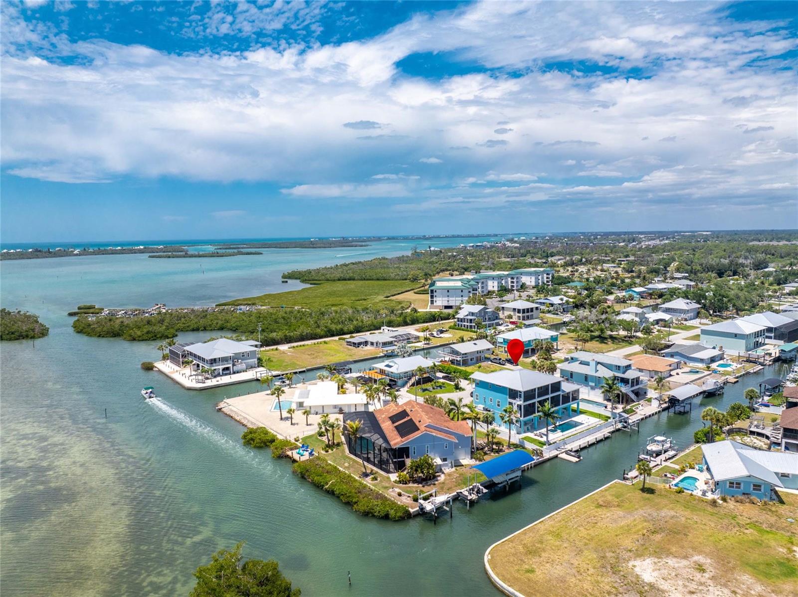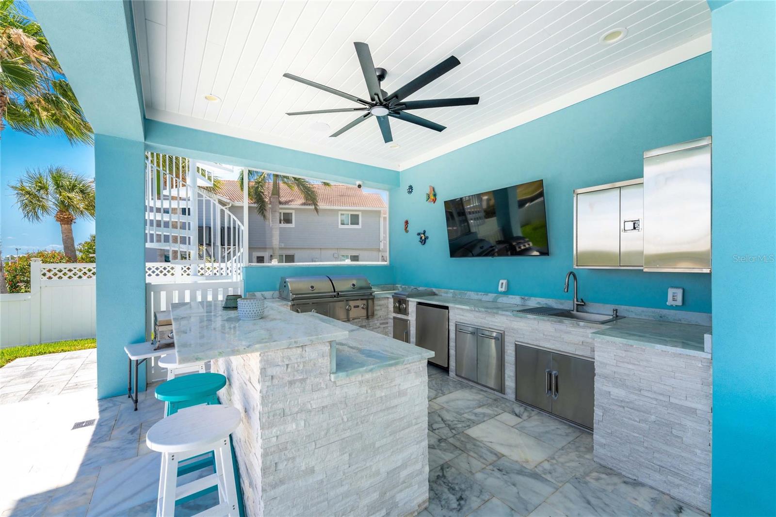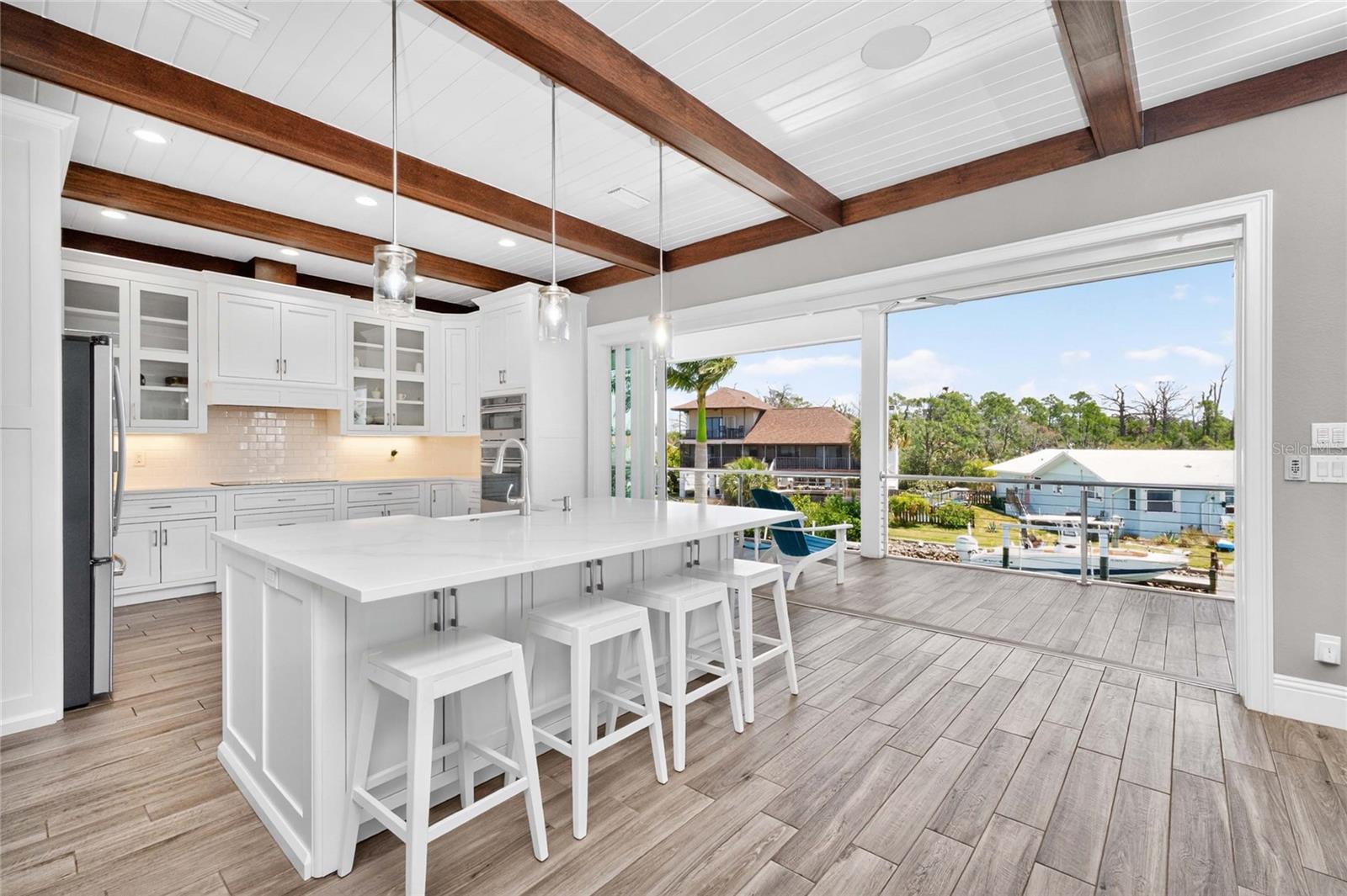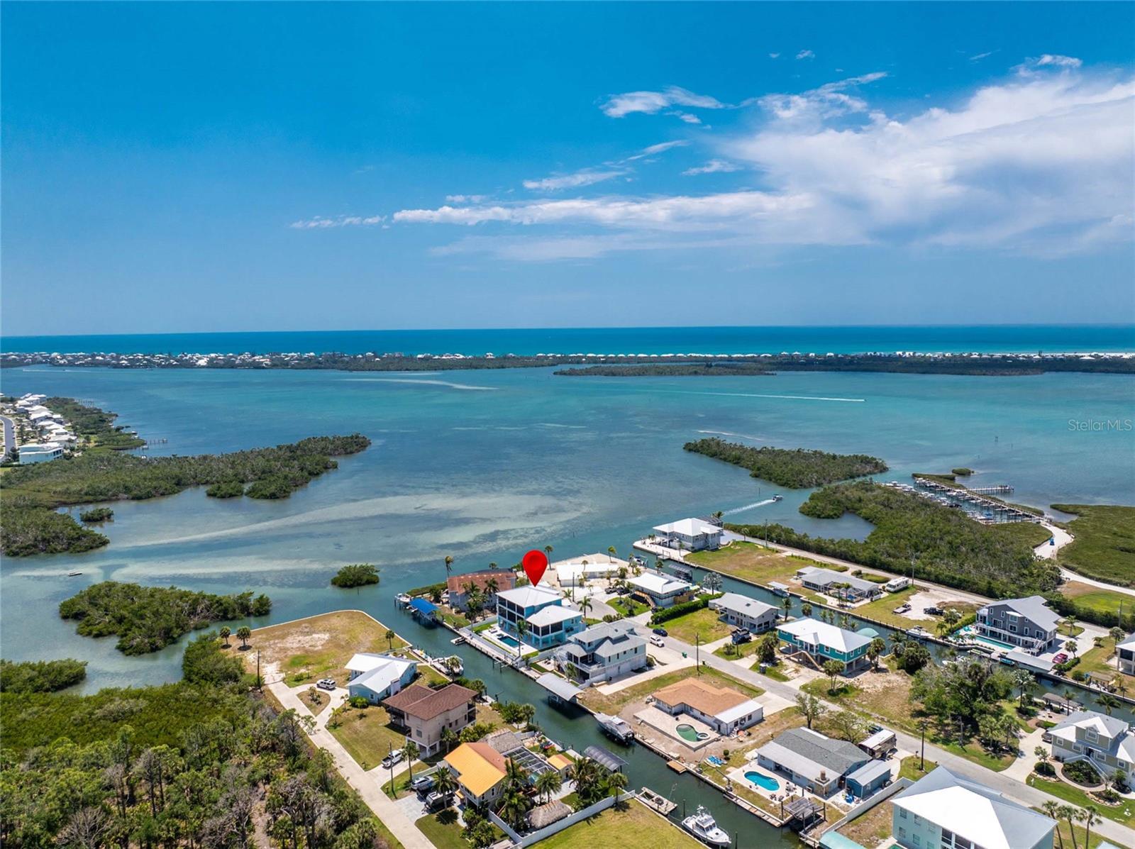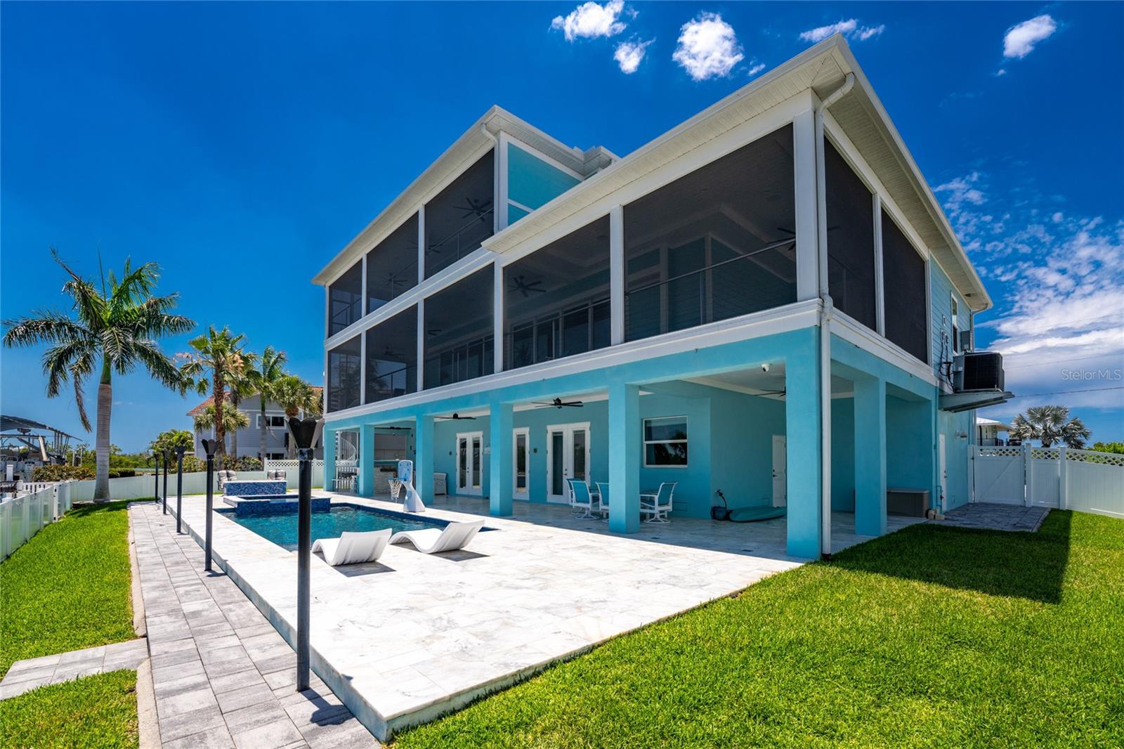 Experience the ultimate waterfront lifestyle in this stunning canal-front estate, offering nearly 9000 total square footage and 100 feet of prime frontage and direct access to the Intracoastal Waterway with no bridges and quick access to Stump Pass and the Gulf. Designed for both luxury and functionality, this 4-bedroom, 3-bath residence delivers exceptional indoor-outdoor living at every turn. Step outside to your private resort-style oasis featuring a marble pool deck, sparkling pool and spa, a built-in gas fire pit and gas tiki torches, perfect for entertaining under the Florida sky. Multiple expansive lanais on every level, connected by a striking spiral staircase, create seamless spaces to relax and take in the water views. The fully equipped outdoor kitchen includes a grill, sink, ice maker, mini fridge, and ample storage, making it ideal for hosting. Boating enthusiasts will appreciate the 50-foot dock, 10,000 lb. boat lift, and jet ski dock. Inside, no detail has been overlooked. The home showcases custom wood ceiling details, rich walnut stairs, elegant moldings, and all-wood custom cabinetry throughout. Quartz countertops elevate every space, while built-in features enhance all closets, the great room, and the primary suite. A spacious walk-in pantry adds convenience, and bedrooms 2 and 4 enjoy direct lanai access. The entire third floor is dedicated to a luxurious primary retreat, complete with a private sitting area, den, lanai, and a custom walk-in closet. The spa-inspired primary bath features split vanities with vessel sinks, jetted spa tub and a walk-through shower for a true retreat experience. Modern comforts include an elevator servicing all floors, paver driveways, fenced yard, impact-rated PGT windows and sliders, a whole-house generator, propane connections for major systems, a full-home speaker system, alarm system with cameras, mosquito misting system, and irrigation. A 4-car garage with epoxy floors provides ample space for vehicles and storage. This is a rare opportunity to own a meticulously designed waterfront home that perfectly blends luxury, comfort, and boating convenience.