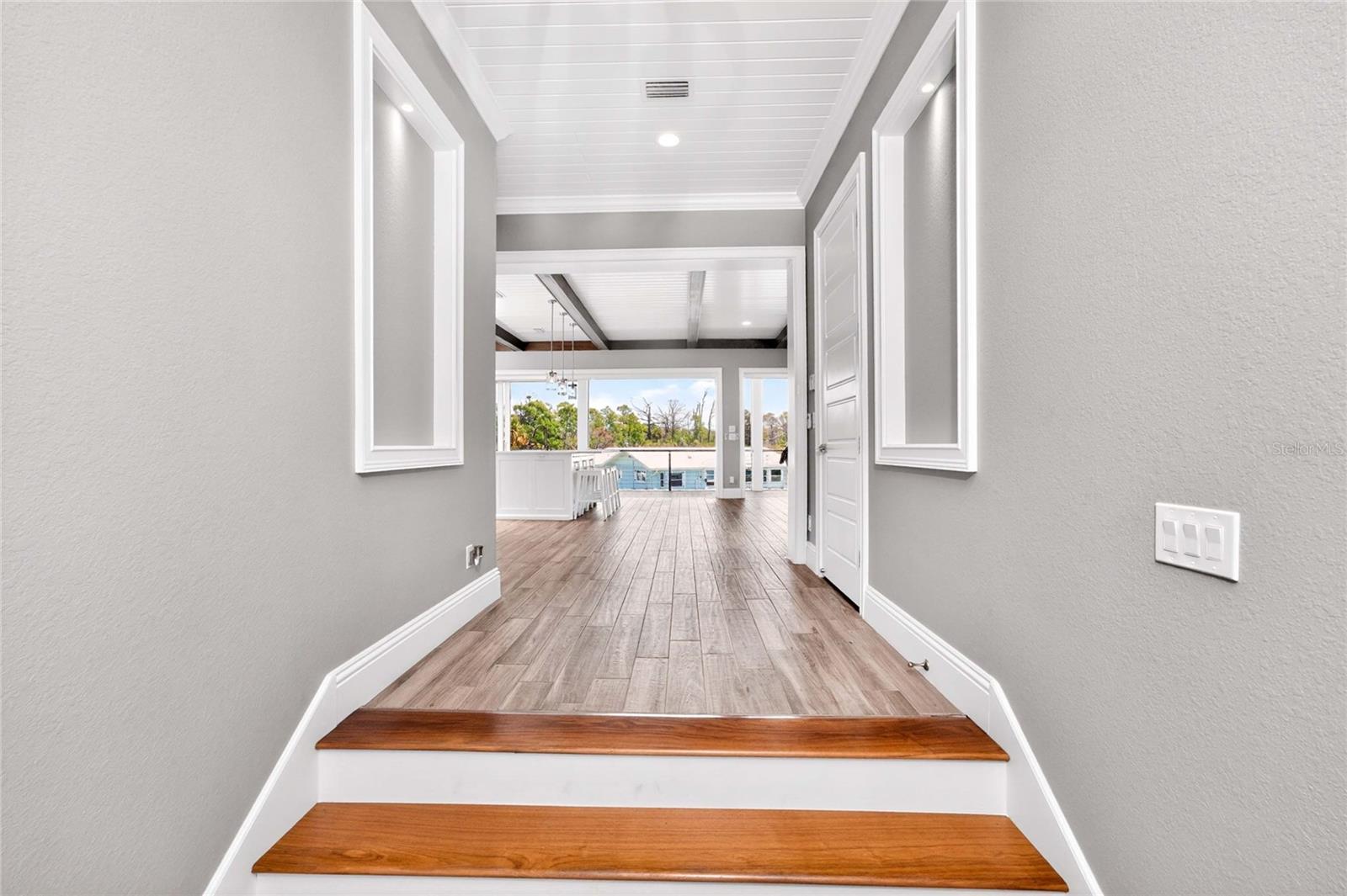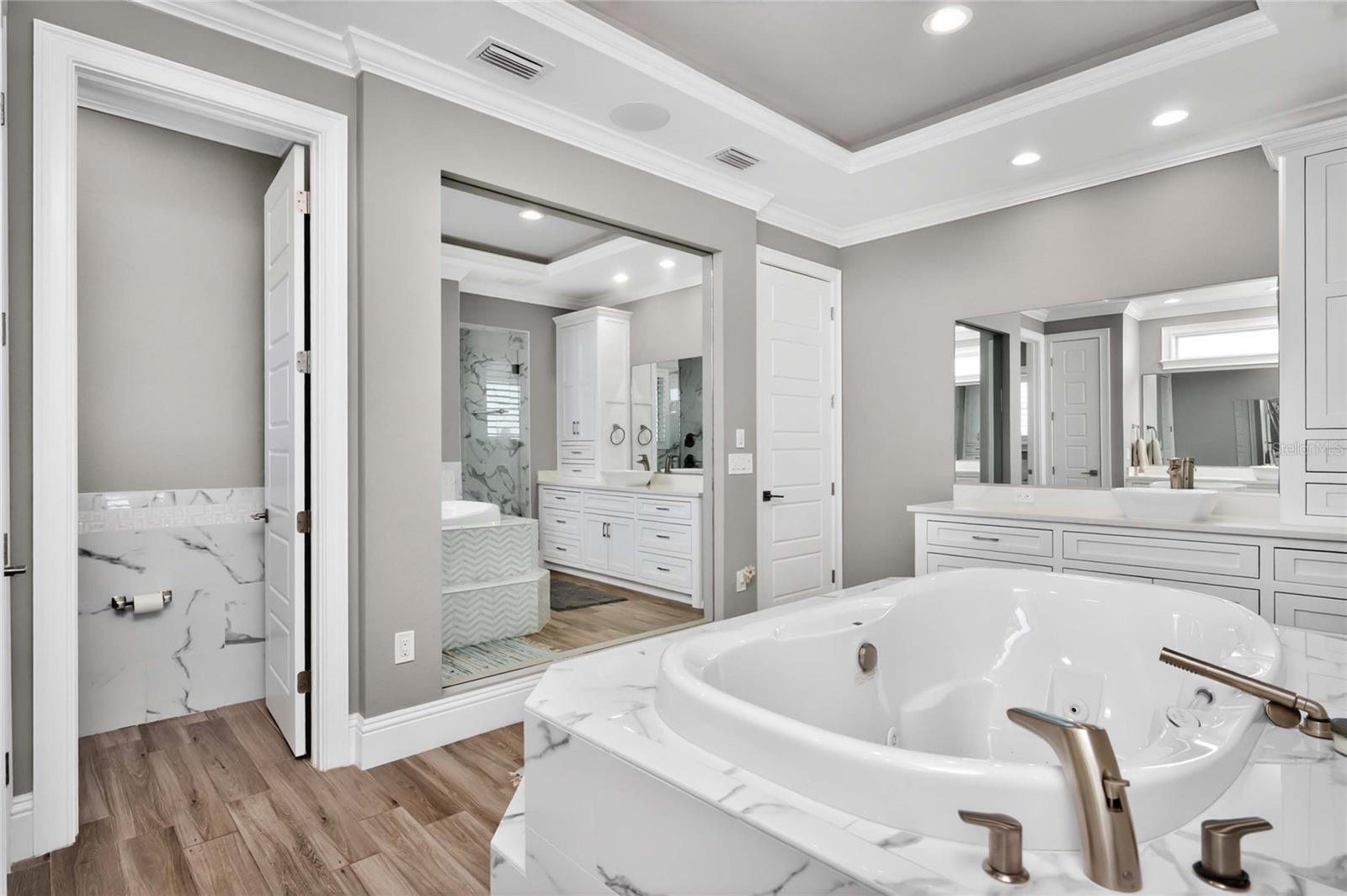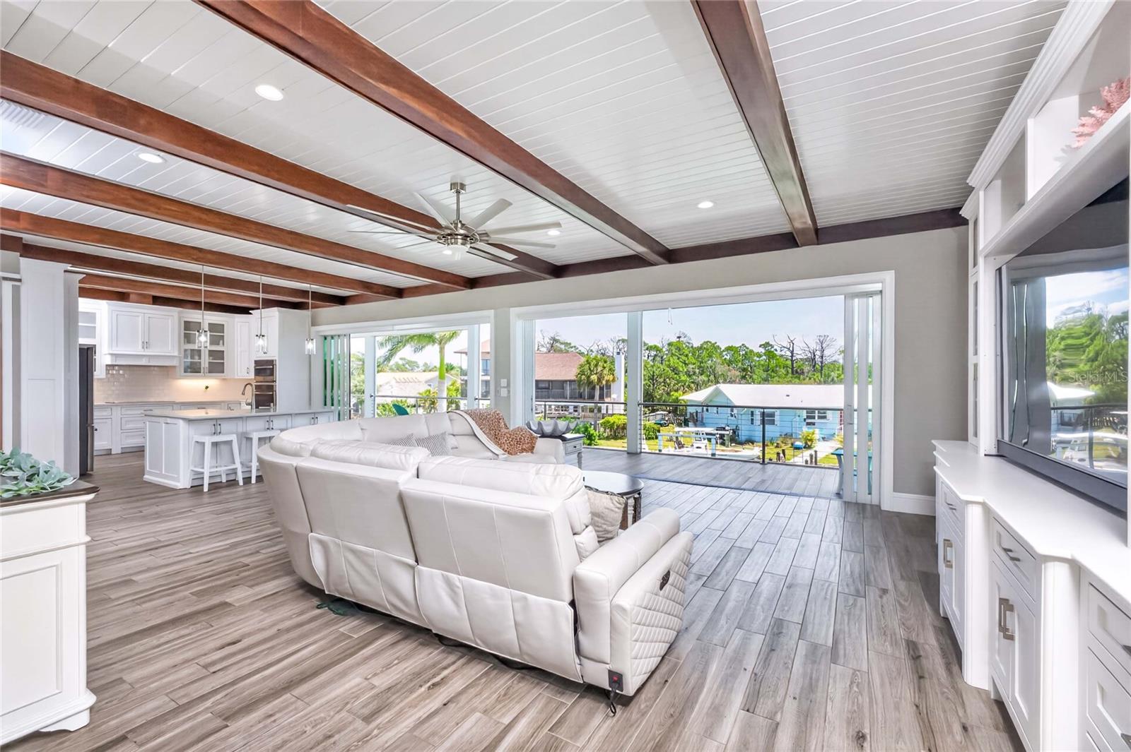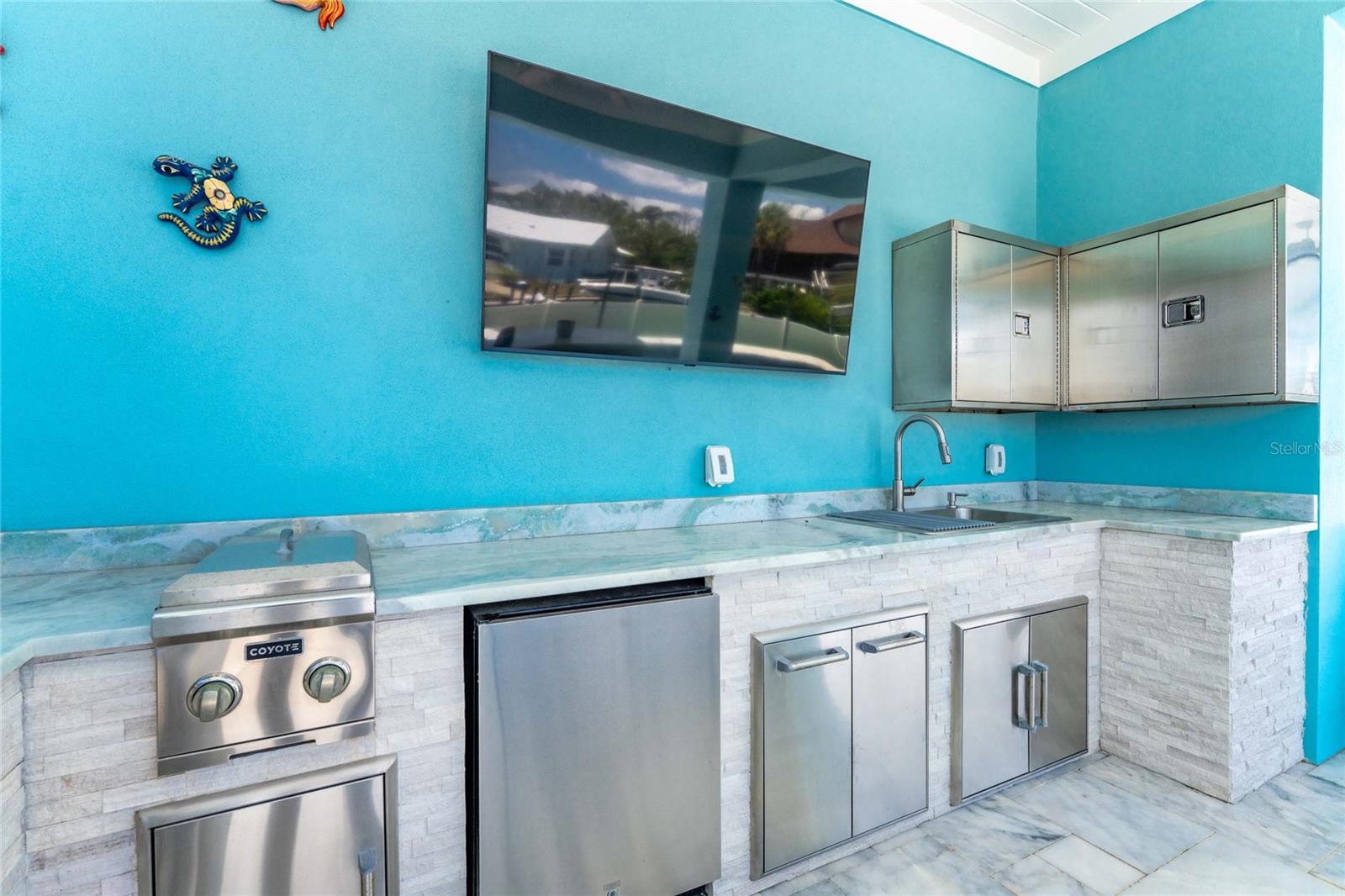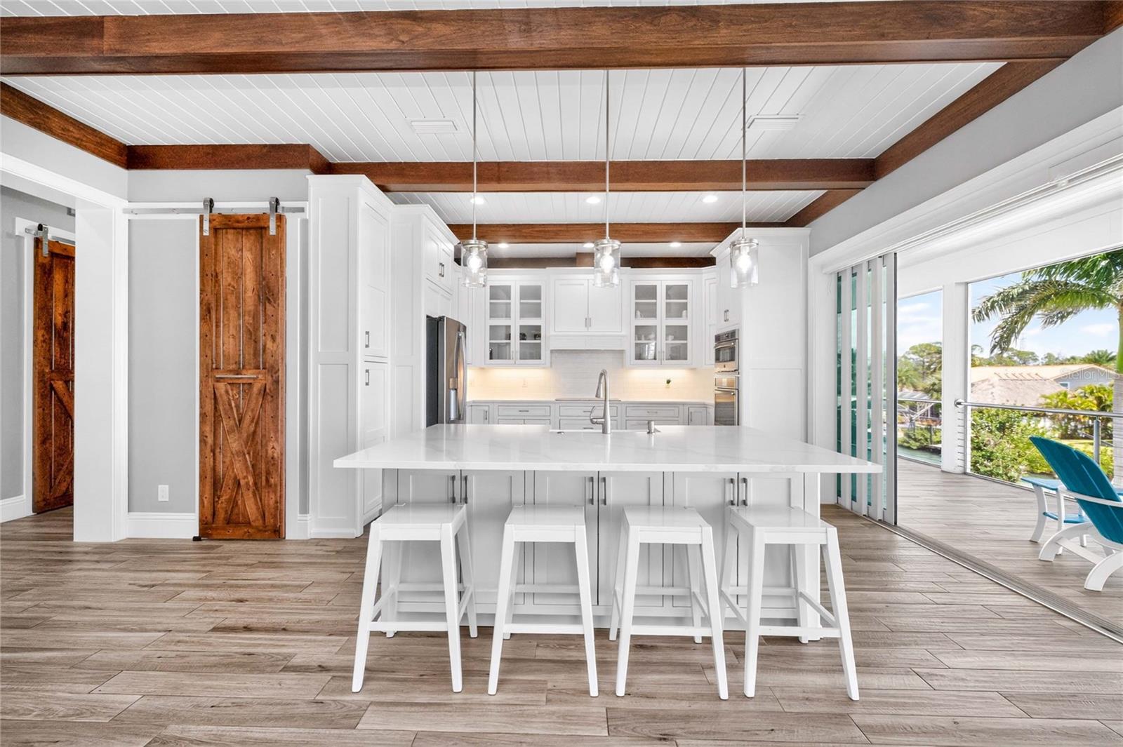 Experience the ultimate waterfront lifestyle in this stunning canal-front estate, offering nearly 9000 total square footage and 100 feet of prime frontage and direct access to the Intracoastal Waterway with no bridges and quick access to Stump Pass and the Gulf. Designed for both luxury and functionality, this 4-bedroom, 3-bath residence delivers exceptional indoor-outdoor living at every turn. Step outside to your private resort-style oasis featuring a marble pool deck, sparkling pool and spa, a built-in gas fire pit and gas tiki torches, perfect for entertaining under the Florida sky. Multiple expansive lanais on every level, connected by a striking spiral staircase, create seamless spaces to relax and take in the water views. The fully equipped outdoor kitchen includes a grill, sink, ice maker, mini fridge, and ample storage, making it ideal for hosting. Boating enthusiasts will appreciate the 50-foot dock, 10,000 lb. boat lift, and jet ski dock. Inside, no detail has been overlooked. The home showcases custom wood ceiling details, rich walnut stairs, elegant moldings, and all-wood custom cabinetry throughout. Quartz countertops elevate every space, while built-in features enhance all closets, the great room, and the primary suite. A spacious walk-in pantry adds convenience, and bedrooms 2 and 4 enjoy direct lanai access. The entire third floor is dedicated to a luxurious primary retreat, complete with a private sitting area, den, lanai, and a custom walk-in closet. The spa-inspired primary bath features split vanities with vessel sinks, jetted spa tub and a walk-through shower for a true retreat experience. Modern comforts include an elevator servicing all floors, paver driveways, fenced yard, impact-rated PGT windows and sliders, a whole-house generator, propane connections for major systems, a full-home speaker system, alarm system with cameras, mosquito misting system, and irrigation. A 4-car garage with epoxy floors provides ample space for vehicles and storage. This is a rare opportunity to own a meticulously designed waterfront home that perfectly blends luxury, comfort, and boating convenience.
