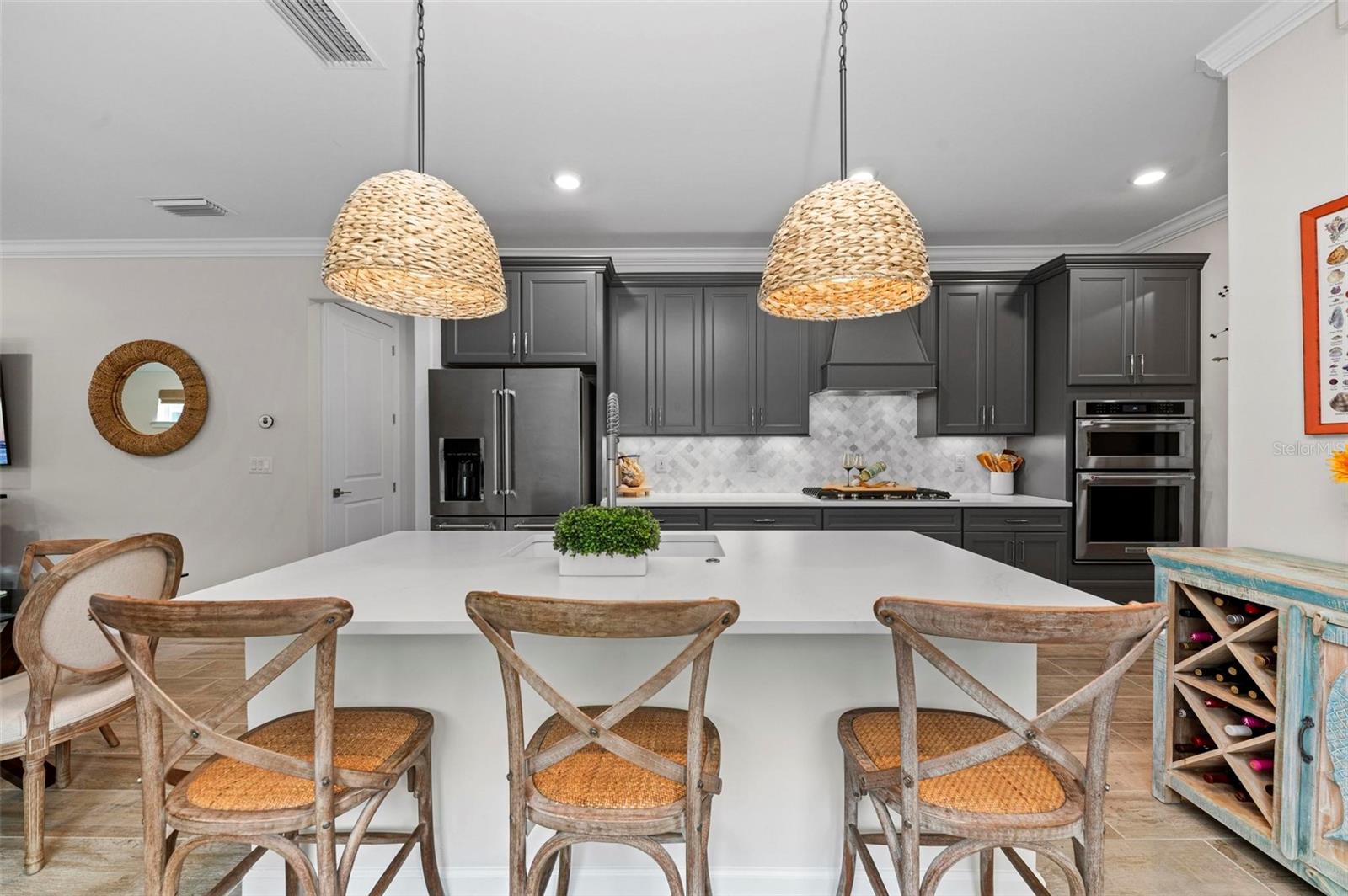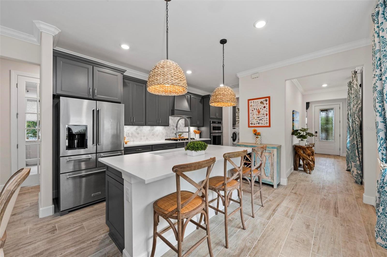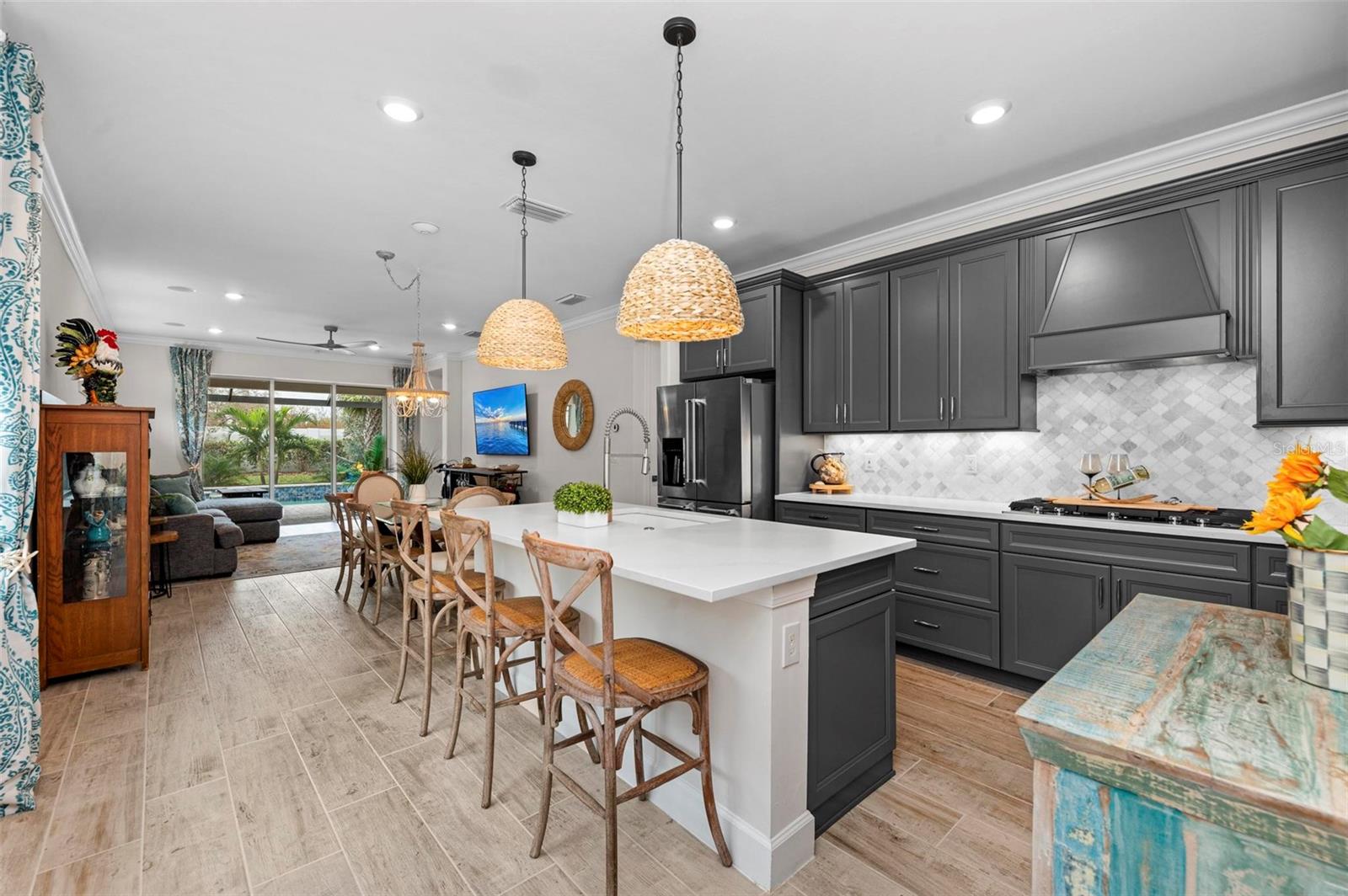 REDUCED** SELLERS MOTIVATED**TURNKEY FURNISHED and $200K in Upgrades in This Stunning Home! The sellers have truly thought of everything in this beautifully upgraded home located in Beachwalk of Manasota Key. Starting with an extended pavered driveway, a screened-in entry, and lush landscaping featuring 11 elegant palms, this property offers incredible curb appeal. Inside, you’ll find ceramic Level 6 wide plank tile flooring throughout, complemented by crown molding and custom touches such as rounded corner walls and upgraded lighting. The gourmet kitchen is perfect for entertaining, and the glass front door and custom windows add elegance throughout. Kitchen has large island with beautiful and smooth cashmere oro quartz (matte), upgraded Kitchenaid appliances, 5 Burner GAS Stovetop, custom backsplash, cabinet hooded vent and upgraded dark gray cabinetry with soft close and pull out drawers. The upgraded laundry room includes built-in cabinets and a sink, while the guest bath features a luxurious walk-in shower. Master en suite has upgraded gray dual vanity, walk in shower with subway tile to ceiling and glass frameless door. Glass french doors on den or 3rd bedroom alos with walk in closet. Home also boasts 5" baseboards and 8' solid interior doors. The garage offers a 4-foot extension with overhead racks for additional storage. The home is equipped with a tankless water heater and smart home features for modern convenience. Step outside to your very own lanai oasis, complete with a $125K heated saltwater pool and spa, a clear view screen, and a 4-foot lanai extension—perfect for relaxing and enjoying Florida living at its finest. Guard Gated and Resort style community complete with: RESORT STYLE POOL with lap lanes, SPA, TENNIS, BOCCE BALL, PICKLEBALL, FITNESS CENTER, COFFEE/SMOOTHIE BAR, and soon it's very own RESTAURANT/TIKI BAR (early 2025). Make friends easily in this very social community where golf carts can be driven to area beaches and you are only minutes from Downtown Wellen Park to the East, Downtown Venice Avenue to the North or Downtown Dearborn Street to the South!