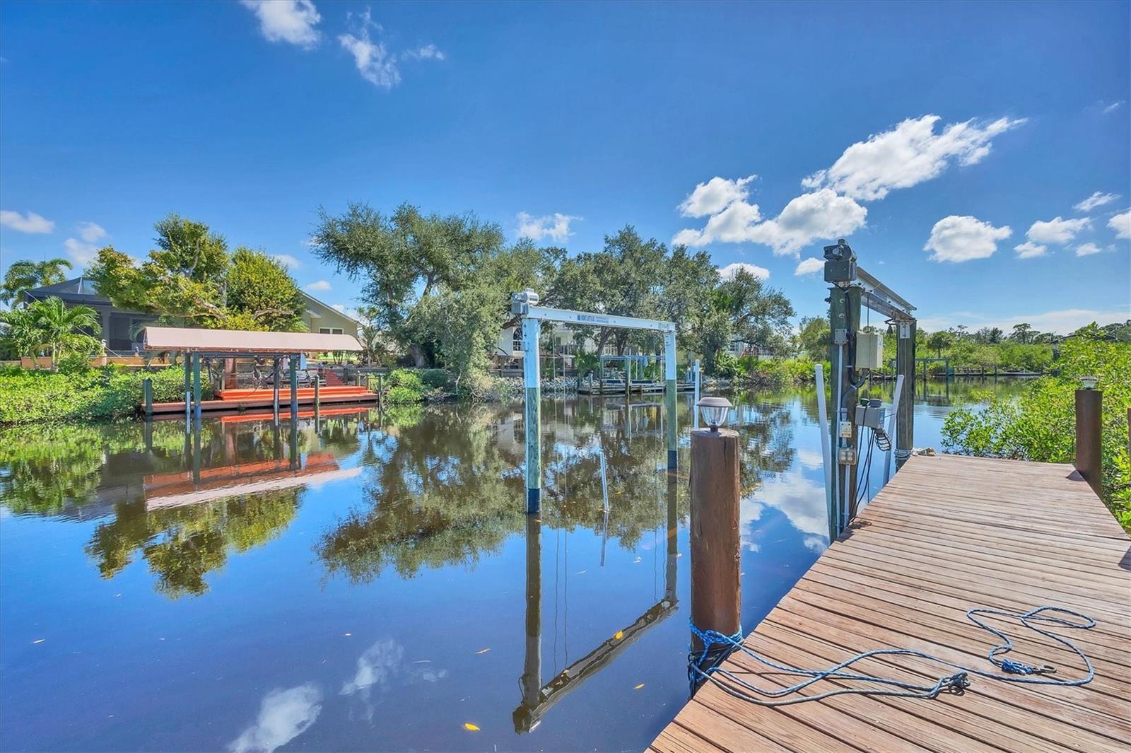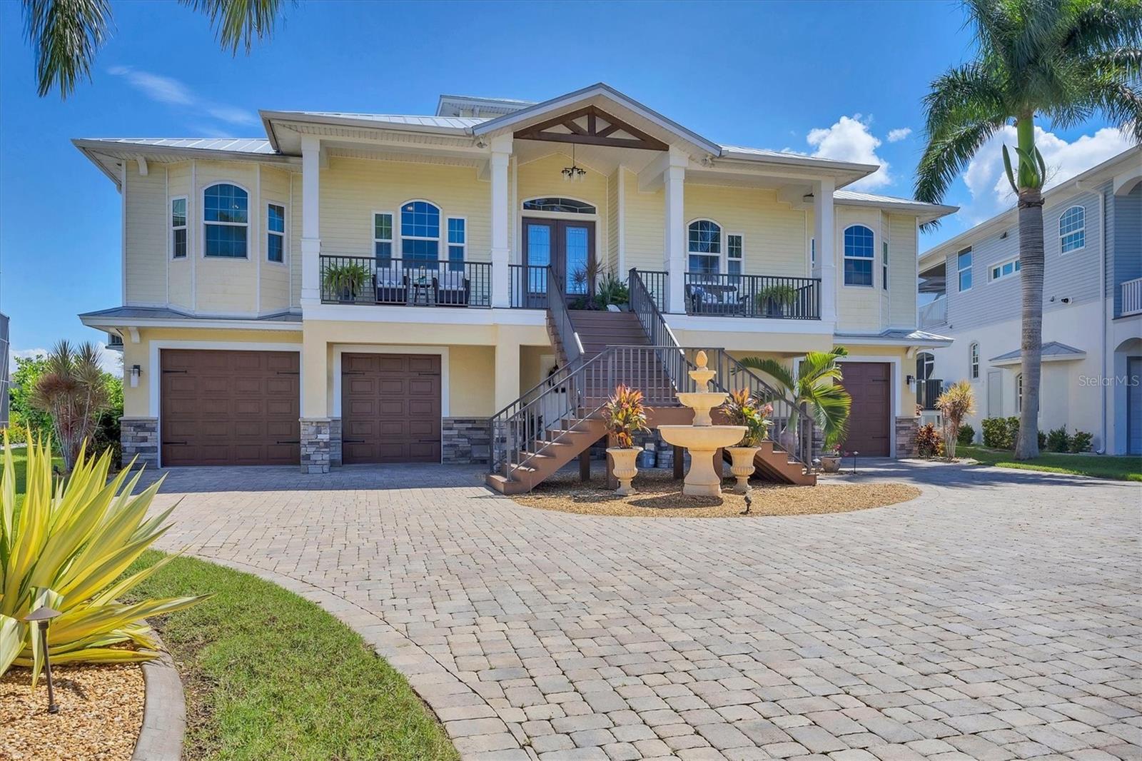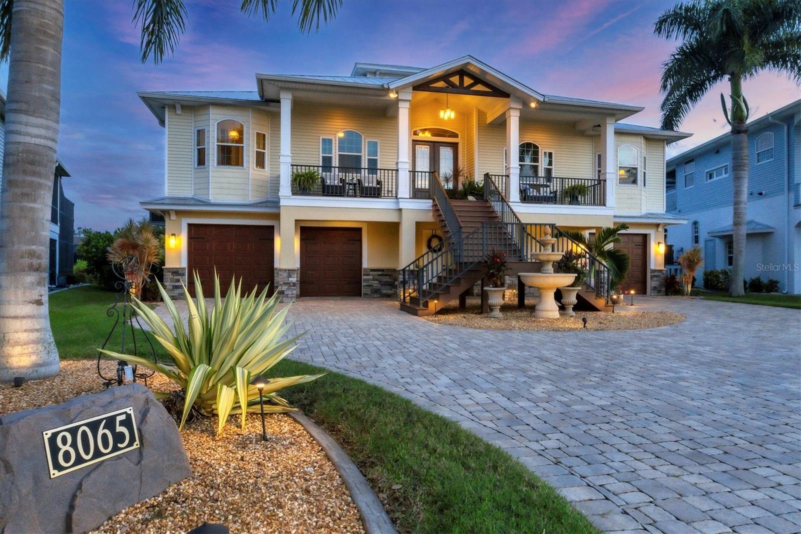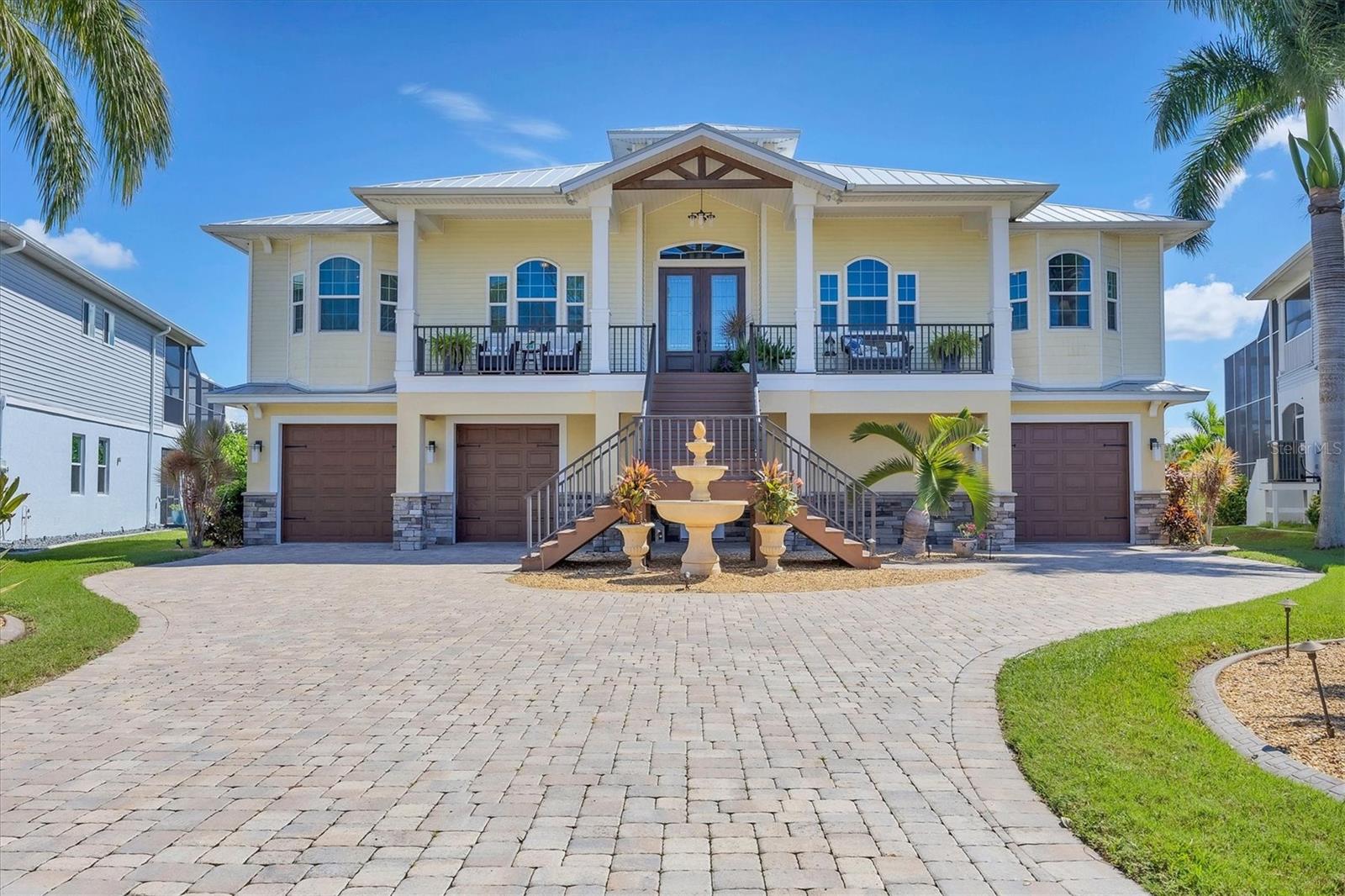 Welcome to Hidden Waters, an exclusive gated community featuring just 19 exceptional properties. This stunning executive retreat, crafted by the renowned custom builder Antony Fiore, truly exemplifies luxury living. Set on over half an acre, this home boasts a magnificent saltwater heated pool and an impressive 180 feet of water frontage along the picturesque Oyster Creek. The property includes a 30-foot dock and a 10,000-pound boat lift, giving you direct access to the Intracoastal Waterway and the Gulf of Mexico—perfect for world-class fishing, boating, and sunbathing. Every detail of this residence has been meticulously designed, ensuring that no expense was spared in creating your own personal paradise. Welcome home! As you approach the welcoming front entrance, you'll be greeted by a spacious paver driveway surrounded by lush tropical landscaping. The grand staircase evokes the timeless charm of classic southern architecture, reminiscent of the grandeur seen in "Gone with the Wind." This stunning entry sets the tone for the luxurious living that awaits inside. Entering the home from the ground-level entry, you'll discover a modern elevator and a staircase leading to the main living level. Alternatively, you can enjoy the spacious three-car garage and a 1,300-square-foot bonus room, complete with a half bath and breathtaking views of the tropical landscaping, heated pool, and sandy beach fire pit. Upon reaching the main living area, you're greeted by stunning custom African Acacia wood flooring that flows seamlessly throughout the home, including the bedrooms. The living room features a striking Dominican Coral stone wall, complete with an electric fireplace and built-in TV insert, making it a perfect gathering space. This well-appointed 3 Bedroom plus Den with a murphy Bed is a big plus. A magnificent ceiling cupola adds an elegant touch to the ambiance. The gourmet kitchen is a chef's dream, featuring a beautiful shell backsplash, a large Quartzite island, stainless steel appliances, a built-in microwave, and a wine cooler. Retreat to the Grand Master Suite, where you'll find a spectacular copper soaking tub fit for royalty, a frameless glass shower, and double vanities, creating a serene and luxurious personal oasis. The expansive upper porch, stretching 60 feet, is the perfect spot to relax, entertain, or simply unwind while taking in the stunning views of your meticulously manicured estate. Your Pebble Tec pool adds to the luxurious outdoor experience. Safety is paramount here, with all doors and windows featuring impact-resistant glass for peace of mind. Just a few steps down the cul-de-sac, you can access the beautiful Oyster Creek Park, offering a serene escape with miles of walking paths through nature. Enjoy the perfect blend of luxury living and natural beauty right at your doorstep!
