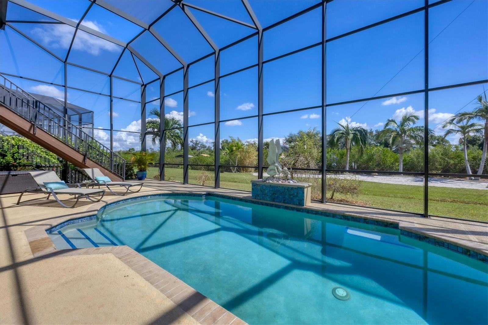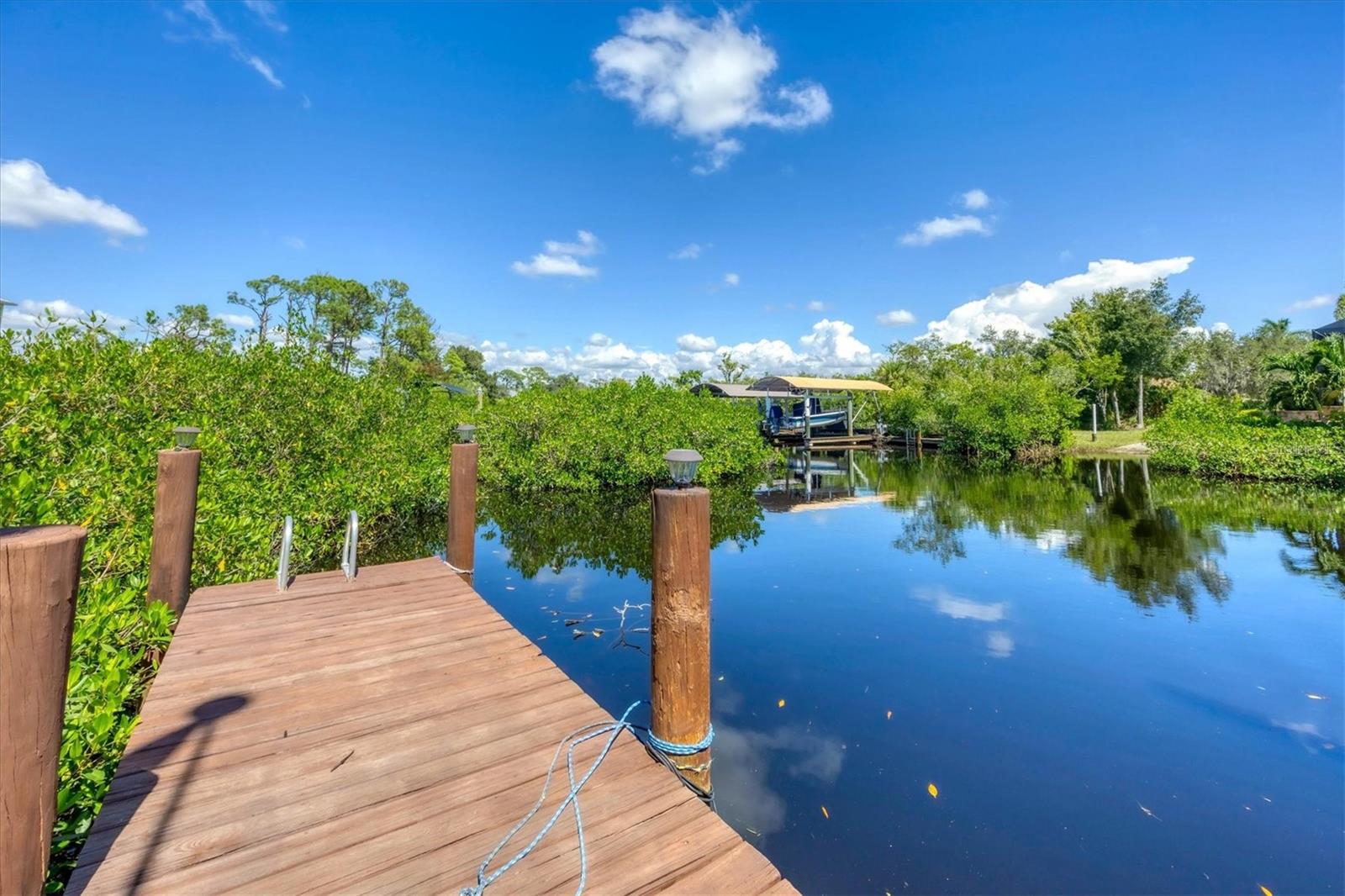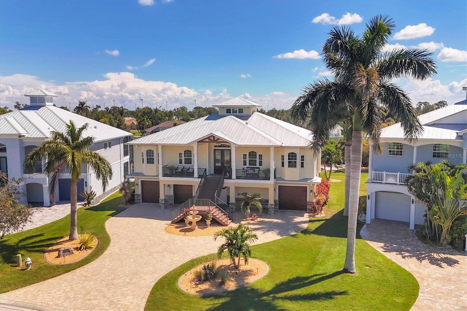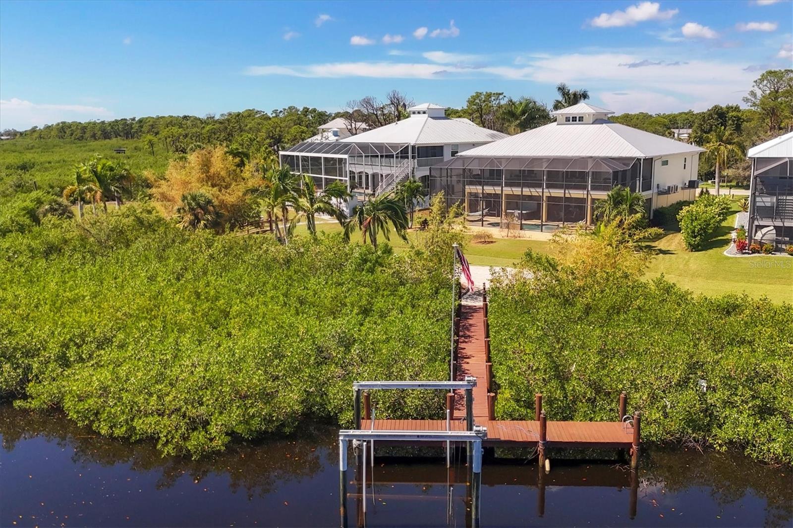Welcome to Hidden Waters, an exclusive gated community featuring just 19 exceptional properties. This stunning executive retreat, crafted by the renowned custom builder Antony Fiore, truly exemplifies luxury living. Set on over half an acre, this home boasts a magnificent saltwater heated pool and an impressive 180 feet of water frontage along the picturesque Oyster Creek. The property includes a 30-foot dock and a 10,000-pound boat lift, giving you direct access to the Intracoastal Waterway and the Gulf of Mexico—perfect for world-class fishing, boating, and sunbathing. Every detail of this residence has been meticulously designed, ensuring that no expense was spared in creating your own personal paradise. Welcome home! As you approach the welcoming front entrance, you'll be greeted by a spacious paver driveway surrounded by lush tropical landscaping. The grand staircase evokes the timeless charm of classic southern architecture, reminiscent of the grandeur seen in "Gone with the Wind." This stunning entry sets the tone for the luxurious living that awaits inside. Entering the home from the ground-level entry, you'll discover a modern elevator and a staircase leading to the main living level. Alternatively, you can enjoy the spacious three-car garage and a 1,300-square-foot bonus room, complete with a half bath and breathtaking views of the tropical landscaping, heated pool, and sandy beach fire pit. Upon reaching the main living area, you're greeted by stunning custom African Acacia wood flooring that flows seamlessly throughout the home, including the bedrooms. The living room features a striking Dominican Coral stone wall, complete with an electric fireplace and built-in TV insert, making it a perfect gathering space. This well-appointed 3 Bedroom plus Den with a murphy Bed is a big plus. A magnificent ceiling cupola adds an elegant touch to the ambiance. The gourmet kitchen is a chef's dream, featuring a beautiful shell backsplash, a large Quartzite island, stainless steel appliances, a built-in microwave, and a wine cooler. Retreat to the Grand Master Suite, where you'll find a spectacular copper soaking tub fit for royalty, a frameless glass shower, and double vanities, creating a serene and luxurious personal oasis. The expansive upper porch, stretching 60 feet, is the perfect spot to relax, entertain, or simply unwind while taking in the stunning views of your meticulously manicured estate. Your Pebble Tec pool adds to the luxurious outdoor experience. Safety is paramount here, with all doors and windows featuring impact-resistant glass for peace of mind. Just a few steps down the cul-de-sac, you can access the beautiful Oyster Creek Park, offering a serene escape with miles of walking paths through nature. Enjoy the perfect blend of luxury living and natural beauty right at your doorstep!