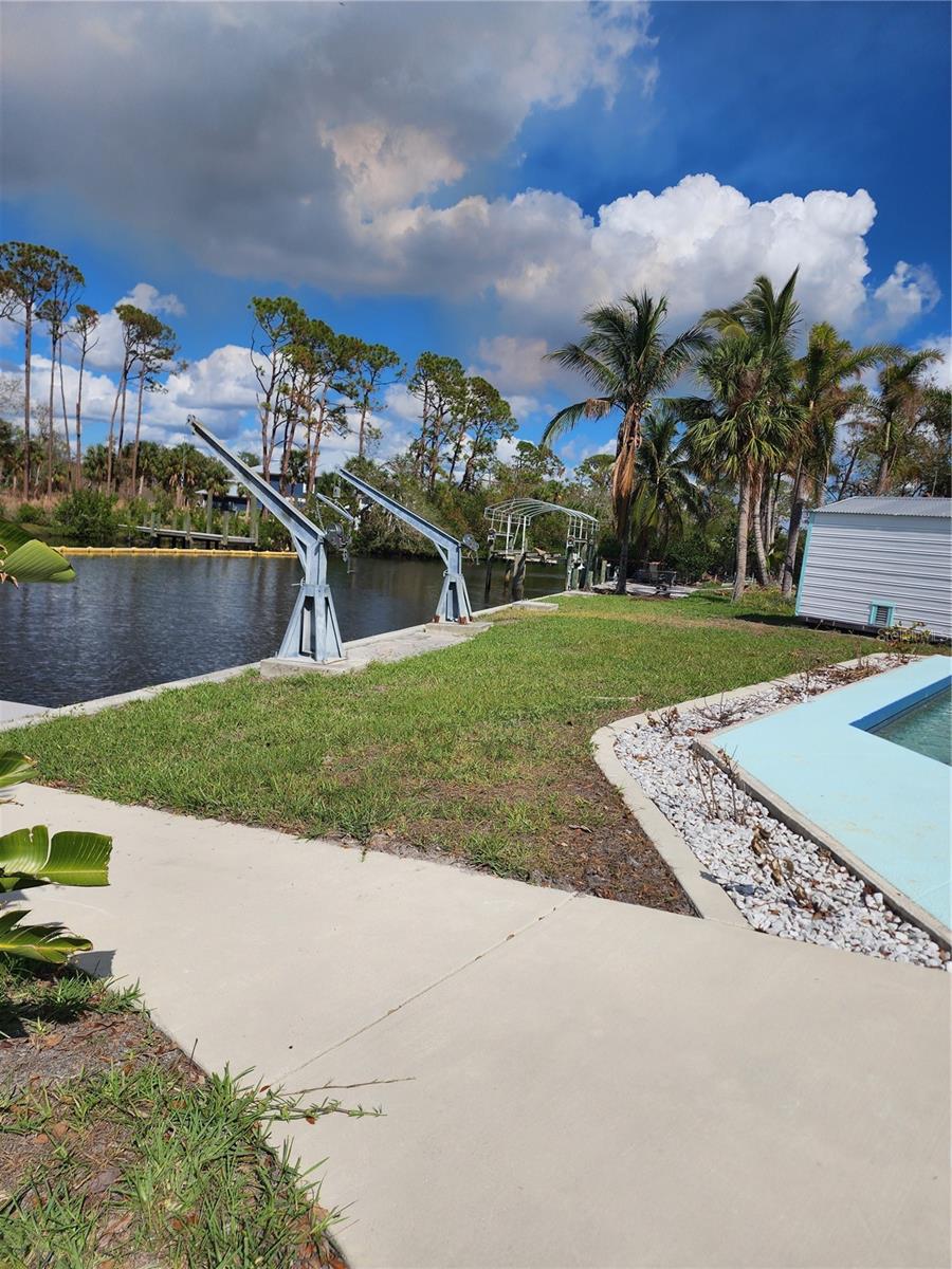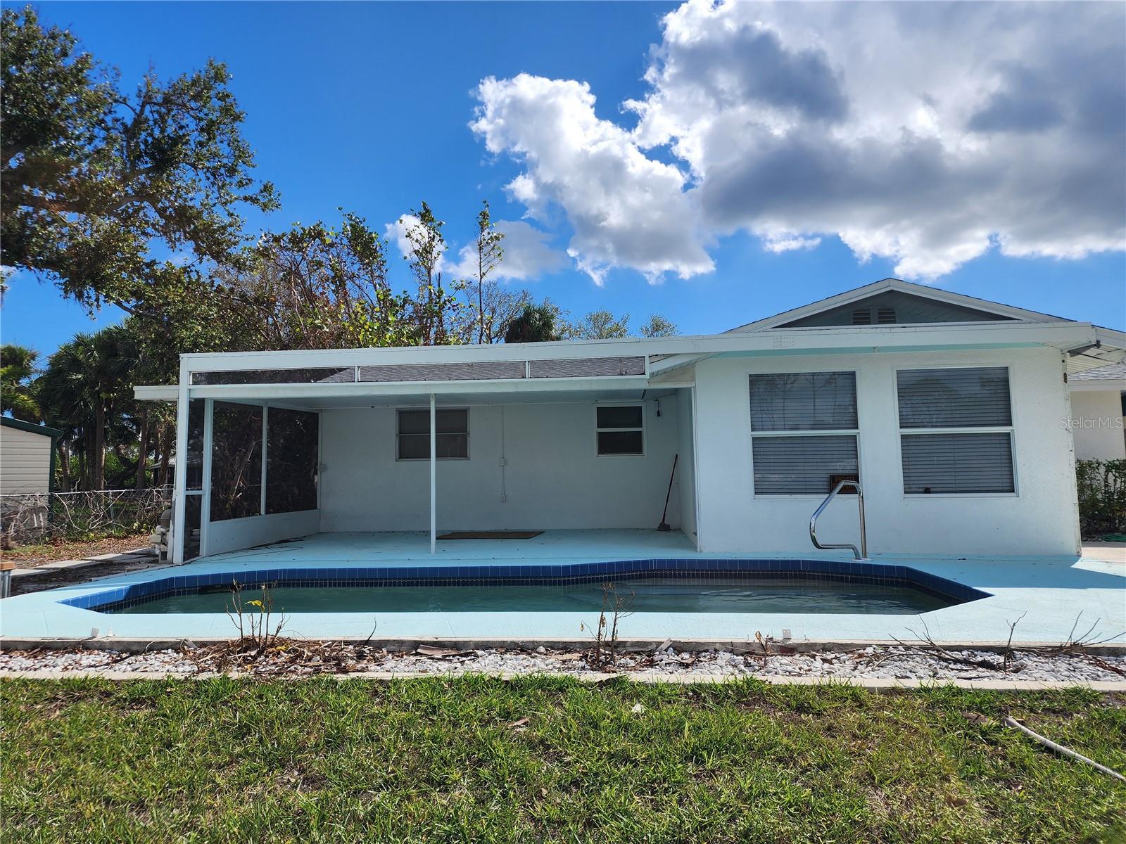 A great opportunity for the right person. FIXER. Hurricane damaged but house is rebuildable. Cute cottage, Florida style home on an oversized lot with a decent length driveway. Gulf access, creek view, seawall, dock and davits. Roof 2023. POOL has been pumped out, acid washed and refilled. The new pool pump is installed and running, so there is a nice clean pool. A/C is working, fridge and microwave is working, newly installed upper kitchen cabinets are in new condition. The floor plan has a full primary suite on one side and a bedroom, bathroom with inside laundry on the other side. On the of end of cul-de-sac street and tucked in on this private lot.