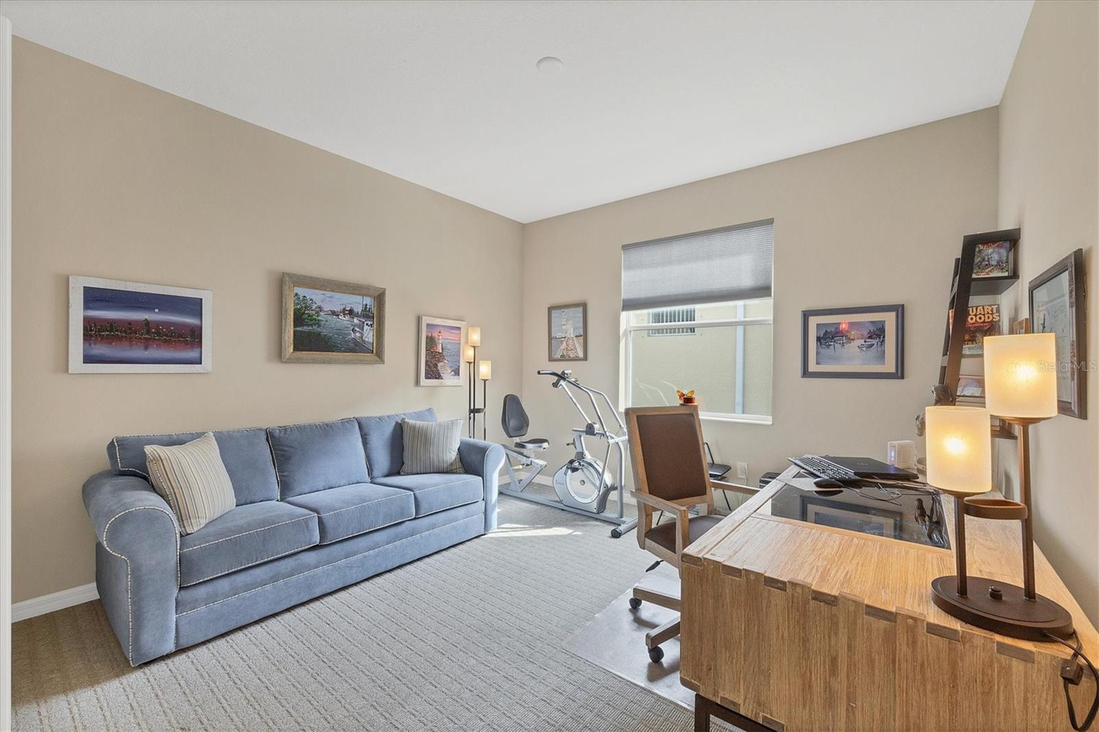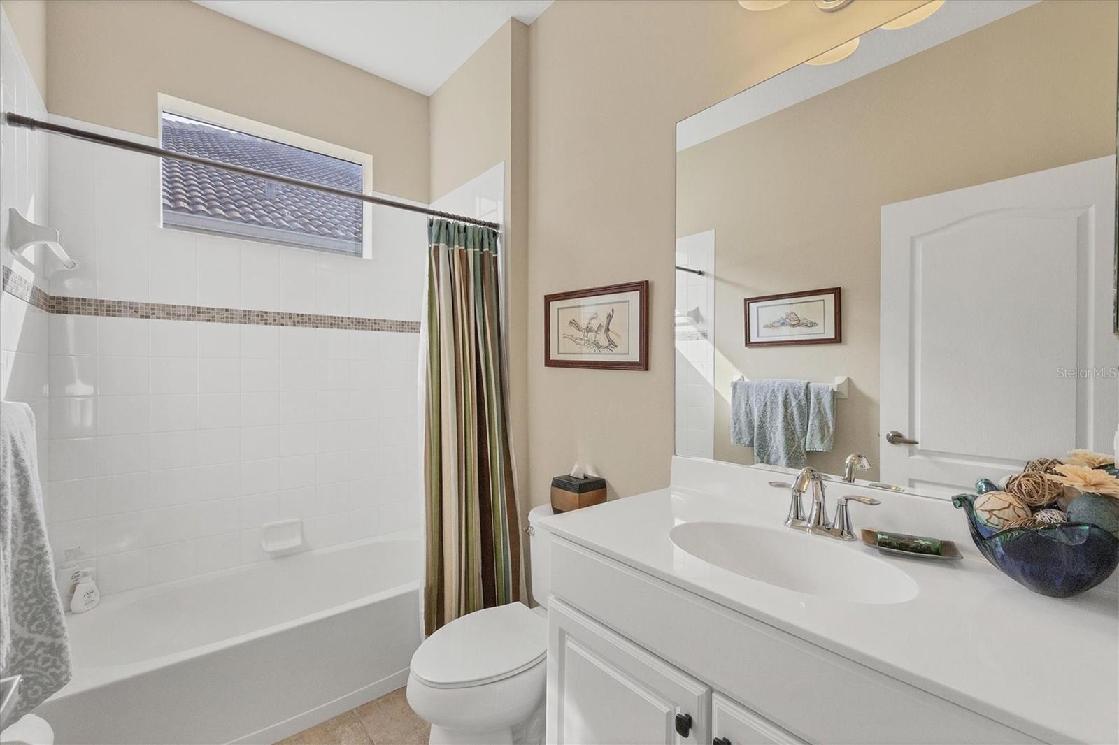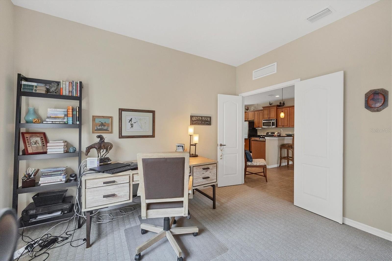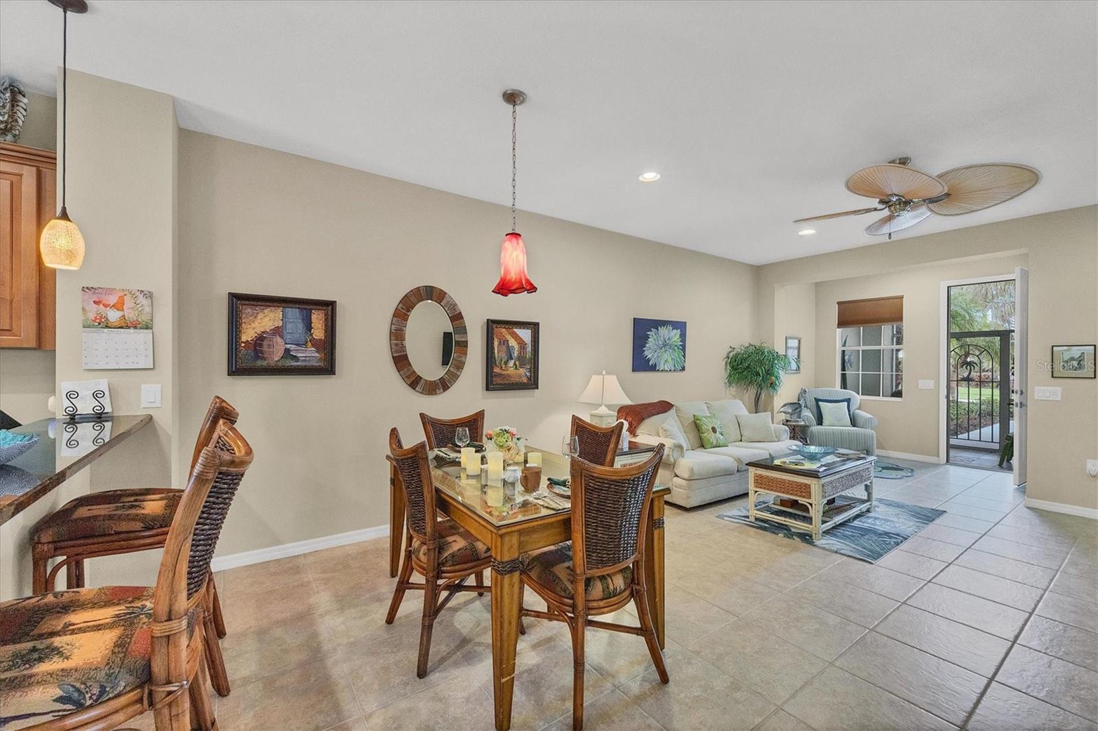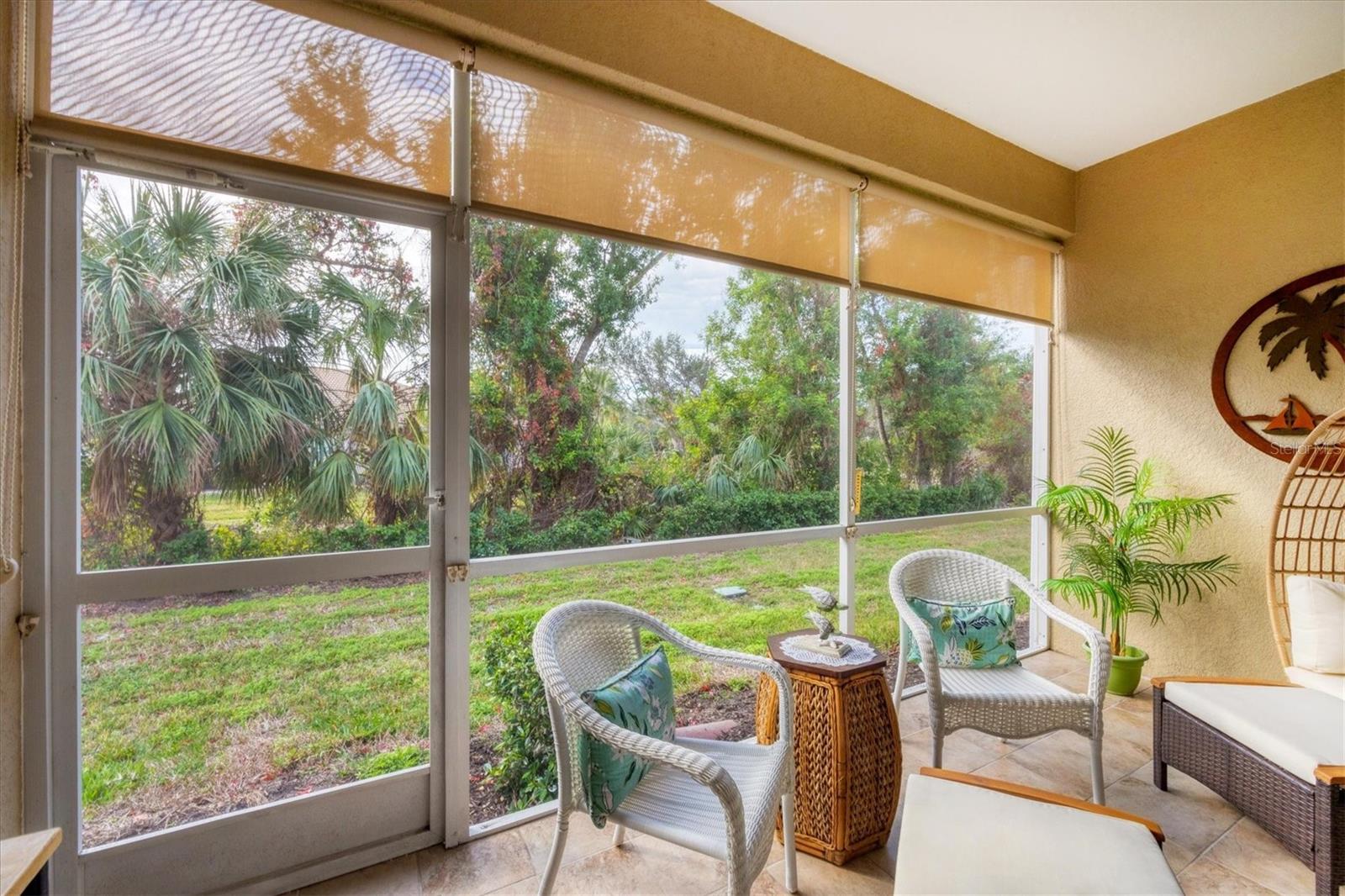 Arlington Cove is a well-developed and opportunist neighborhood. Being minutes from the Gulf Coast beaches you can relax in this clean, well-maintained villa. This two-bedroom, two-bath villa offers 1,560 square feet of living space, with a den. The front entryway is screened in with a unique custom design on the tile floor. As you walk through the home, you will notice an open floor plan, where the great room and kitchen area collide. Sliders connect to the outside private covered lanai area, giving you a peaceful and tropical view, with shades that pull down as needed. The HOA includes yard care, basic cable, irrigation and a heated community pool. Gutters realigned to the sides of the property, front and back lanai area, both tiled, cupboards added above washer and dryer, fans in living area and both bedrooms, privacy, blinds, window treatments, including shades, blinds in bedrooms and in living area. TV added to the front wall of the living room, grab bars added to the back door of garage, main bath and toilet area. Pulldown ladder added to garage, new air conditioner in January 2024 and new garage floor epoxied January 2025. This 76 Villa community is in Englewood, close to gulf beaches and downtown historic Dearborn Street. Come check out this property in person!