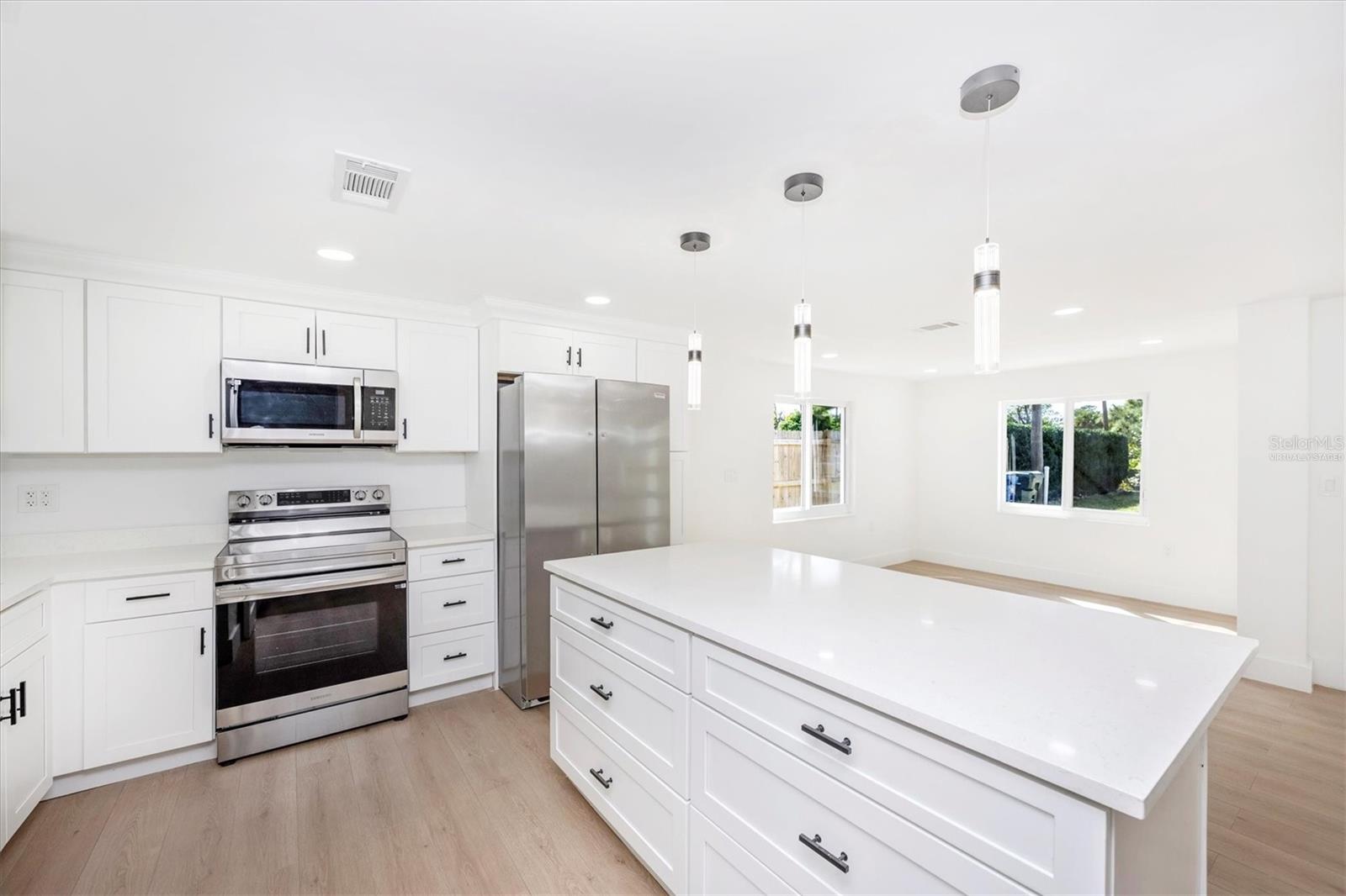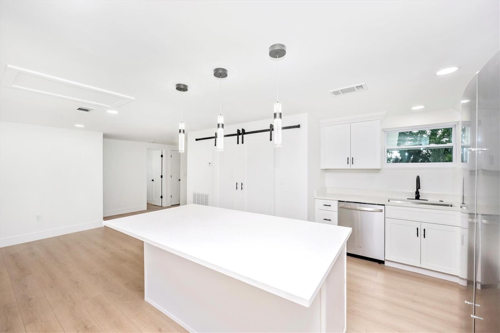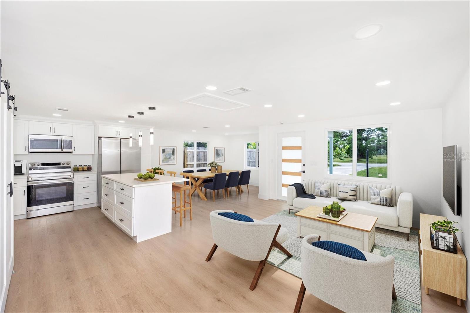 One or more photo(s) has been virtually staged. Beautifully renovated from top to bottom! This Englewood gem has been completely remodeled, including a brand-new primary suite with an en suite bath. Step inside to find stylish LVP flooring throughout and a bright, open floor plan perfect for modern living. The stunning kitchen features white shaker cabinetry, quartz countertops, a generous island with breakfast bar seating, and all-new stainless steel appliances. Barn doors conveniently conceal the laundry area and tankless water heater, adding both charm and function. Outside, enjoy a cute, level backyard that’s easy to maintain. Ideally located just 7 minutes from Englewood Beach and close to all the local restaurants, shops, and vibrant nightlife on Dearborn Street, this home offers the best of coastal living. Whether you’re looking for an affordable single-family home, a seasonal retreat, or a low-maintenance rental or Airbnb investment, this move-in ready property offers endless possibilities! Additional new features include: NEW ROOF, NEW HVAC, NEW TANKLESS HOT WATER HTR,