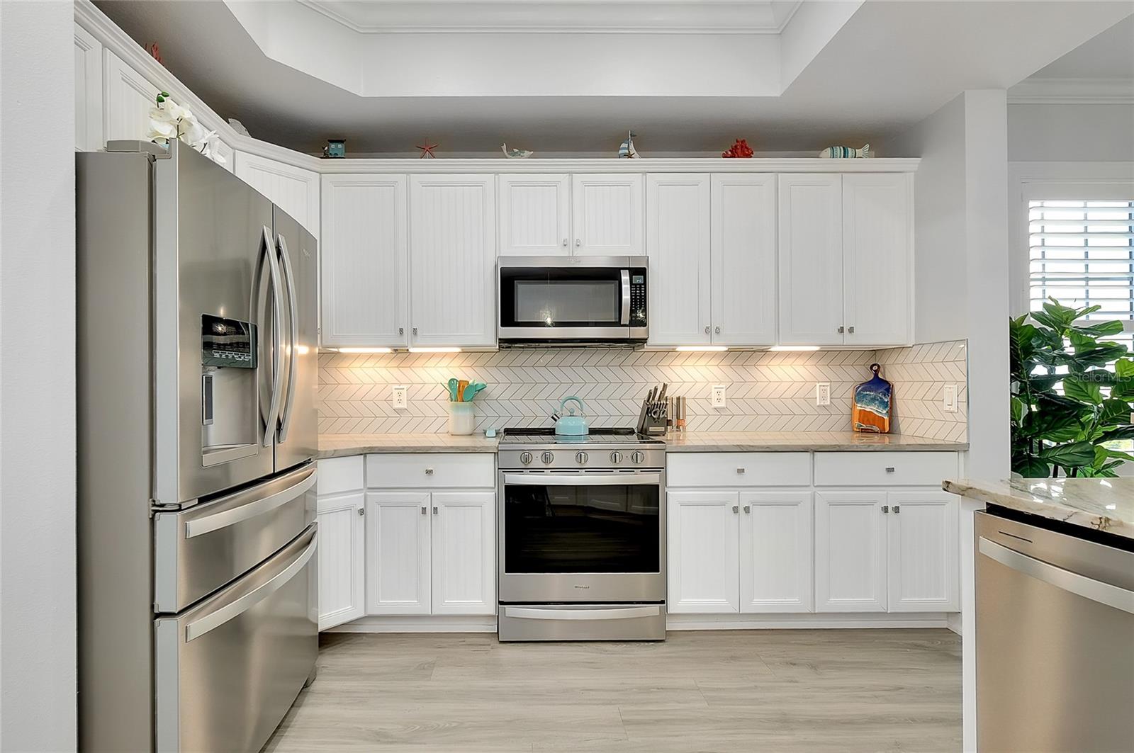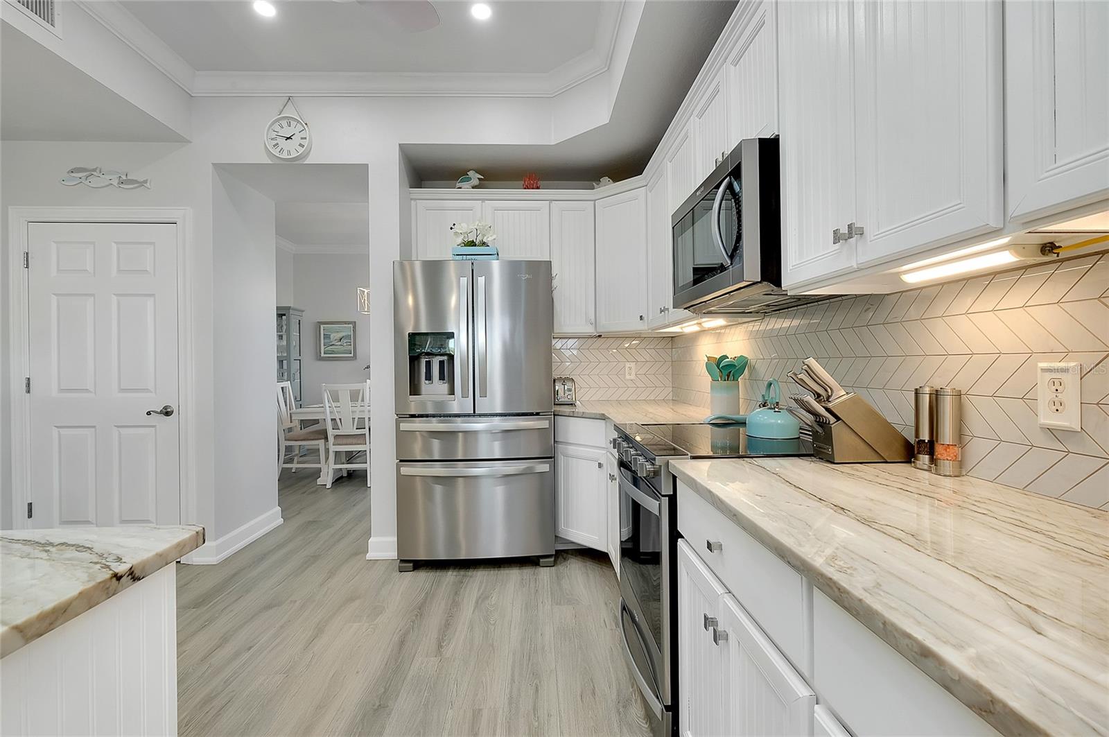 ENJOY THE INTERACTIVE TOUR OF THIS BEAUTIFULLY REMODELED HAMMOCKS PRESERVE CONDOMINIUM, OFFERING ONE OF THE MOST PEACEFUL AND SCENIC SETTINGS IN THE COMMUNITY. Located on the desirable 3rd floor of Building 10501, this end-unit residence enjoys expansive waterfront and nature preserve views over Lemon Creek, creating a tranquil and private retreat with abundant natural light from additional end-unit windows. The well-designed floorplan features three bedrooms, two full bathrooms plus a half bath, interior laundry, formal dining, and an open-concept layout with a spacious kitchen flowing into the large great room. A covered porch extends the living space and is ideal for enjoying the peaceful preserve and water views. The residence was completely remodeled in 2022–2023 with approximately $125,000 in tasteful upgrades that modernize the interior while maintaining a relaxed coastal feel. Improvements include new flooring throughout, crown molding in every room, fresh interior paint, plantation shutters, upgraded Quartzite countertops, tiled kitchen backsplash, upgraded stainless steel appliance package with slide-in stove, renovated bathrooms with upgraded vanities, dual primary vanity, garden tub, separate walk-in shower and toilet room, and a primary walk-in closet with custom built-ins and storage. The interior laundry room includes a utility sink and full-size washer and dryer. Recent improvements also include a 2025 water heater and 2016 A/C system. All existing windows are high impact, and the association has approved the installation of new hurricane-rated replacement windows, excluding the front entry and den window, with completion planned by the end of summer 2026. Unique to only a limited number of units, this residence includes two assigned covered parking spaces and a private storage unit. The building’s concrete construction with poured concrete between floors provides exceptional sound insulation and comfort. Hammocks Preserve is a gated, deed-restricted community offering a low-maintenance, resort-style lifestyle with a heated beach-entry pool and spa, fitness center, tennis and pickleball courts, clubhouse with gathering spaces and billiards, boardwalks, nature trails, and a private fishing pier on Lemon Creek. The HOA covers cable TV, high-speed internet, water, trash, building insurance, roof repair and replacement, exterior maintenance, landscaping, pool service, and professional management. Ideally located on the Cape Haze peninsula just minutes from Englewood Beach, Boca Grande, Cape Haze Marina, shopping, and dining, this move-in-ready home is ideal for full-time living or a refined coastal retreat.
