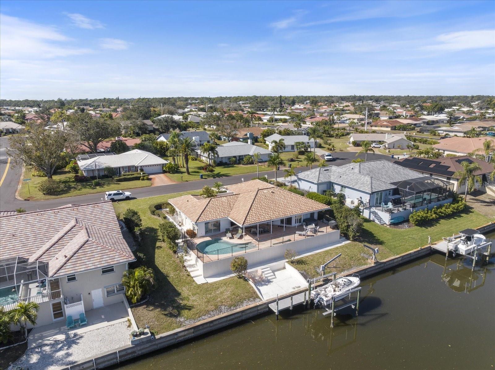 One or more photo(s) has been virtually staged. WATERFRONT LIVING WITH A POOL, X500 FLOOD ZONE, 10,000# BOAT LIFT, JUST ONE BRIDGE AND A 10 MINUTE BOAT RIDE TO LEMON BAY IN DESIRABLE ENGLEWOOD ISLES. This 3 bedroom, 2 bathroom home is perfectly positioned for enjoying the Florida boating lifestyle, offering quick access to Lemon Bay and beyond. Designed for both comfort and entertaining, the home features a split floor plan with the primary suite privately located on one side and two guest bedrooms and a full bath on the other. Plantation shutters on the front windows add a touch of timeless elegance and elevate the home’s overall feel. The main living and dining areas flow seamlessly and are ideal for hosting, highlighted by two wine refrigerators and expansive canal views. Four sliding glass doors line the back of the home, filling the interior with natural light and opening to an impressive outdoor living space. The kitchen is thoughtfully designed with a pass through window to the lanai, creating an easy connection to the outdoor breakfast bar and pool area, perfect for casual dining and entertaining. The guest bathroom includes an exterior door for convenient pool access. Outside, enjoy an expansive waterfront setting with a pool, generous patio space, and a private boat lift. With only one bridge out to open water, this location is ideal for boaters looking for quick and easy access. Located in the sought after Englewood Isles community, this home offers close proximity to beaches, shopping, dining, and the rapidly growing Wellen Park area. A true blend of waterfront convenience, indoor outdoor living, and relaxed coastal lifestyle, this home delivers the Florida experience many buyers are searching for.