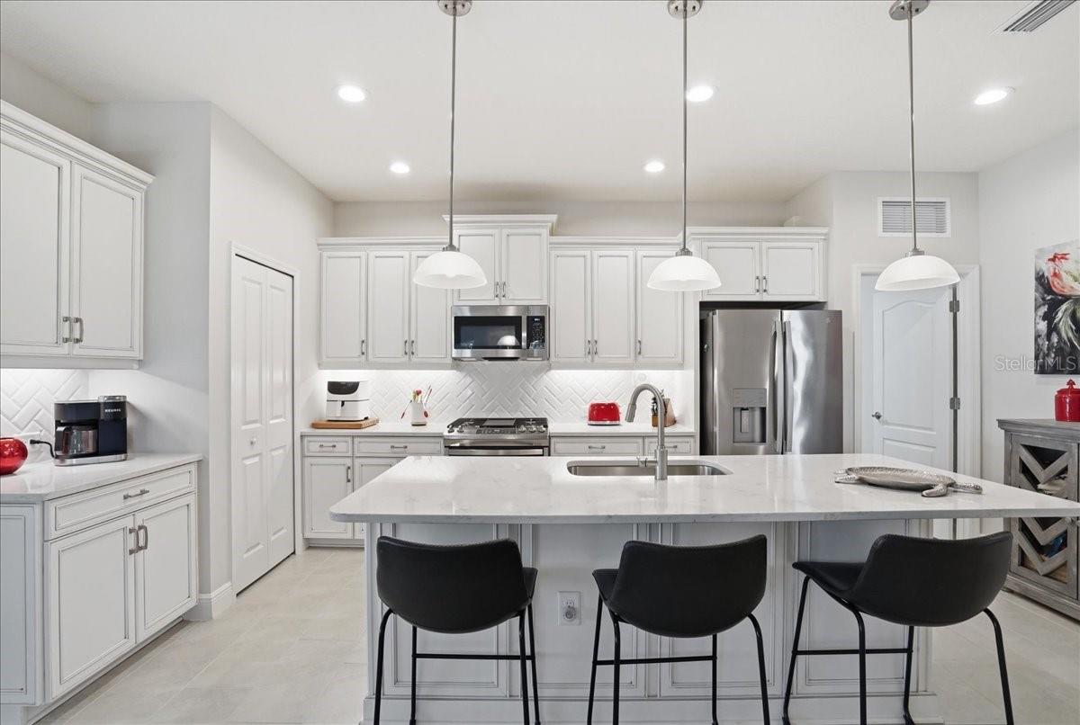 Come experience this spacious Sandcastle model in the highly sought-after community of Boca Royale Golf and Country Club! This three-bedroom villa with a den, features an open floorplan centered around a gourmet kitchen, complete with quartz countertops, upgraded Timberlake pewter glazed cabinets, under cabinet LED lighting, stainless steel appliances, tile backsplash, and a large center island perfect for entertaining. The great room showcases a coffer ceiling and pocket sliding impact glass door, accented by a custom made accordion shade creating a seamless indoor-outdoor living experience. Step onto the extended screened lanai, where tranquil pond views provide the perfect backdrop for dining and relaxation. A gas line rough-in is in place, providing a convenient option for outdoor grilling. This home offers peace of mind with full hurricane protection, including impact windows throughout and Storm Smart screens enclosing the lanai. A retractable front door screen allows a refreshing breeze to flow throughout the home, enhancing comfort while keeping insects out. Upgraded tile flooring extends throughout the home, while the split-bedroom layout ensures privacy for both owners and guests. The spacious primary suite features an ensuite bath and dual vanities, a walk-in glass enclosed shower and over-sized walk-in closet. The versatile office/den can easily function as a fourth bedroom and is conveniently located near a full bath with walk-in shower. Additional highlights include a well-appointed laundry room with built-in cabinetry; two-car garage with utility sink, epoxy floor, and ample storage; and gas appliances (range, water heater, dryer.) Just steps away, residents can enjoy the Belize community pool and hot tub. Boca Royale Golf & Country Club offers a wide range of amenities, including a renovated clubhouse, fitness center, optional golf, tennis and pickleball. Ideally located just minutes from Gulf of America beaches, historic Dearborn Street, downtown Venice, Wellen Park and local farmers’ markets and festivals – this home presents an exceptional opportunity to enjoy the best of Florida living.