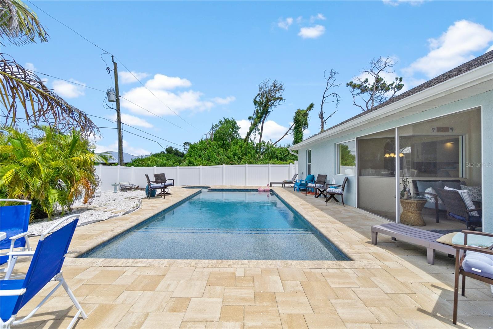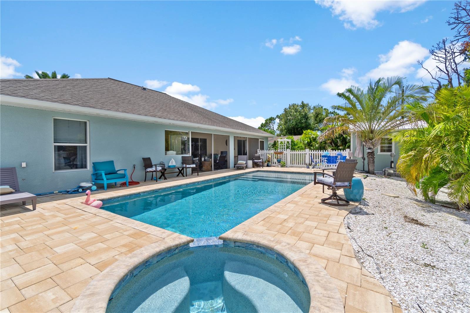 Welcome to your private oasis—a stunning 3-bedroom, 2-bathroom retreat offering 1,709 square feet of refined living space, ideal for a vacation getaway or a high-return VRBO investment. With tray ceilings and newly tiled bathrooms, this home epitomizes modern elegance and comfort. The recent addition of new tile flooring throughout adds a touch of sophistication and easy maintenance. Step outside to discover your personal resort—a brand-new heated saltwater pool, spa, and deck, completed in 2023, designed for ultimate relaxation and luxury. The surrounding beach shell landscape creates a serene coastal ambiance that perfectly complements the home’s refined aesthetic. With state-of-the-art Jandy pool equipment still under warranty, you’ll enjoy peace of mind and effortless enjoyment. Located less than 3 miles from a top-rated school district and just a 10-minute drive to the pristine shores of Manasota Key Beaches, this home offers both convenience and an enviable lifestyle. The property also includes a versatile shed with an insulated ceiling and electric-ready setup, ideal for various uses. A large vinyl fence and resort-style enclosure around the pool provide privacy and a touch of grandeur. Inside, you’ll find brand-new flooring, modern ceiling fans, and sleek new kitchen appliances, all contributing to the home’s luxurious and low-maintenance living experience. This residence is a true gem, offering a perfect blend of luxury, convenience, and timeless coastal charm. No HOA !!