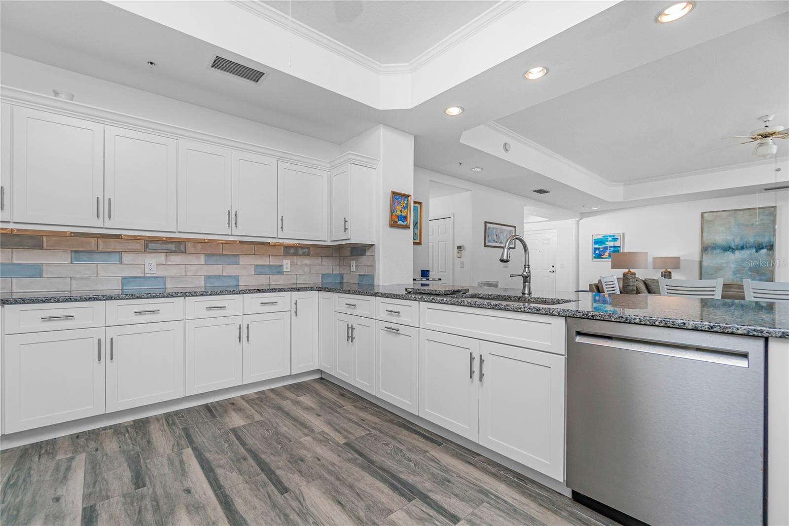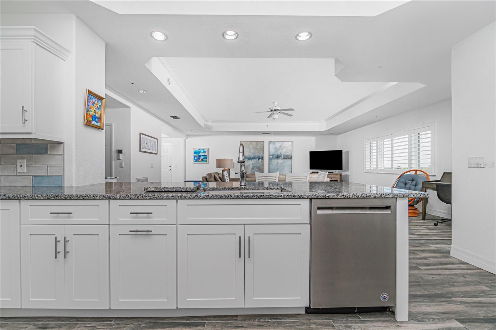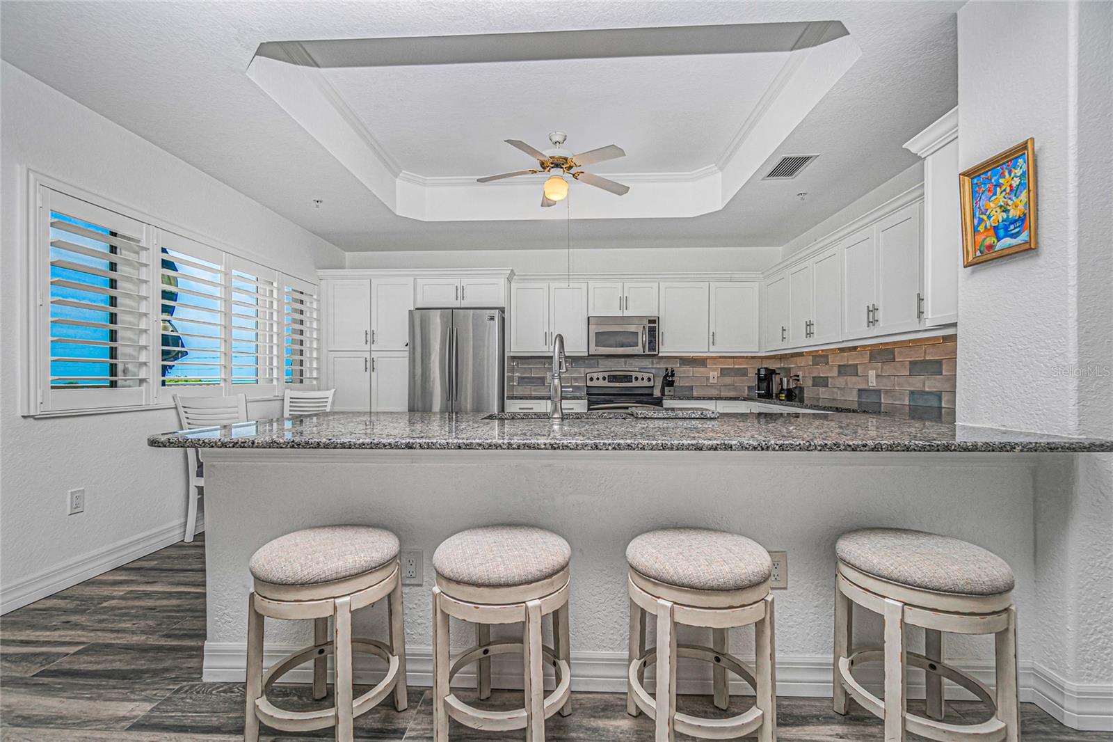 Solid, beautiful condo to enjoy beach style living. Look No Further! You've Found It! Across from Englewood Beach on the island of Manasota Key in a prime location -- 3 blocks to roundabout and close to restaurants and small businesses! This spacious 3rd floor 2 bedroom / 2 bath unit has hurricane impact windows, gated entry, elevator, enclosed garage + storage, pool. The open floor plan features a renovated kitchen with granite countertops and large eat-in bar. Tile throughout kitchen/living room/hallway give a crisp / fresh look and makes it easy to clean. The primary bedroom has a large walk-in closet and wonderful bath with attractive granite counter tops and large walk-in shower. The guest bedroom also has a nice, updated bathroom. Cook out on your balcony and simply relax and have friends come to visit. You share the 3rd floor elevator with only one other resident. Lemon Bay access and Deeded Gulf access included. Can be sold "turn key" if desired.