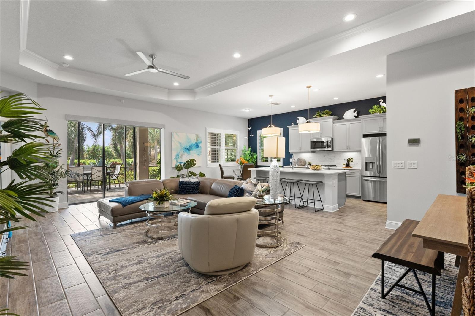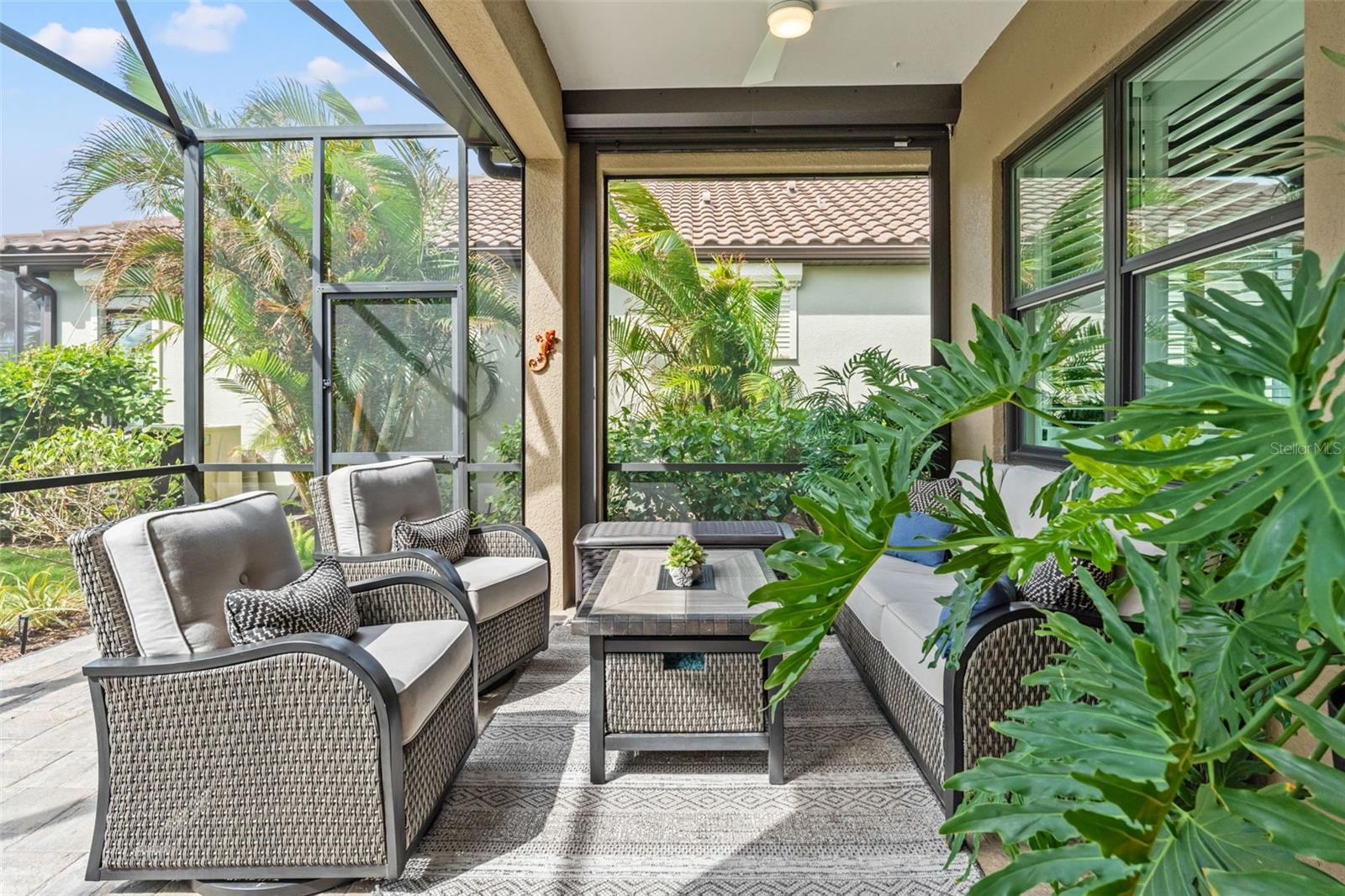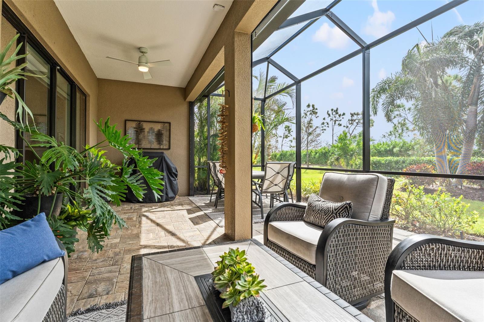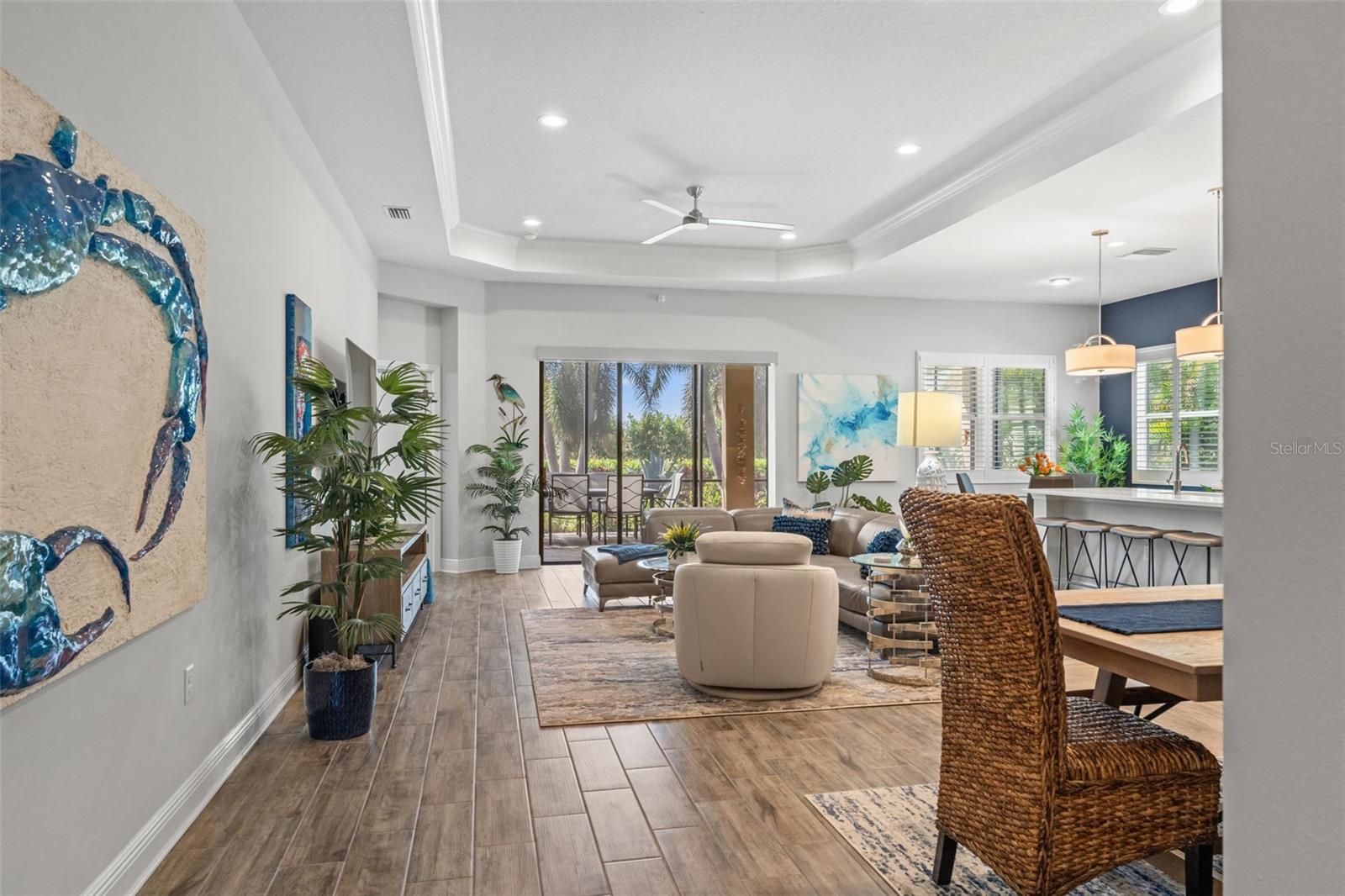 Welcome to Boca Royale, where luxury meets leisure in a picturesque gated community just a stone’s throw from pristine beaches and exceptional boating and fishing opportunities. This home, unaffected by recent hurricanes, is located in an exclusive neighborhood that offers an 18-hole championship golf course, a vibrant clubhouse with dining options, and an array of amenities including tennis and pickleball courts, a state-of-the-art fitness center, and a stunning resort-style pool with a tiki bar. This charming 3-bedroom, 2-bathroom home in the sought-after St. Bart’s community offers a generous 1,870 square feet of living space. High ceilings and plentiful windows create an airy feel throughout the home. Enjoy seamless indoor-outdoor living with large sliding glass doors that open to a covered patio and a spacious screened lanai, all overlooking a private backyard oasis. The kitchen is a culinary delight, equipped with premium stainless steel appliances, sleek quartz countertops, and custom cabinetry that includes convenient features like roll-out shelves and under-cabinet lighting. The master suite is a serene retreat, complete with a sizable walk-in closet and a beautifully designed bathroom featuring dual vanities and a walk-in shower. Additional highlights include energy-efficient elements such as hurricane-rated windows, remote controlled storm smart hurricane curtains, and a high-efficiency HVAC system. With the added benefit of no CDD fees, this home is an ideal choice for those seeking a lifestyle filled with comfort and convenience.
