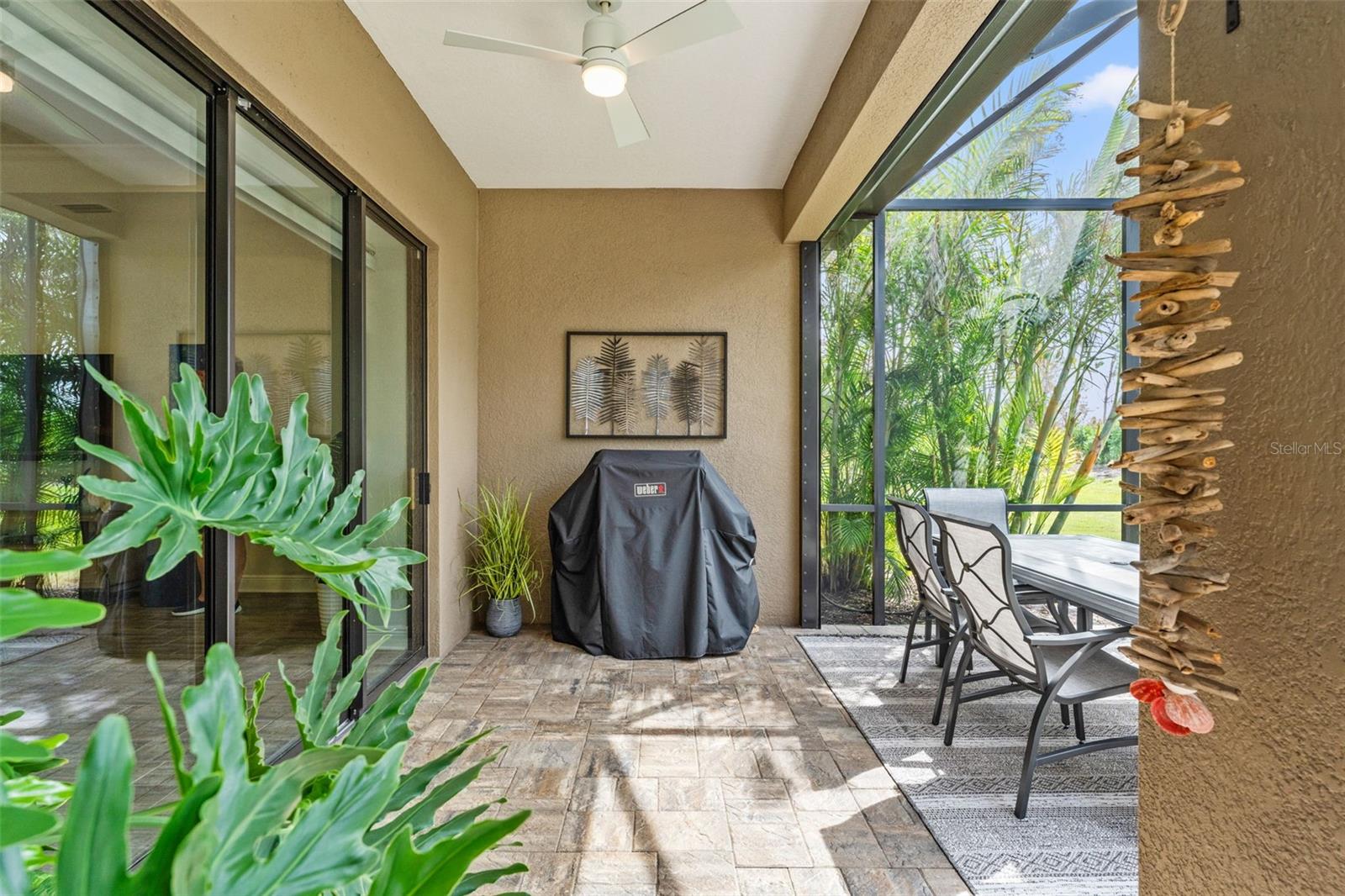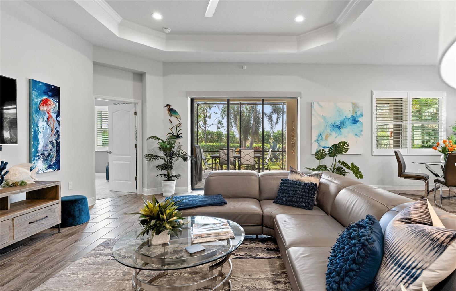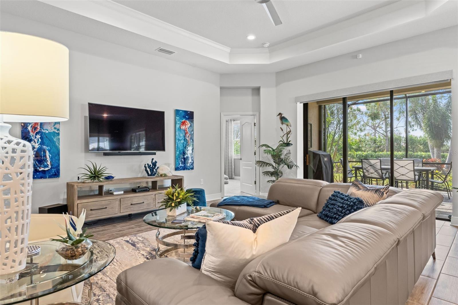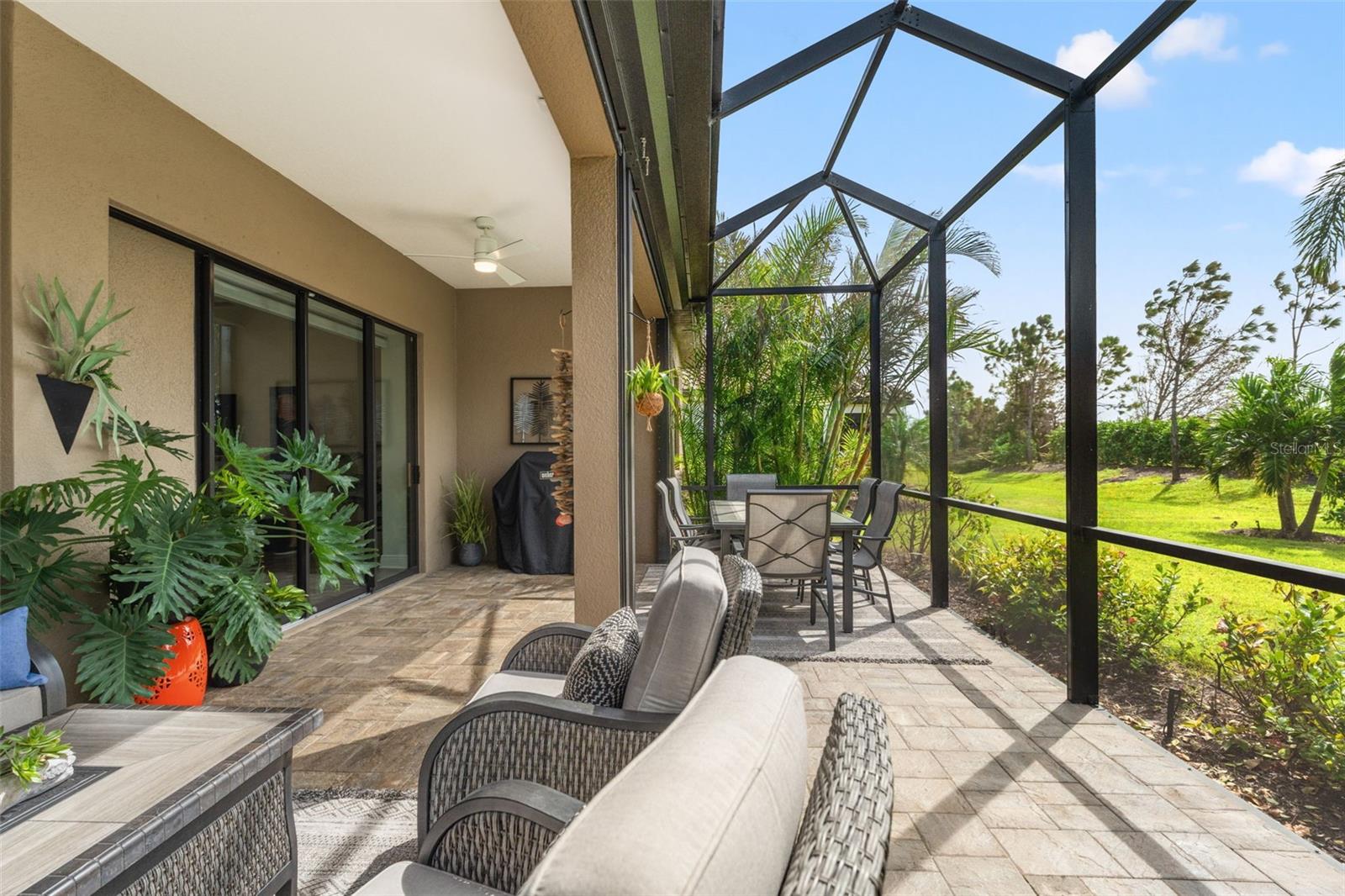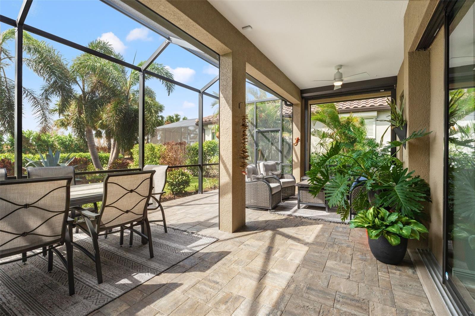 Welcome to Boca Royale, where luxury meets leisure in a picturesque gated community just a stone’s throw from pristine beaches and exceptional boating and fishing opportunities. This home, unaffected by recent hurricanes, is located in an exclusive neighborhood that offers an 18-hole championship golf course, a vibrant clubhouse with dining options, and an array of amenities including tennis and pickleball courts, a state-of-the-art fitness center, and a stunning resort-style pool with a tiki bar. This charming 3-bedroom, 2-bathroom home in the sought-after St. Bart’s community offers a generous 1,870 square feet of living space. High ceilings and plentiful windows create an airy feel throughout the home. Enjoy seamless indoor-outdoor living with large sliding glass doors that open to a covered patio and a spacious screened lanai, all overlooking a private backyard oasis. The kitchen is a culinary delight, equipped with premium stainless steel appliances, sleek quartz countertops, and custom cabinetry that includes convenient features like roll-out shelves and under-cabinet lighting. The master suite is a serene retreat, complete with a sizable walk-in closet and a beautifully designed bathroom featuring dual vanities and a walk-in shower. Additional highlights include energy-efficient elements such as hurricane-rated windows, remote controlled storm smart hurricane curtains, and a high-efficiency HVAC system. With the added benefit of no CDD fees, this home is an ideal choice for those seeking a lifestyle filled with comfort and convenience.