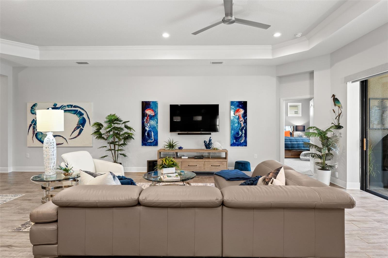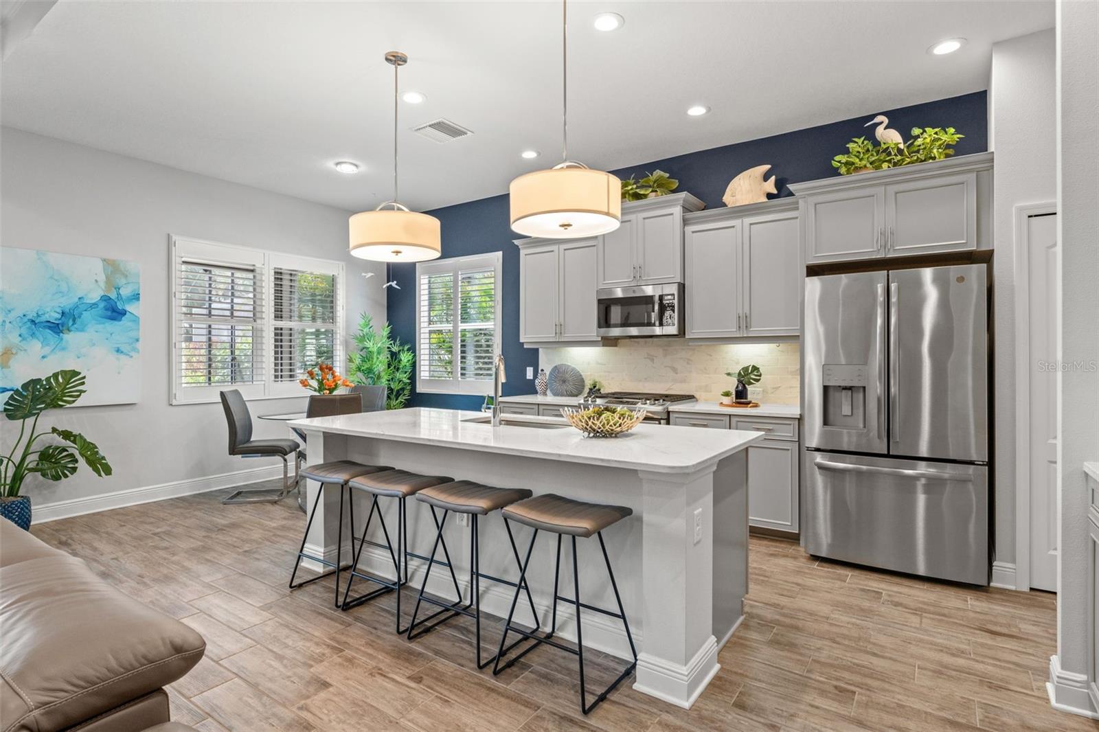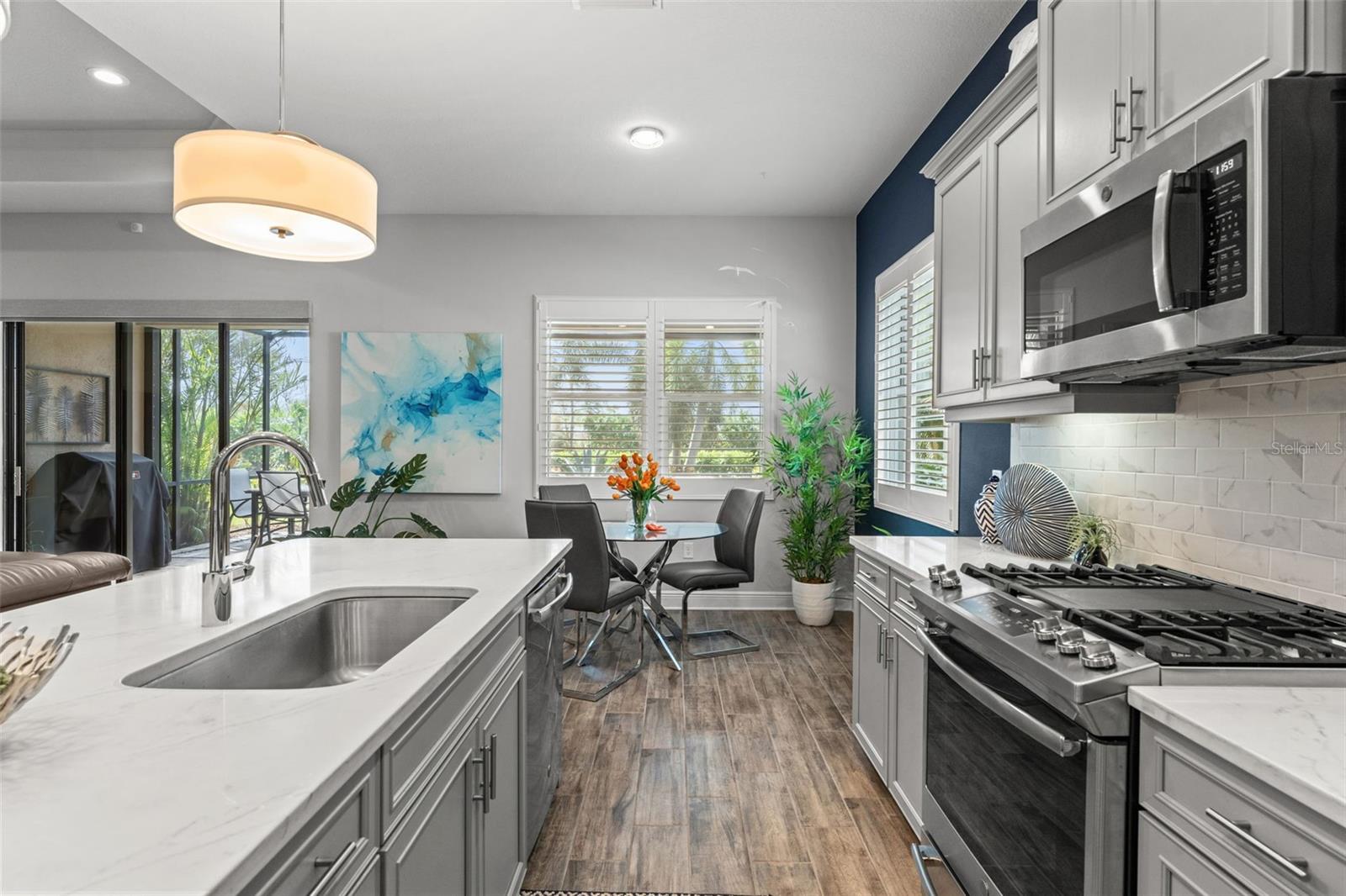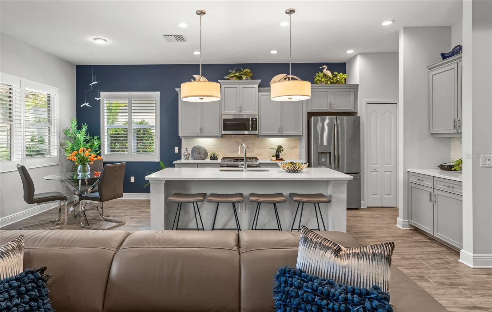 Welcome to Boca Royale, where luxury meets leisure in a picturesque gated community just a stone’s throw from pristine beaches and exceptional boating and fishing opportunities. This home, unaffected by recent hurricanes, is located in an exclusive neighborhood that offers an 18-hole championship golf course, a vibrant clubhouse with dining options, and an array of amenities including tennis and pickleball courts, a state-of-the-art fitness center, and a stunning resort-style pool with a tiki bar. This charming 3-bedroom, 2-bathroom home in the sought-after St. Bart’s community offers a generous 1,870 square feet of living space. High ceilings and plentiful windows create an airy feel throughout the home. Enjoy seamless indoor-outdoor living with large sliding glass doors that open to a covered patio and a spacious screened lanai, all overlooking a private backyard oasis. The kitchen is a culinary delight, equipped with premium stainless steel appliances, sleek quartz countertops, and custom cabinetry that includes convenient features like roll-out shelves and under-cabinet lighting. The master suite is a serene retreat, complete with a sizable walk-in closet and a beautifully designed bathroom featuring dual vanities and a walk-in shower. Additional highlights include energy-efficient elements such as hurricane-rated windows, remote controlled storm smart hurricane curtains, and a high-efficiency HVAC system. With the added benefit of no CDD fees, this home is an ideal choice for those seeking a lifestyle filled with comfort and convenience.