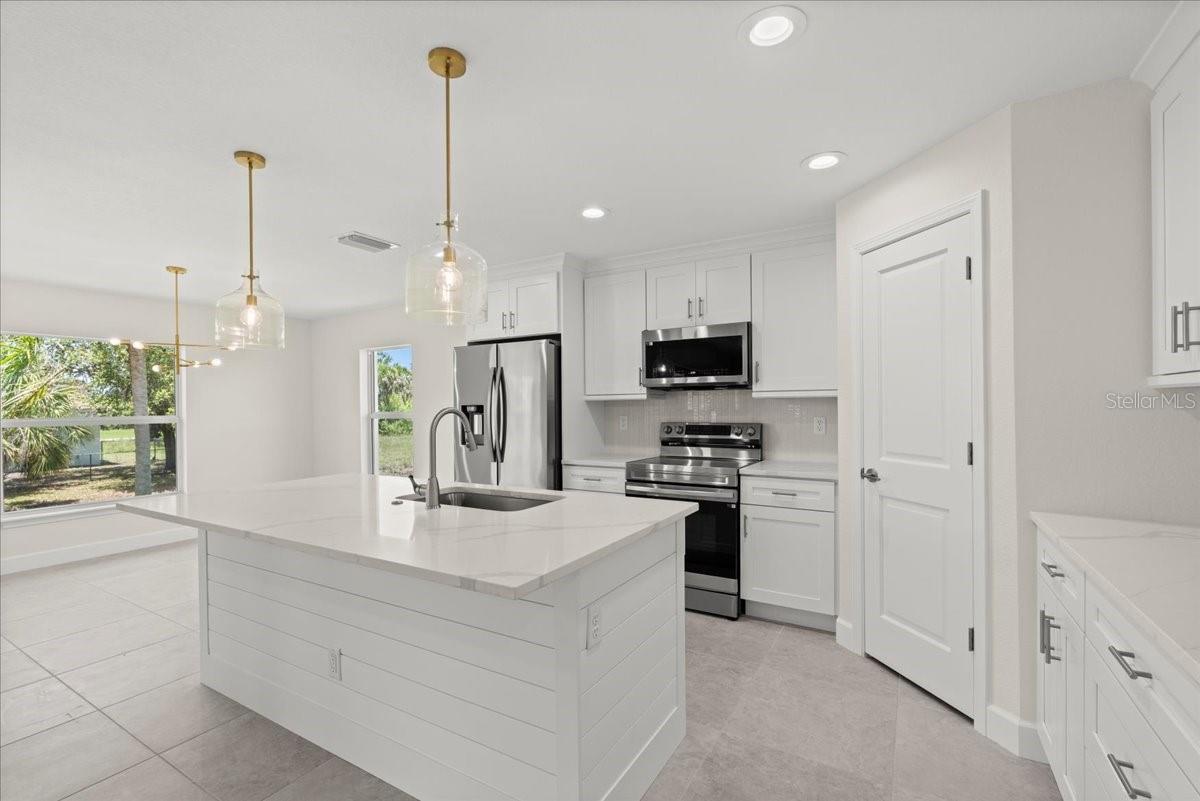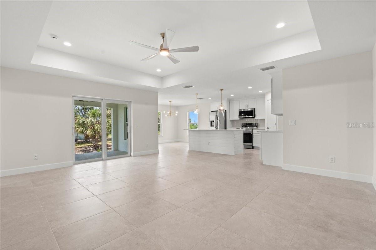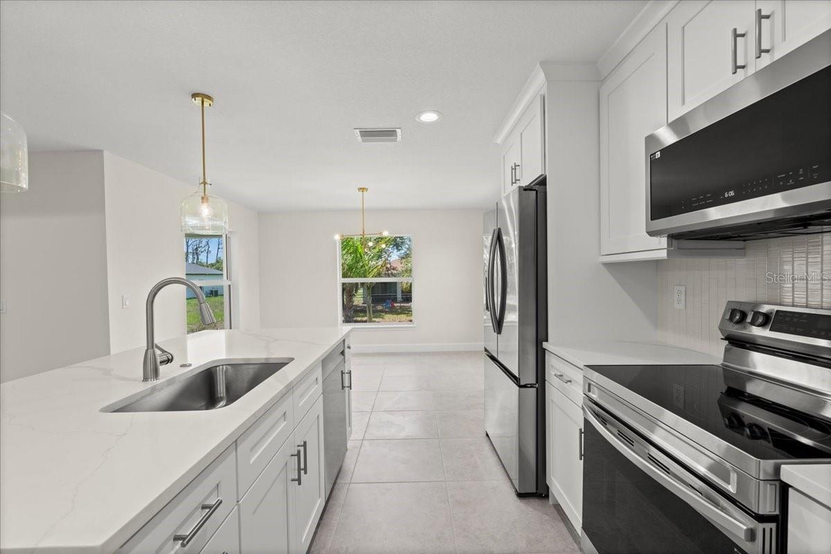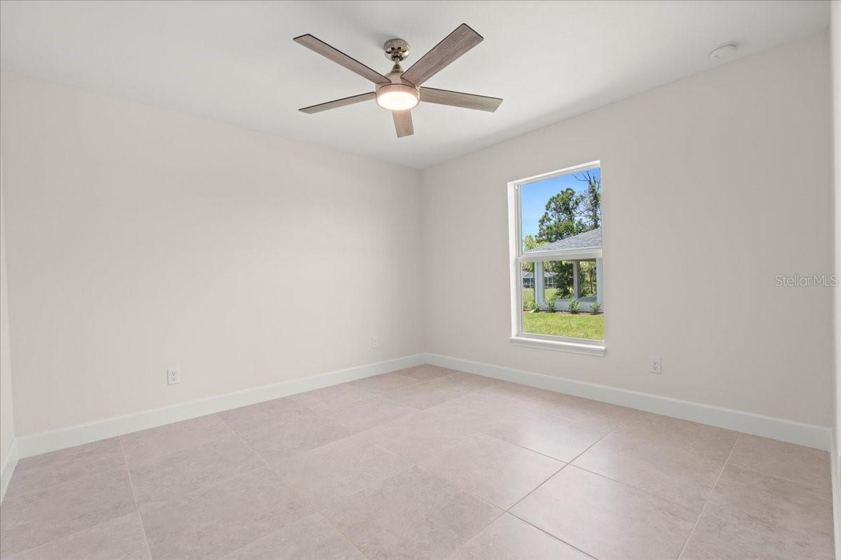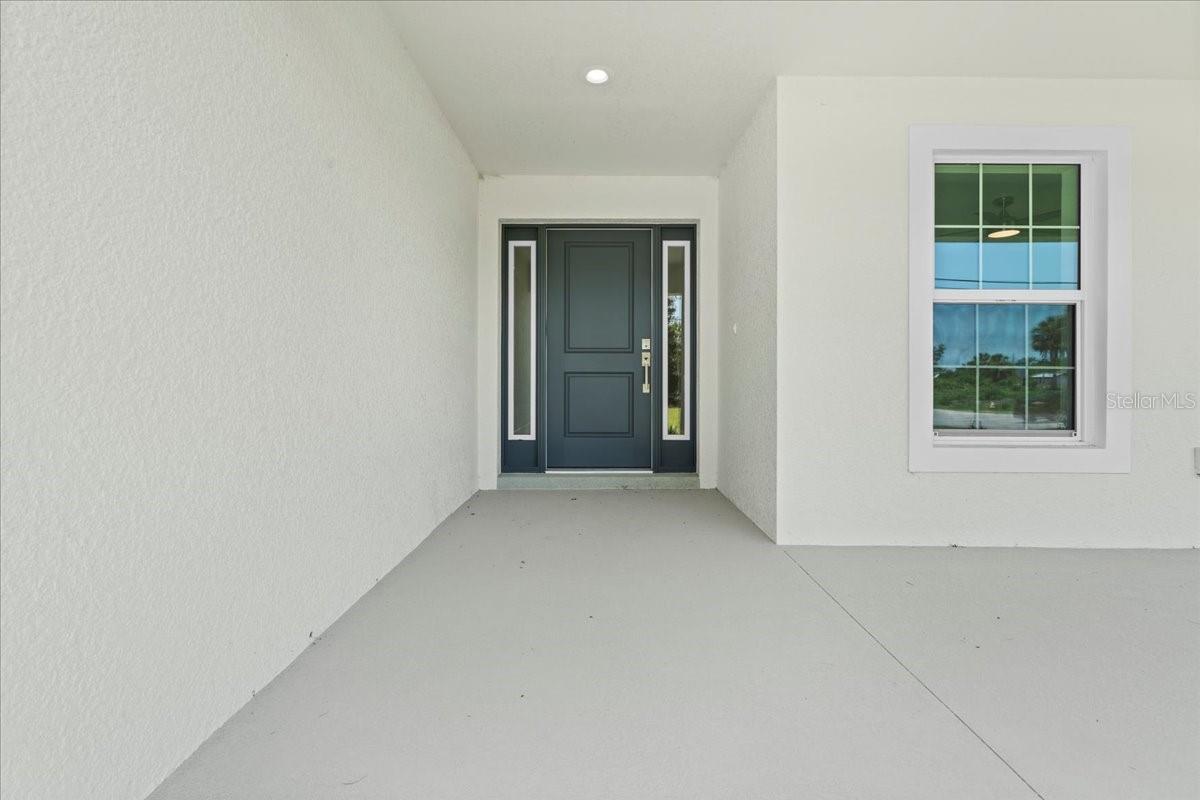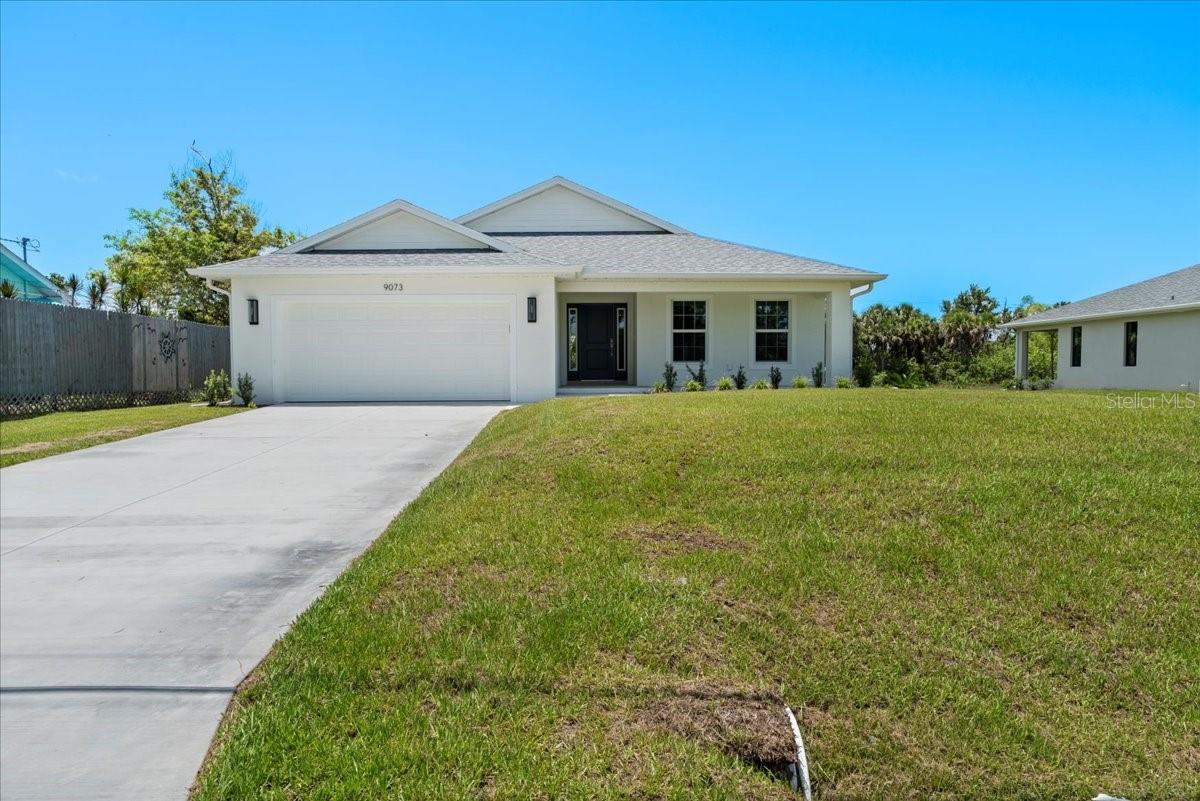 Move right into this never-occupied, beautifully built 3-bed, 2-bath concrete block home combining modern style with thoughtful features. The property includes a 2-car garage with epoxy chip floors, Rain Bird irrigation system, architectural shingle roof, full gutter system, and an attractive Boston hip roof design. PGT impact windows and sliders provide storm protection and energy efficiency. Inside, the kitchen features quartz countertops, shaker cabinets, Samsung appliances, and a sleek tile backsplash. Porcelain tile flooring runs throughout the home, complemented by tray ceilings that add depth and character. The primary suite offers a walk-in closet and a dual-vanity bath. Front and rear porches with spraycrete flooring extend the living space outdoors. Low-maintenance, high-quality construction and move-in ready—schedule your showing today.
