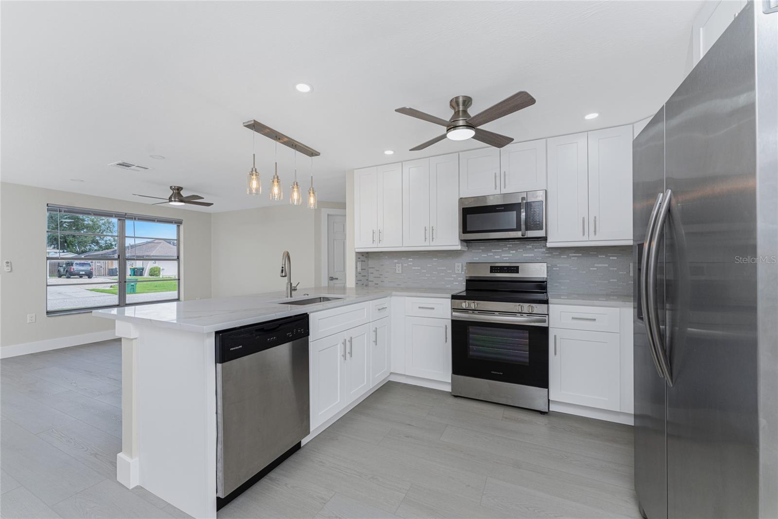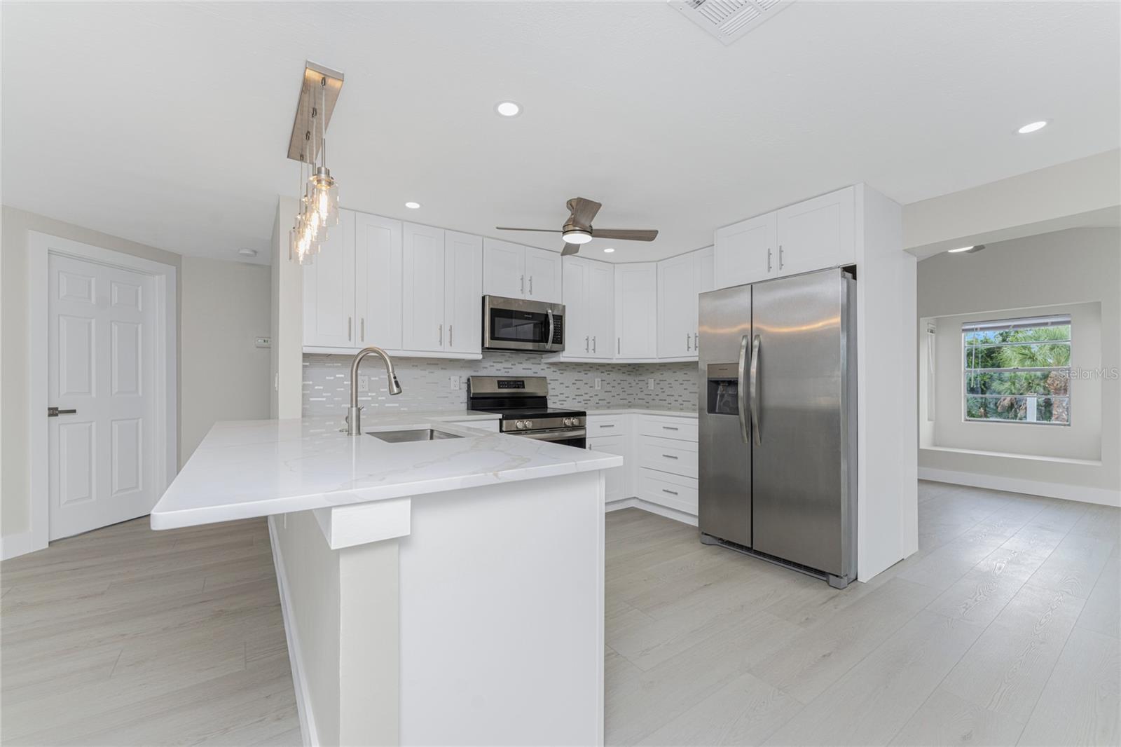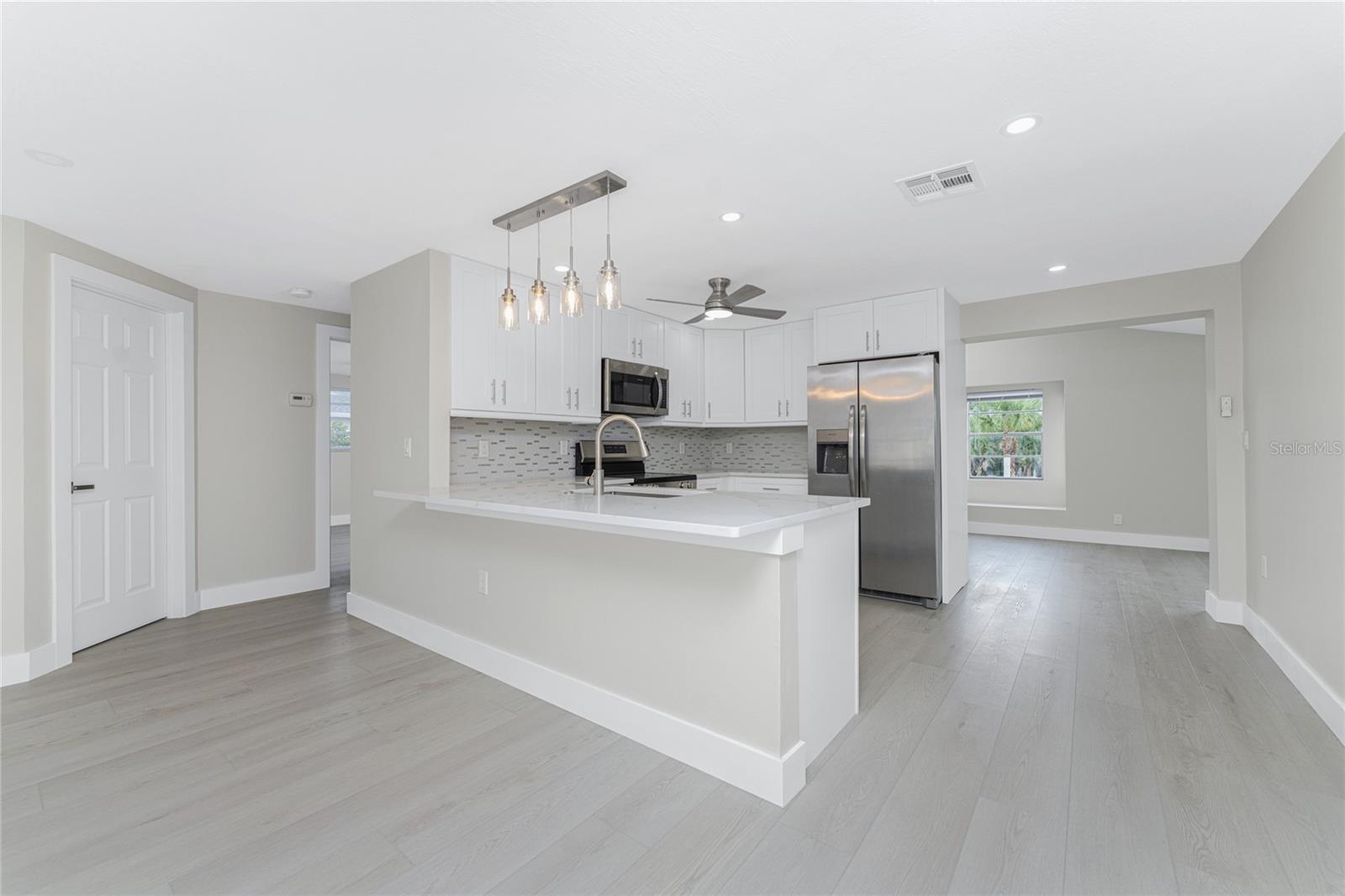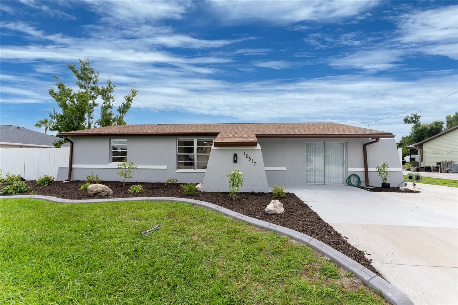 One or more photo(s) has been virtually staged. Beautifully remodeled 3bed/2bath home with split floor plan and dedicated owners suite that is NOT IN A FLOOD ZONE! This home has been completely renovated; new shaker kitchen cabinets, appliances and gorgeous quartz counter tops. Both bathrooms remodeled with new vanities, quartz countertops, porcelain tile and plenty of lighting. Inside laudry room with washer and dryer. Pull down stairs with attic storage. Entire home has freshly installed luxury vinyl flooring, paint, baseboards and recessed lighting. Large bonus room leads out to your expansive backyard where you can enjoy a gazebo and huge shed. Walk out to your new dock overlooking a freshwater canal where you can launch a kayak, fish or just relax and take in the peace and quiet. New exterior paint and vinyl siding complete the lushly landscaped yard. Plenty of parking for 4 vehicles. This home is turnkey ready. Come and experience the finest in florida living!